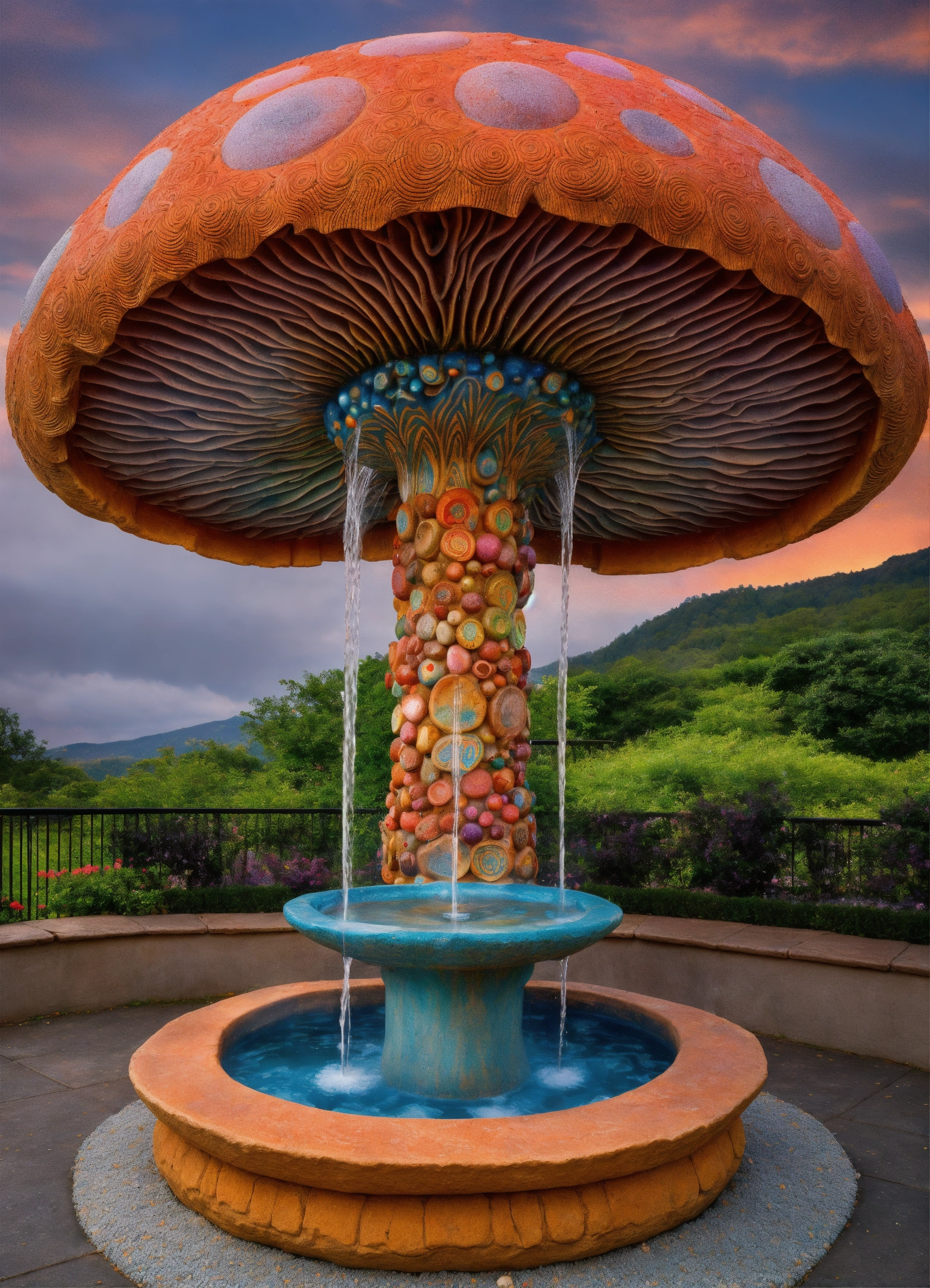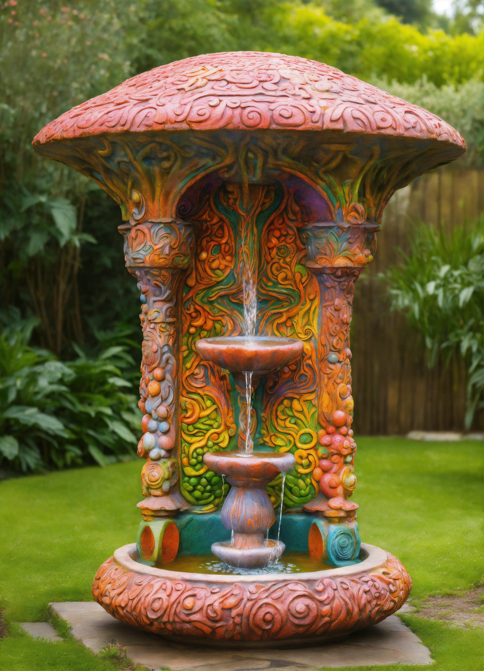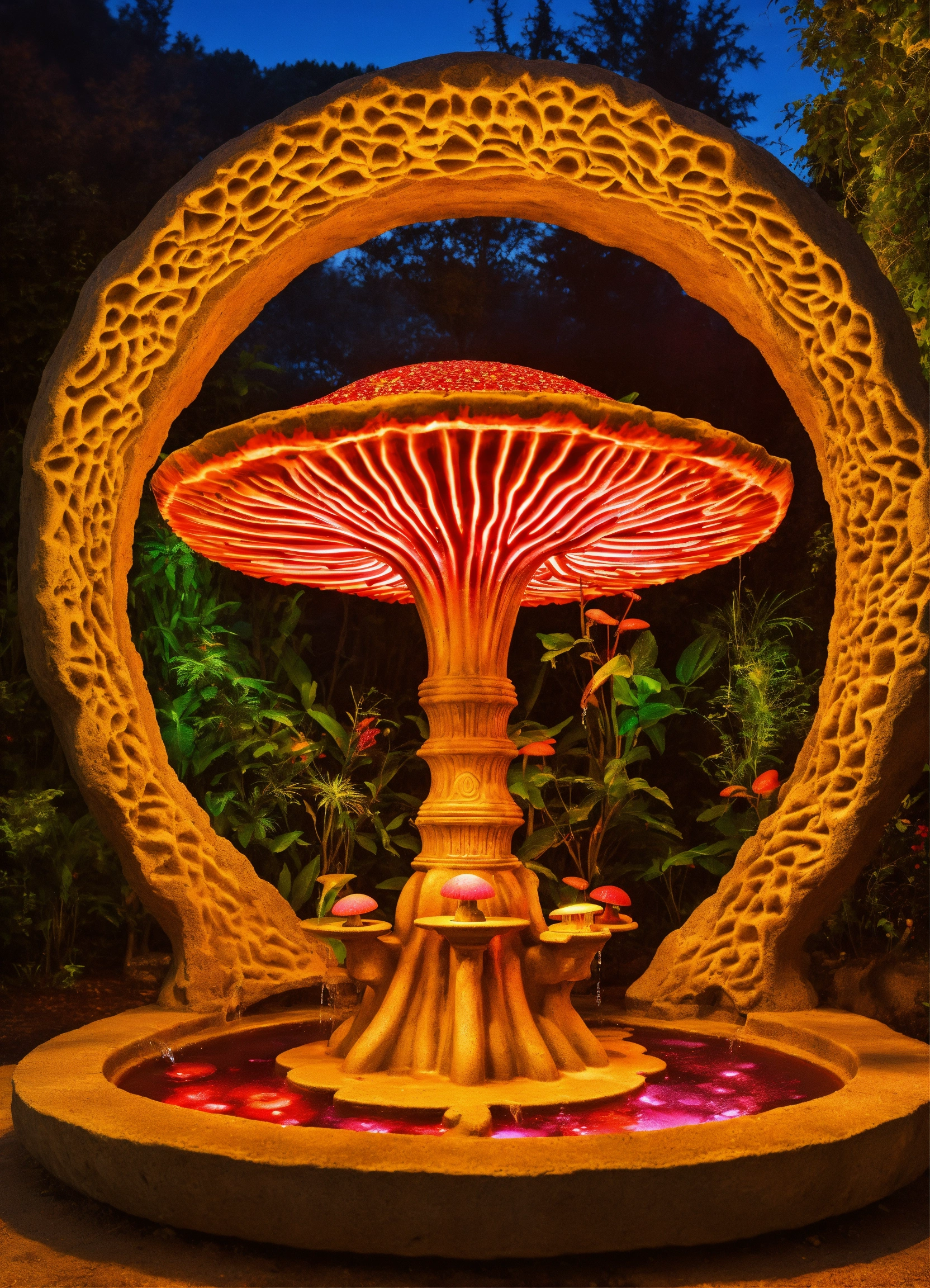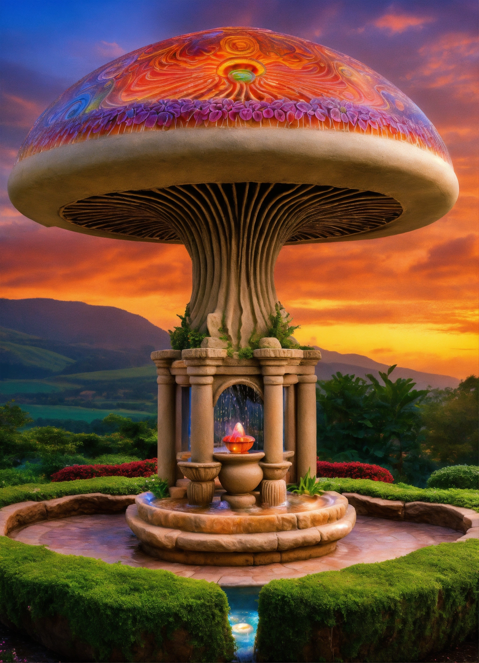 A round shaped ancient stone hand made meditative garden sculptured water fountain in the style of alex grey, magic mushroom, lsd, dmt