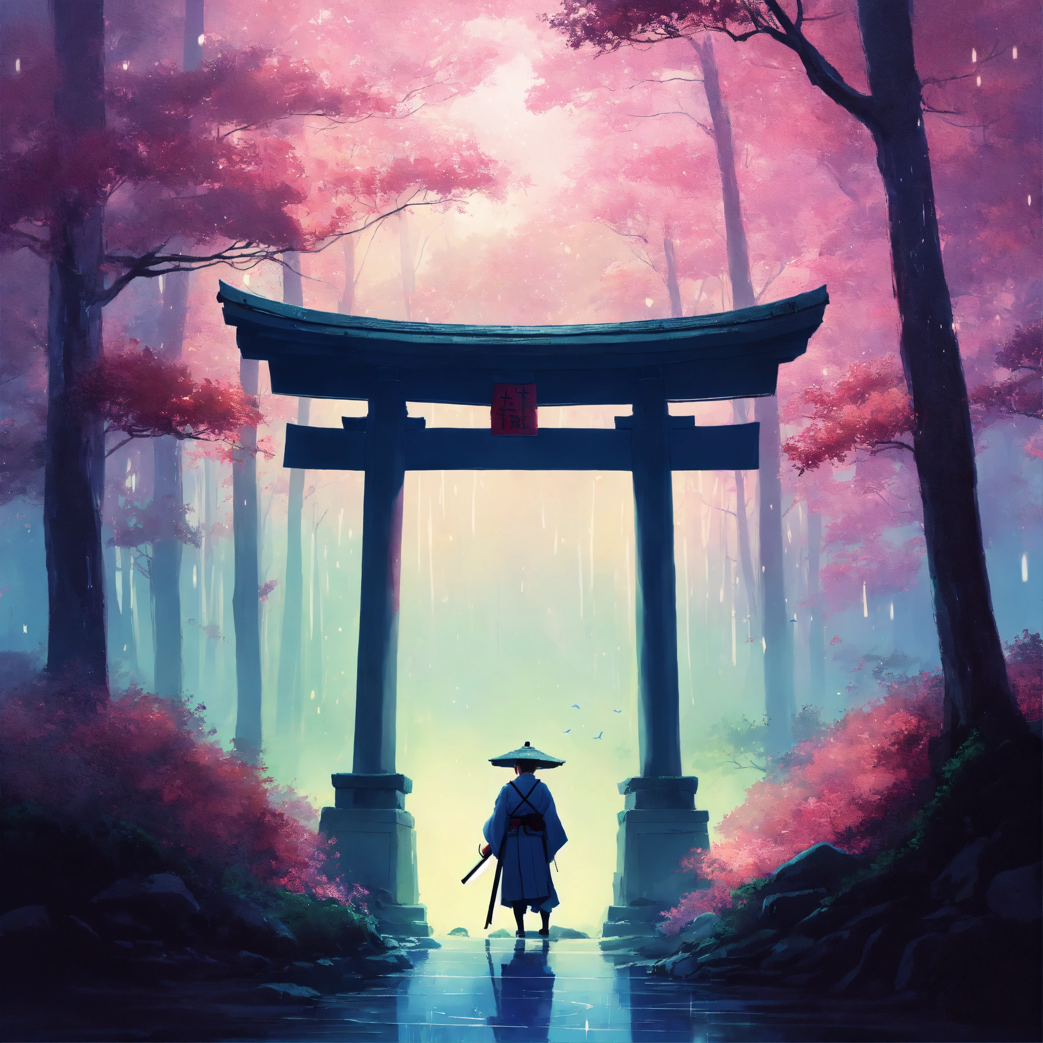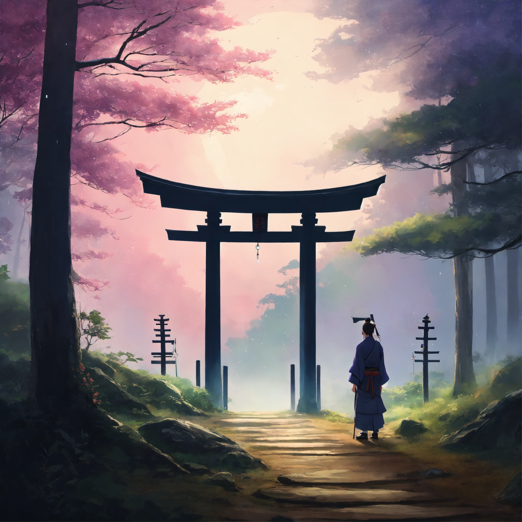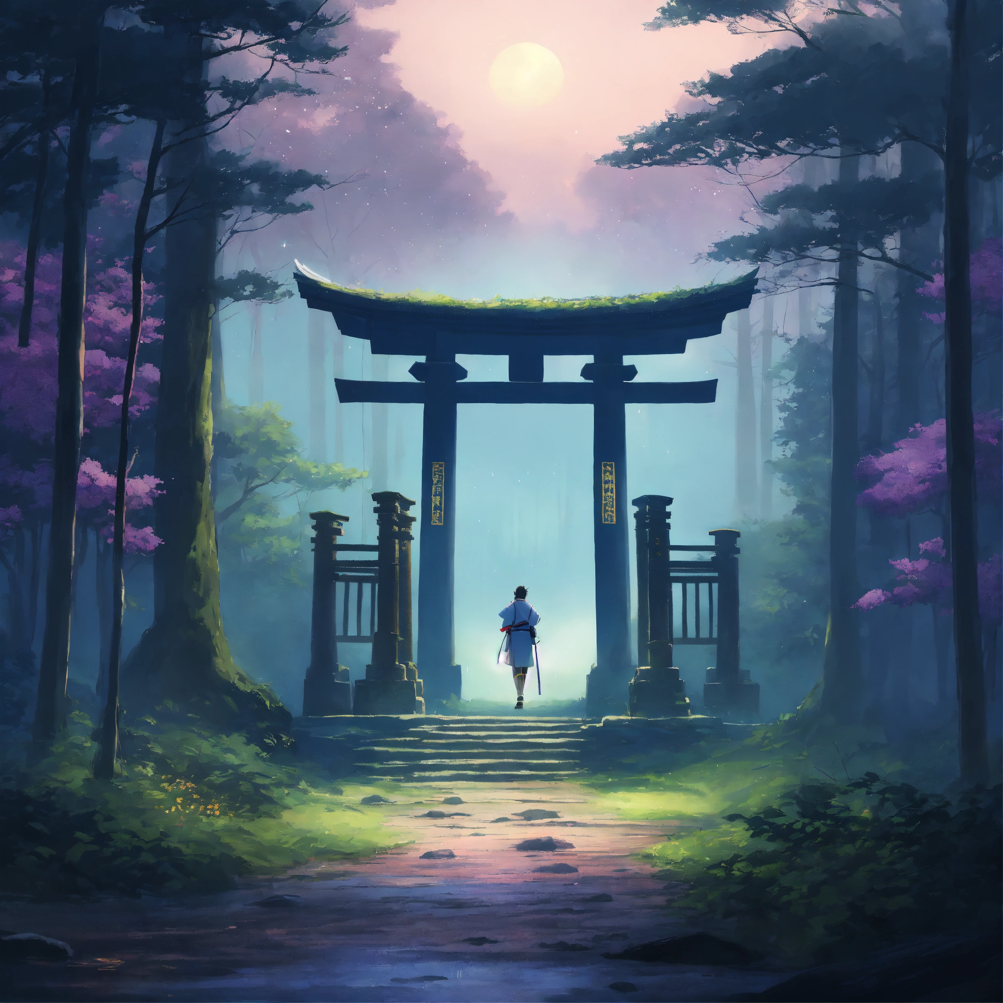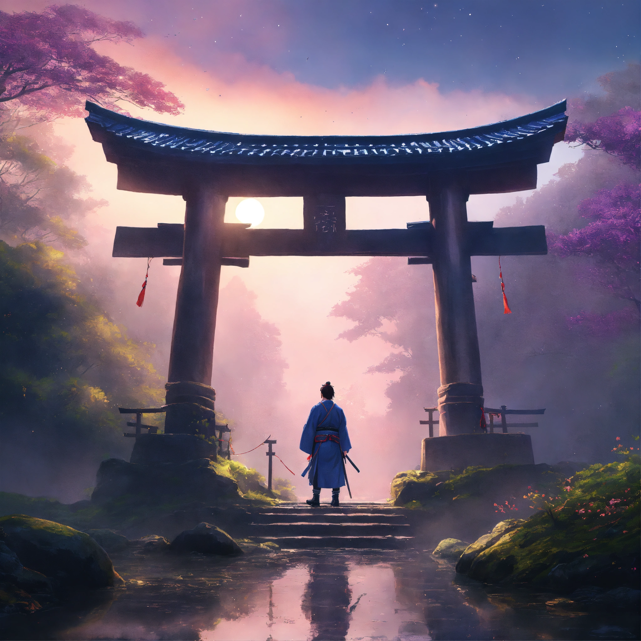 Place an ancient, large weathered stone face of a samurai warrior and torii gate in the middle of a forest, partially covered by mist, surrounded by a dreamy, pastel-colored backdrop. the scene exudes a sense of peace and contentment despite the rain. digital art painting by makoto shinkai and ghibli studio, diffuse lighting, cinematic, lighting, highly detailed, incredible quality gazing up at a starry night sky. soft hues of blues and purples dominate the color palette, creating a dreamy atmosphere.