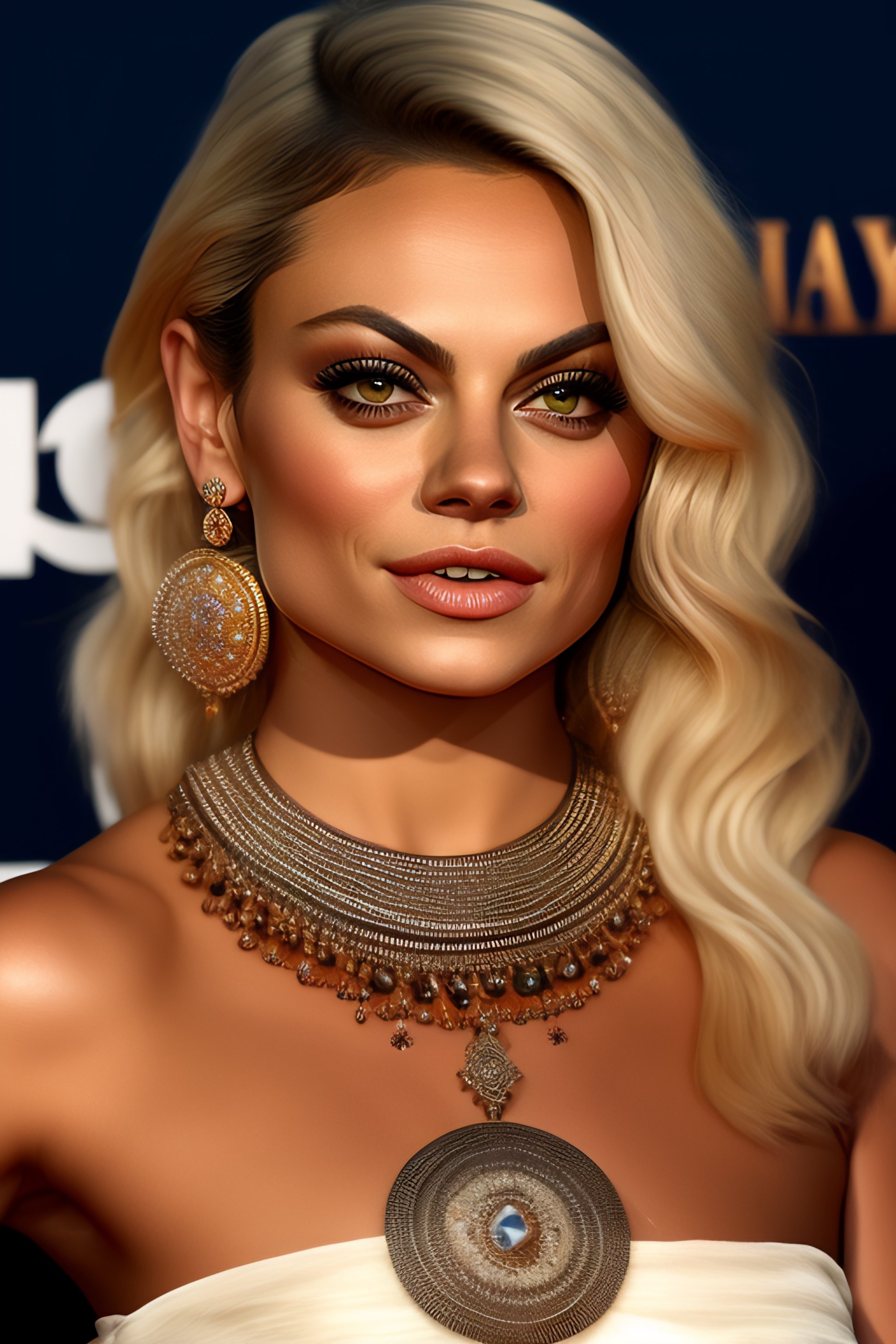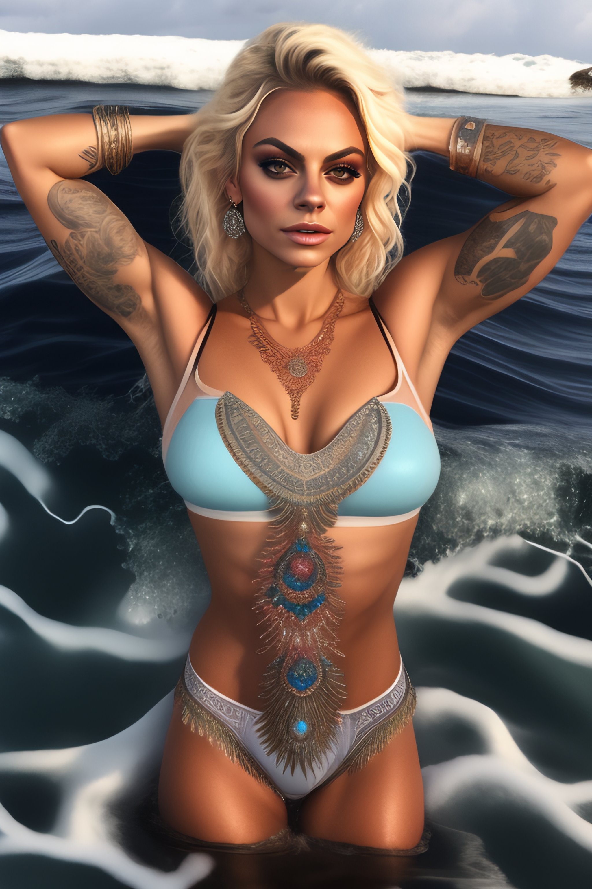 Medium shot of a heavily tattooed tanned platinum blonde mila kunis, arms up, detailed underarms, detailed underarm stubble, face in shot, intricate gold rhinestone chain swimming tiny outfit, lots of jewelry, earrings, navel ring, bracelet, necklace, heavy tan, heavy suntan lotioned, tattoos, facing camera