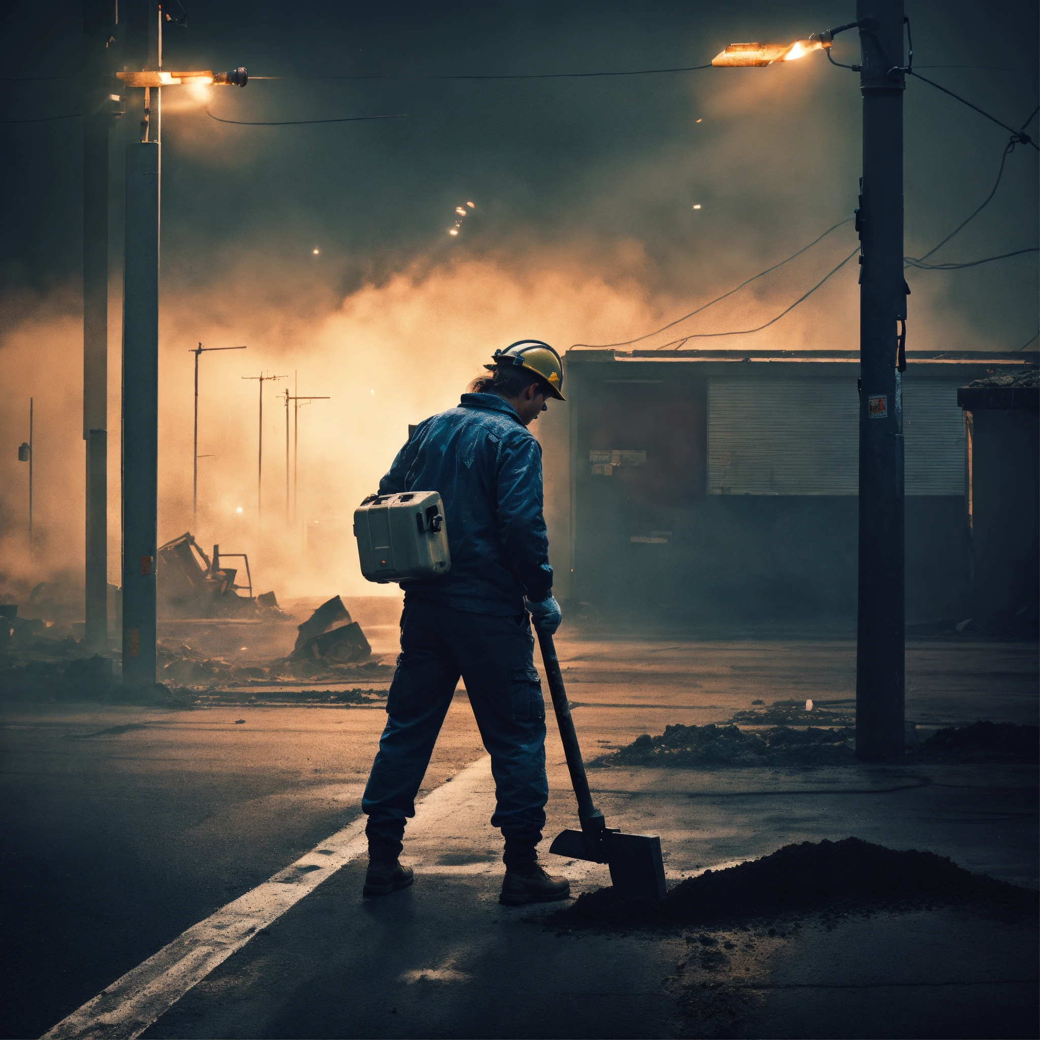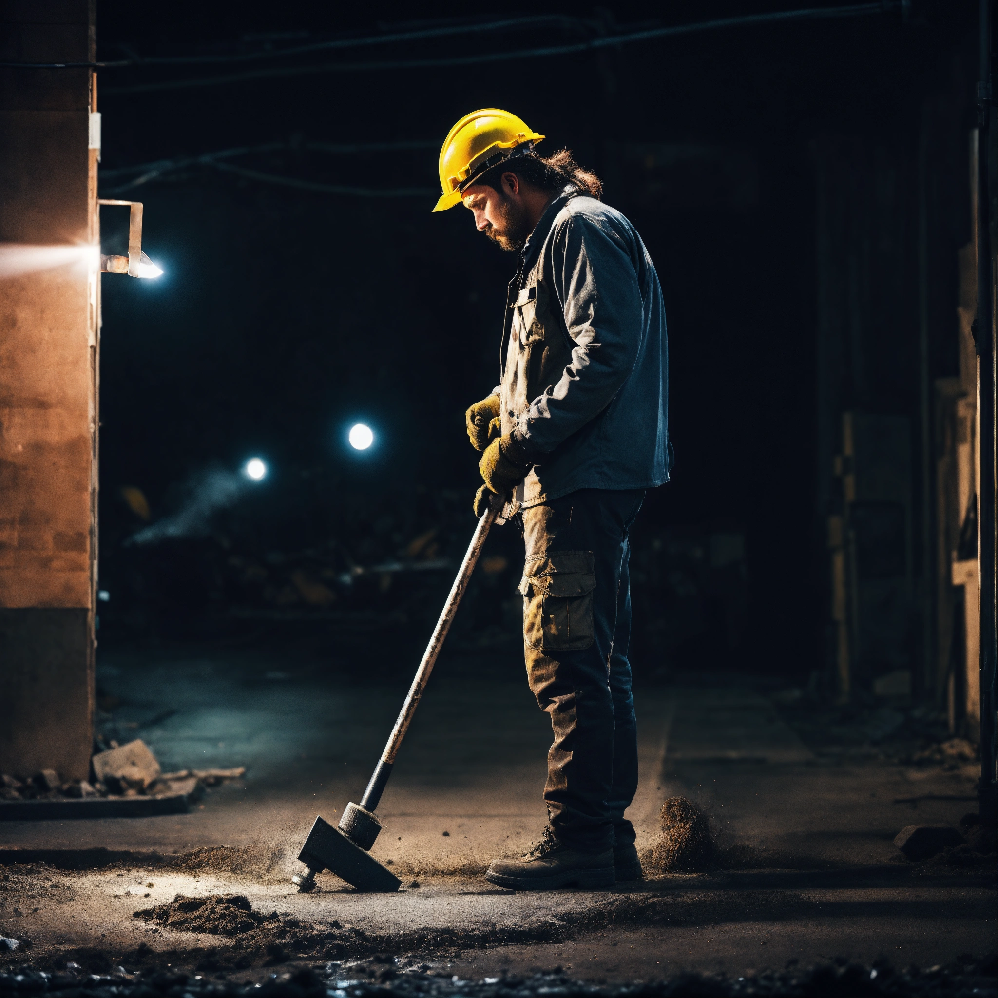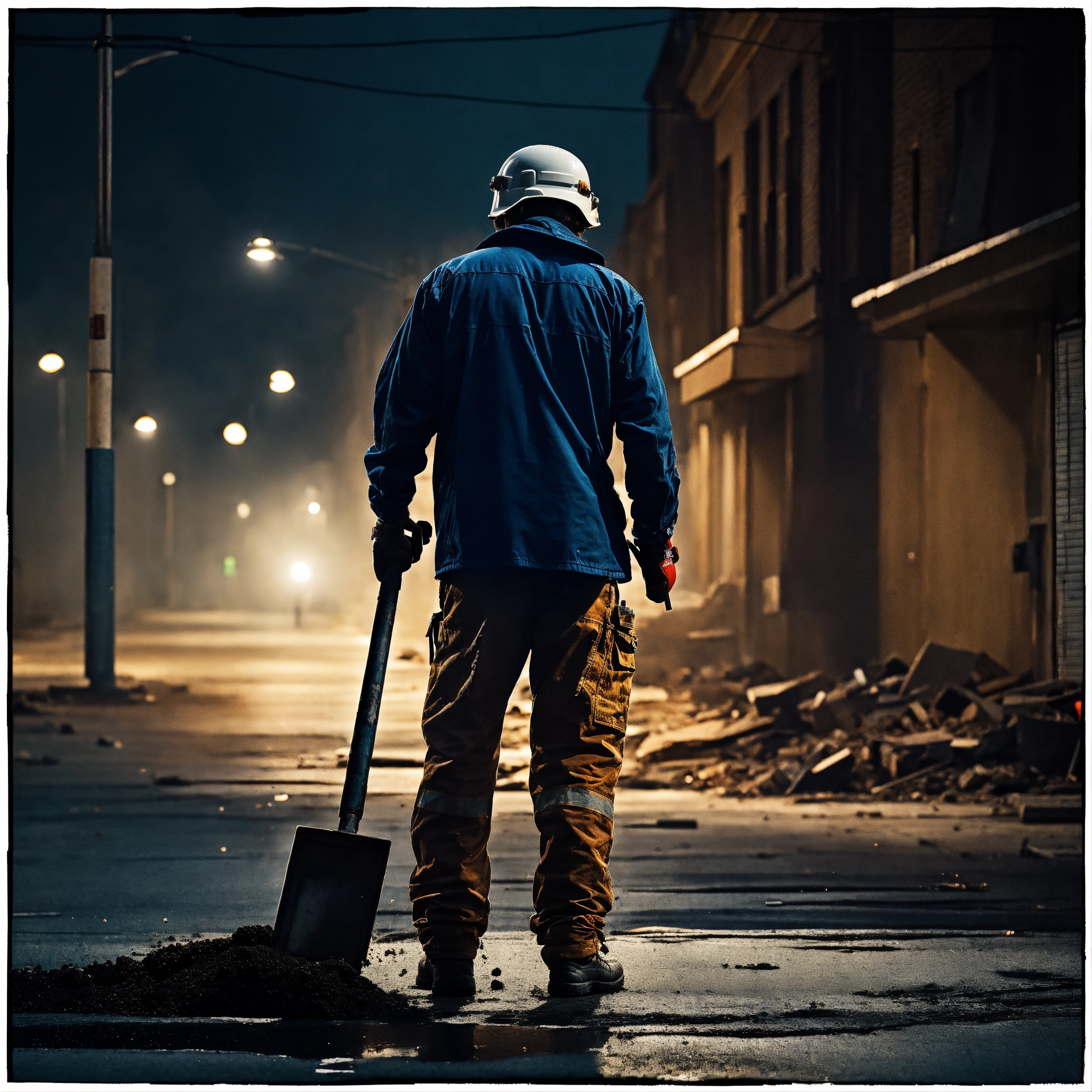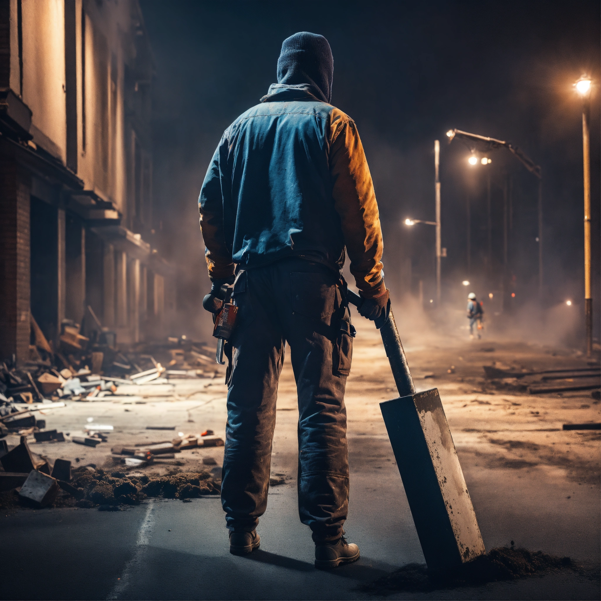 A full body man from behind with long hair and in work clothes, with a demolition hammer in his hands drilling the asphalt; a lonely street; in the style of dark hues; a light at the end of the street