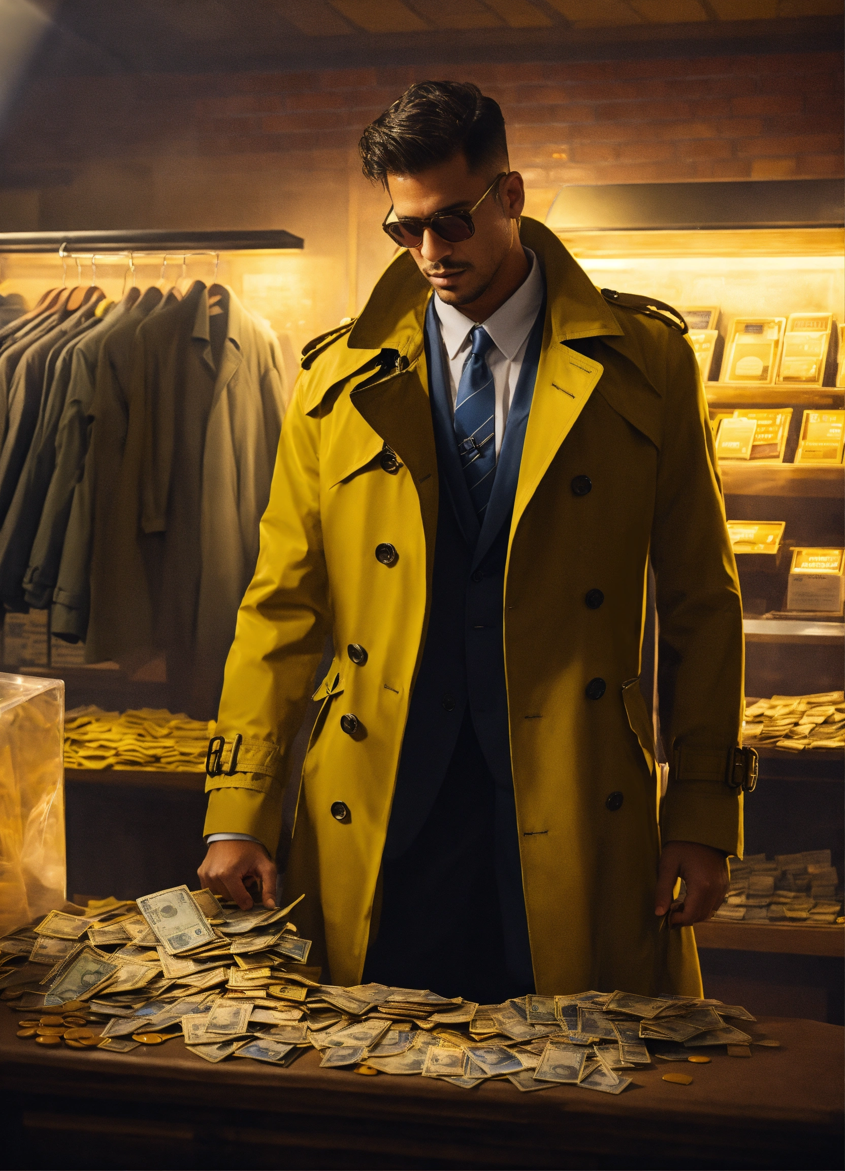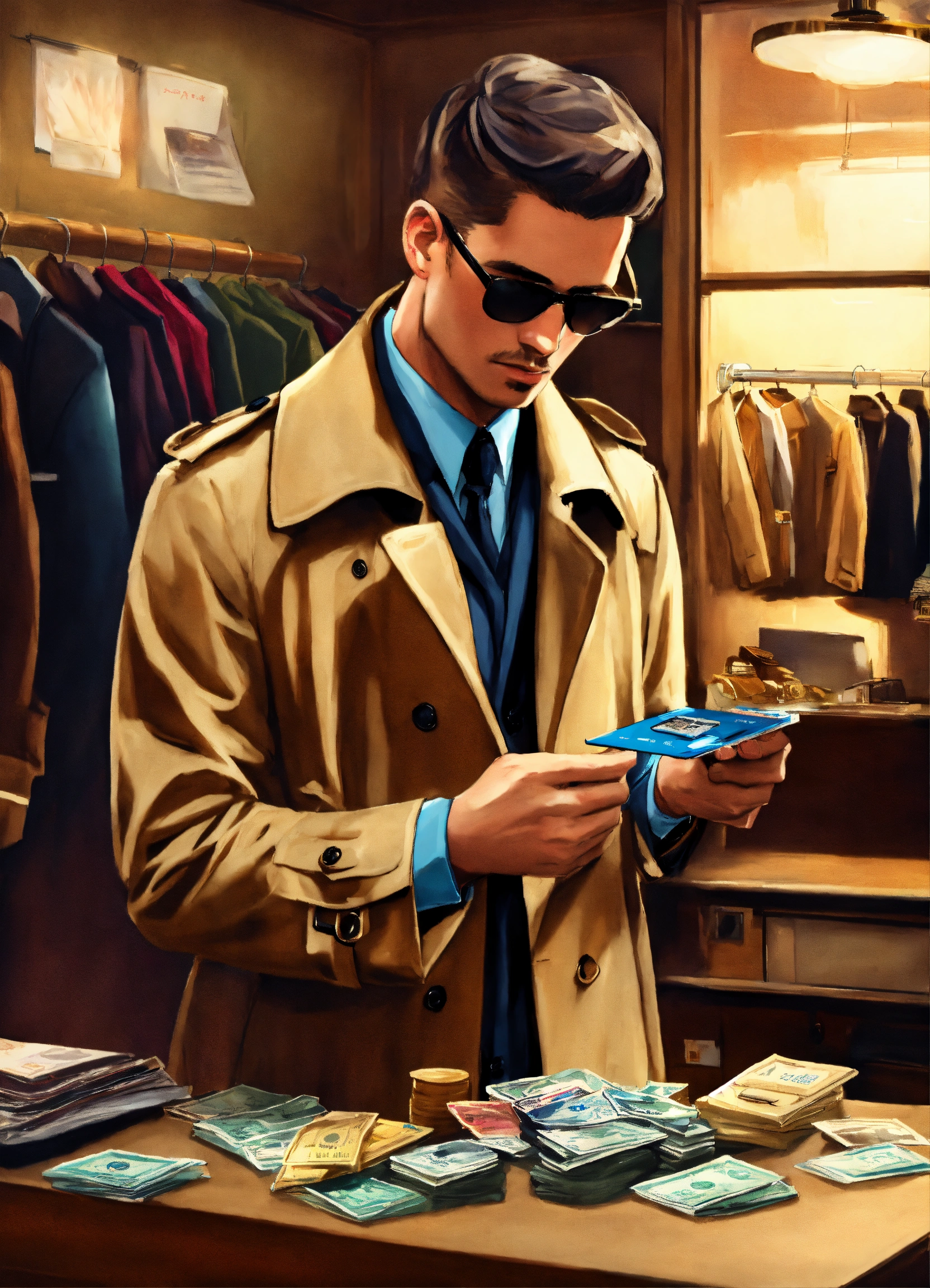 Trench coat dealer opens his coat and has a lot of illegal bank pos in his coat