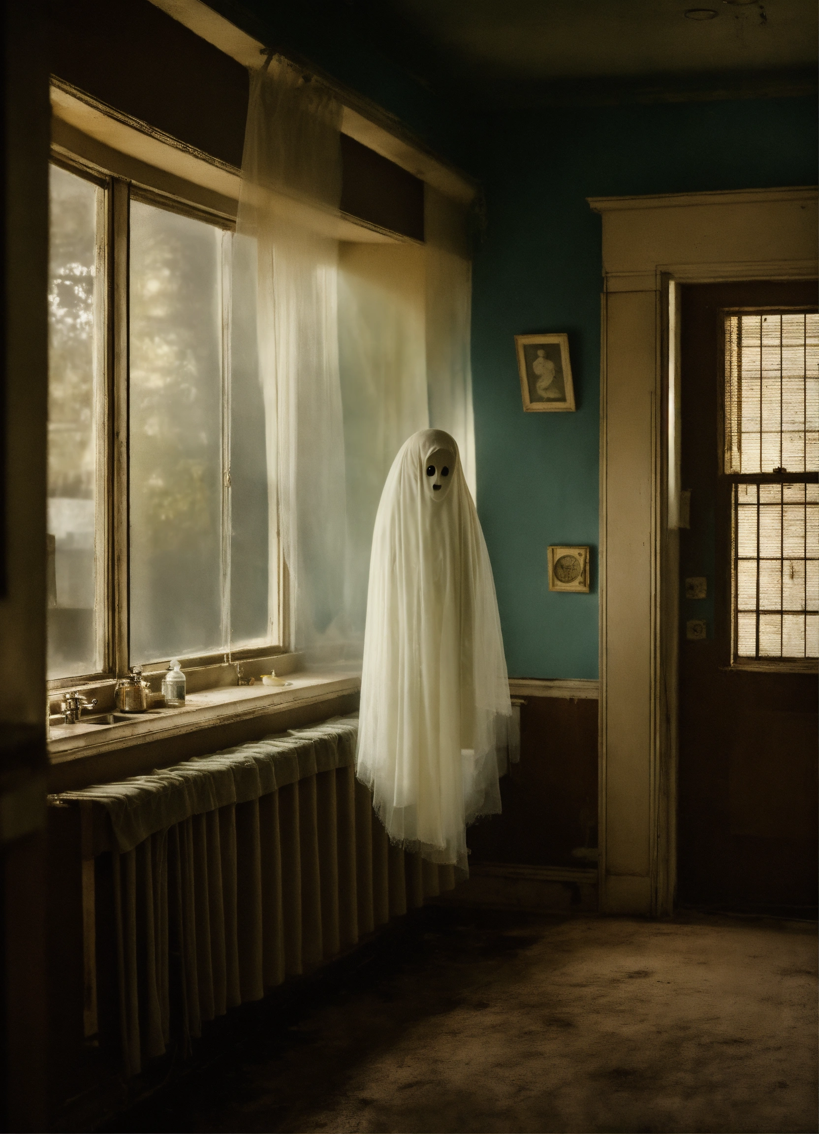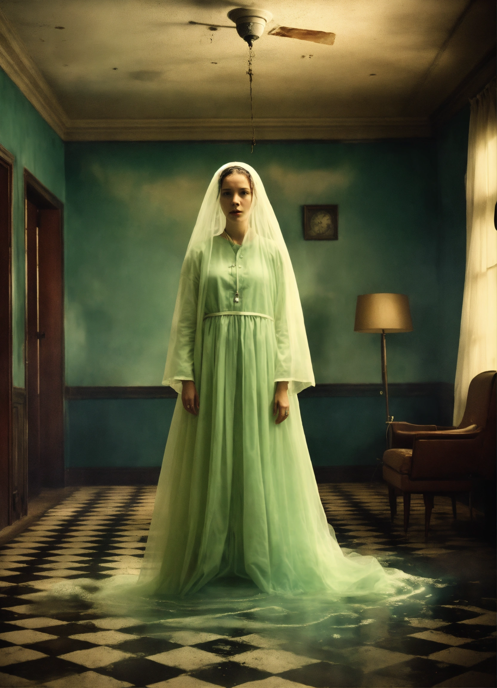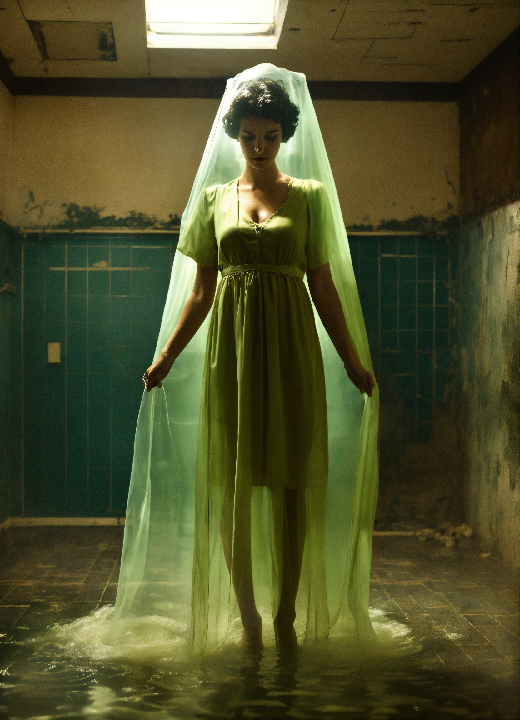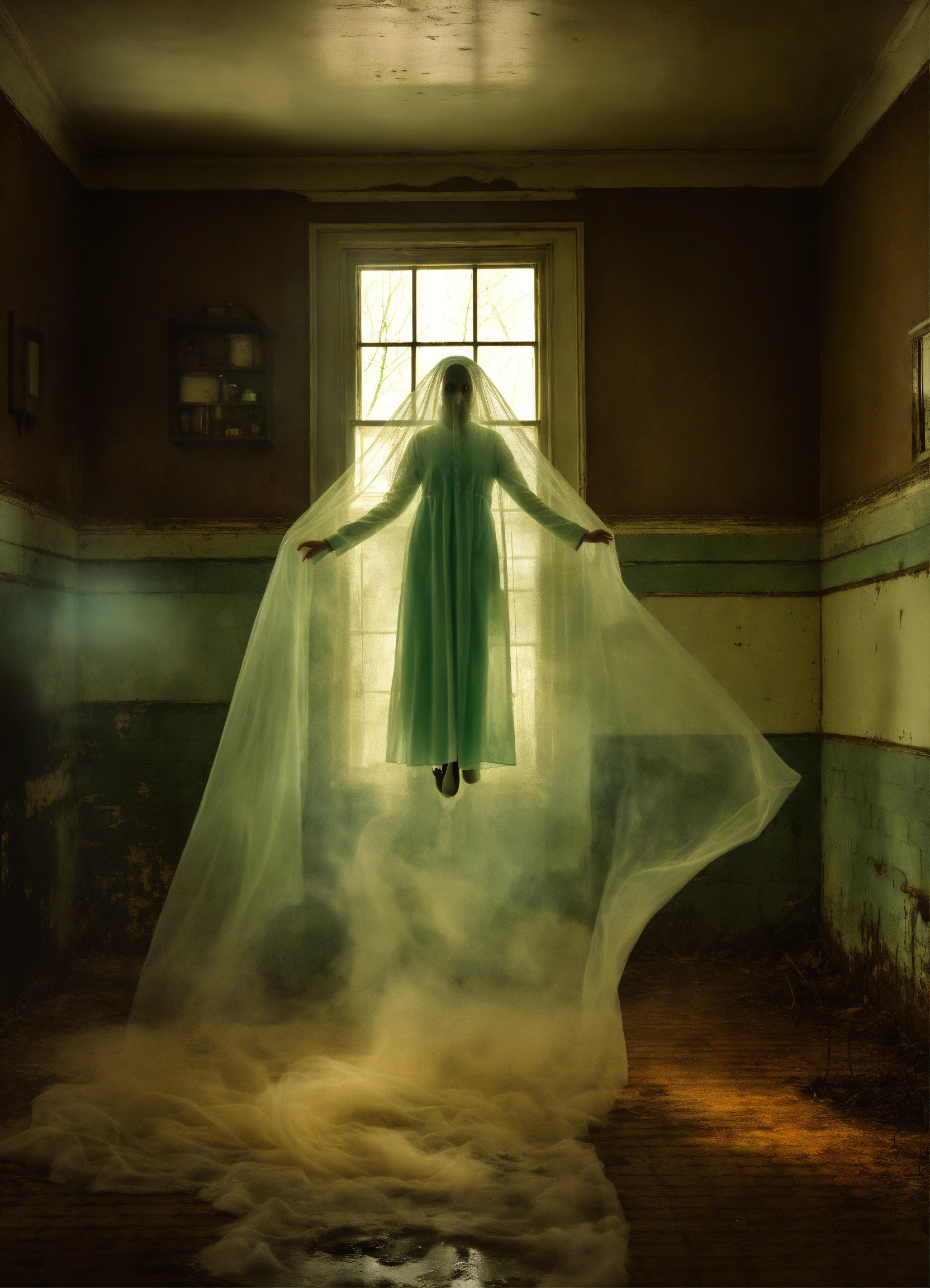 Mid-century, photo realistic, floating flying ghost see-through, eery, dark, moldy, doctor, dirty water, mental hospital, hair, dishdasha