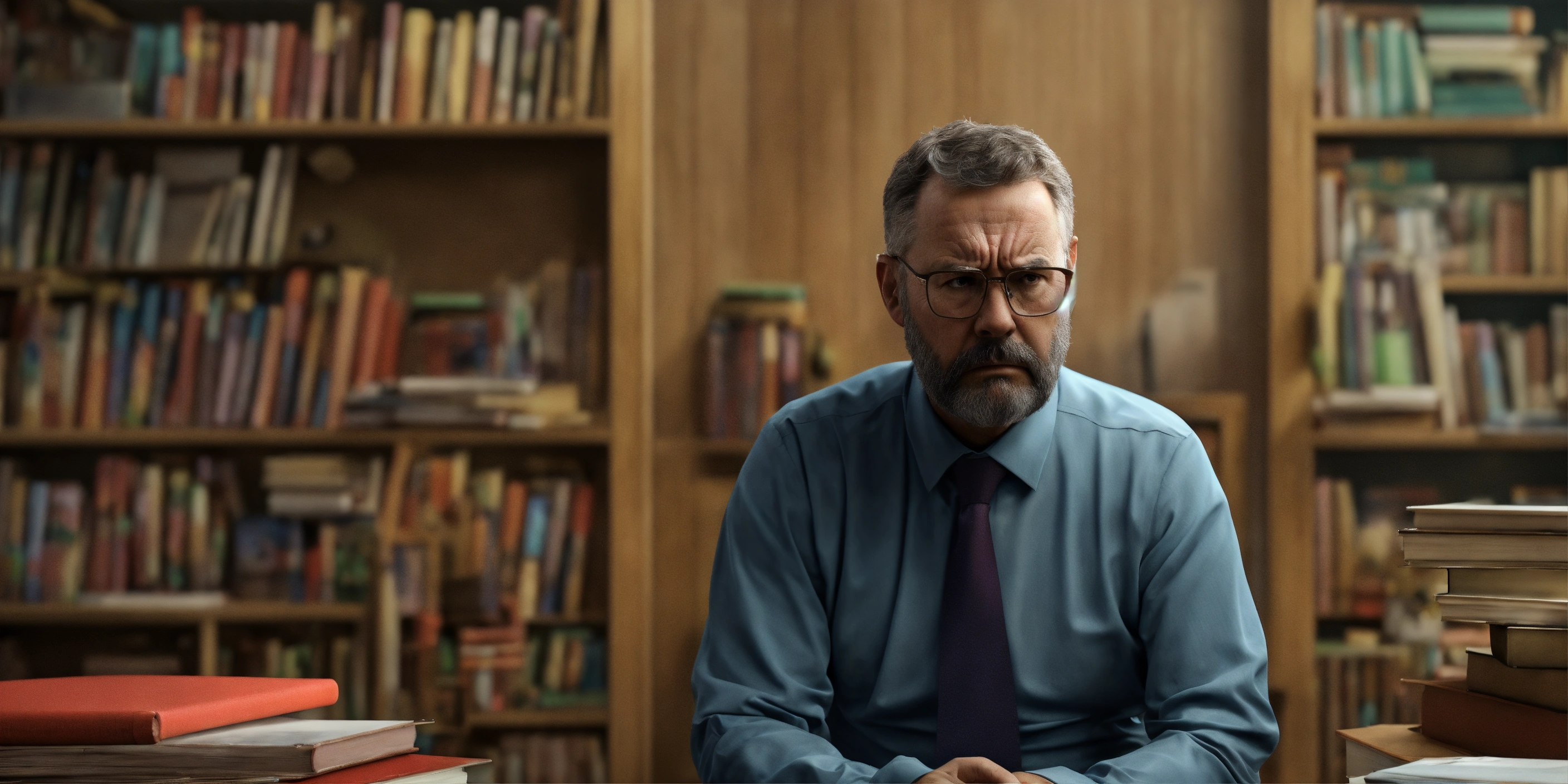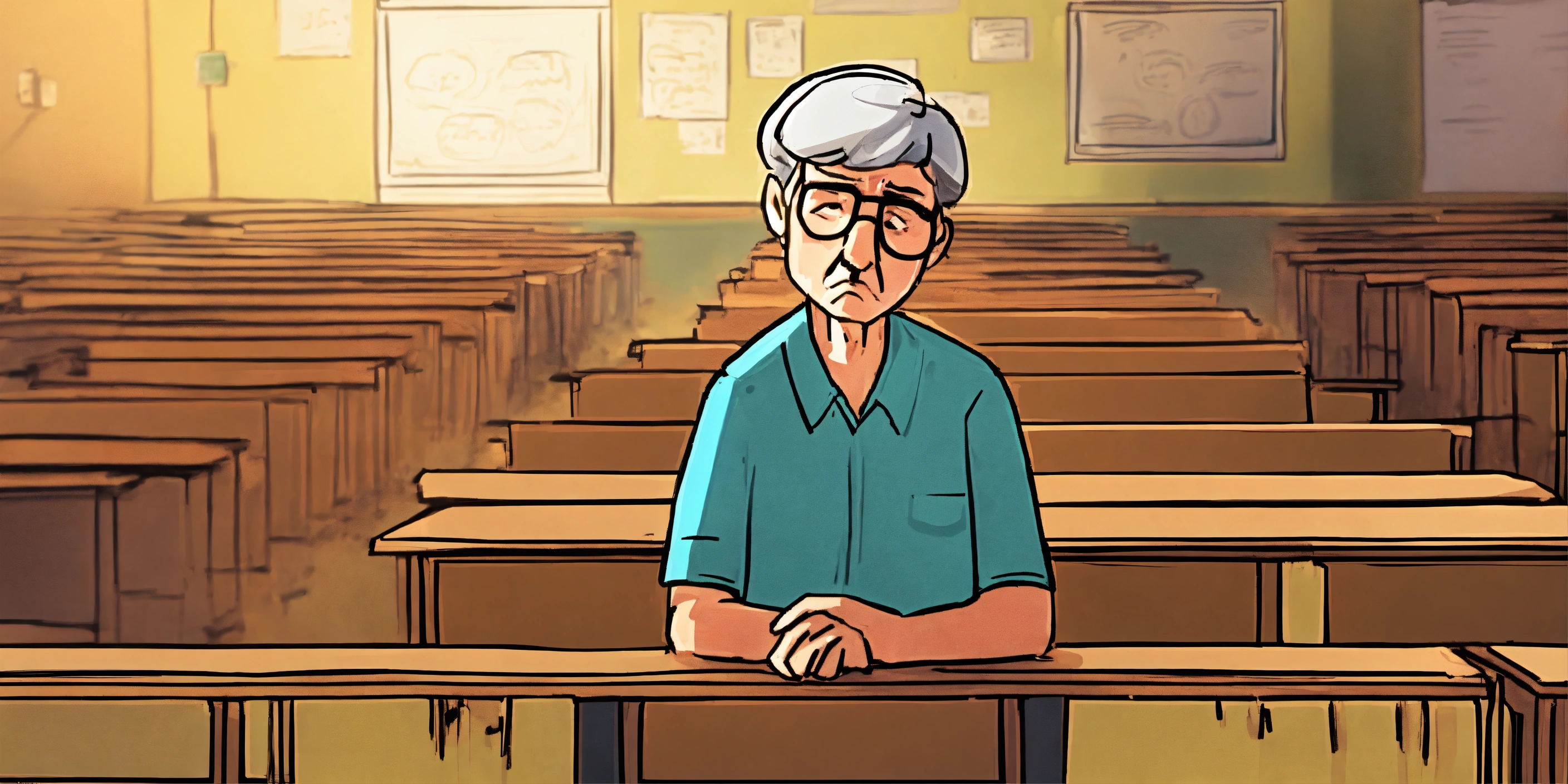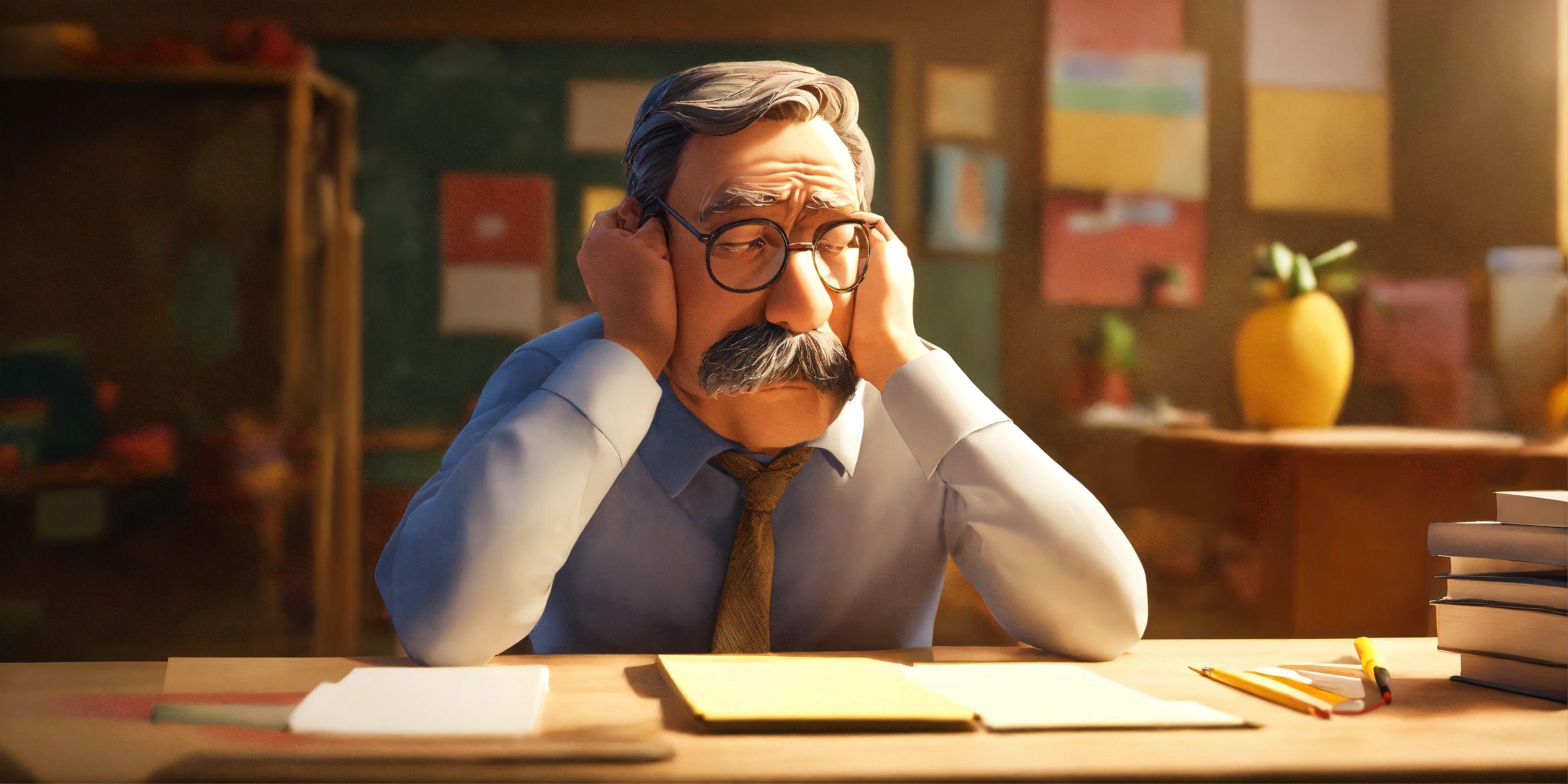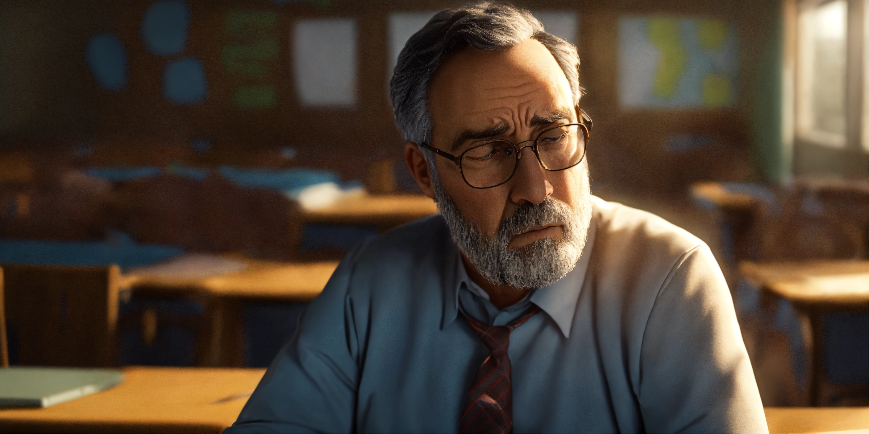 In the center of the image, there is a middle-aged teacher, with a tired and sad face, looking down with an expression of discouragement. it's not in drawing. it's a 3d image