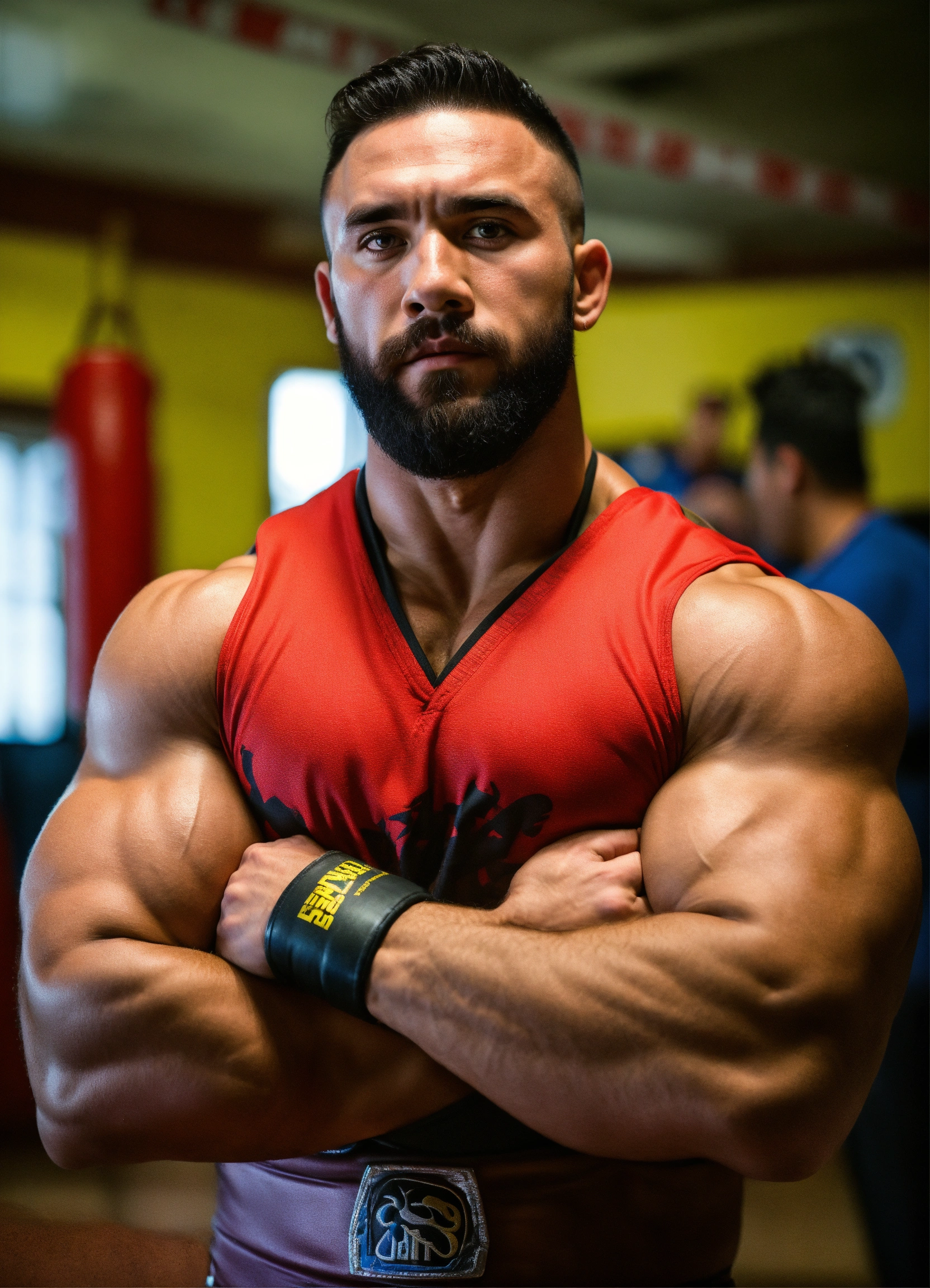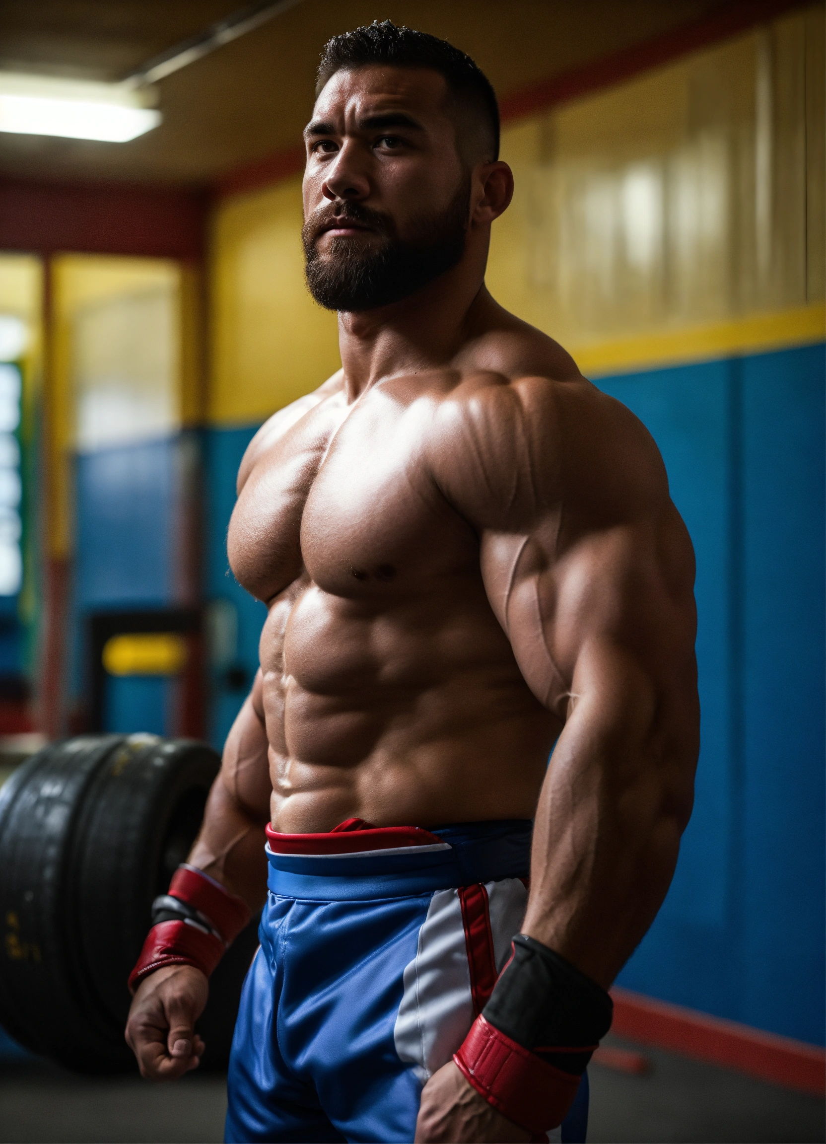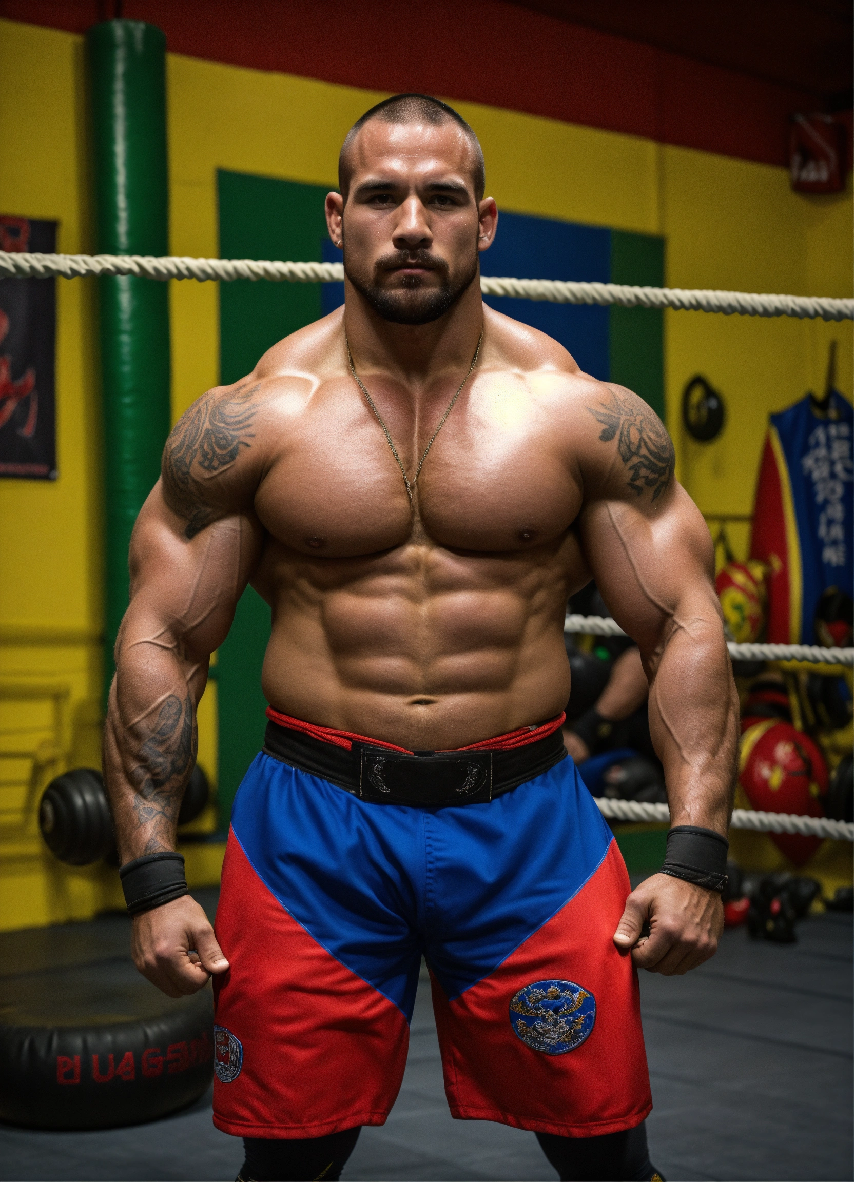 30-year-old wrestler with big muscles in a dojo