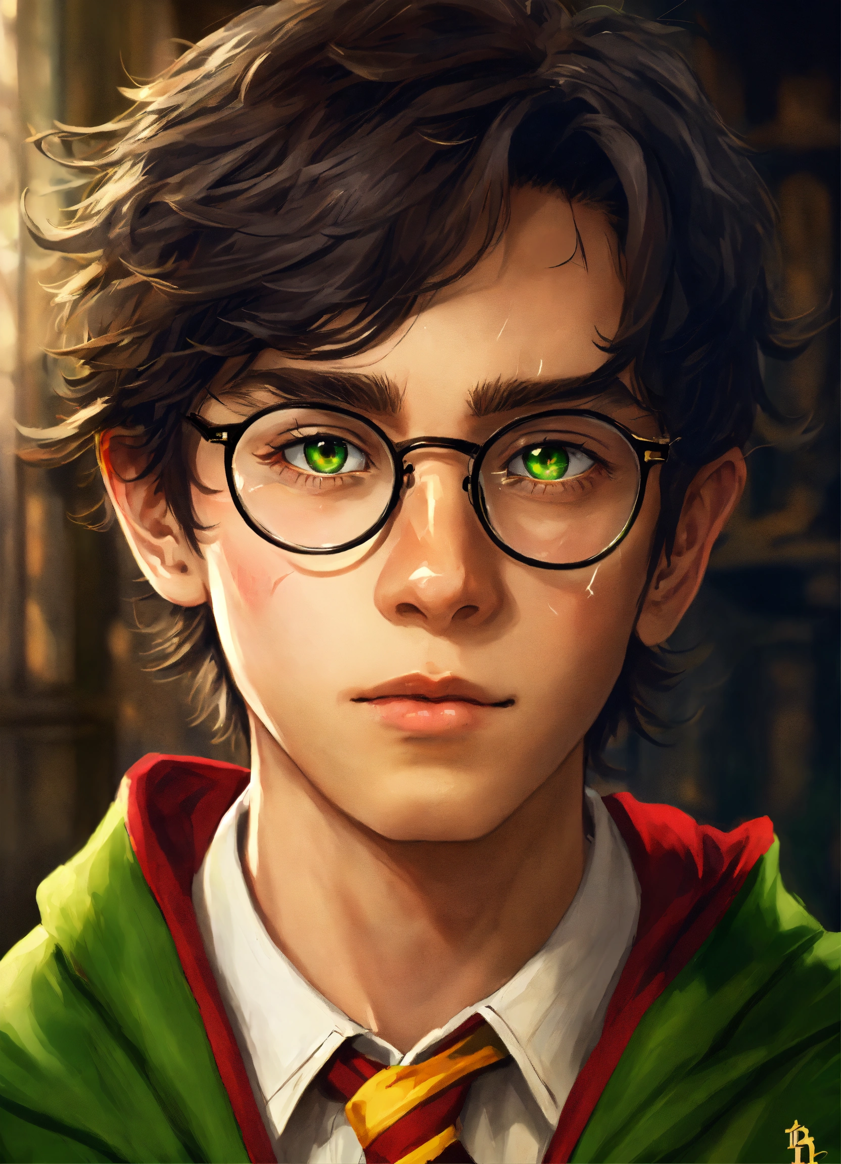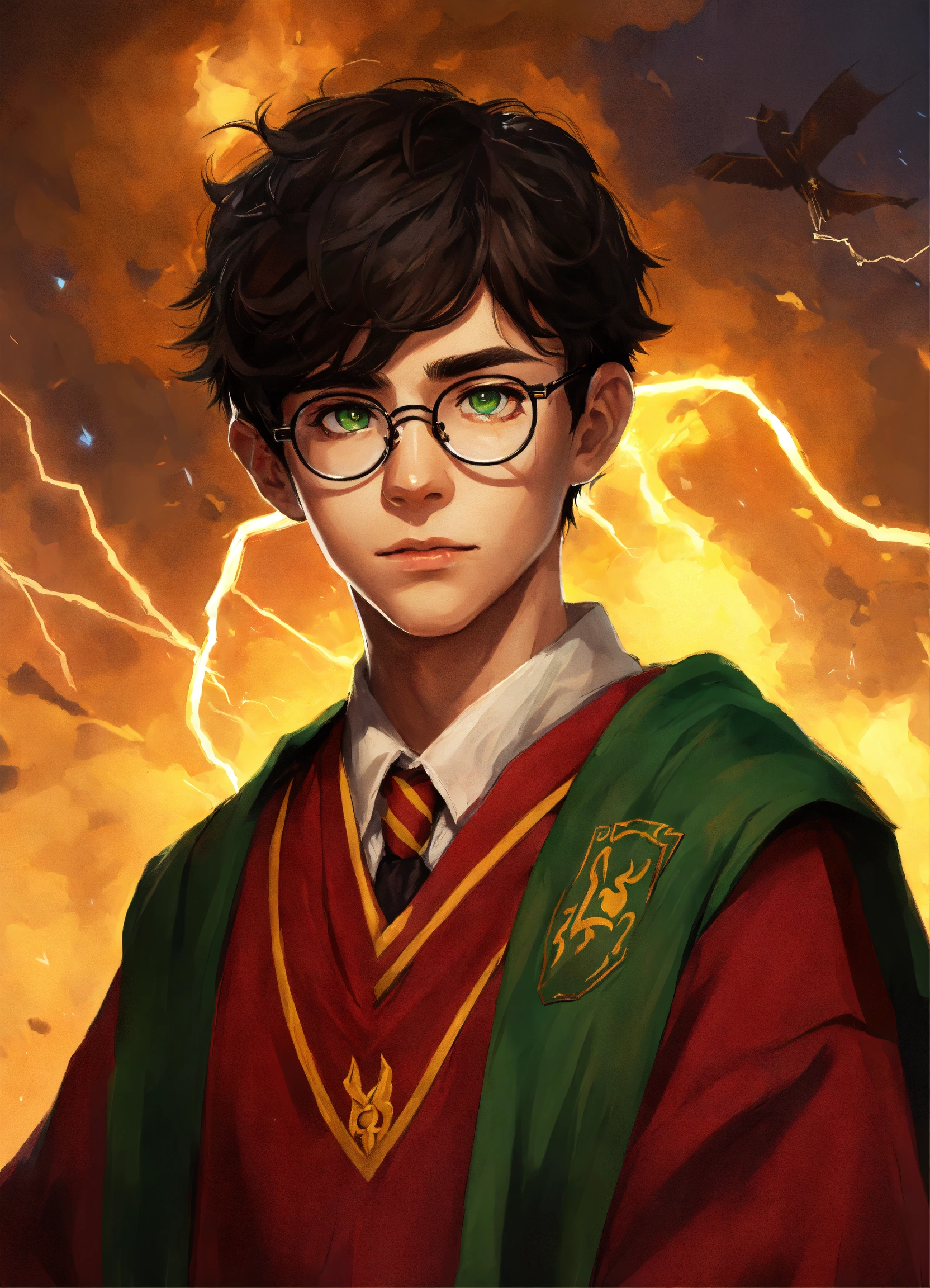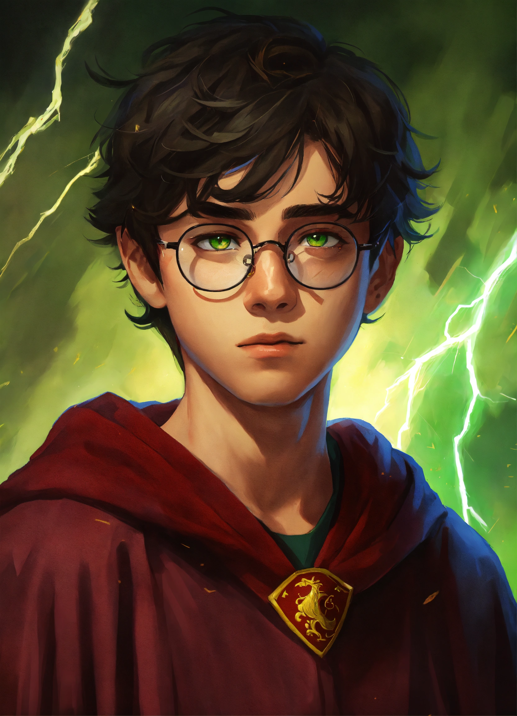 13-year-old male, untidy black hair, bright green eyes, thin face, round rimmed glasses, lightning scar on his forehead, gryffindor robes