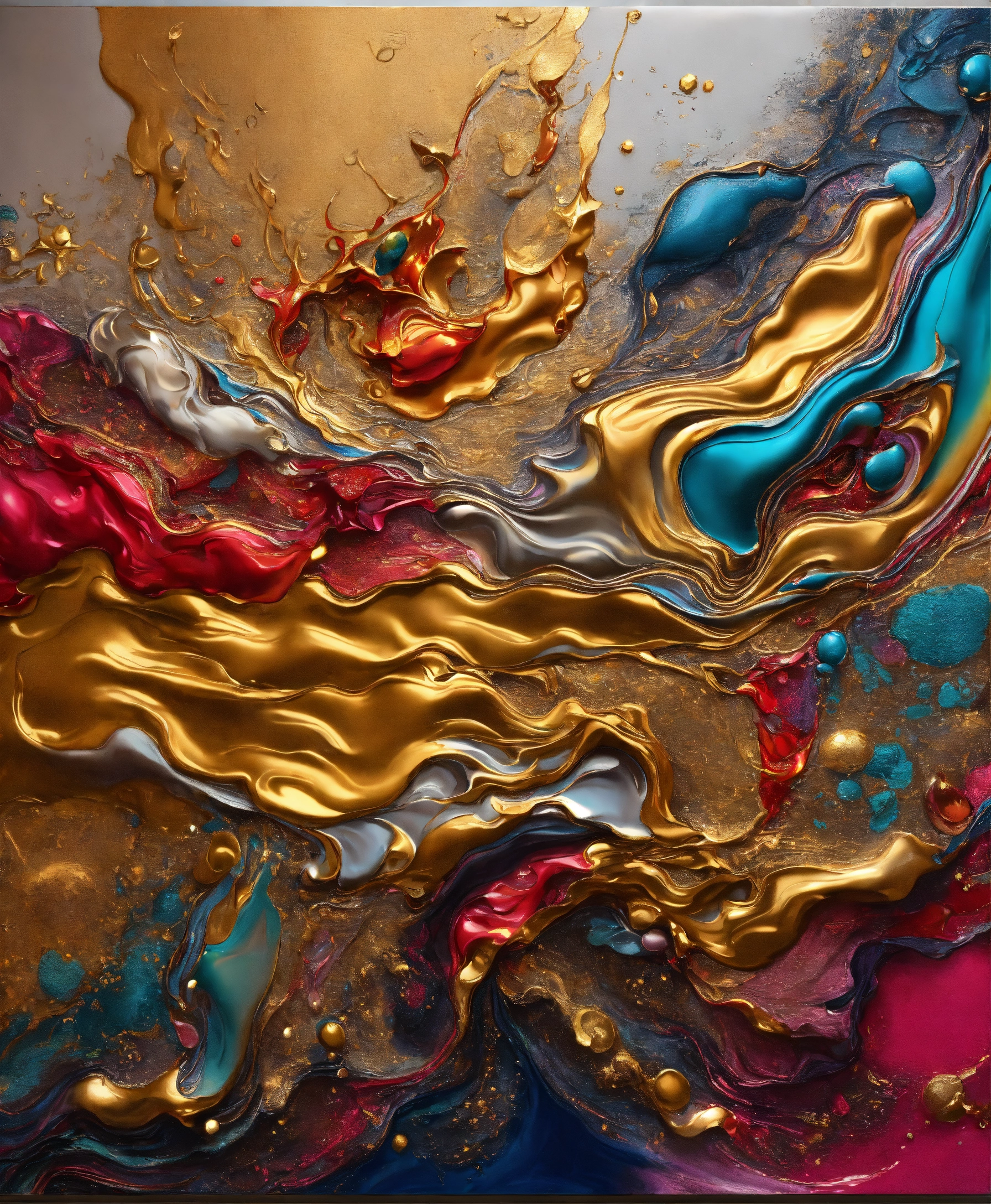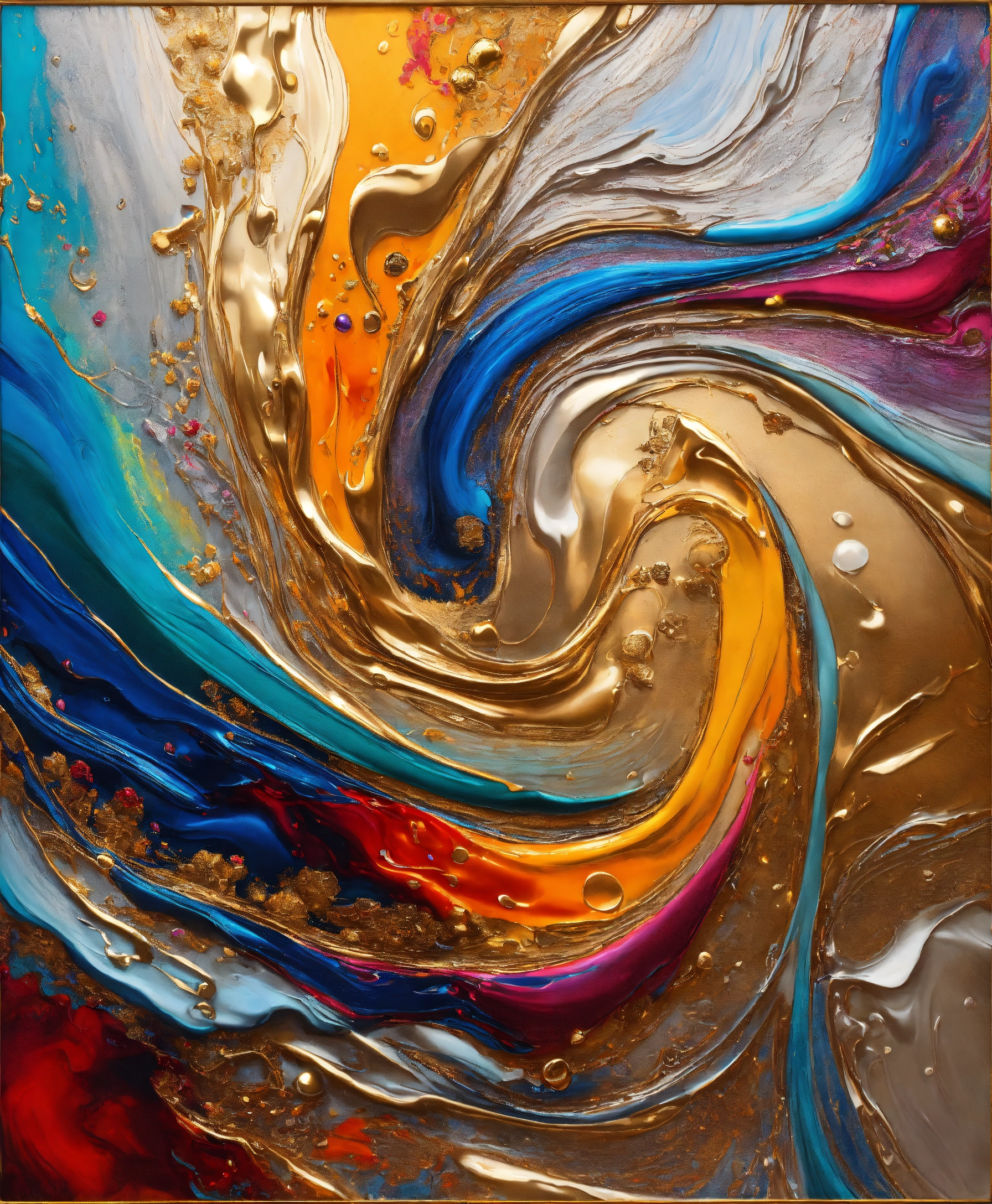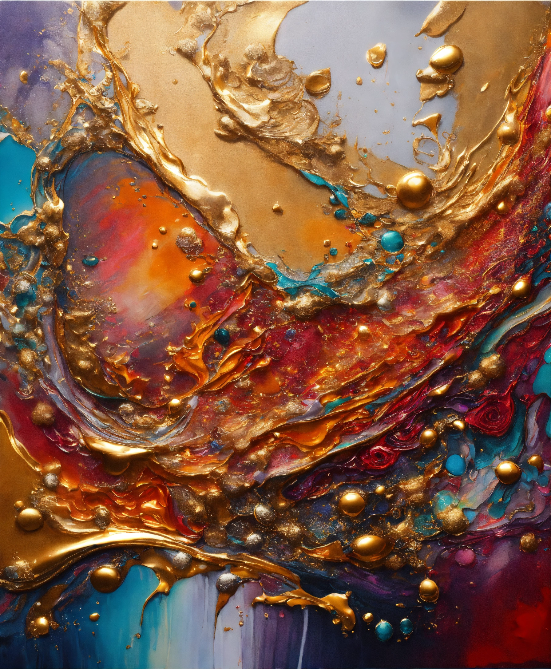 Colorful abstract painting oil and water complex complicated bright vivid colors beautiful opulent wealthy intricate all hues sublime delicate hyperdetailed masterpiece metallic sheen awesome 24k gold and silver trim 8k