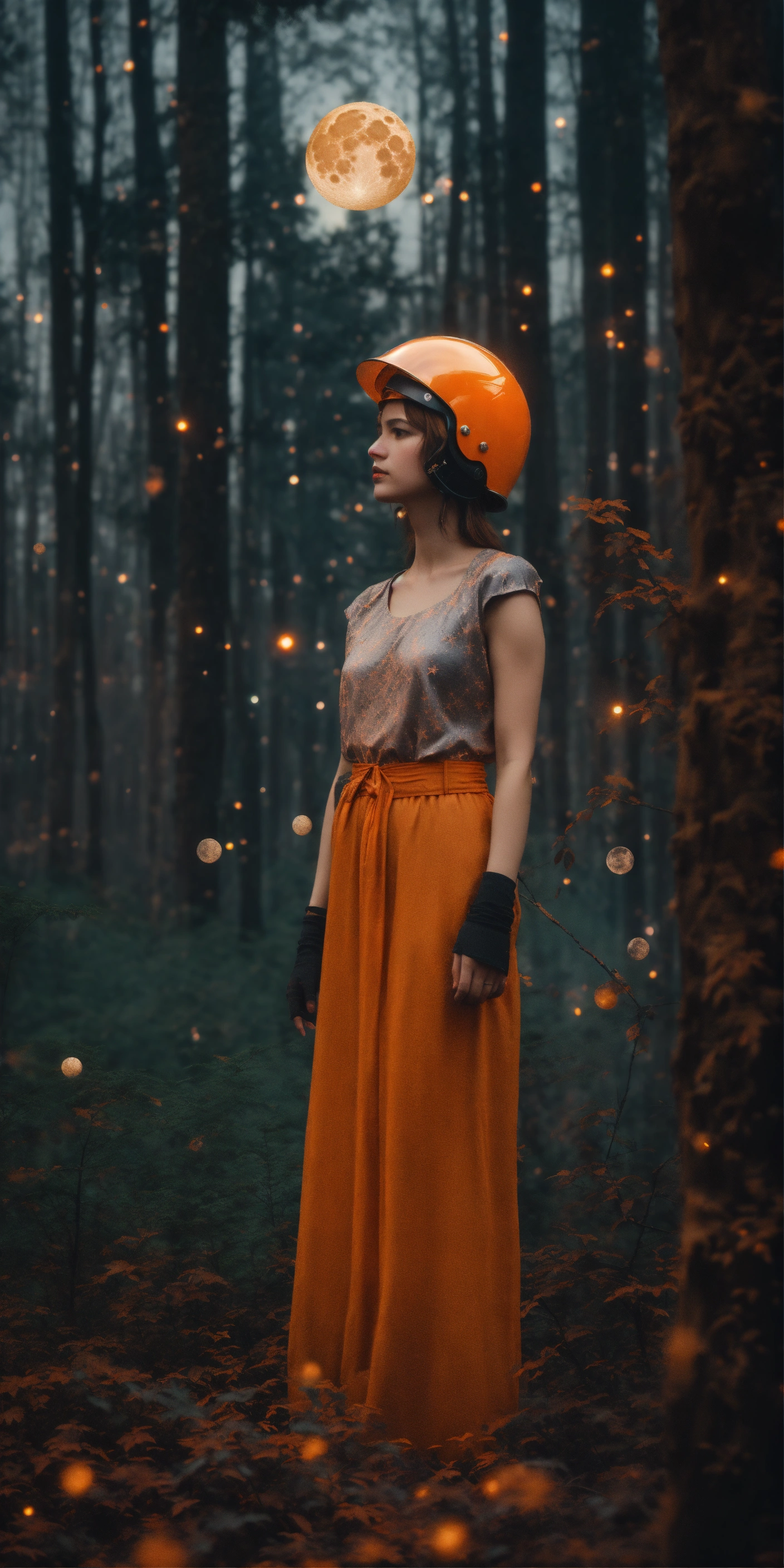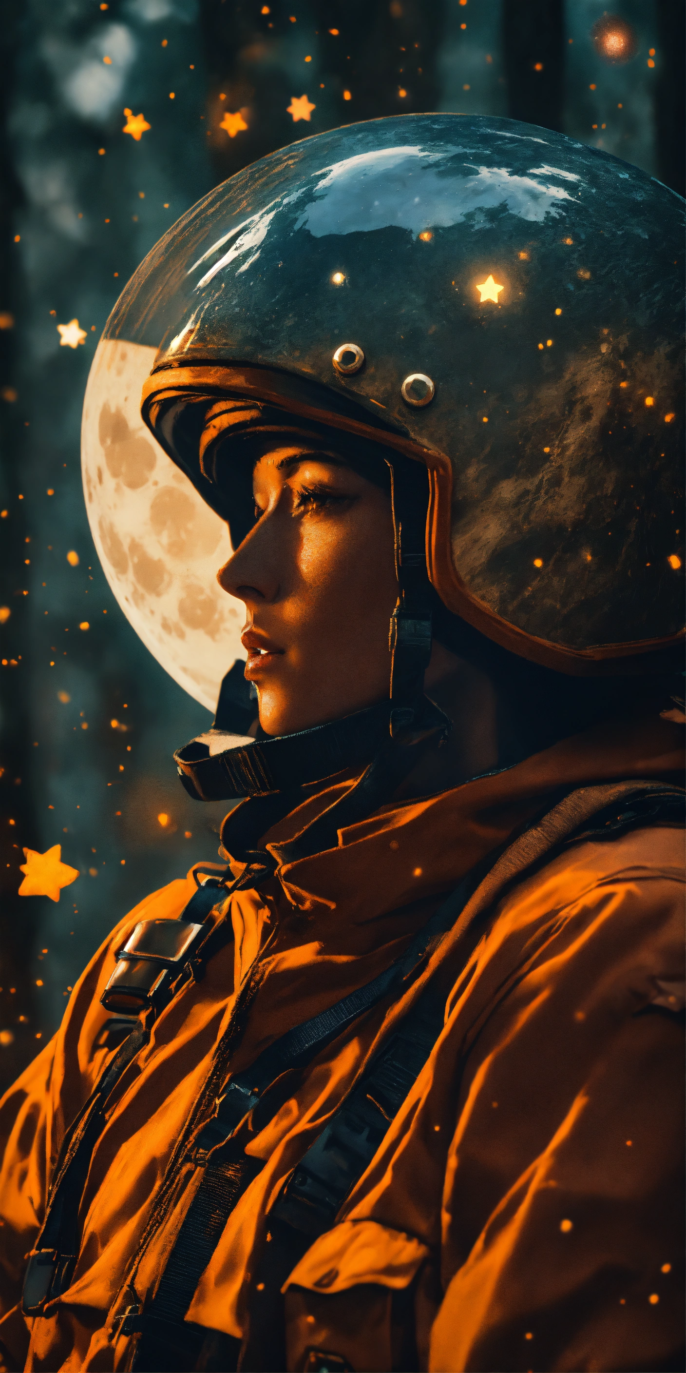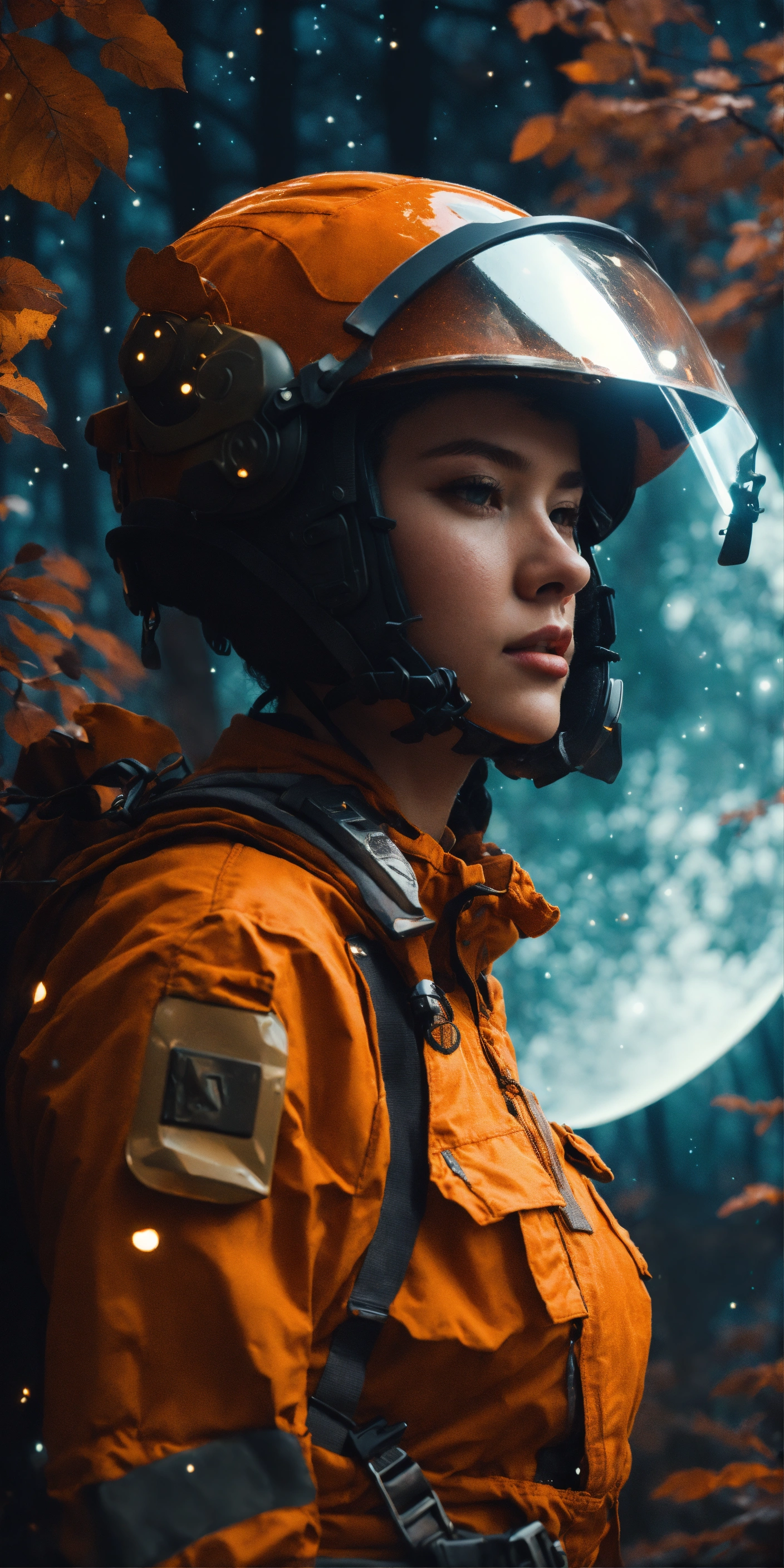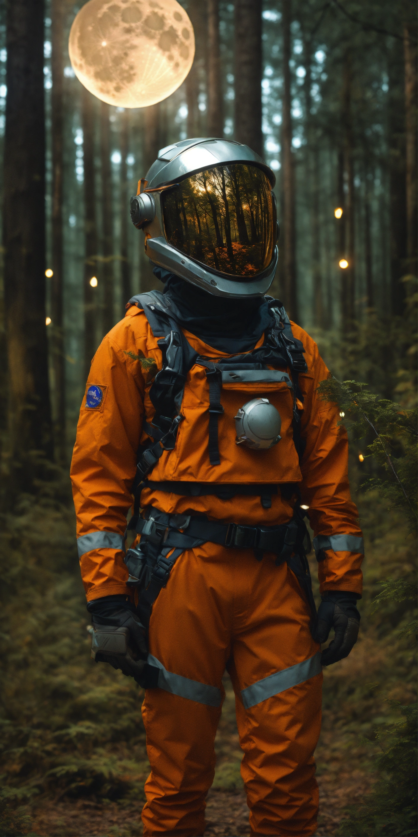 Waist-up, muted photo magically lights moon stars dark forest, broken helmet tangerine, muted palette, muted colors, detailed, 8k, reflections