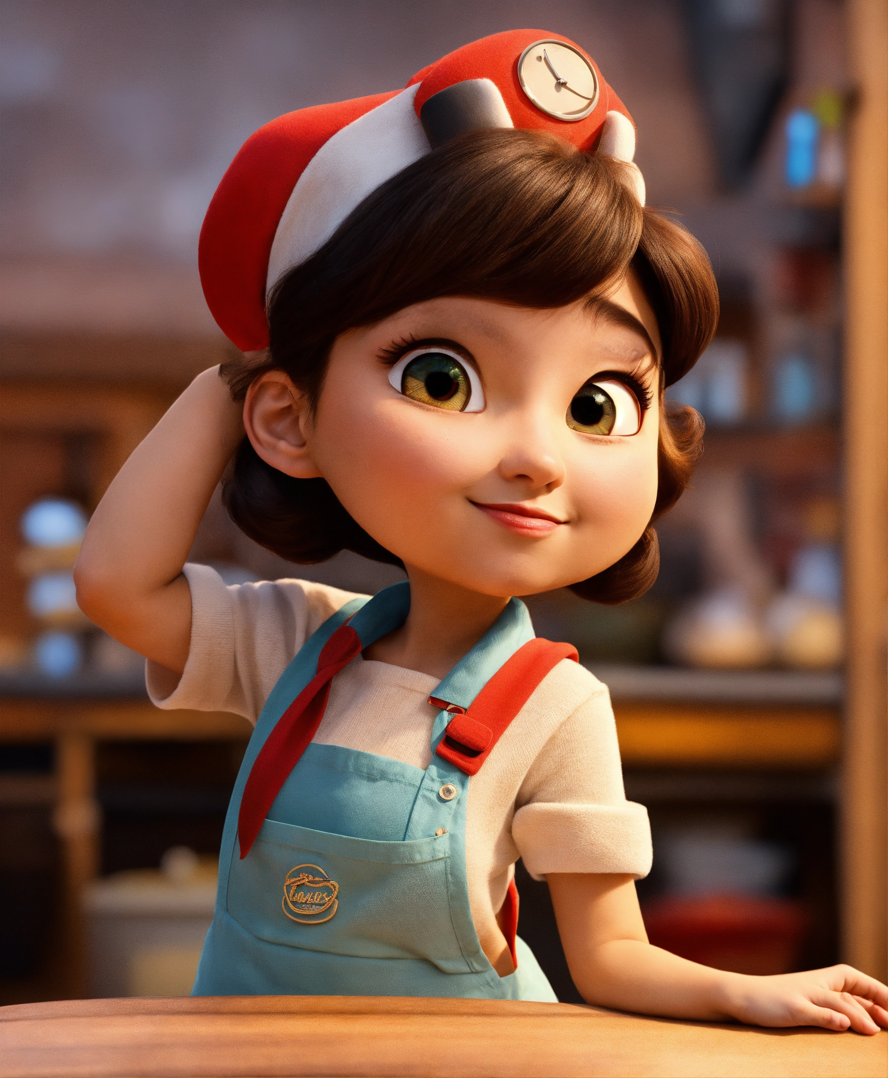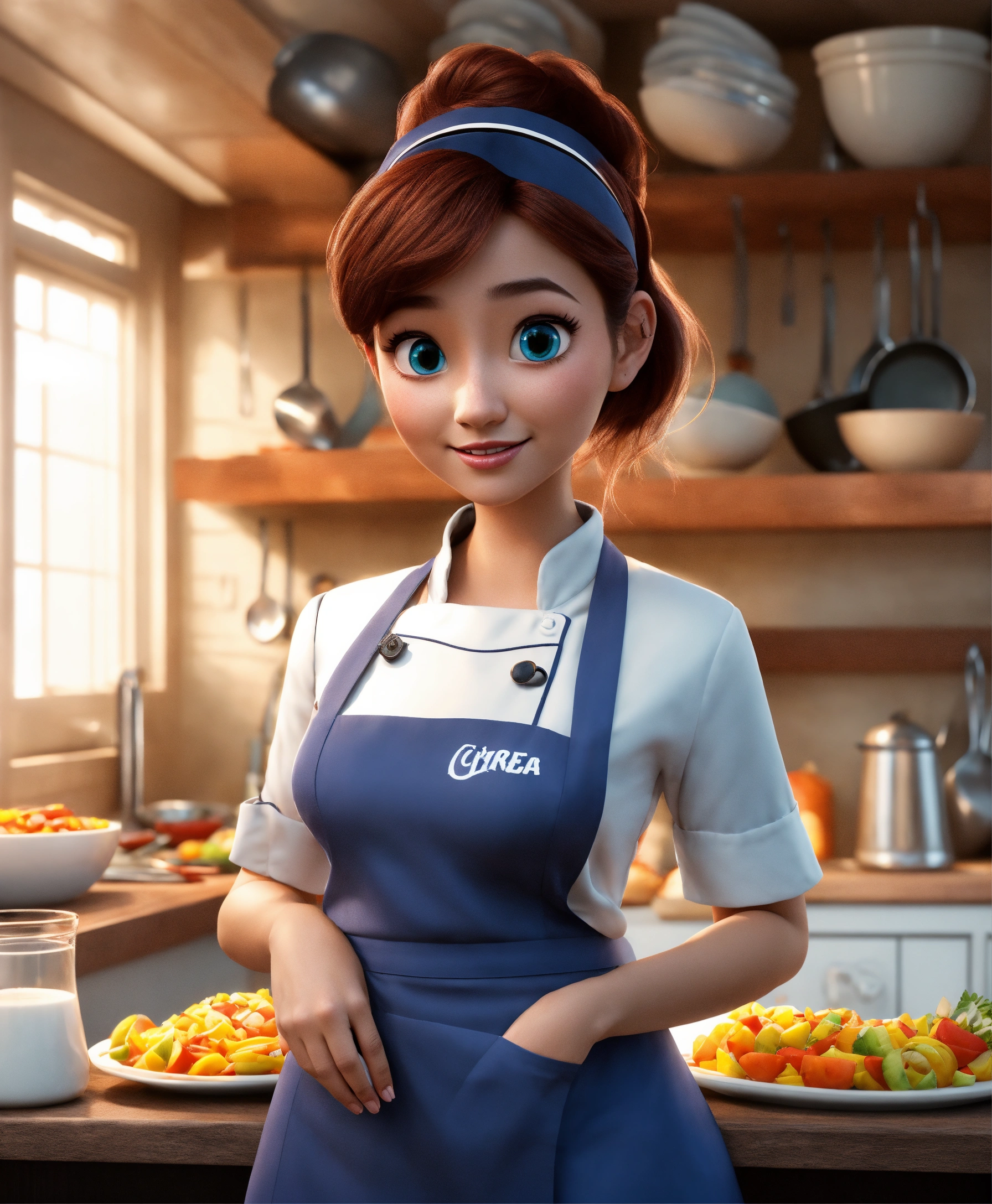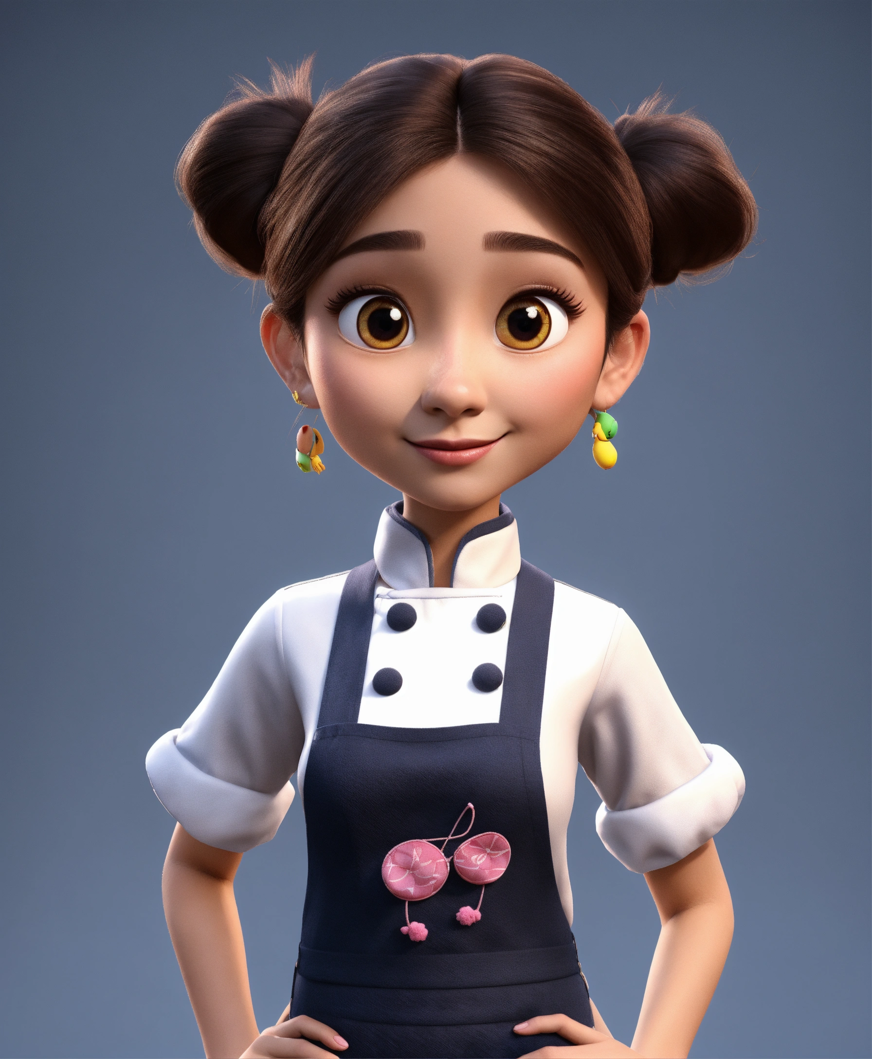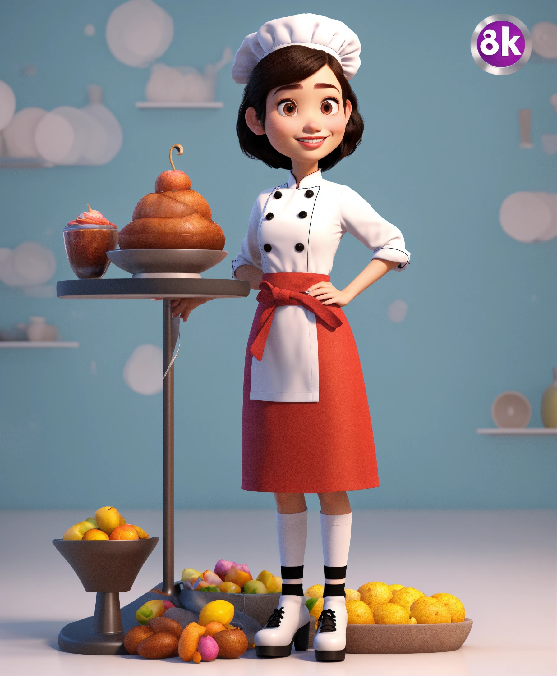 Linda chica, estilo pixar, estilo 3d, estilo disney, 8k, hermosa, vestimenta chef, cuerpo completo, vestimenta blanca y negra, cuerpo de frente
