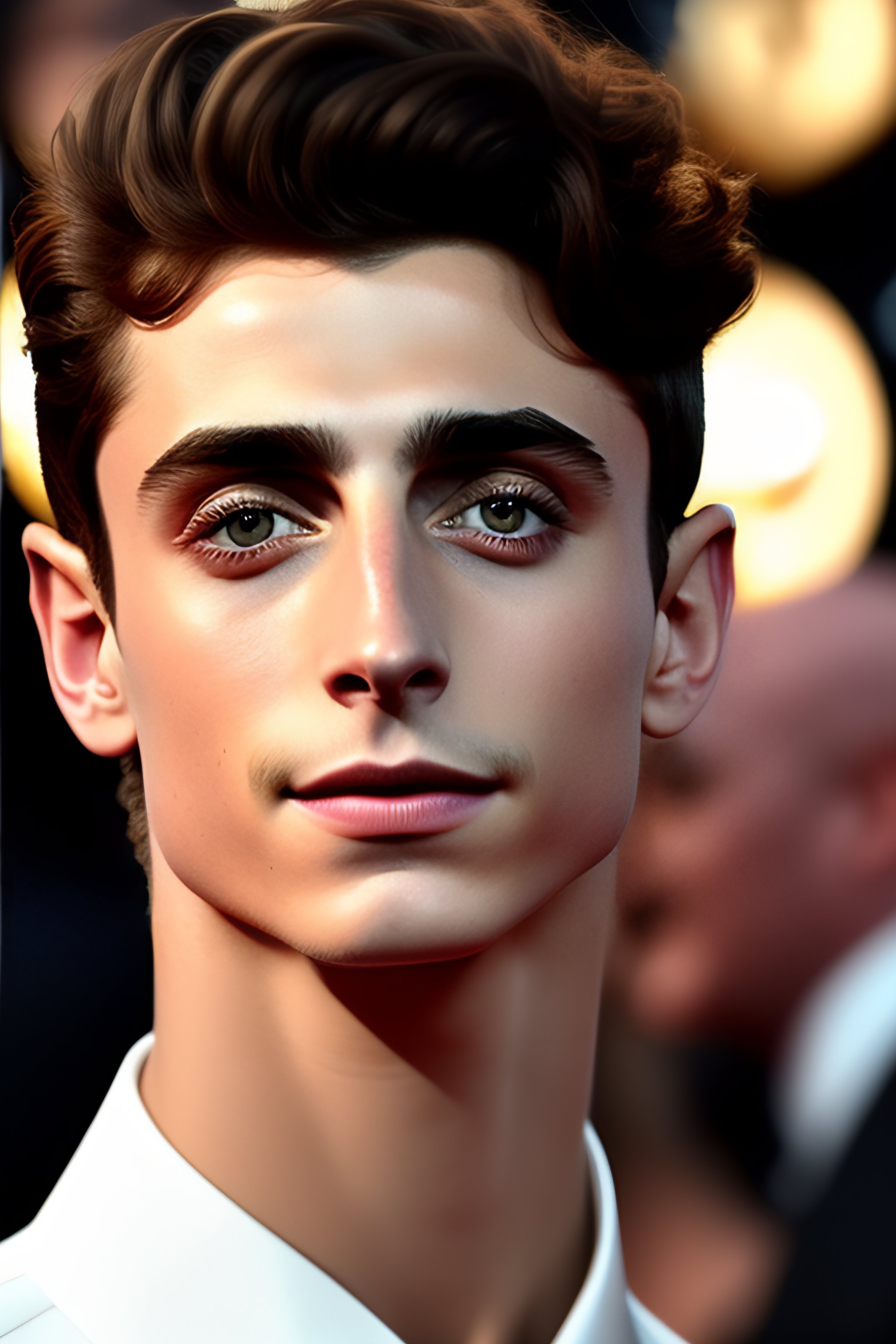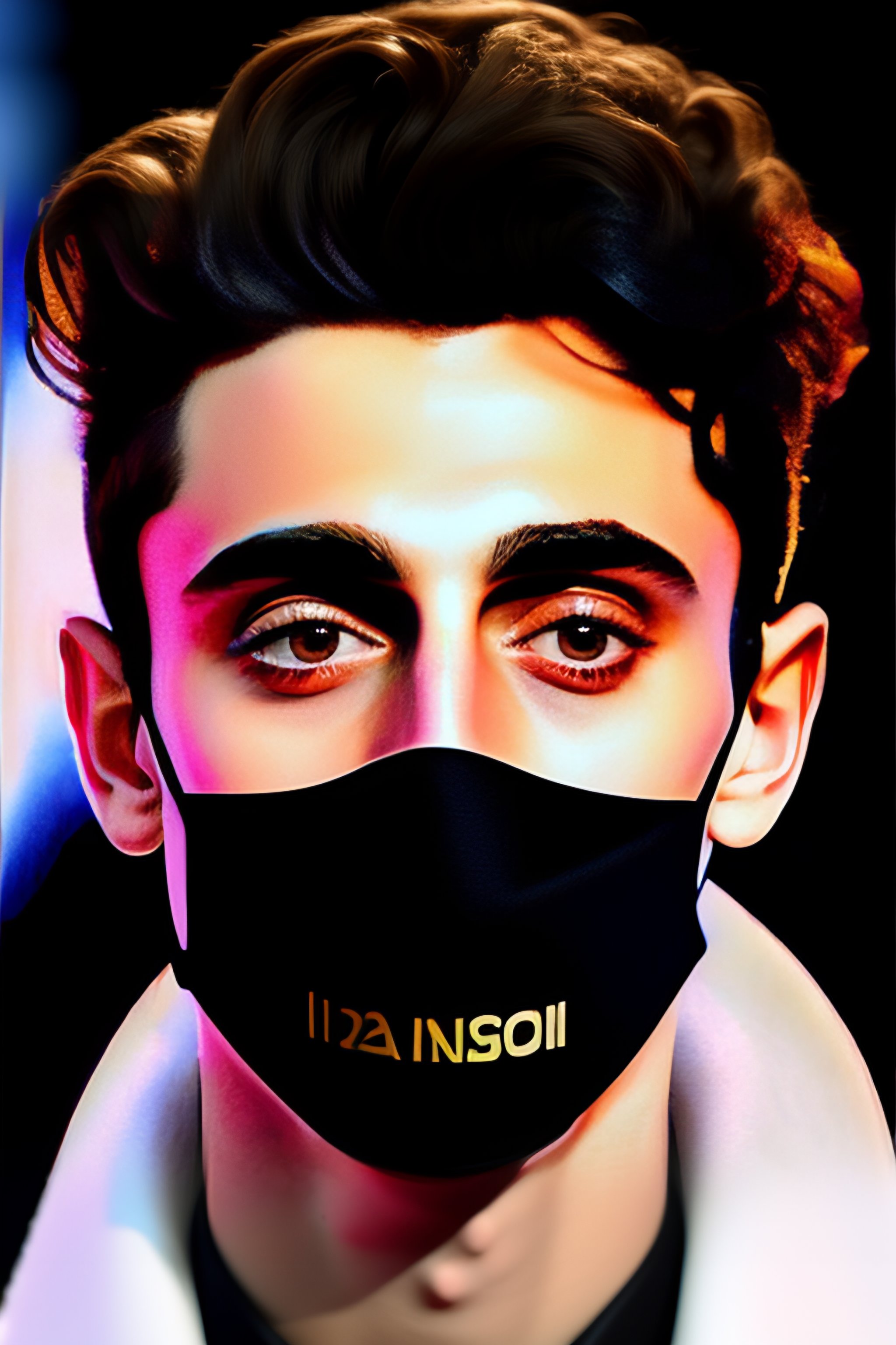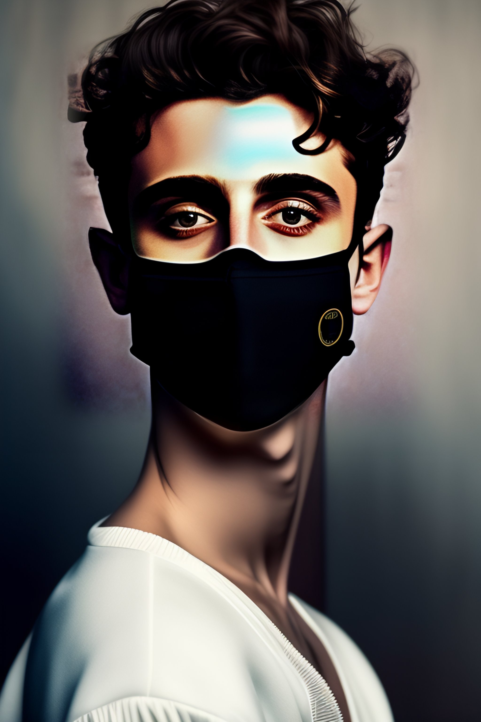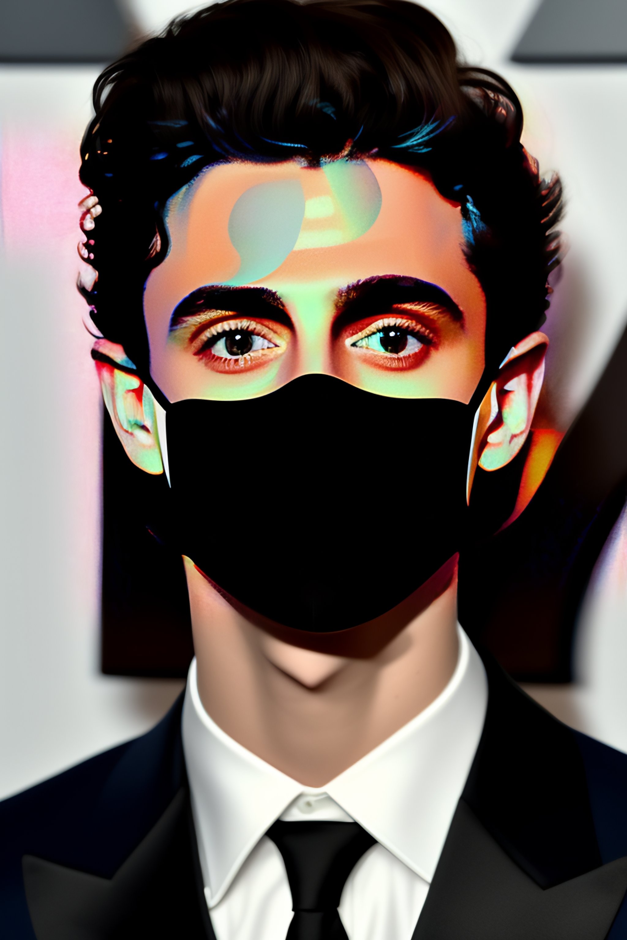 Timothee chalamet with eyeliner wearing a face mask holding an eyeball