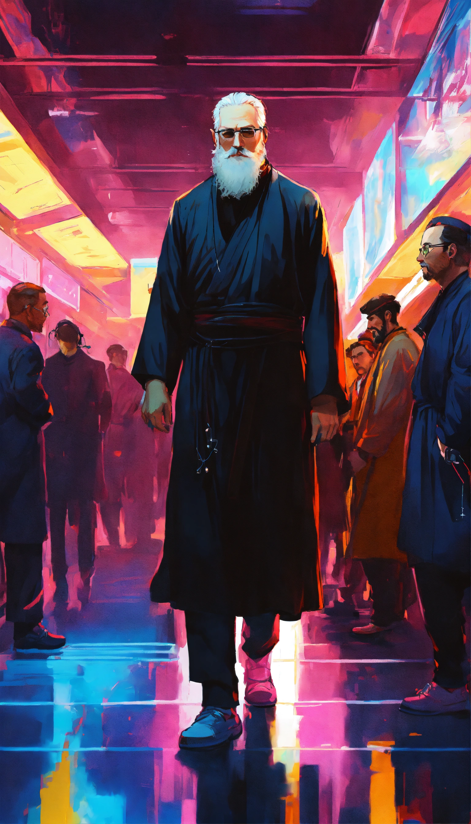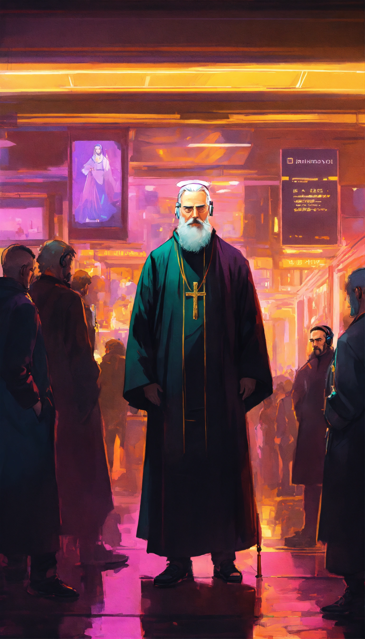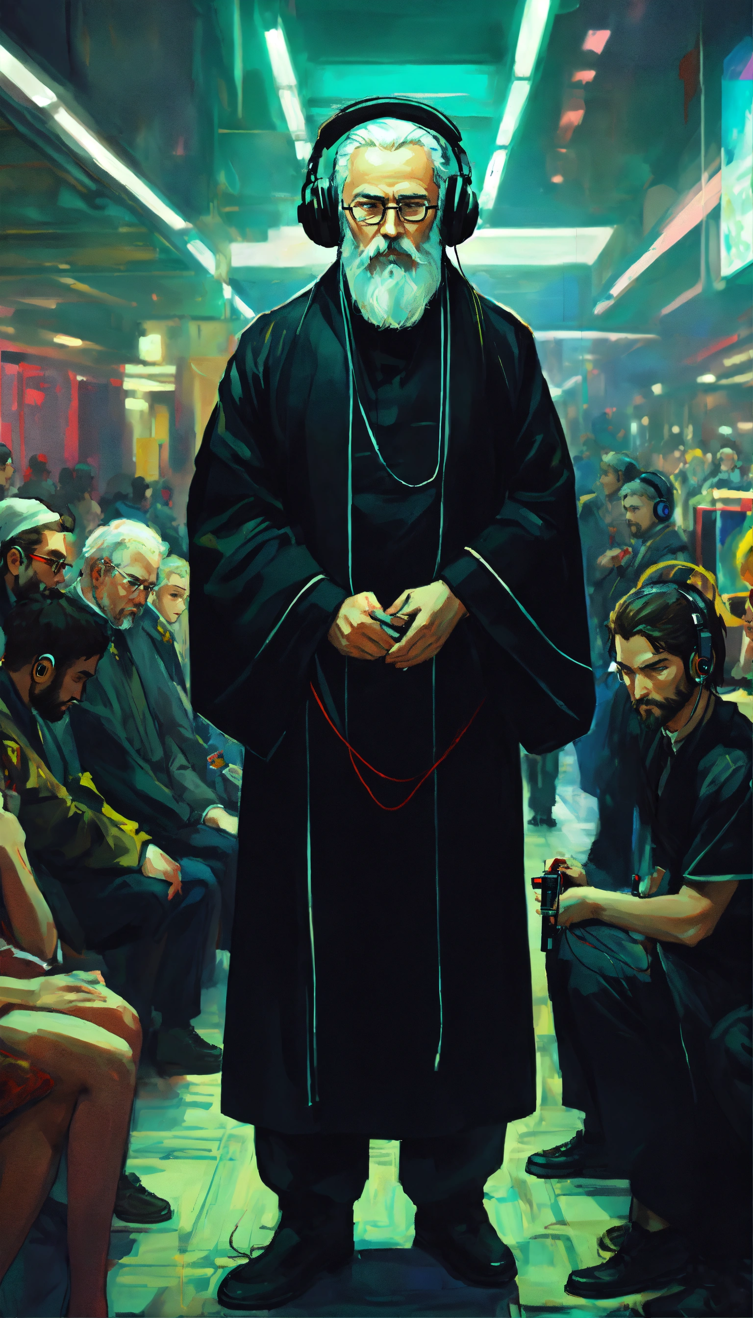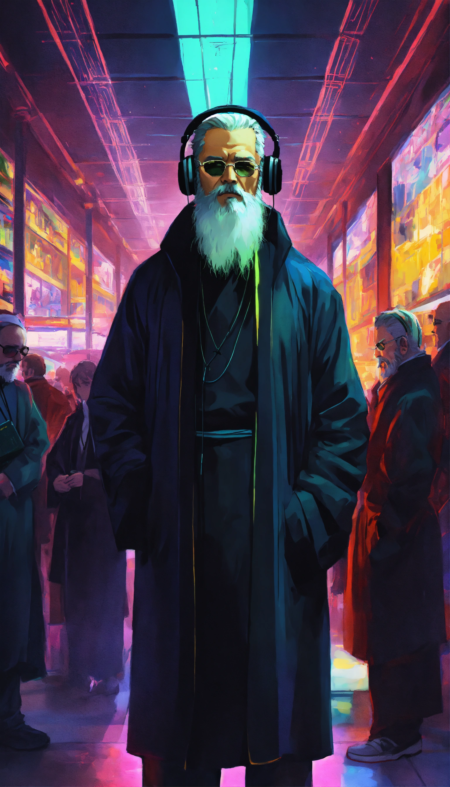 Christian orthodox priest with white beard, wearing headphones, sport tennis, black tunic. surrounded by normal people minding their own bussines at the mall. in dark fantasy, neon colors, yoji shinkawa style.