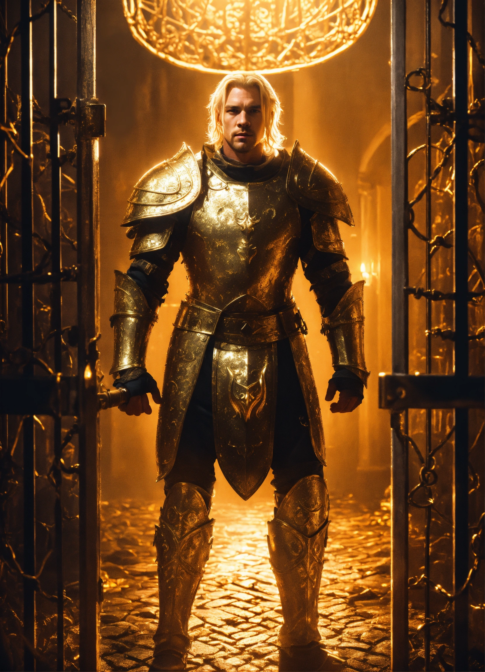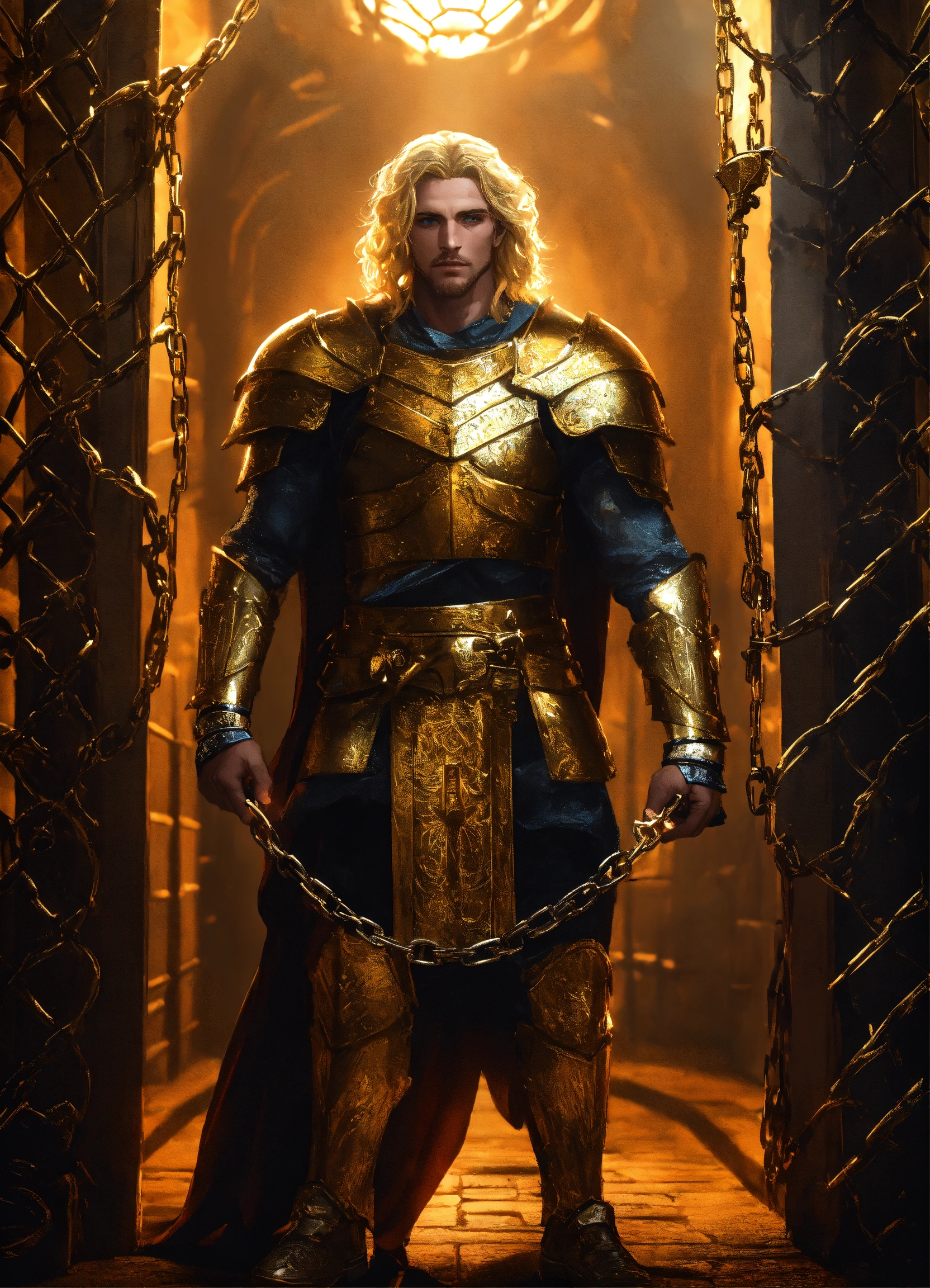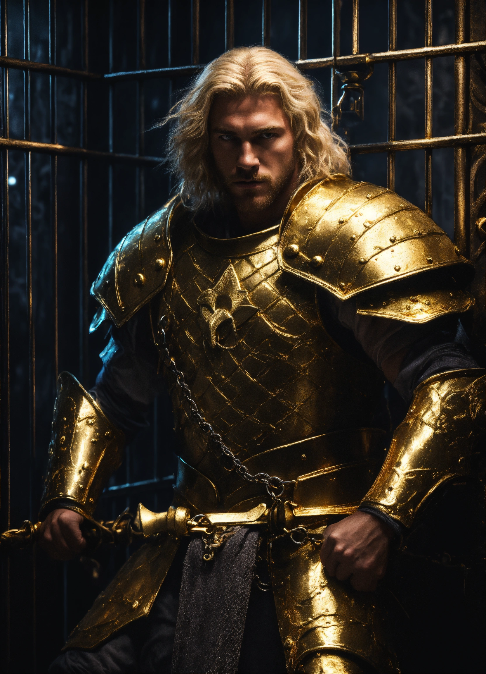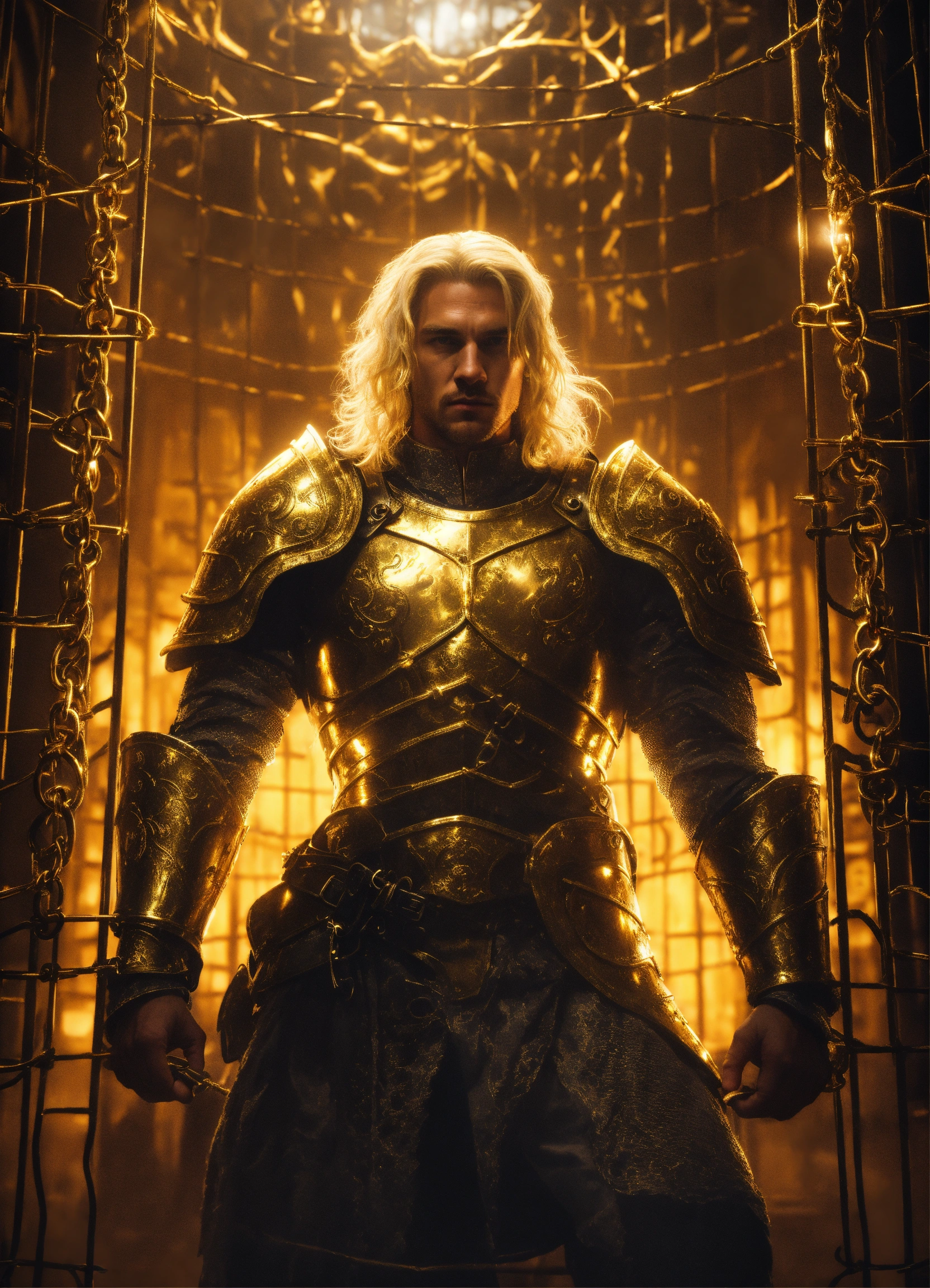 Handcuffed, a strong handsome white male god, a handsome prisoner with blonde hair wearing gold armor, held captive in a spooky dark cell with monstrous guards in the backgrounds, resolution 8k, insanely detailed