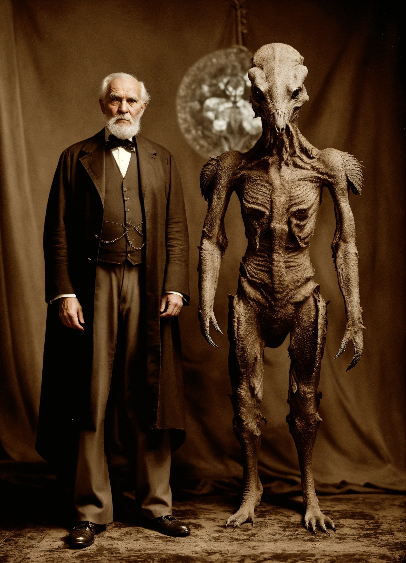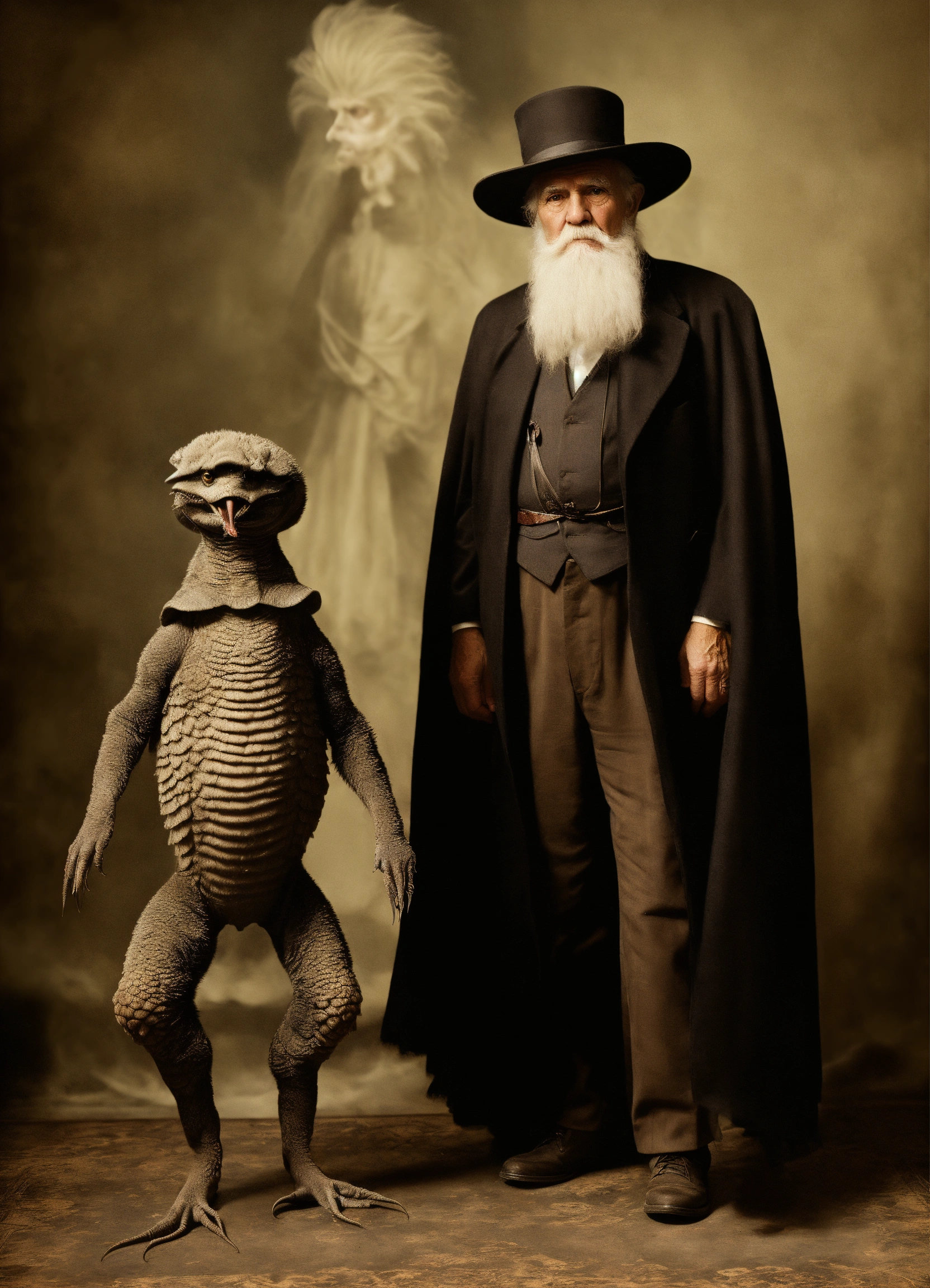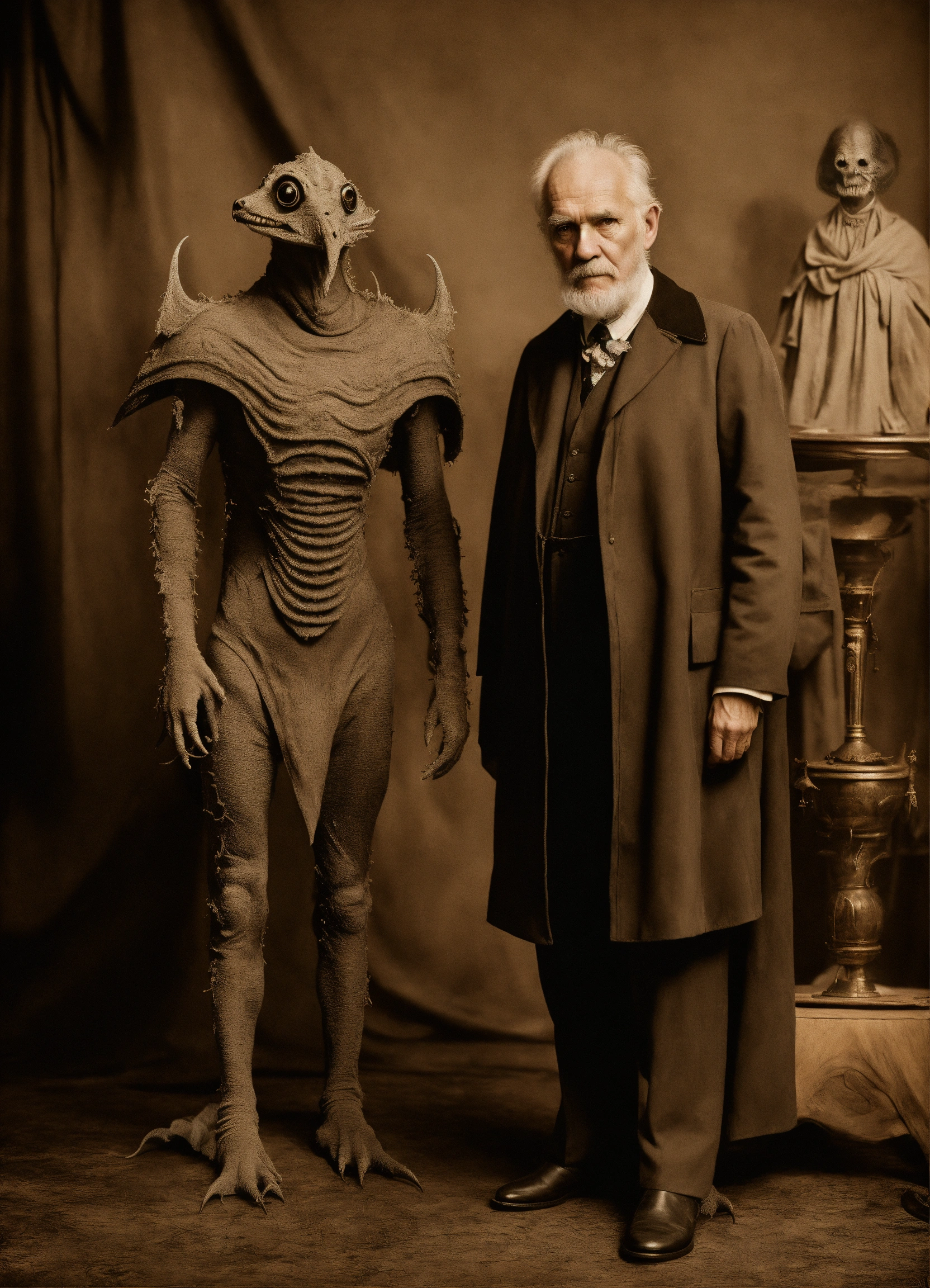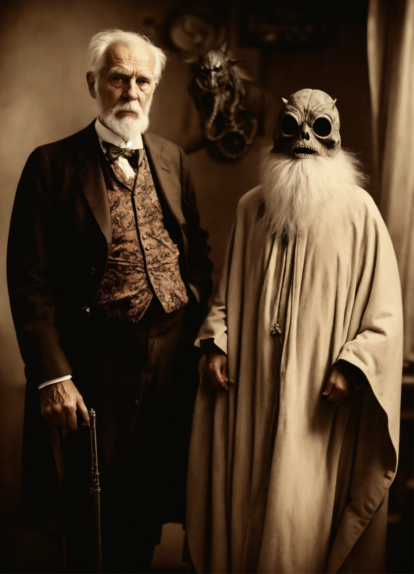 Old man wearing a superhero costume standing next to anstrange creature, in the style of contemporary vintage photography, necronomicon illustrations, tabletop photography, 1890, hyperrealistic animal portraits, ghostly presence, whirring contrivances