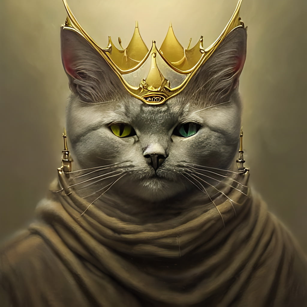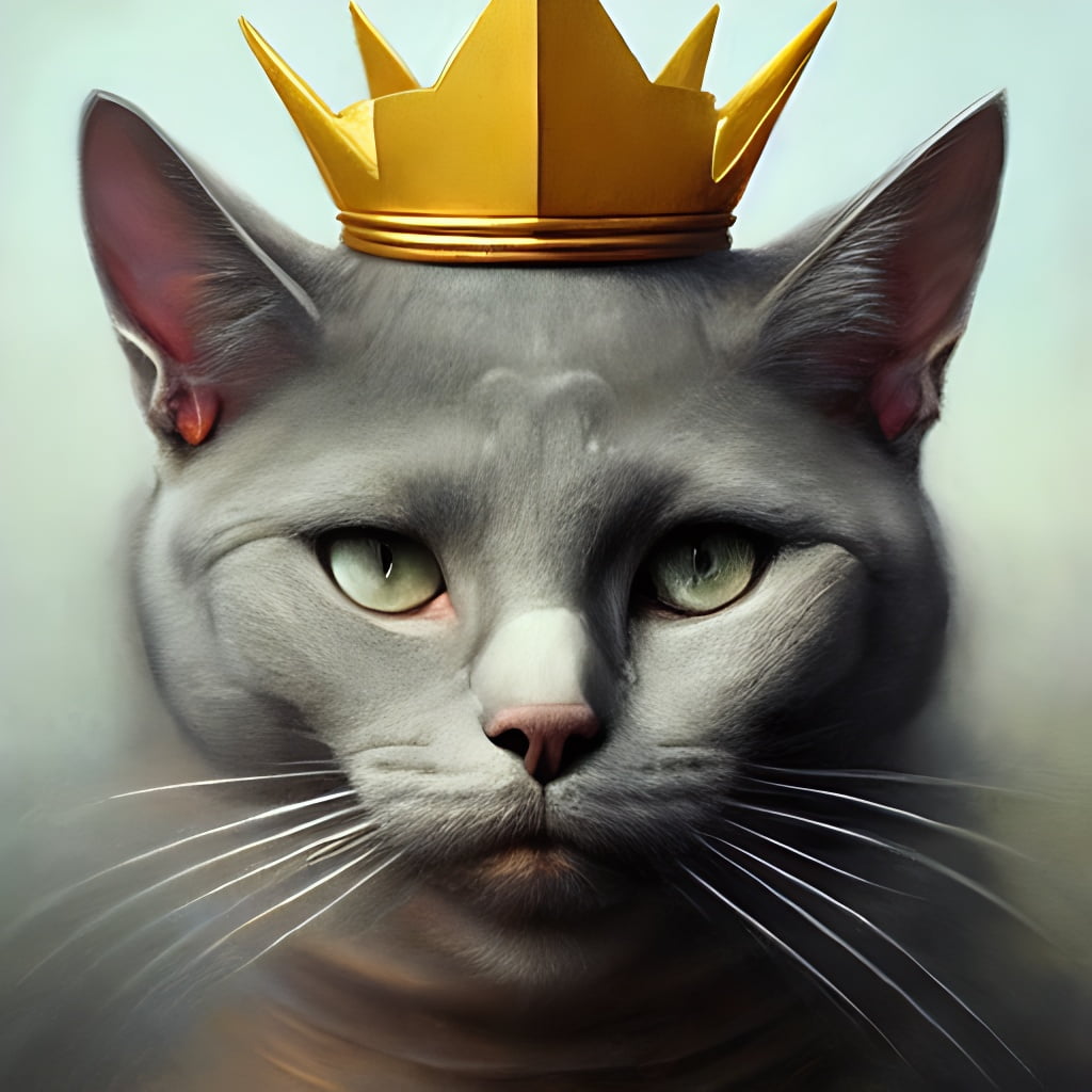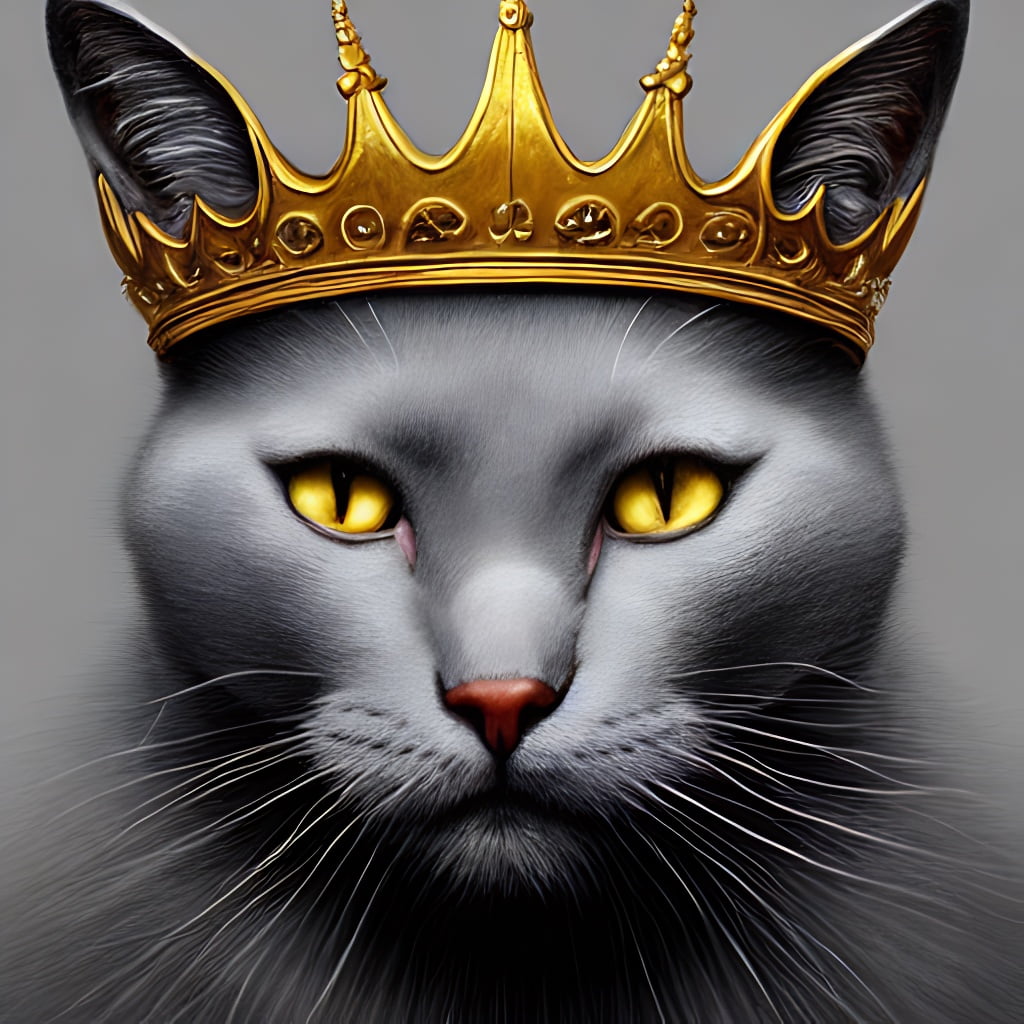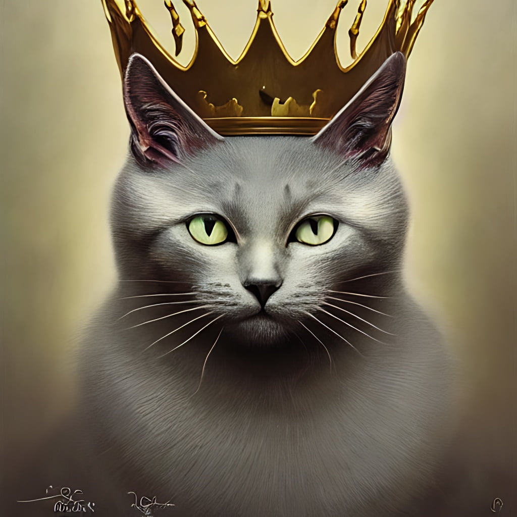 Grey cat king wearing a golden crown, soft face, intricate, elegant, highly detailed, centered, digital painting, artstation, concept art, smooth, sharp focus, illustration, artgerm, tomasz alen kopera, peter mohrbacher, donato giancola, joseph christian leyendecker, wlop, boris vallejo