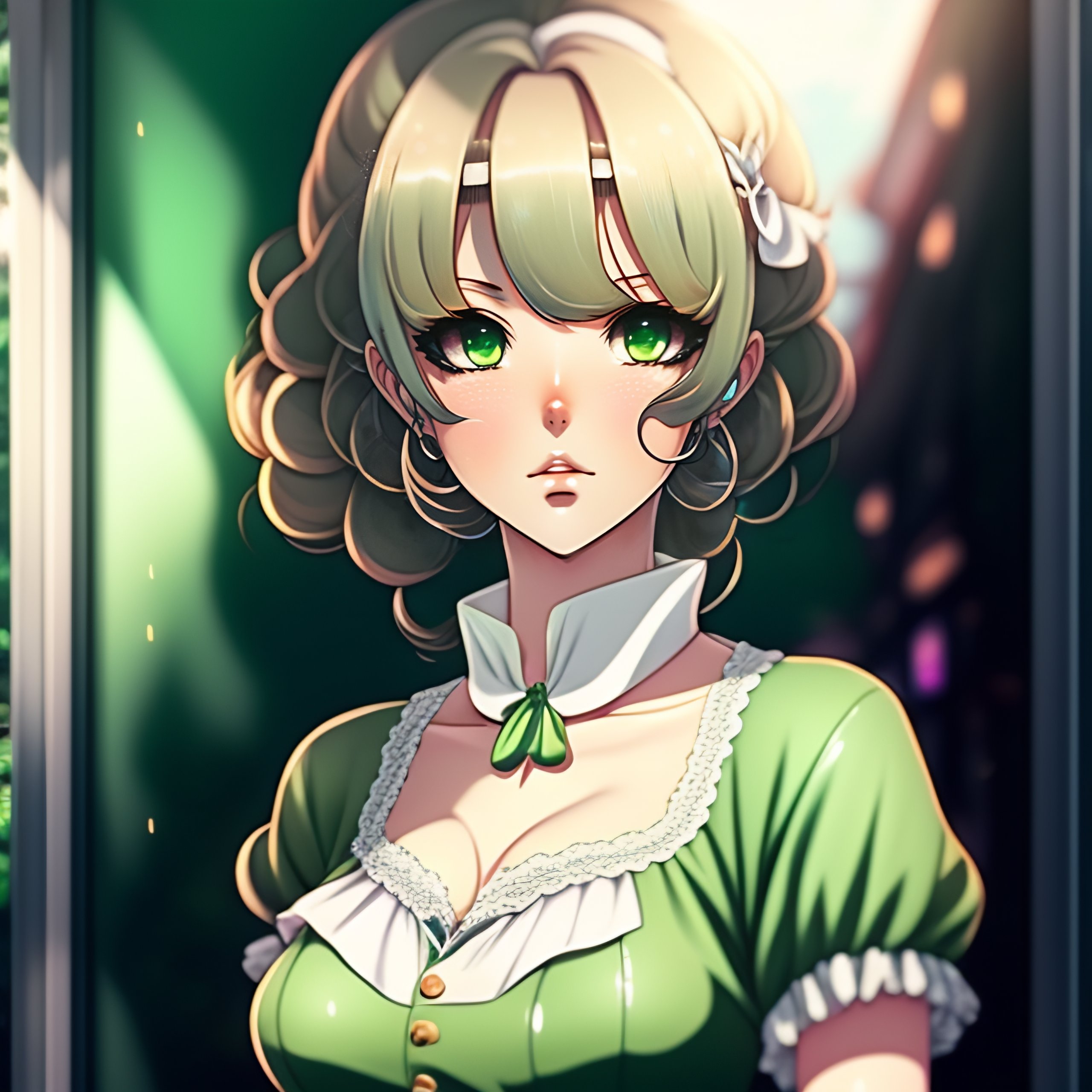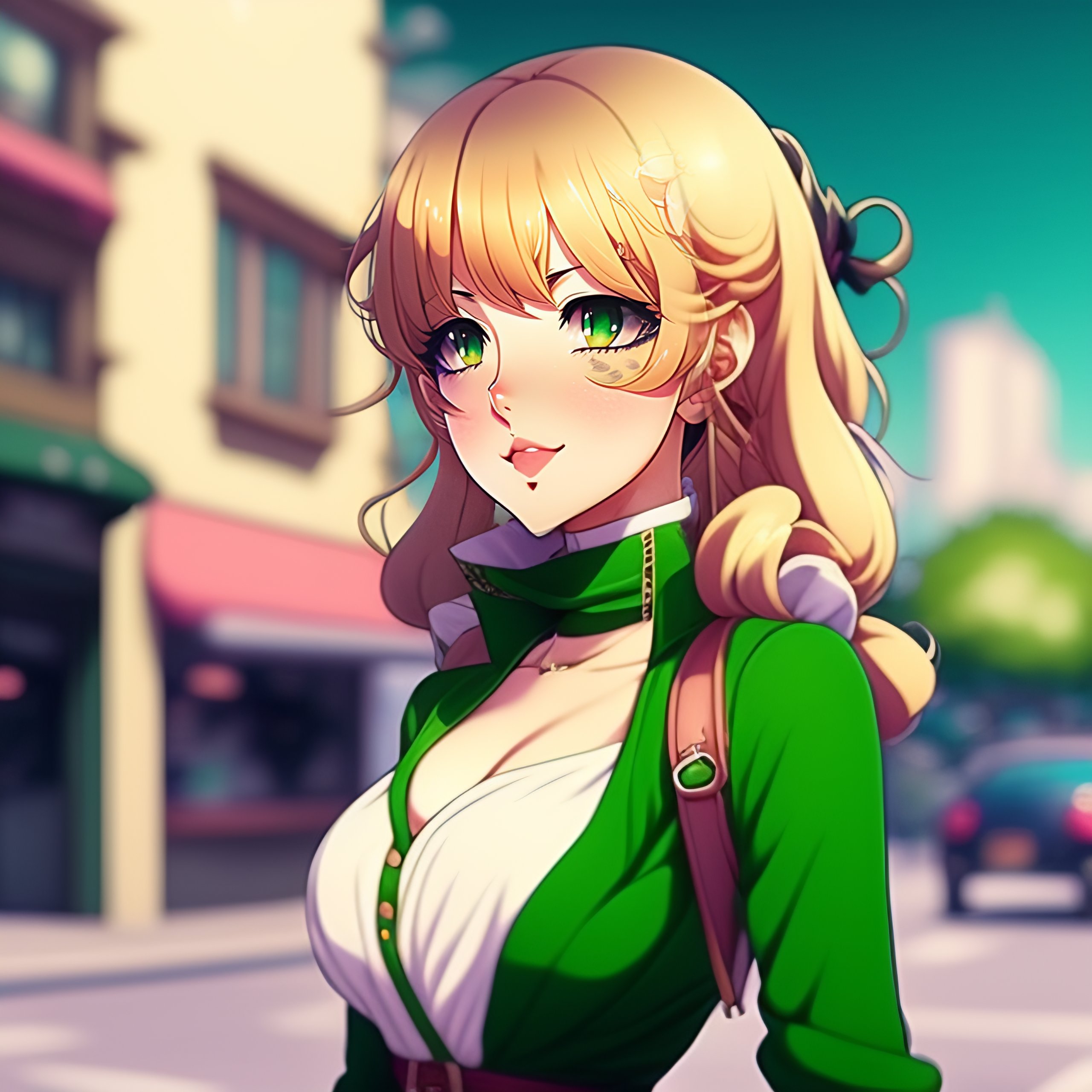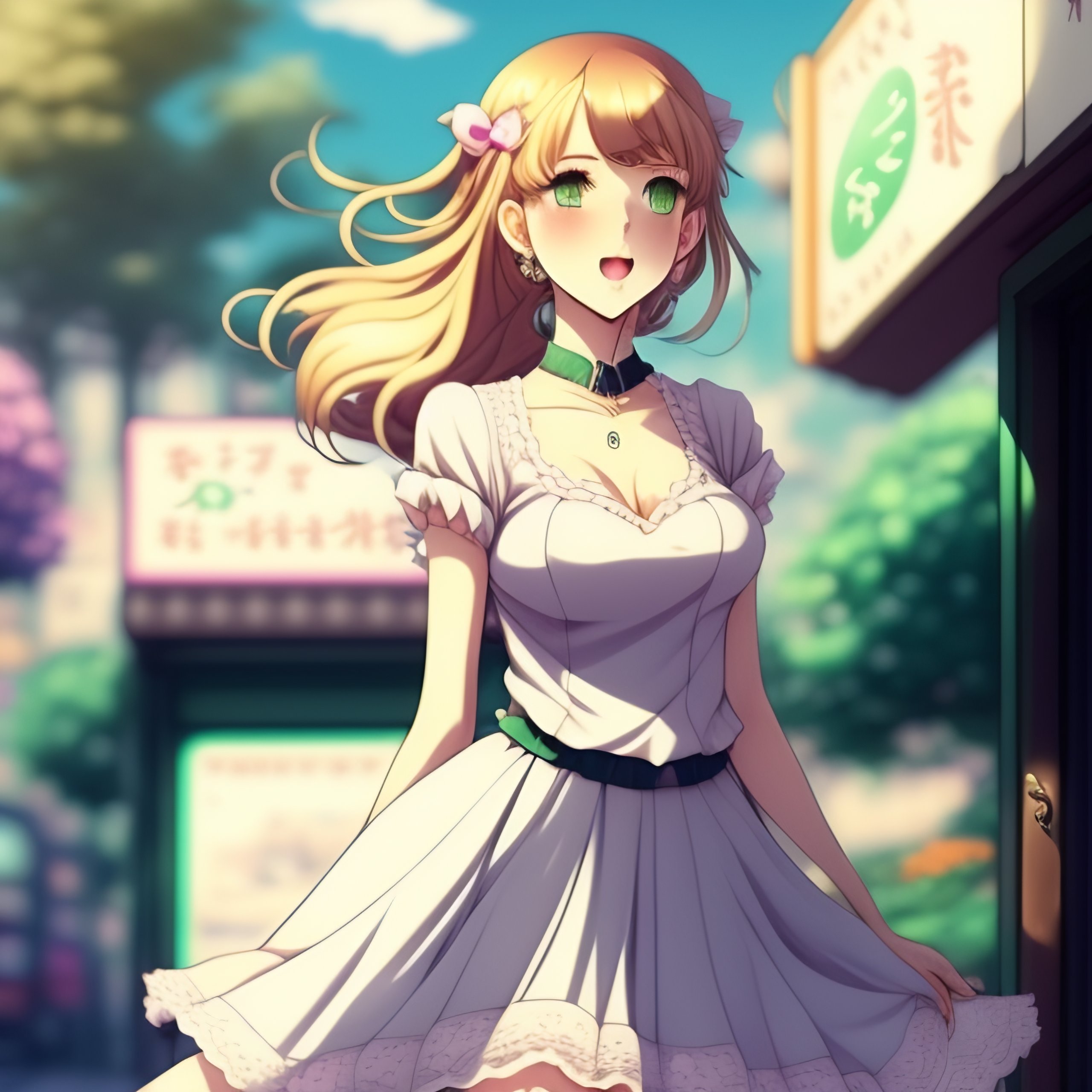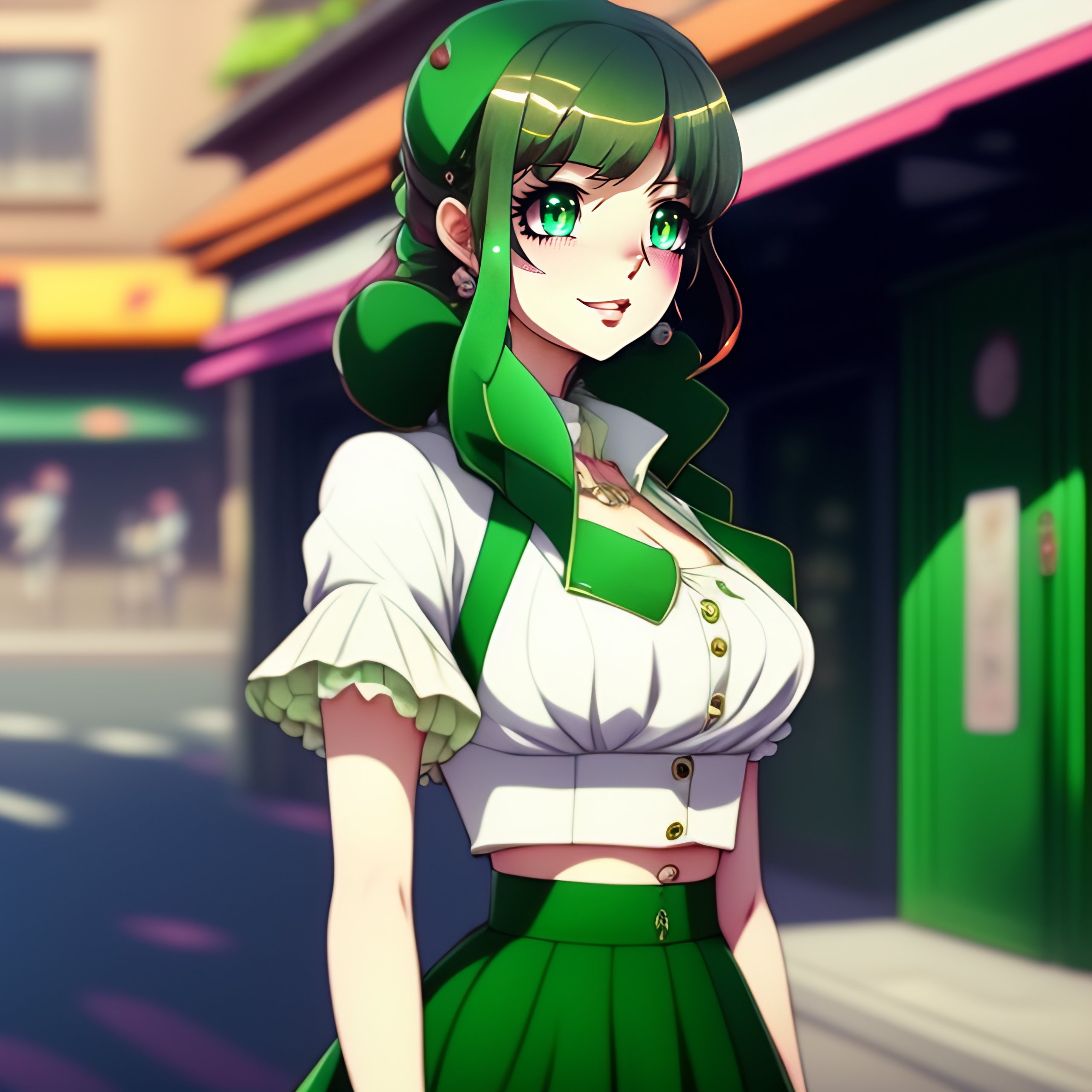 Cute young woman beautifuly drawn in manga style anime pin-up manga pen strokes finished cel-shaded art. lacey white top, green flared skirt, happily looking forwards, standing, arms behind back. realisticly drawn eyes, realisticly drawn face, realisticly drawn pose. urban anime scene, outdoors, storefront, wall