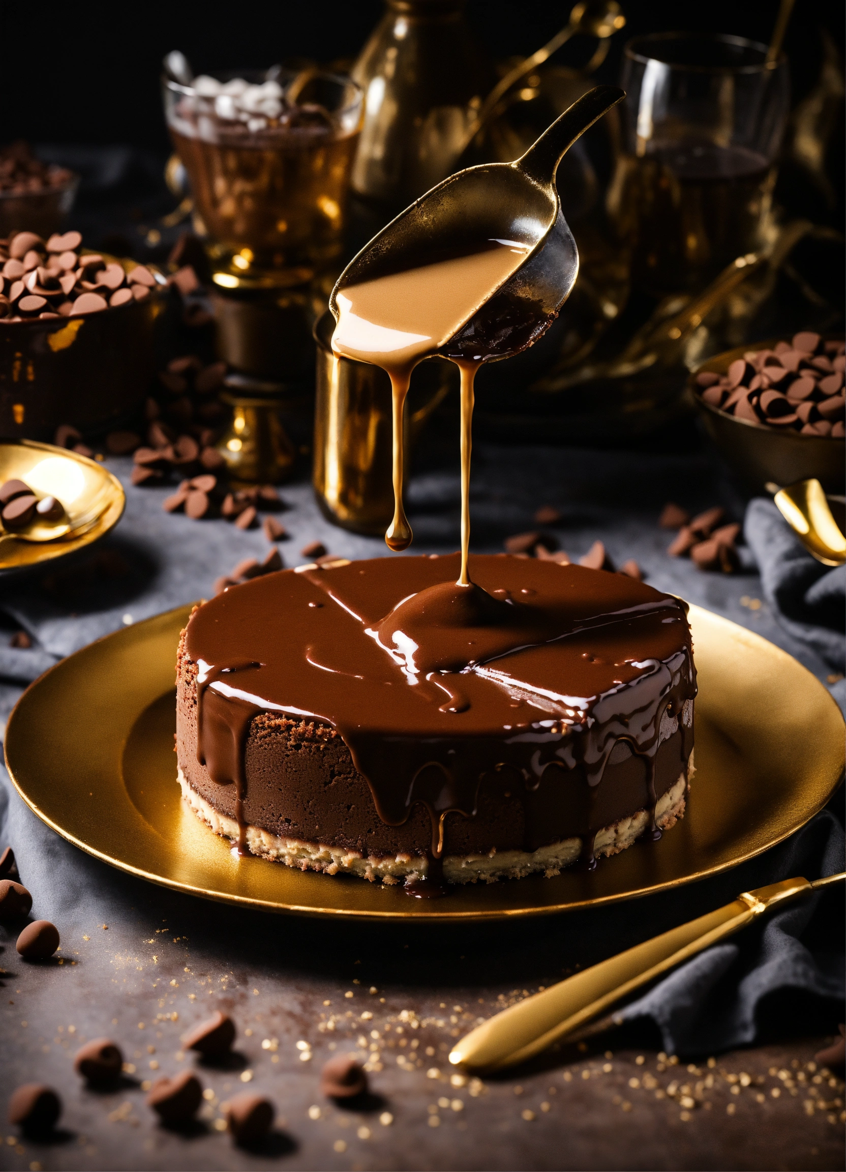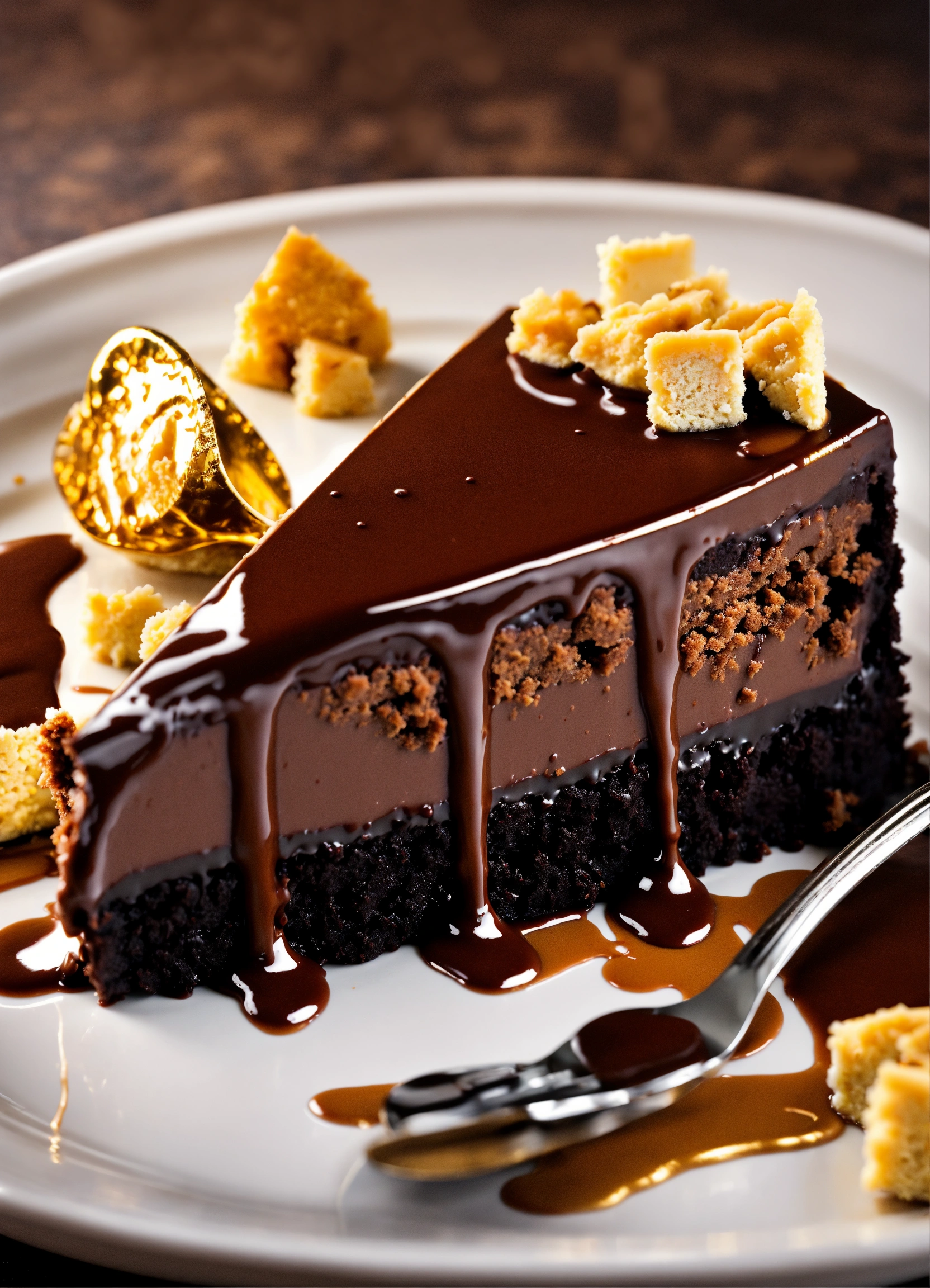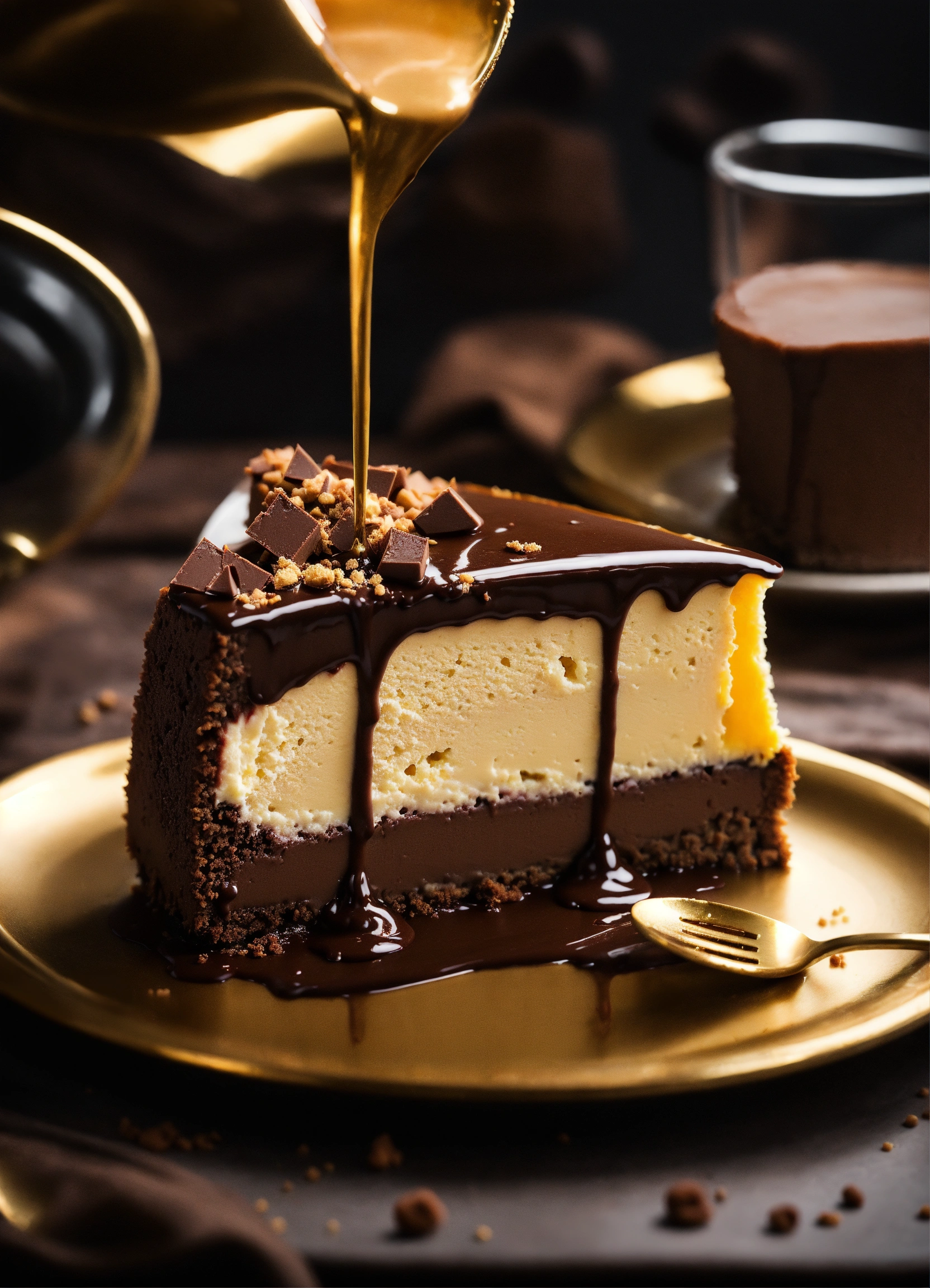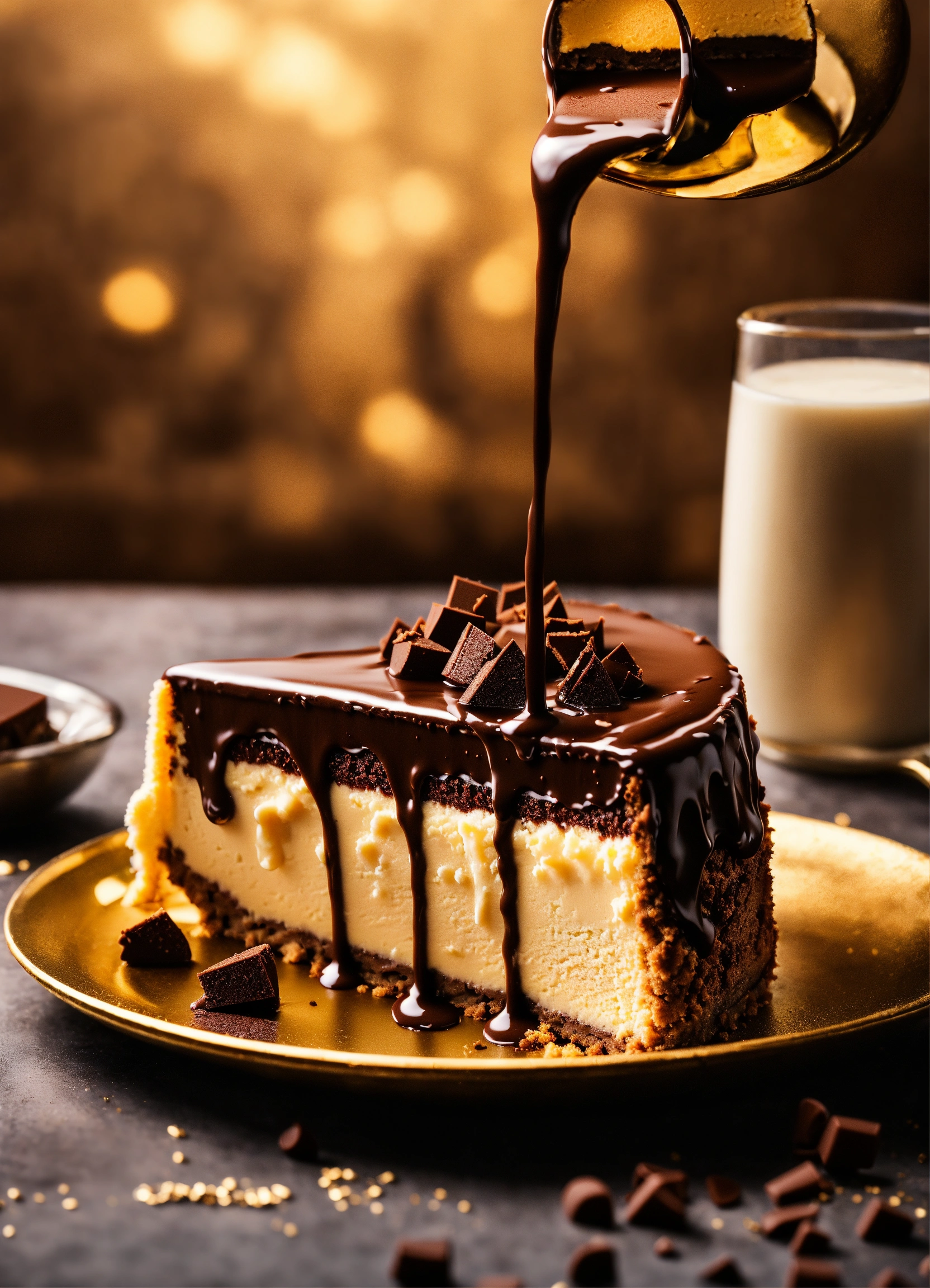 Cheesecake it that has chocolate ganache liquid chocolate pouring out when sliced open on a solid 24k carat gold plate with large glass of cholate milk and perfectly placed utensils, realistic photo, 4k realistic photo.
