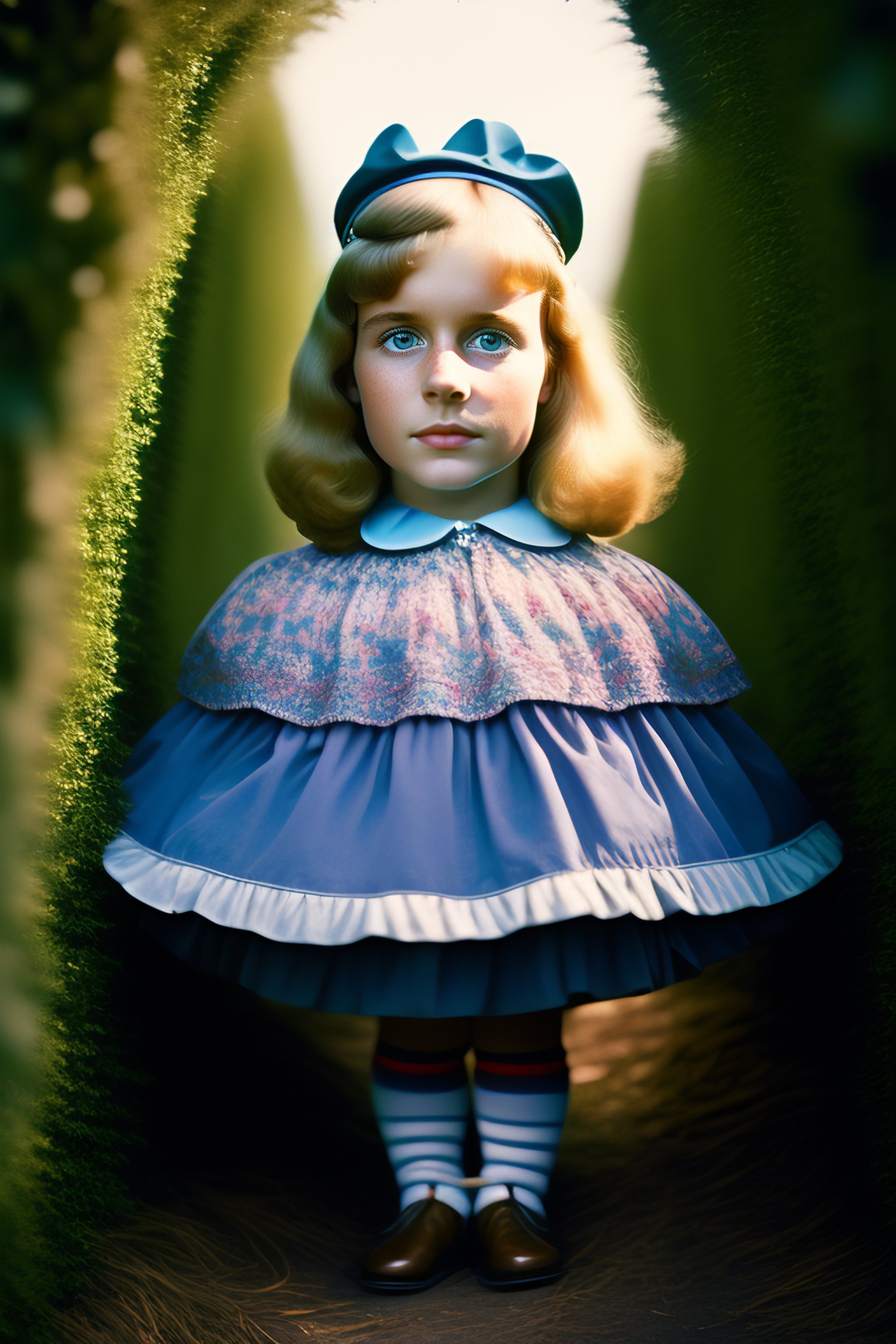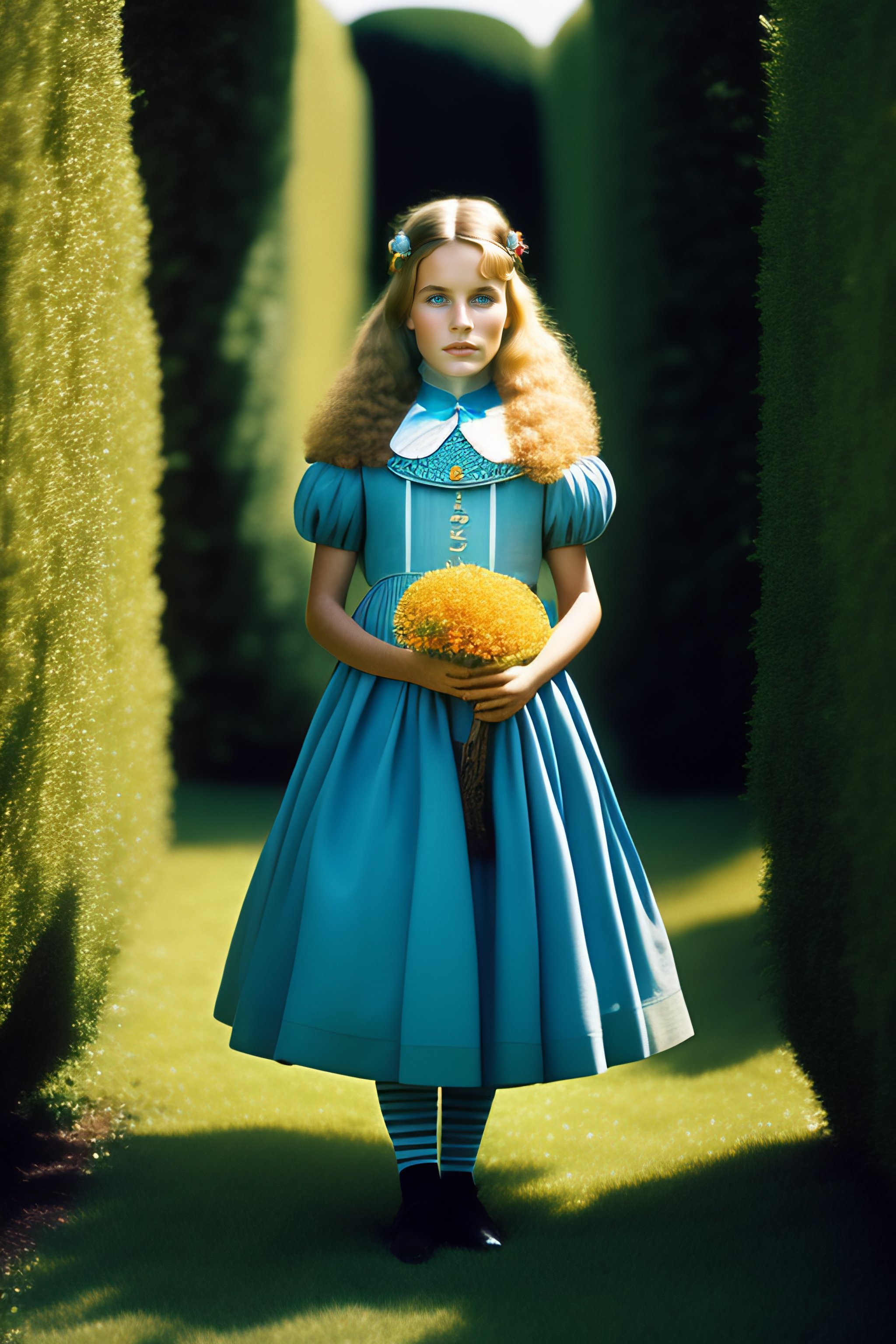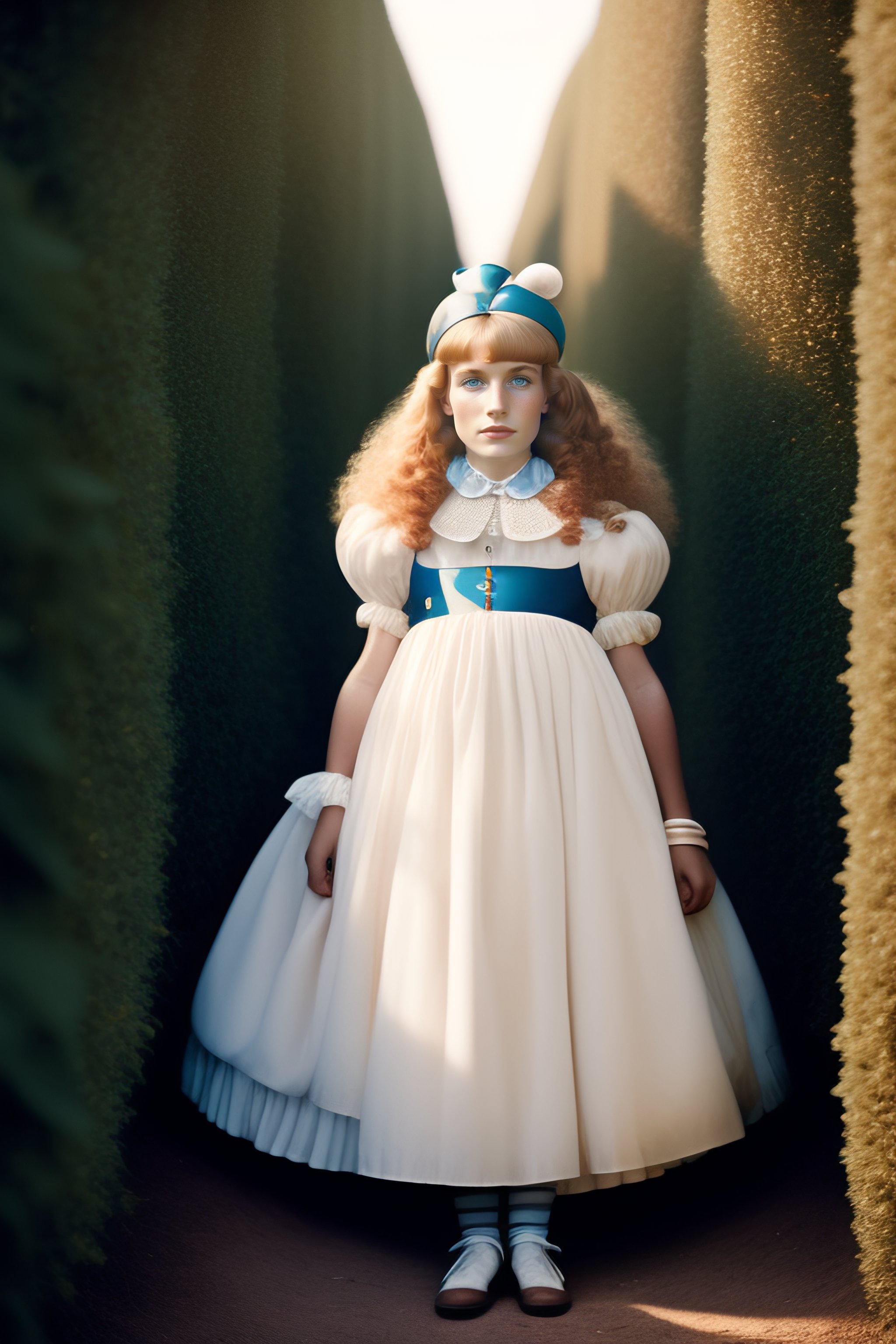 Boris beckers daughter as alice in wonderland in 1972 in giant hedge labyrinth, hasselblad, photo by brian ingram, david lazar, lisa kristine, steve mccurry, high quality, symmetrical face, clear skin, 4 k, dramatic lighting ”
