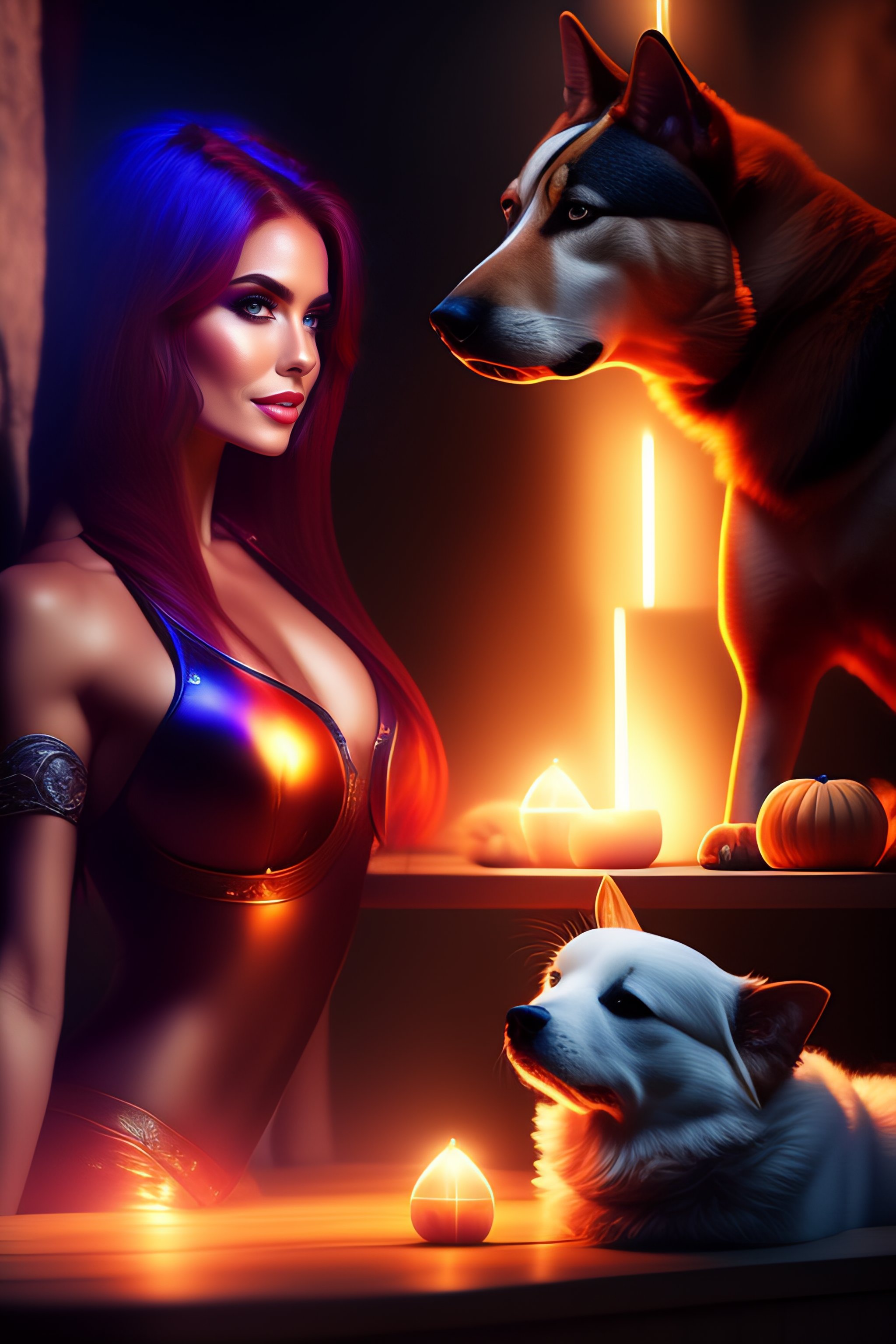 Fantasy world, pets, pretty face, 8k, full body, magic, bacground neon, fitness body, lay down, full screen, model bodies, long legs