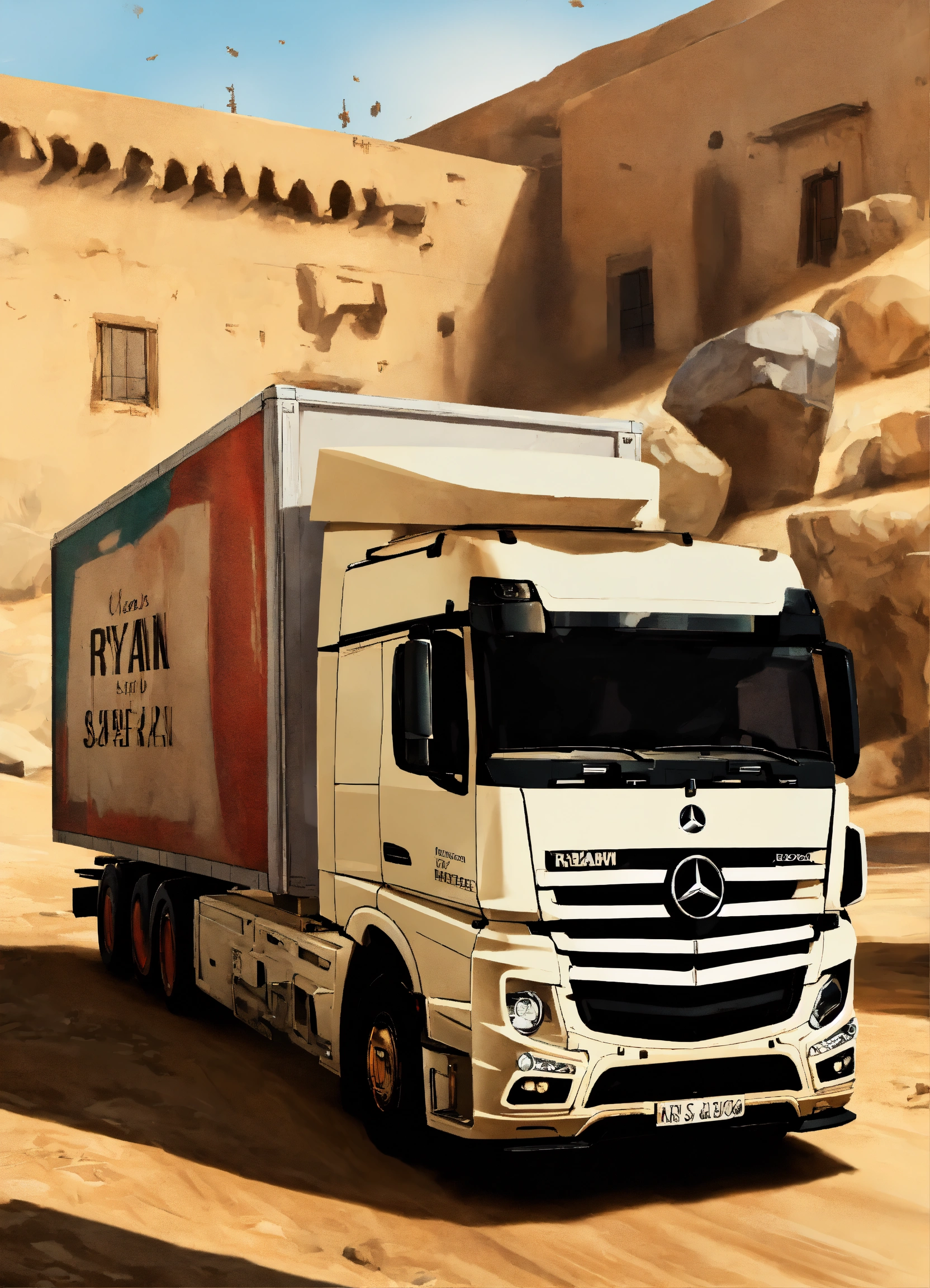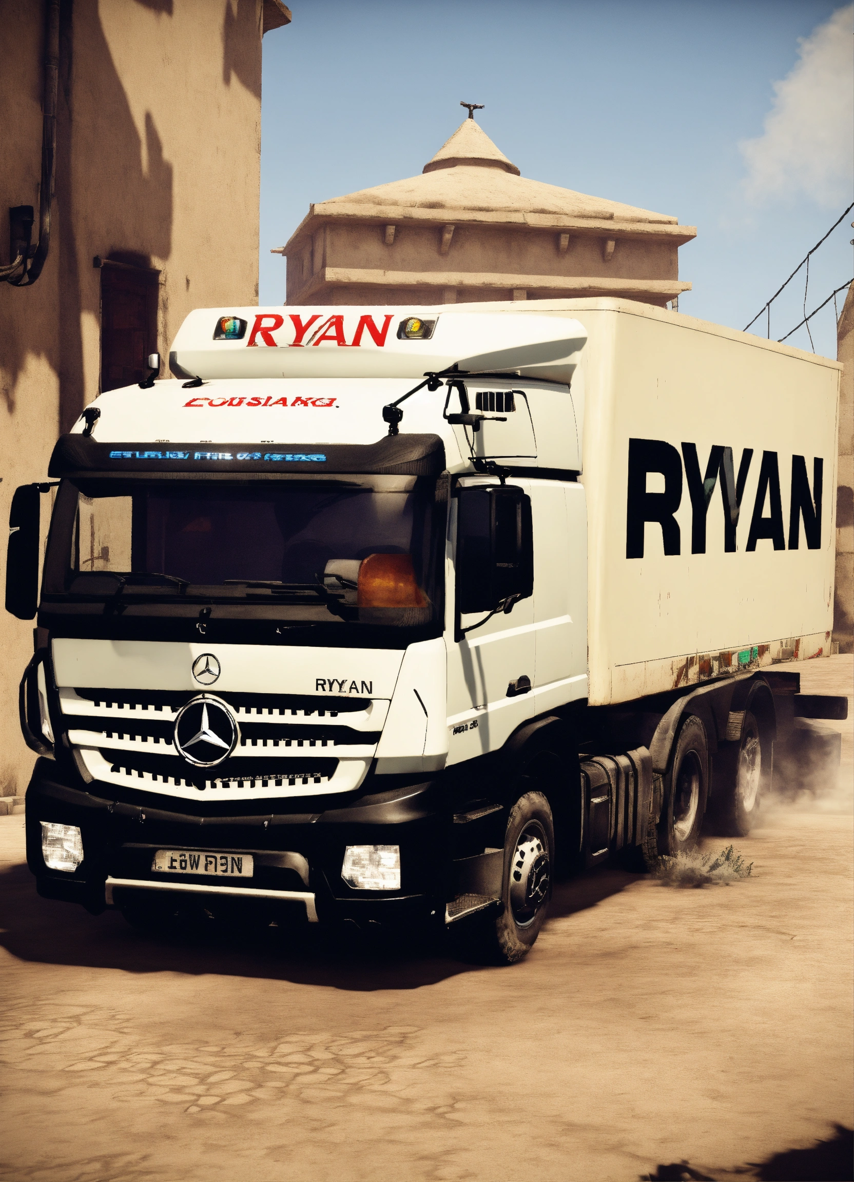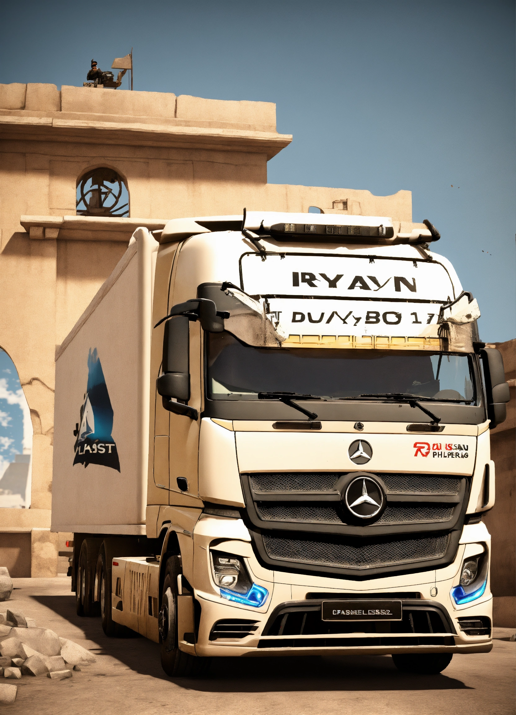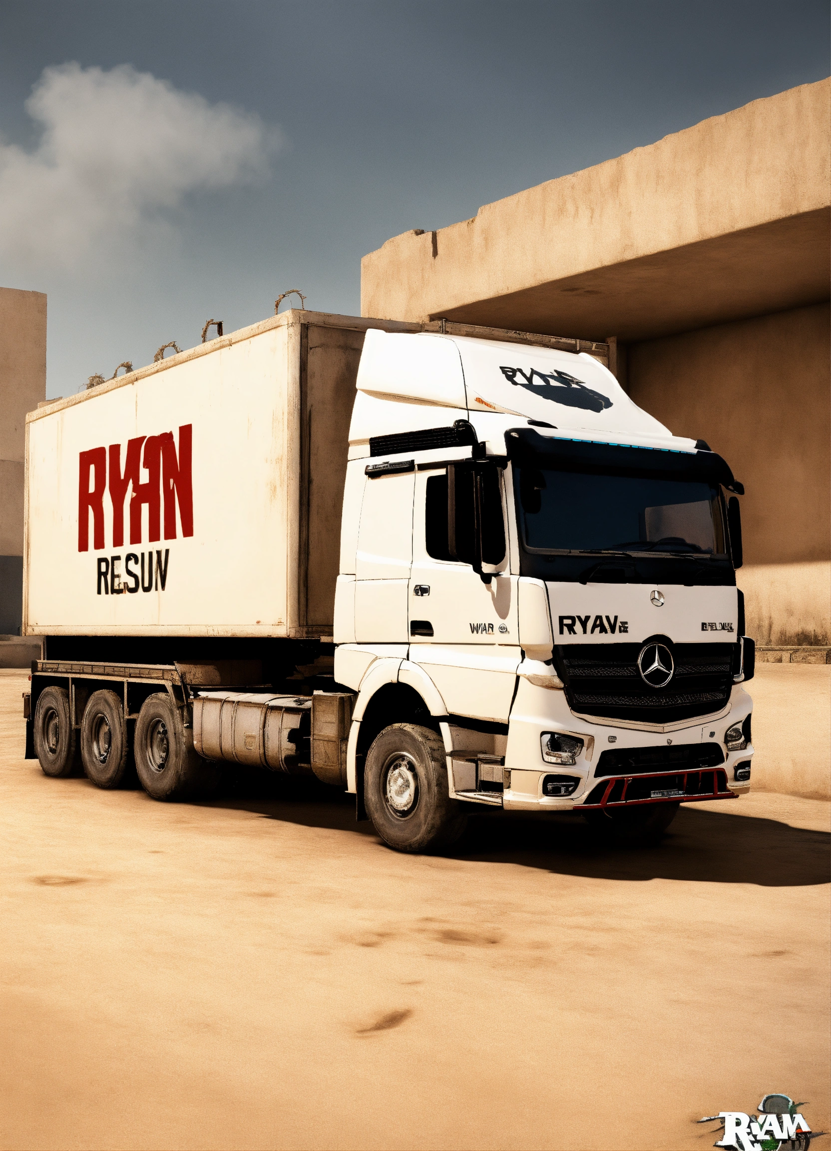 A white mercedes hgv truck with the word ryan on it in the counter strike csgo map de_dust 2
