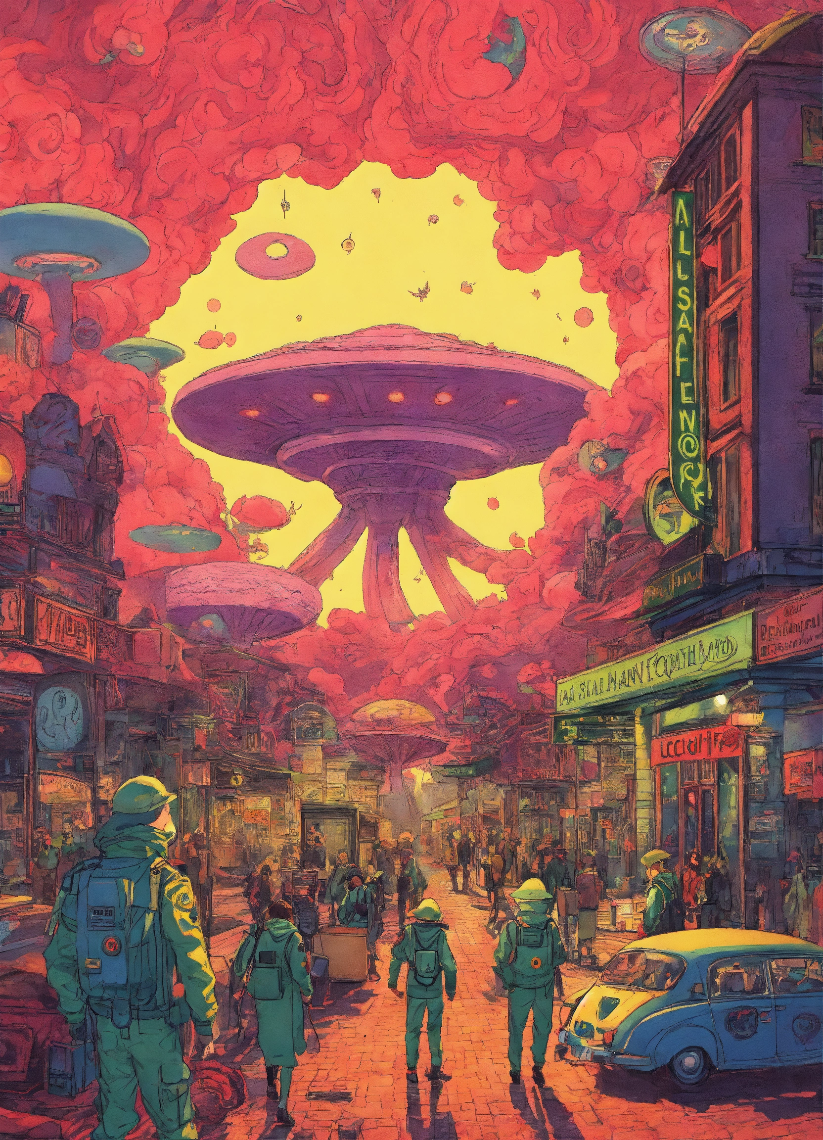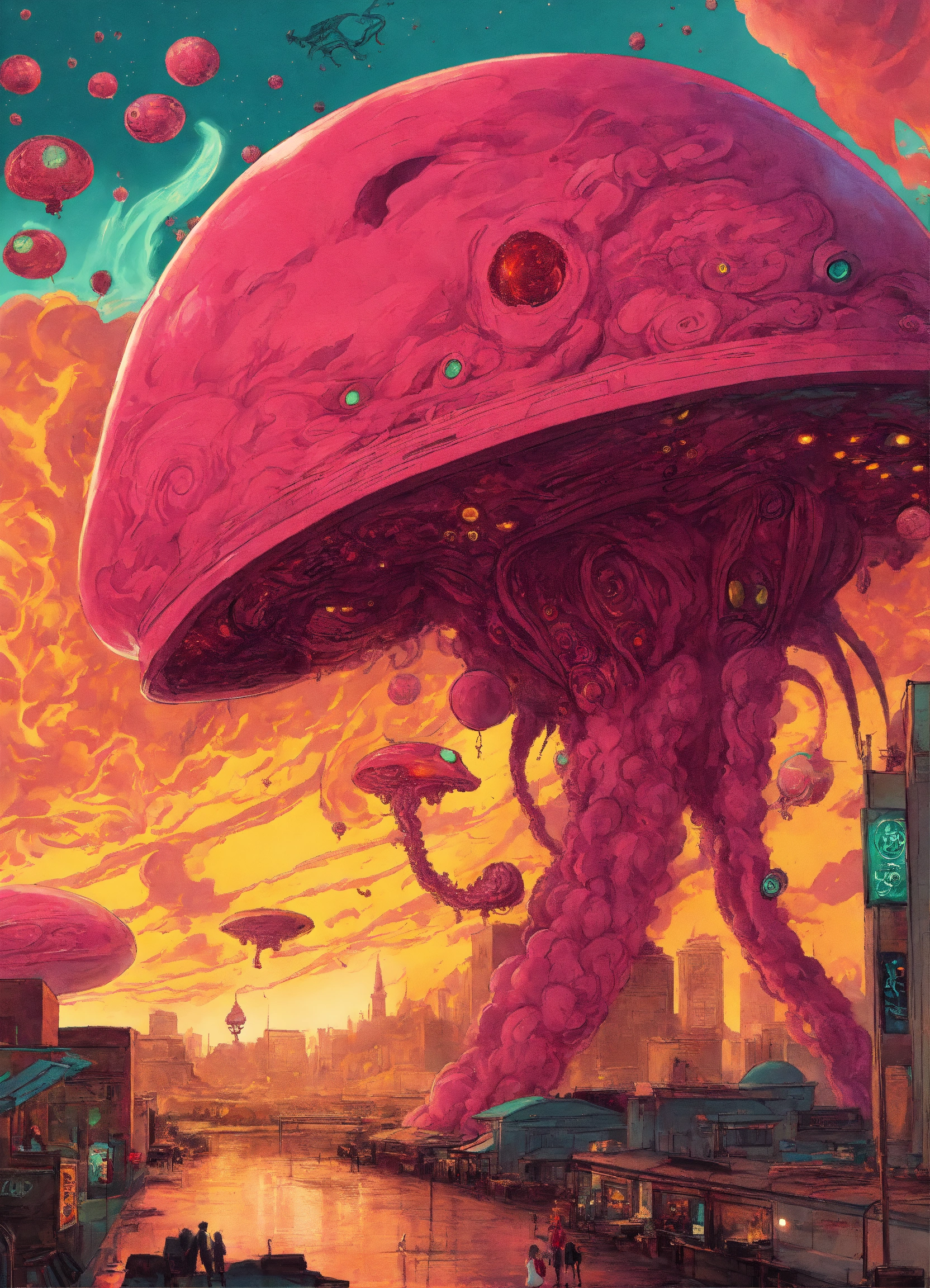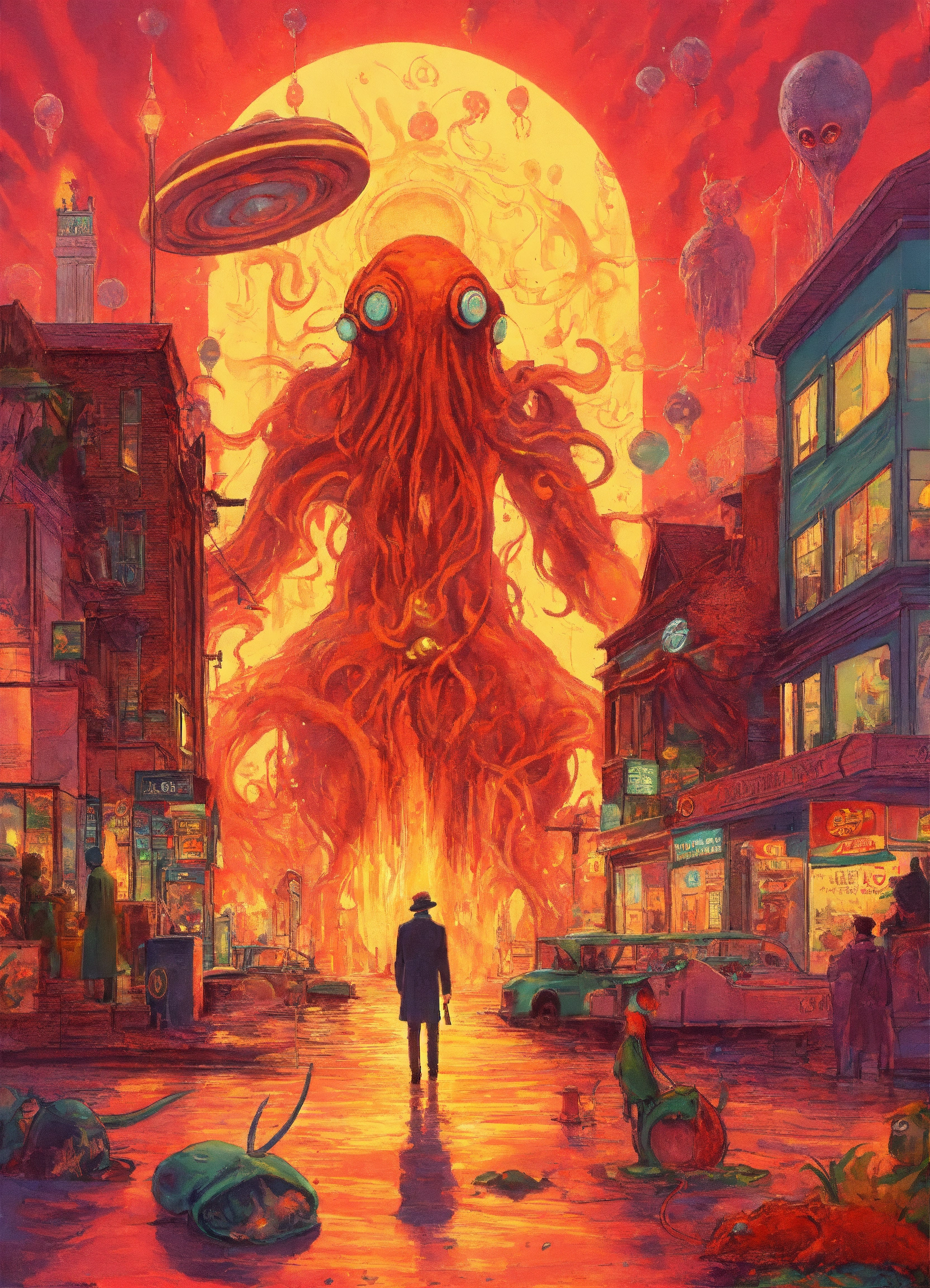 Lovecraftian aliens in the flash style, trending on art stations, chaotic lighting, optical illusions, german romanticism, flcl, 60s kitsch and psychedelia