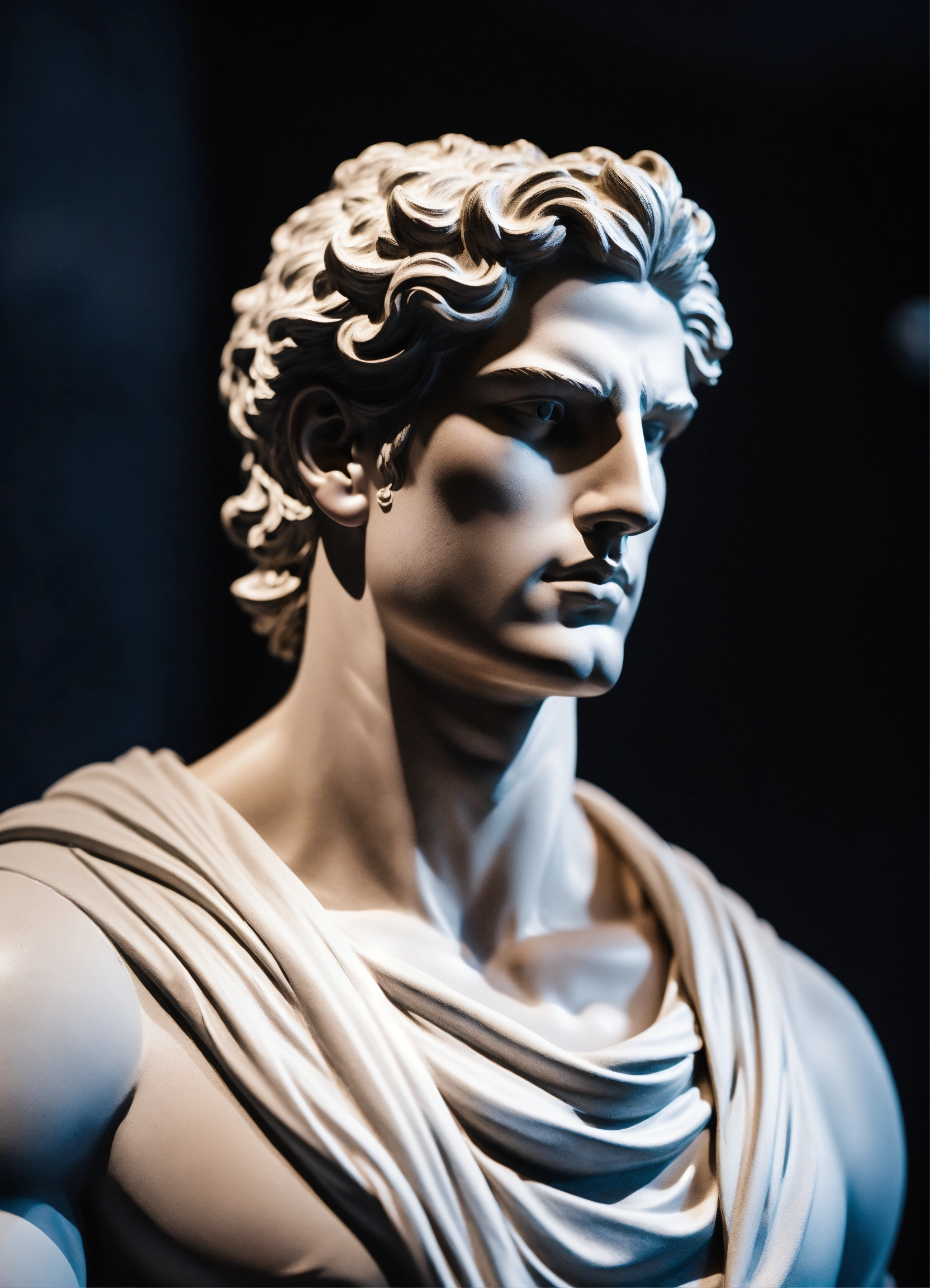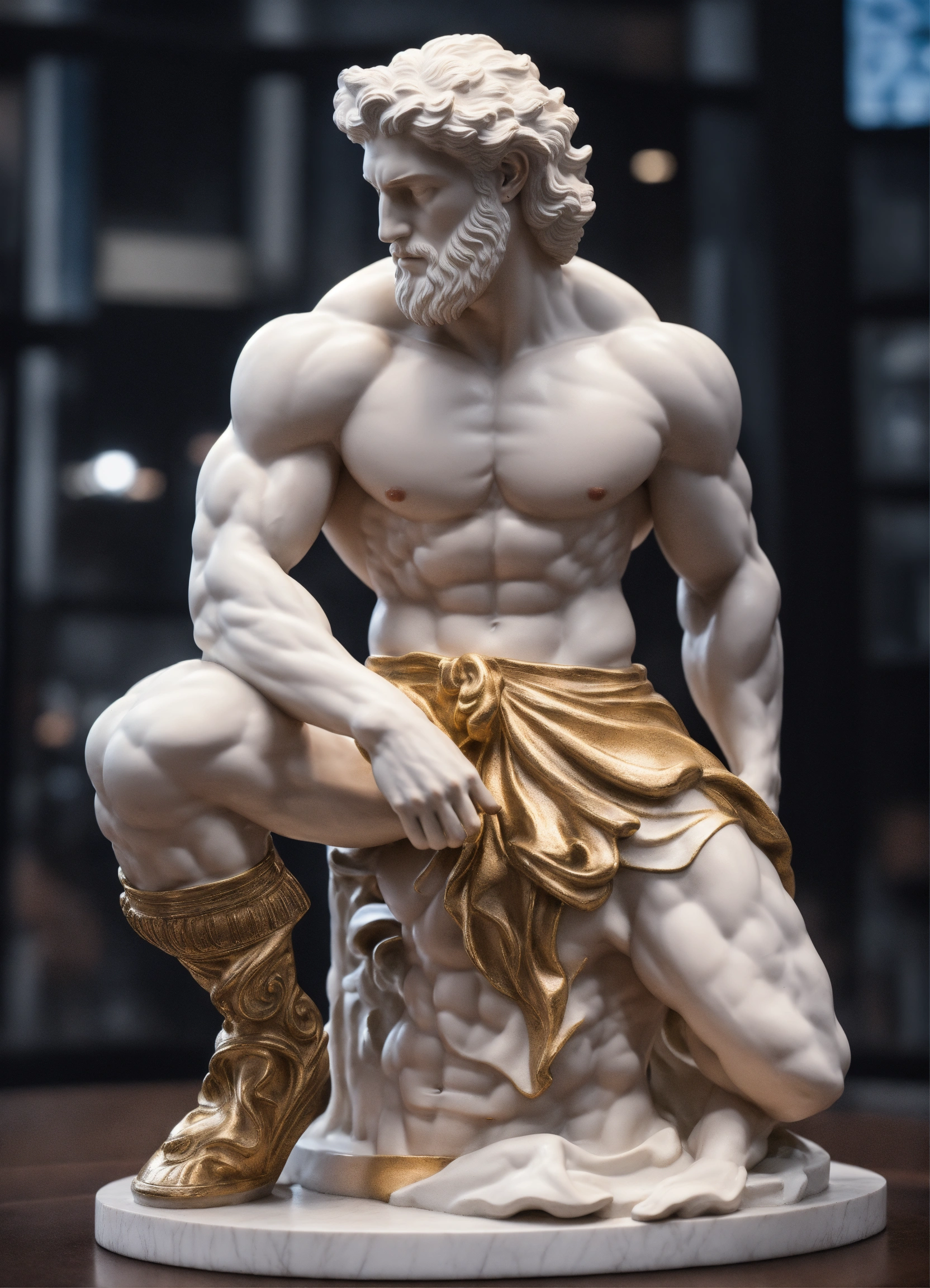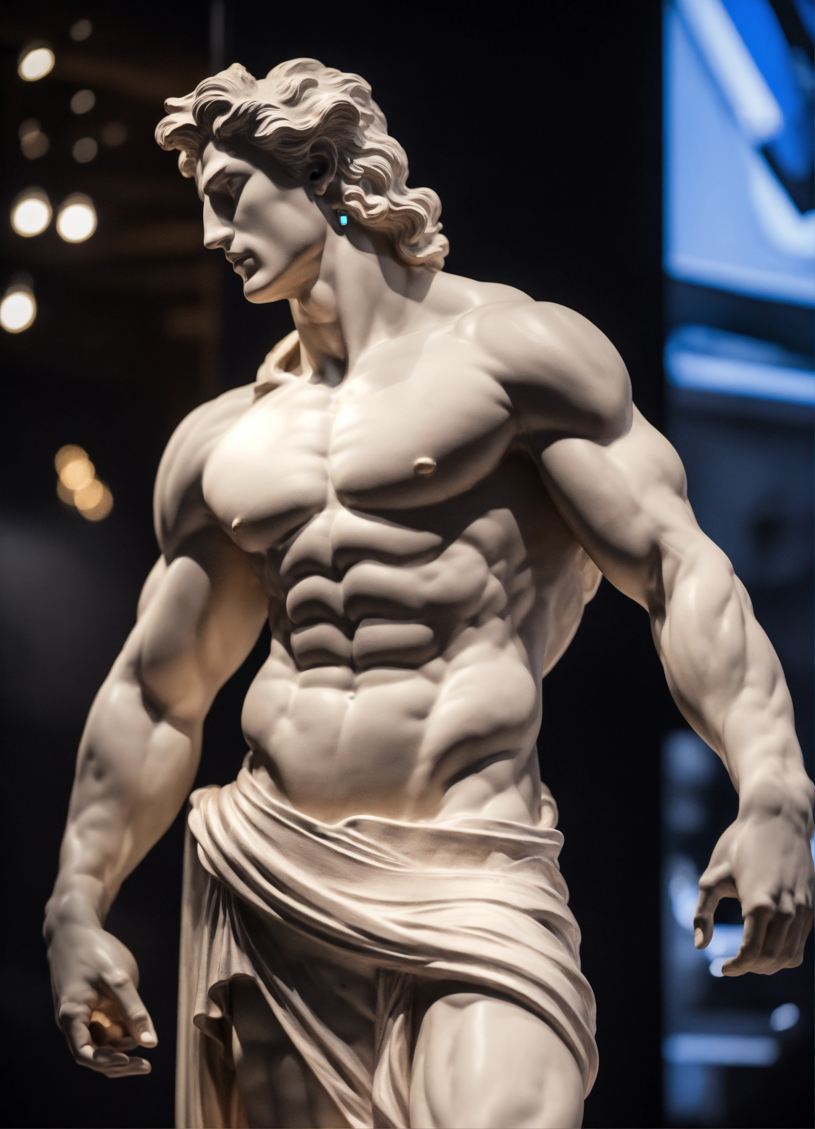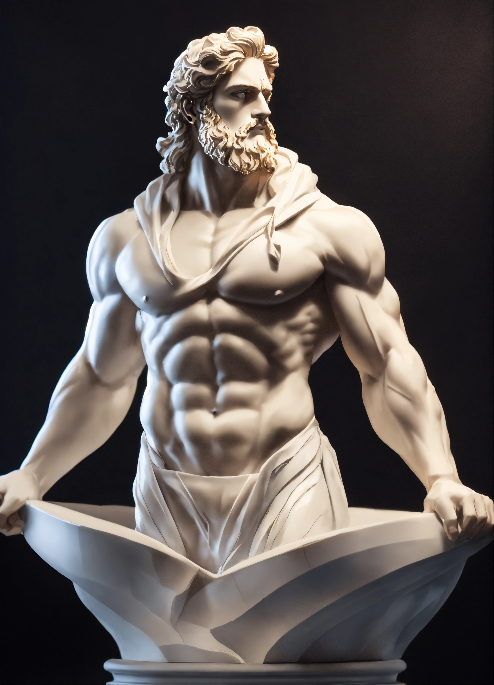 A statue from a muscular greek god statue with a wavey middel parting hair with white color on his body with a black backround standing on a podest animeted style 8k wearing airpods and a black hoddie