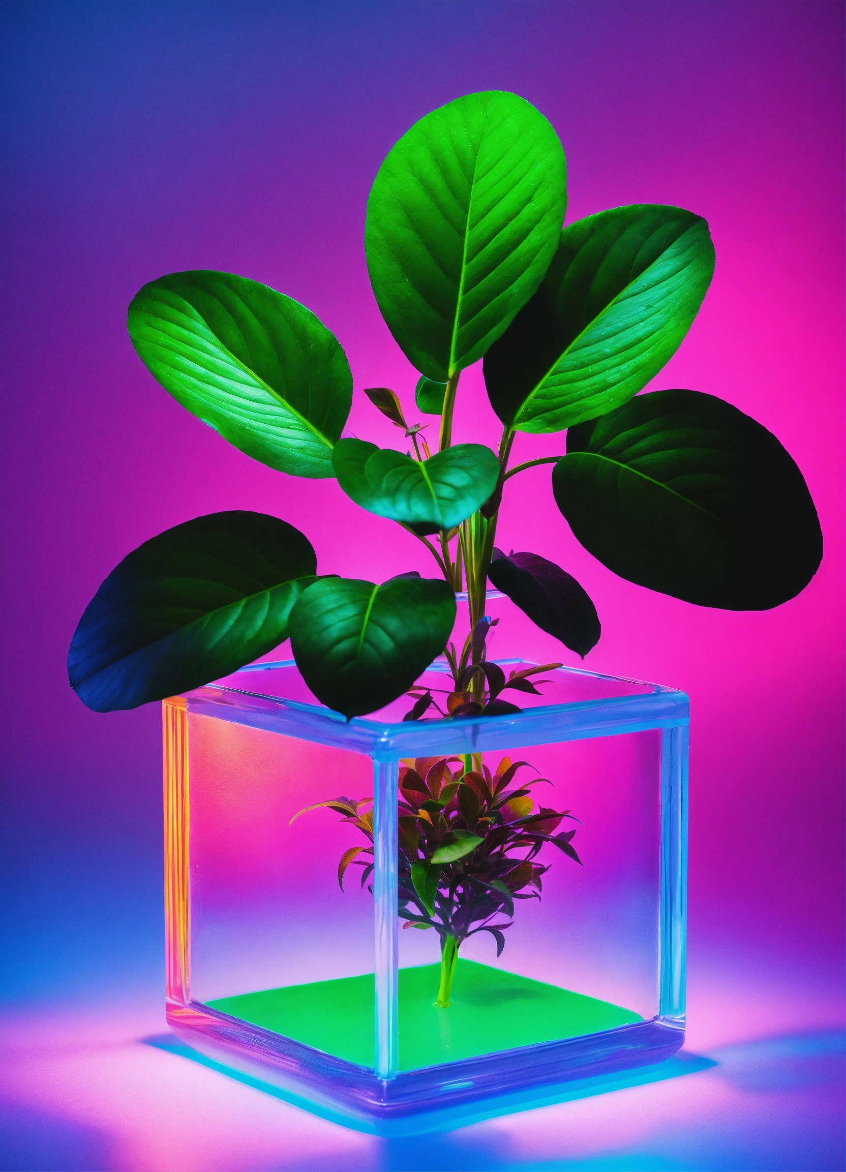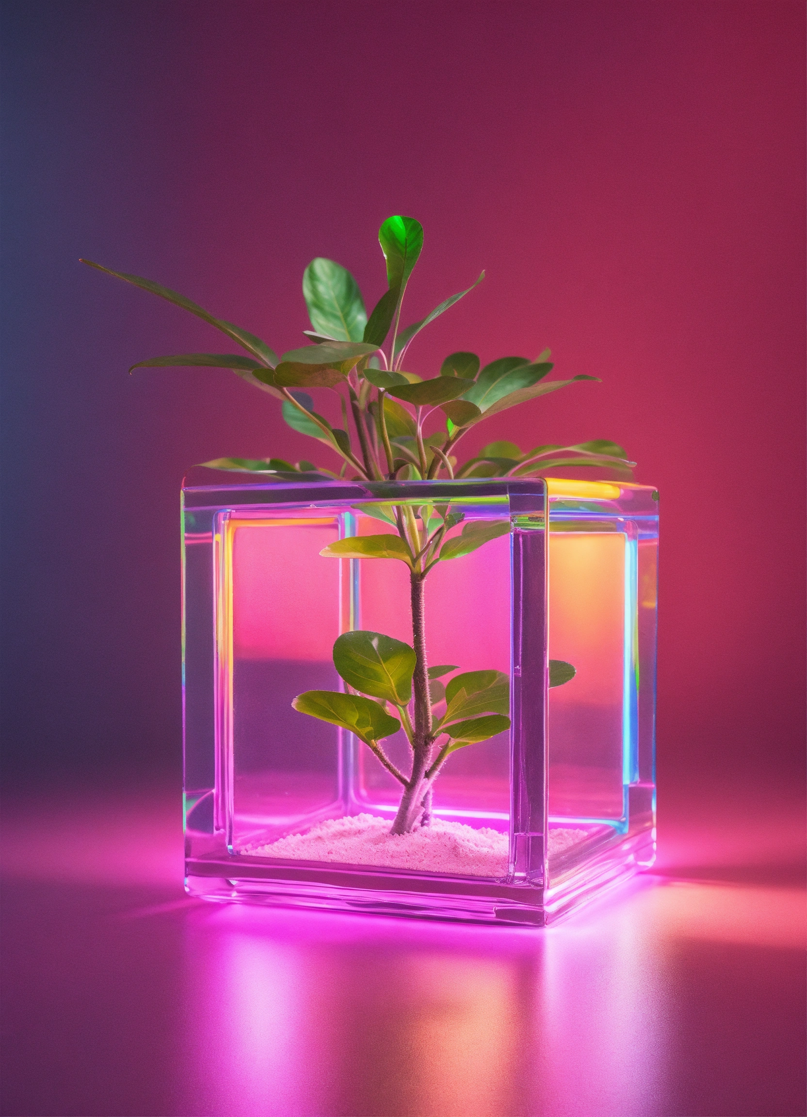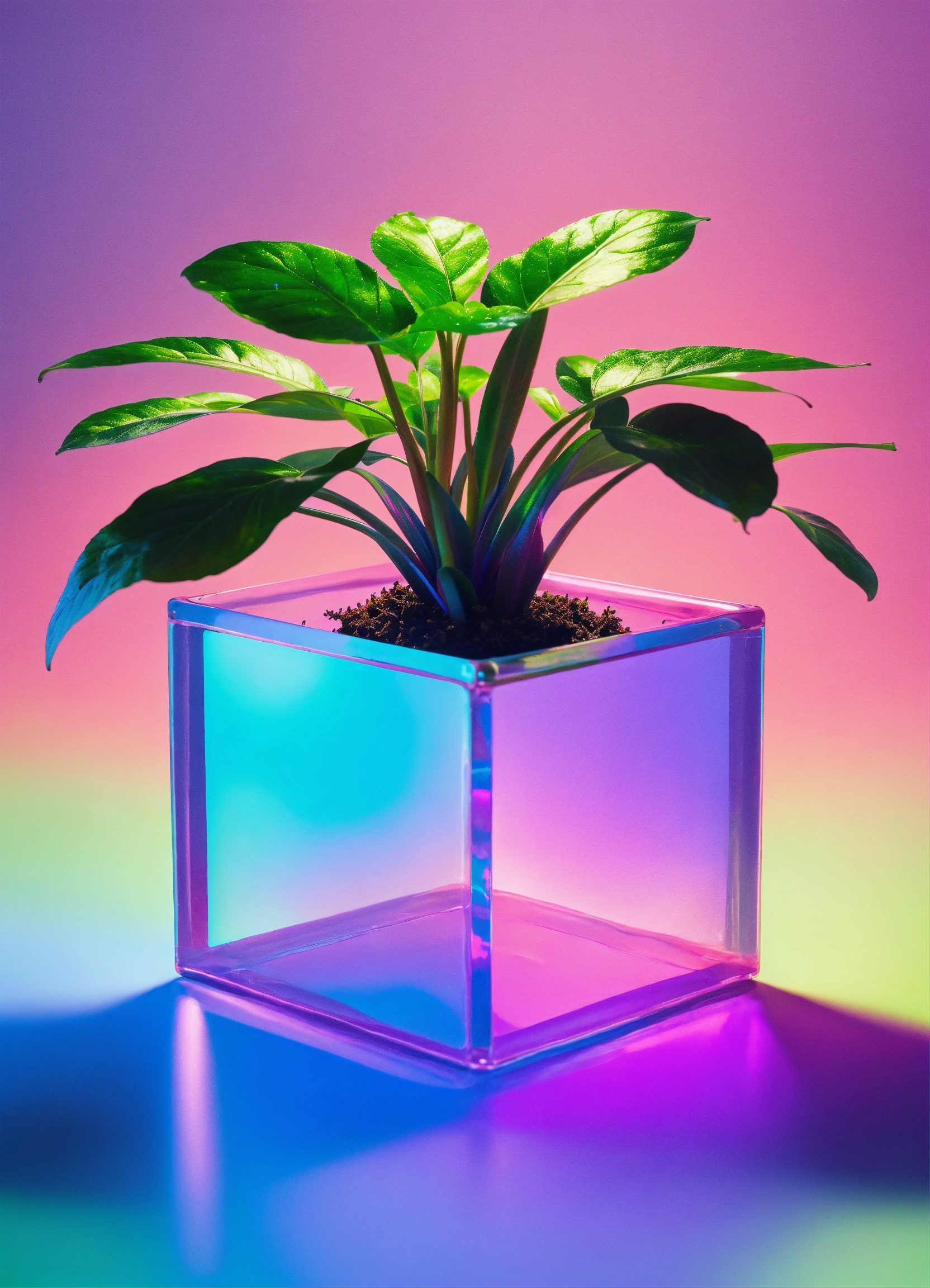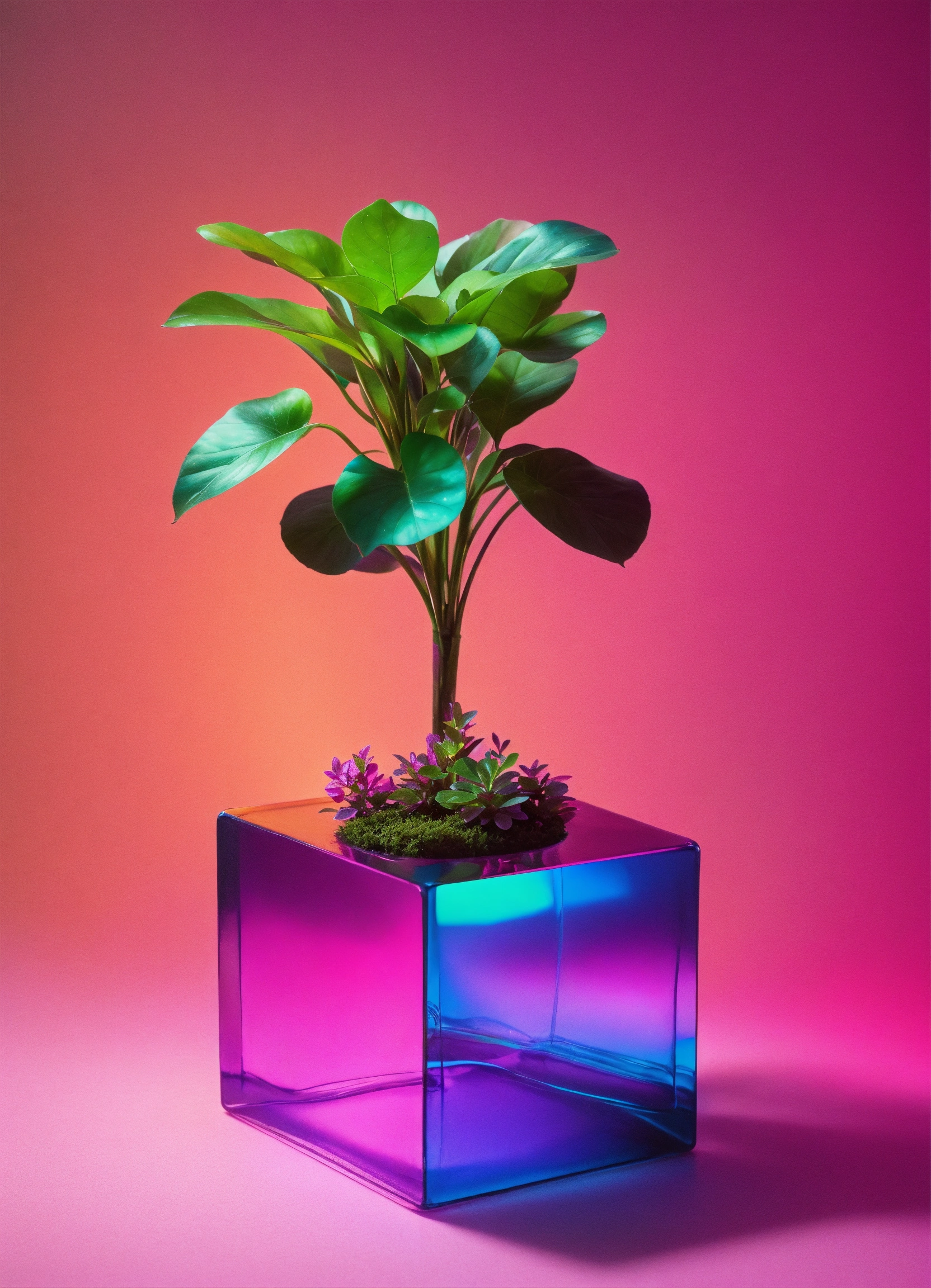Floating iridescent plastic cube full of one plant. studio photography, some neon green accent color, 4k, iridescent, muted color background! realistic!