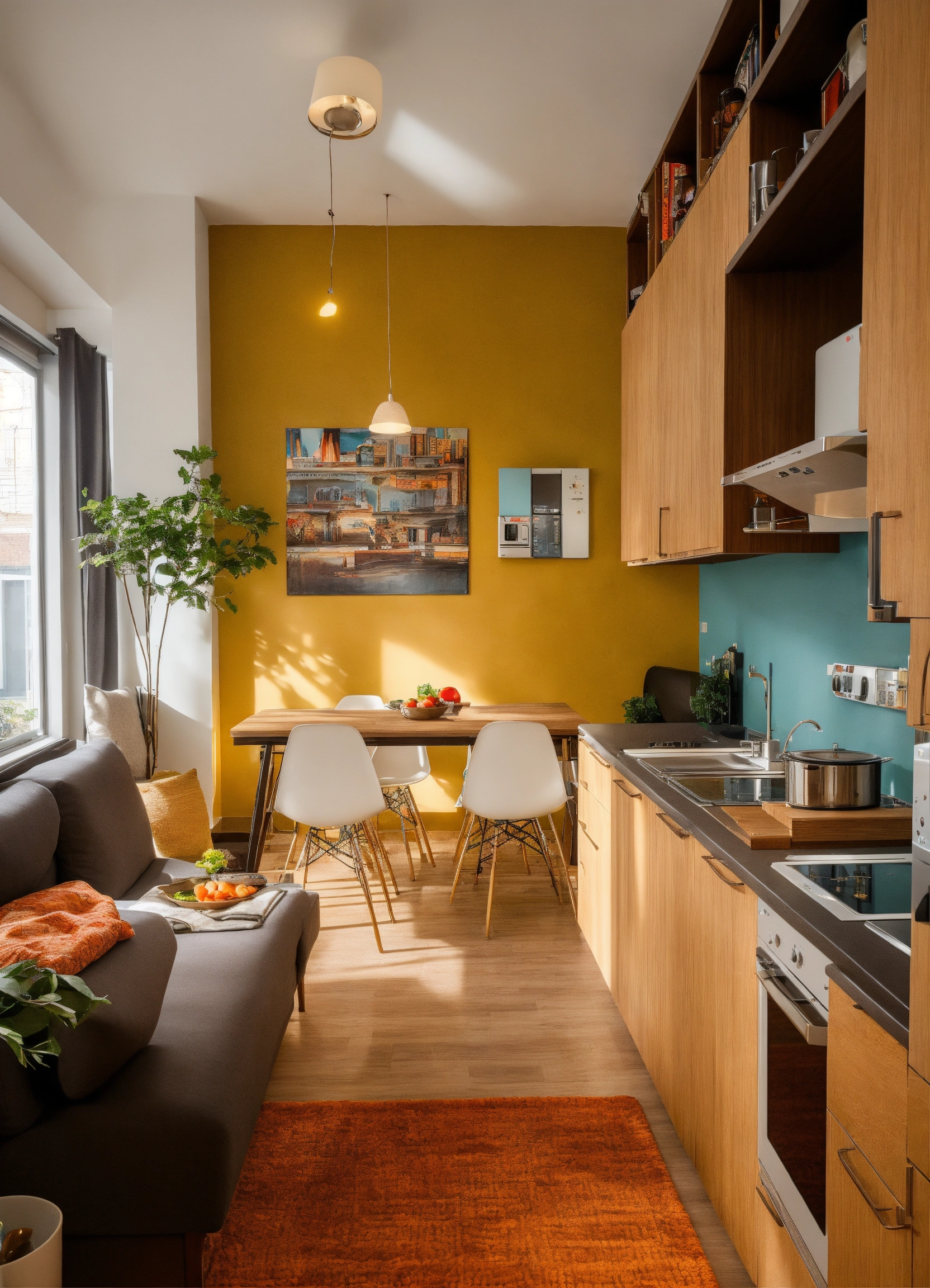 A photo of a student apartment. the apartment is furnished and decorated in a modern style. the kitchen is equipped with all the necessary appliances, and the living room is spacious and comfortable.