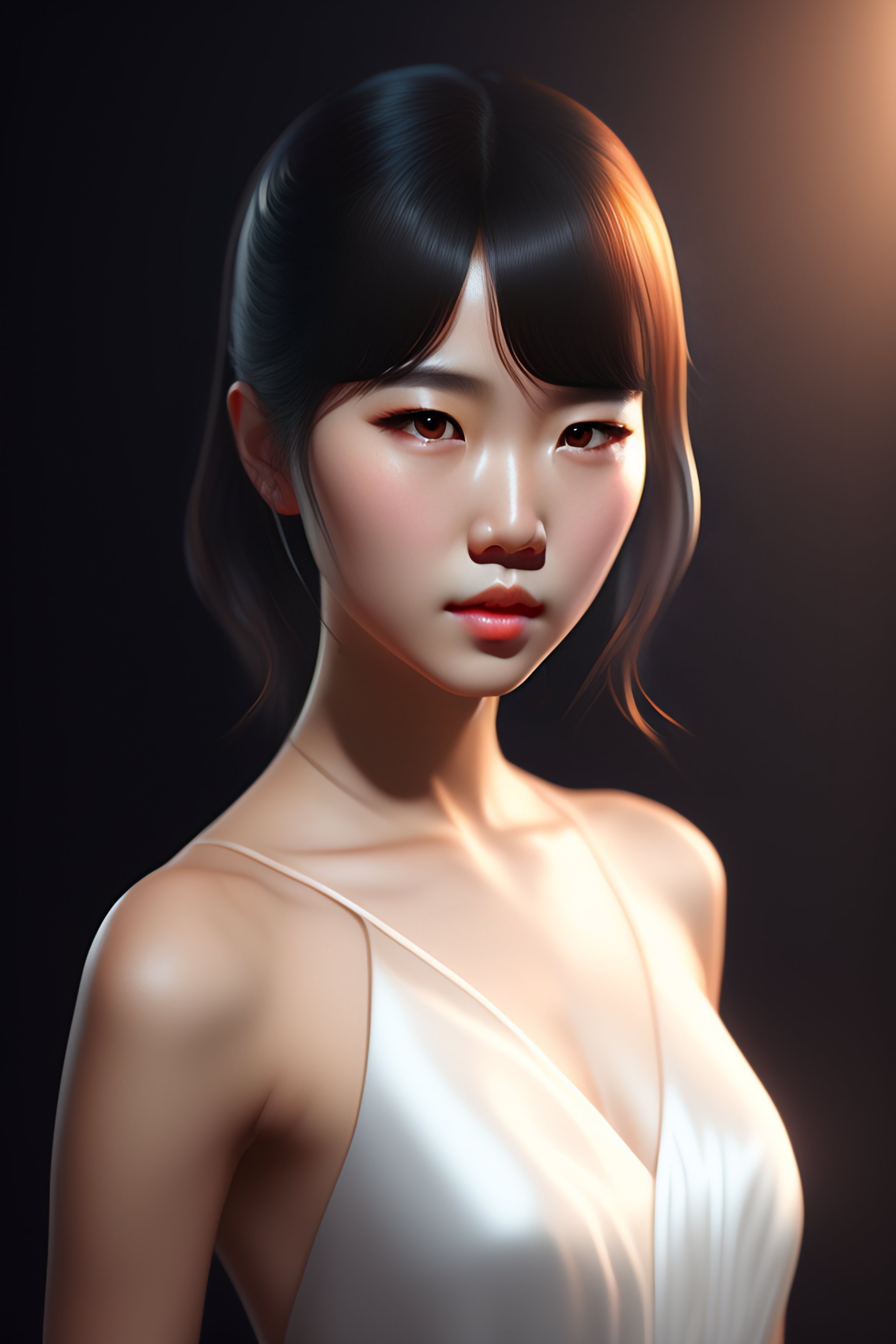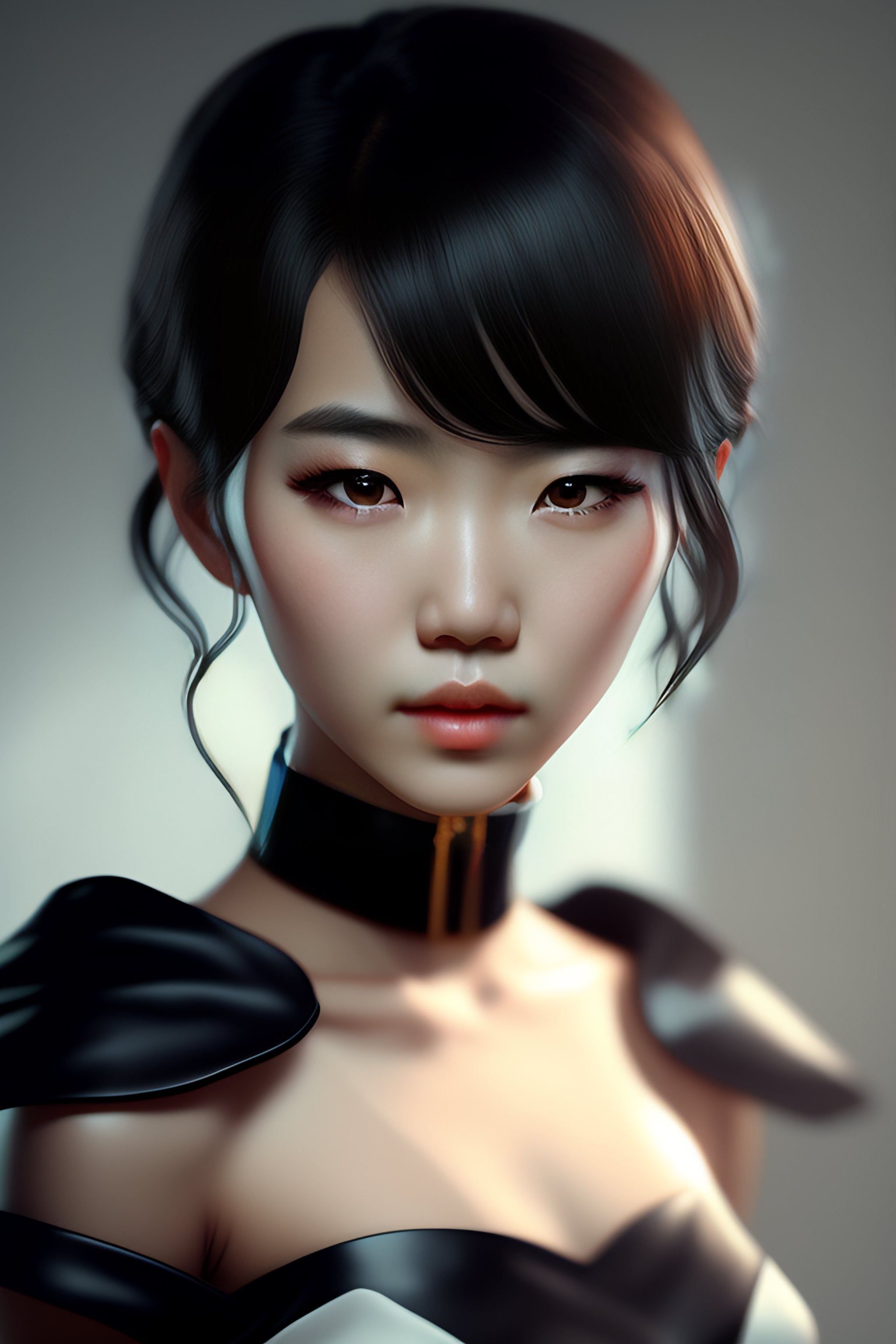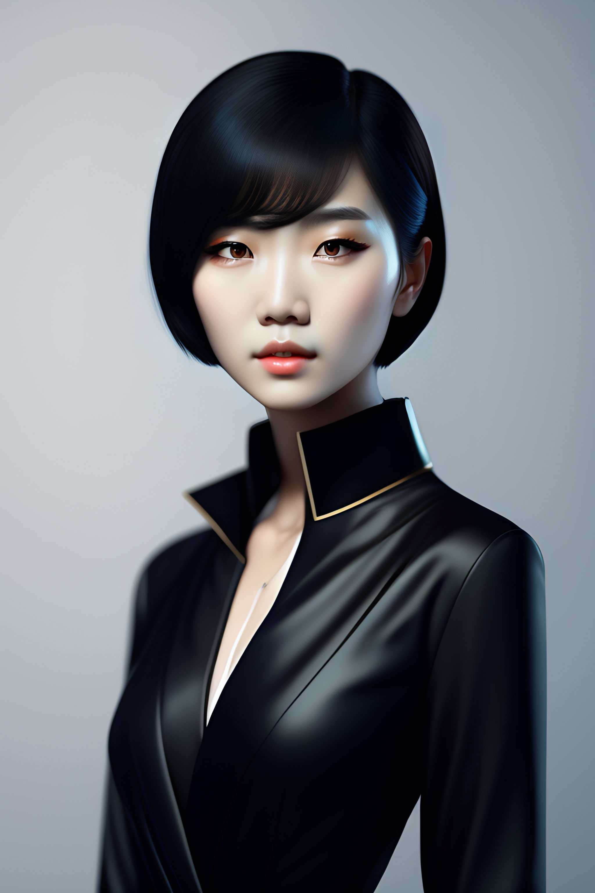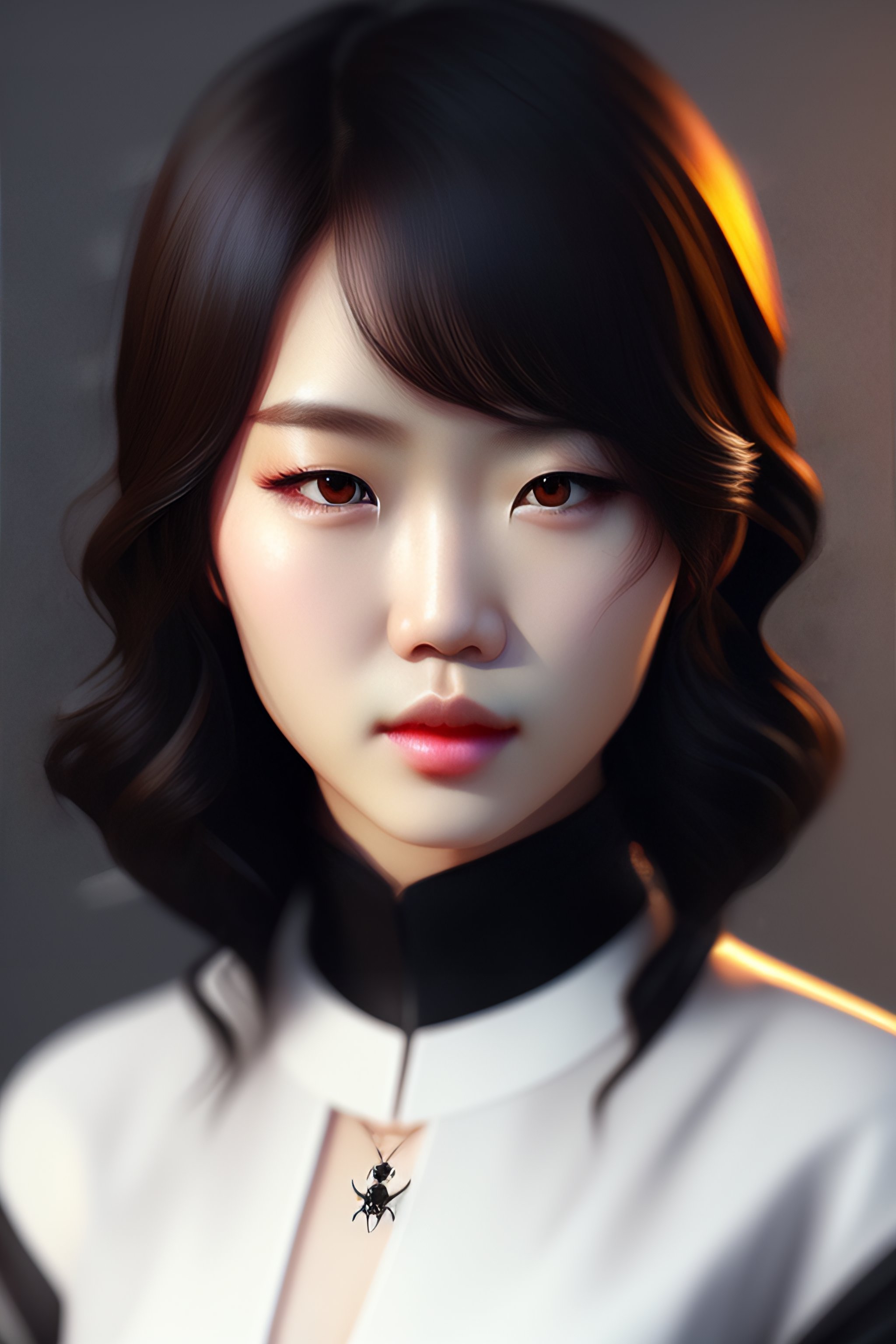 Girl from korea, with dark dress, 18 years old, short hair, with a little spider in your hair, serious expression, angry, portrait darkness, anime, portrait painting, octane render, white background, art, ray-trace