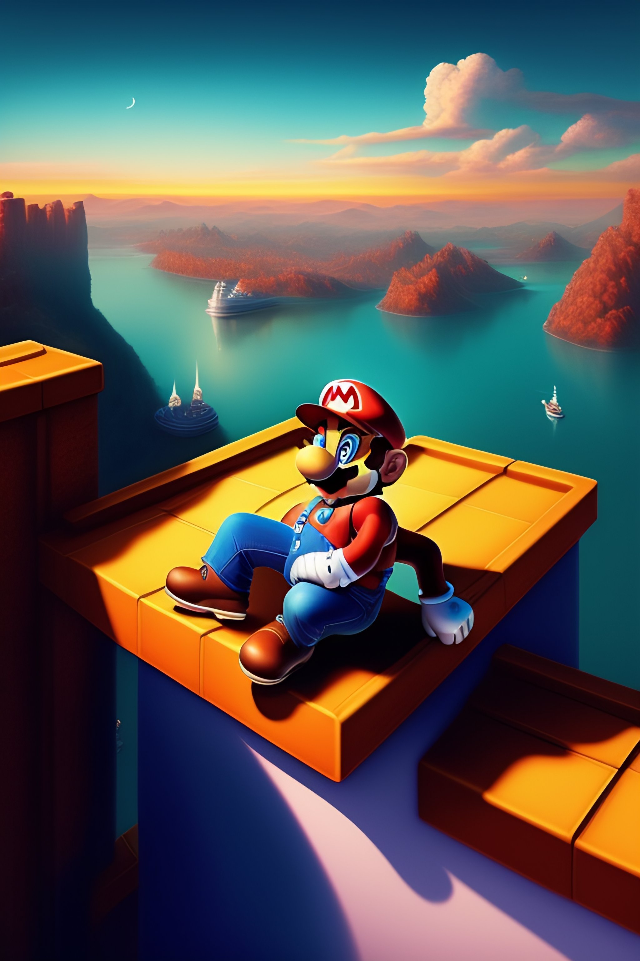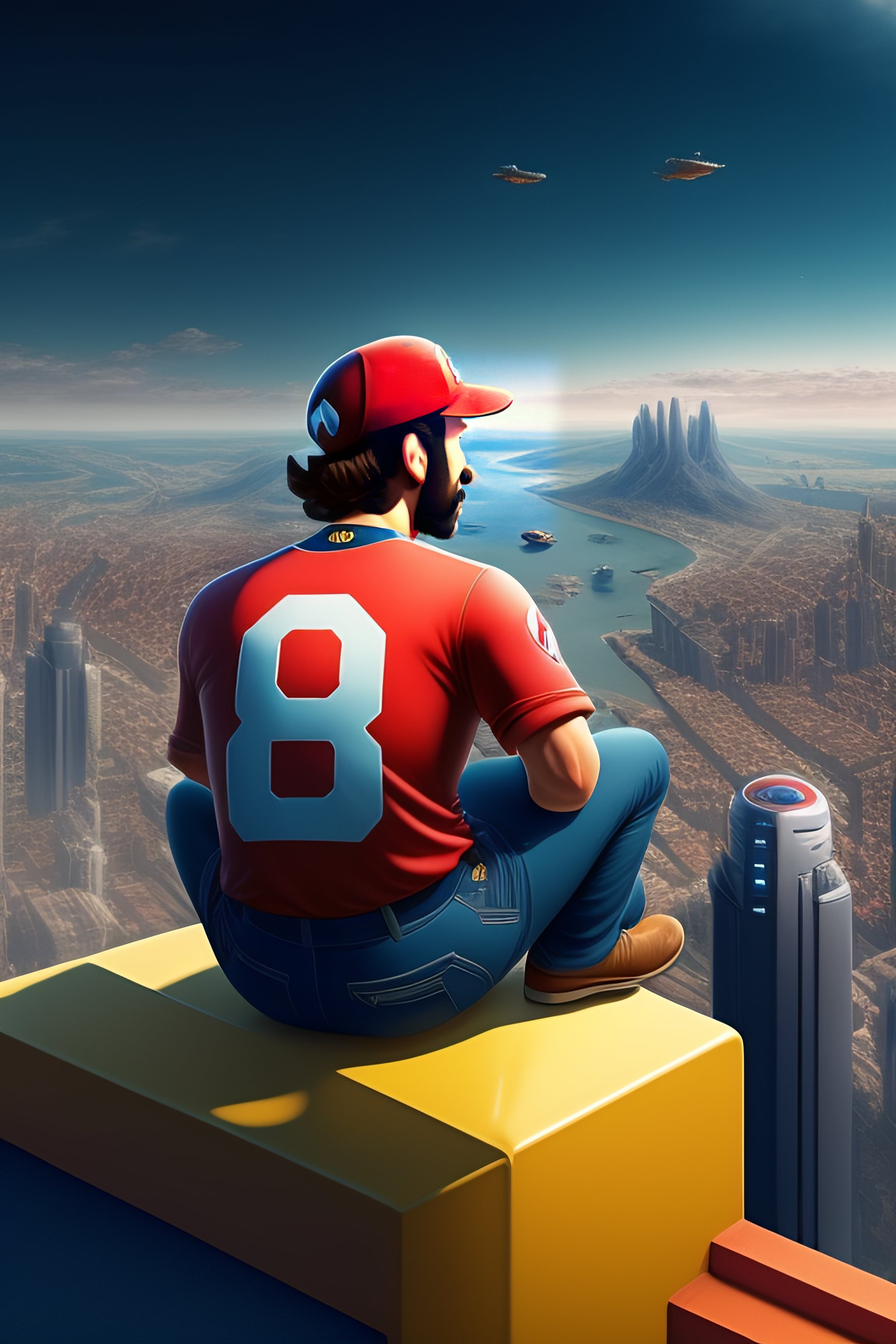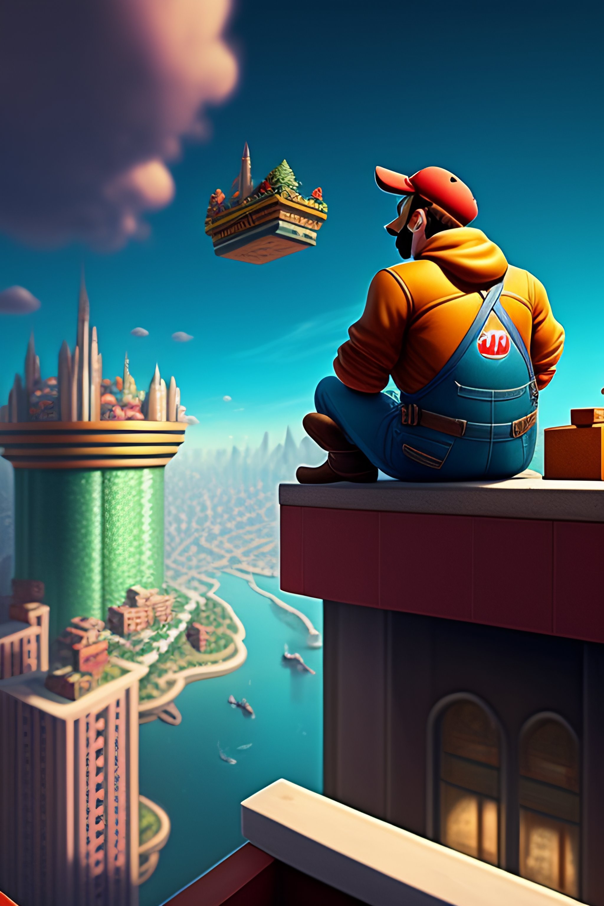 “super mario sitting on a roof looking down at a city below