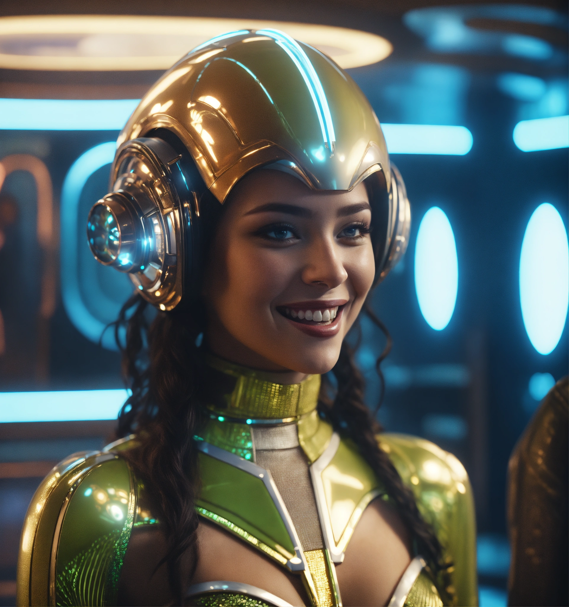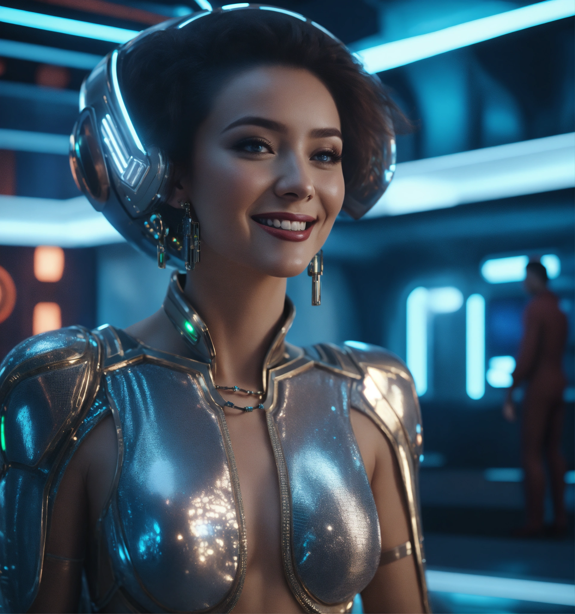 Zoom out from an alluring young alien space babe wearing a fancy space clothes and expensive jewelry in a futuristic space hotel lounge laughing with a man, realistic, futuristic, sci-fi, 8k, unreal engine
