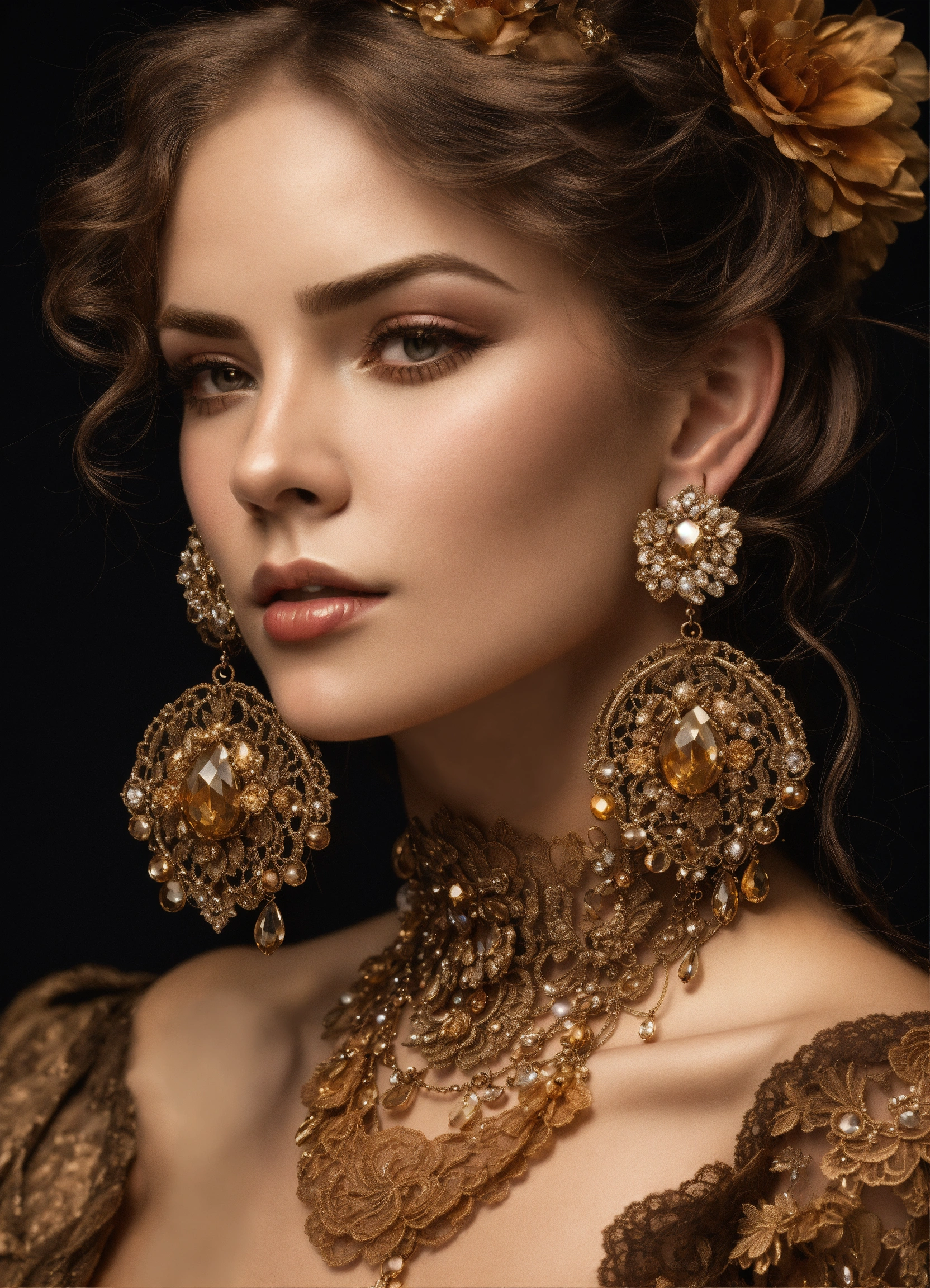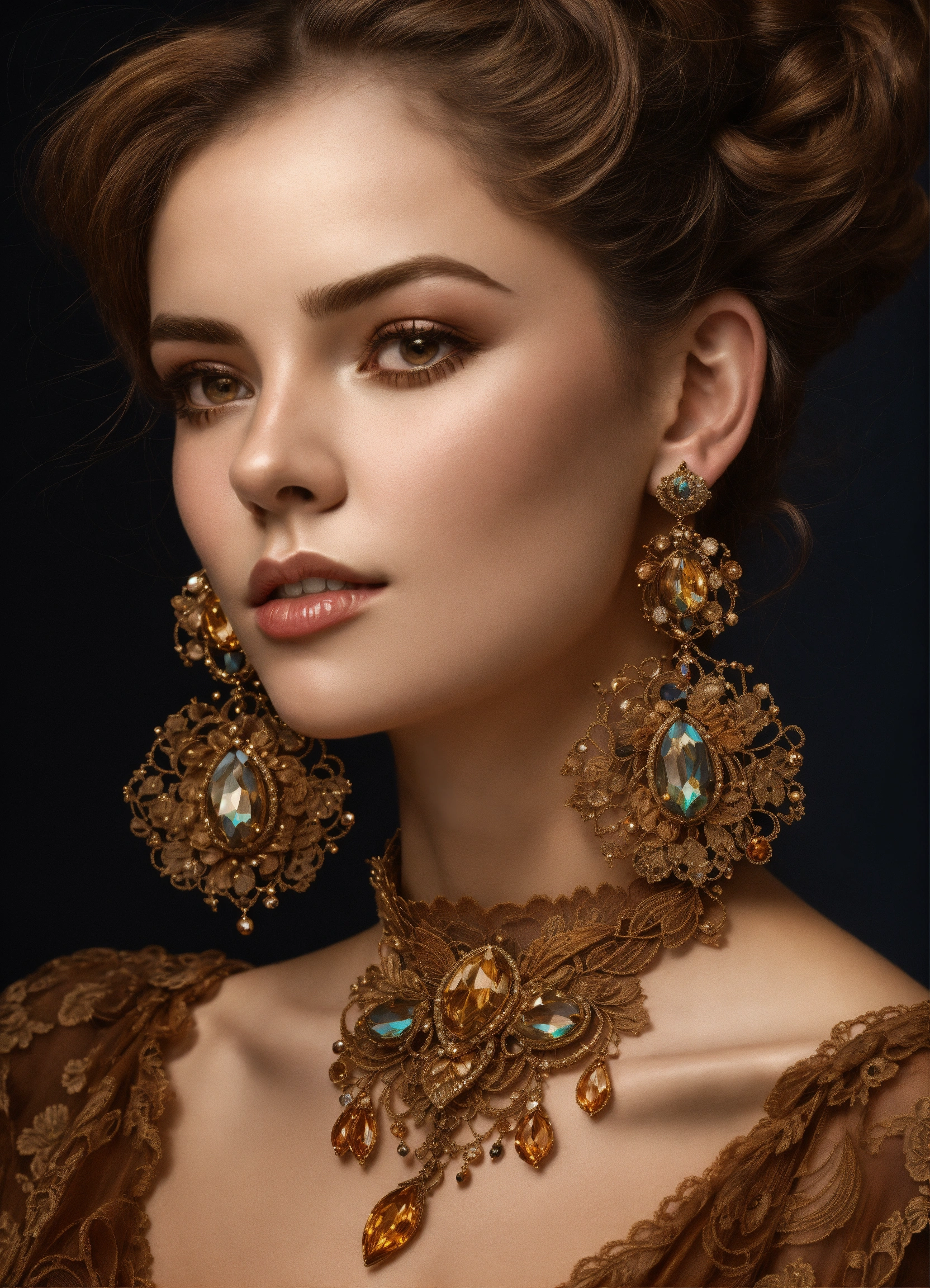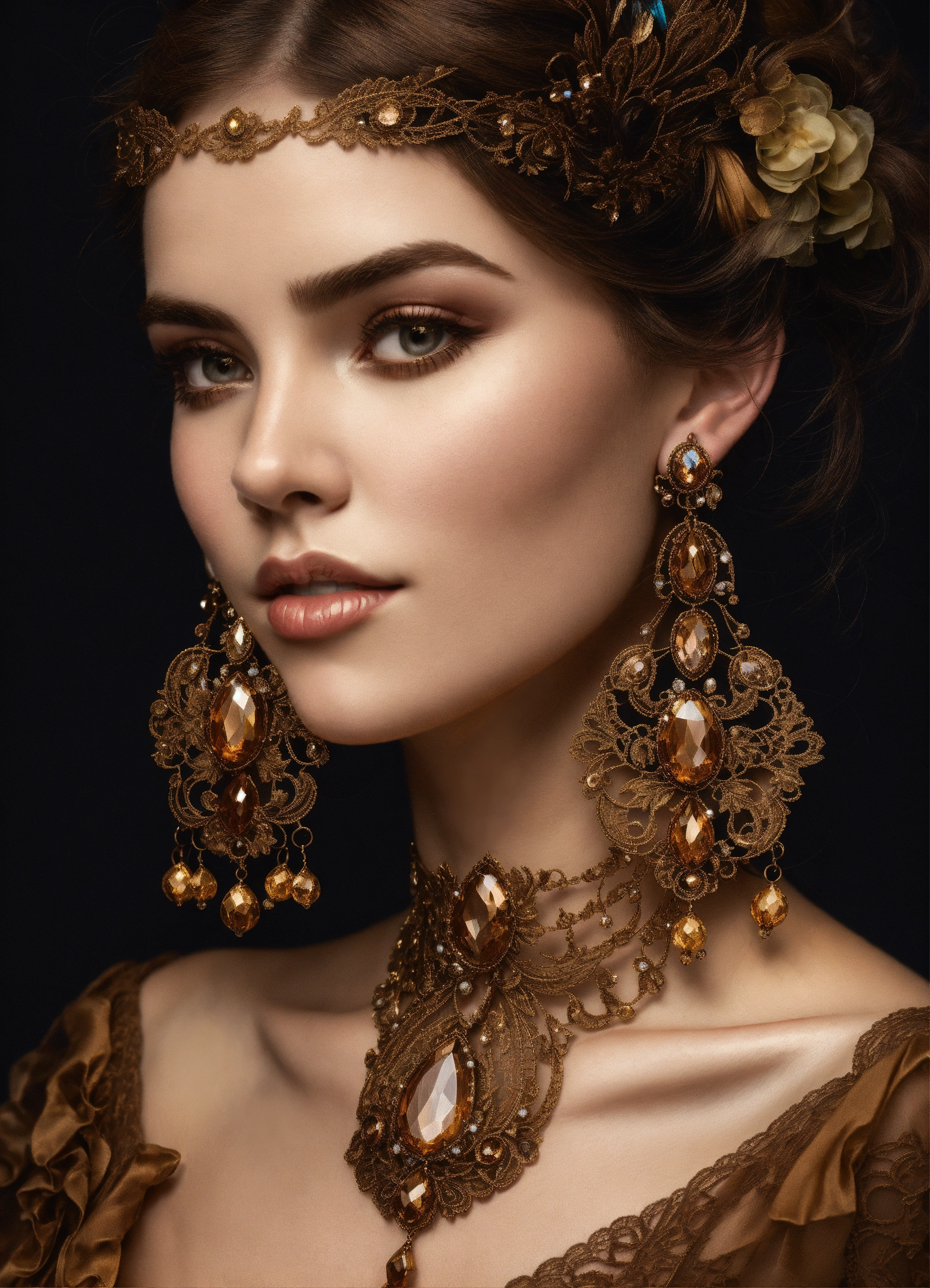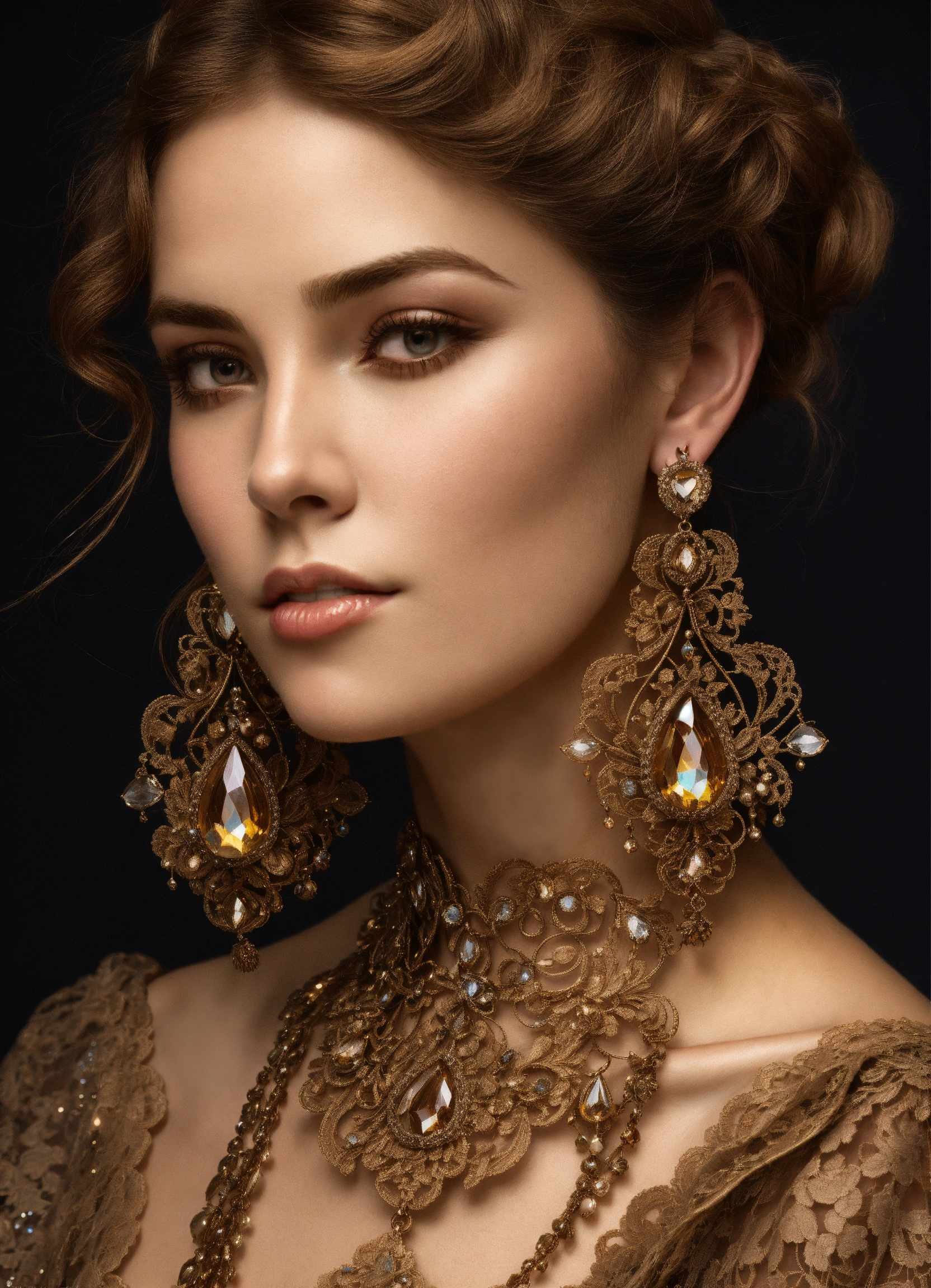 A fashion victorian style pretty woman portrait wearing luxurious detailed shades of bronze venetian lace earrings decorated with champaign color crystals in the style of liam sharp, dutch tradition, webcam, gail simone, mark seliger, alfons mucha inspired 8k, high resolution, dark background