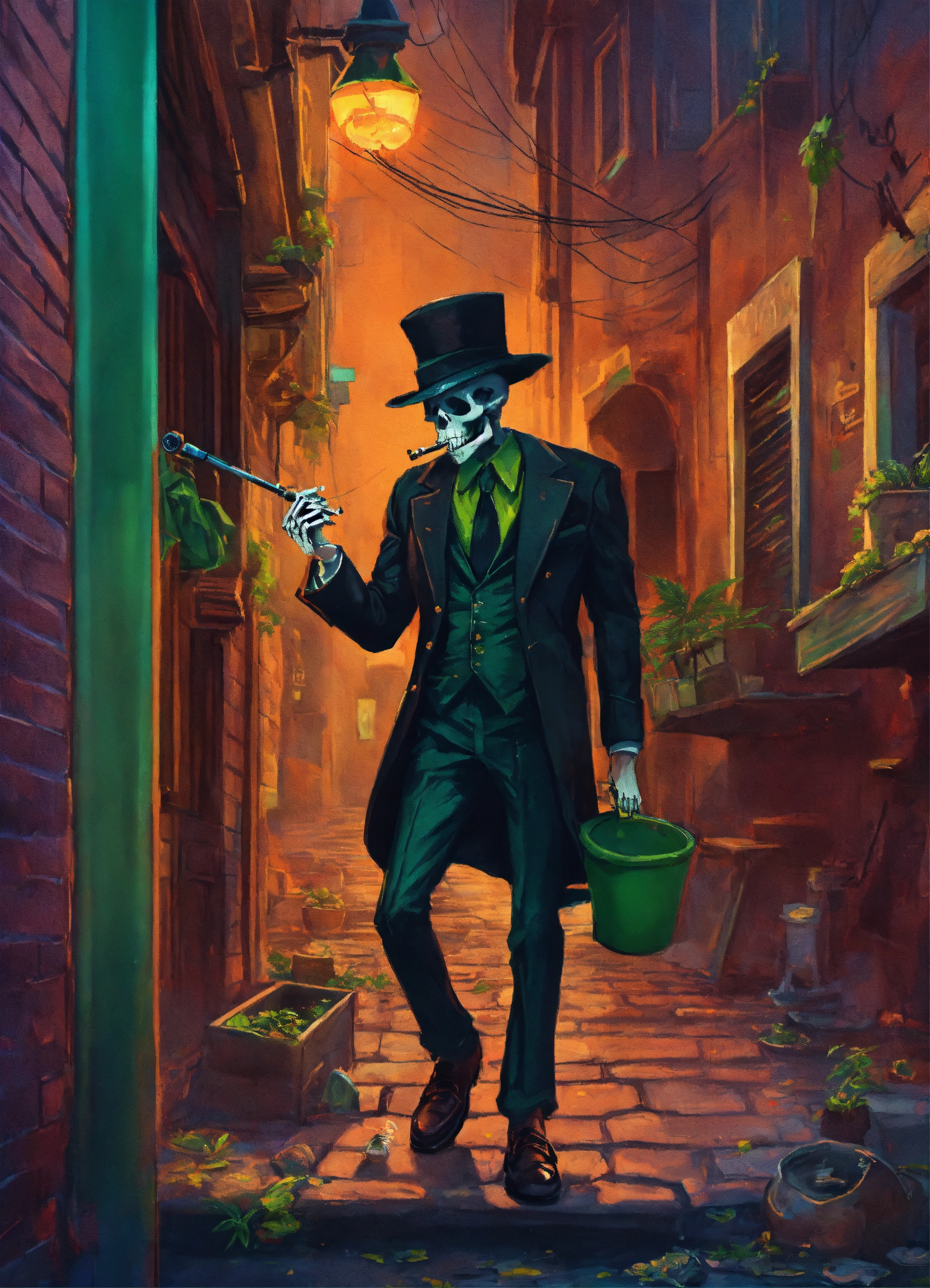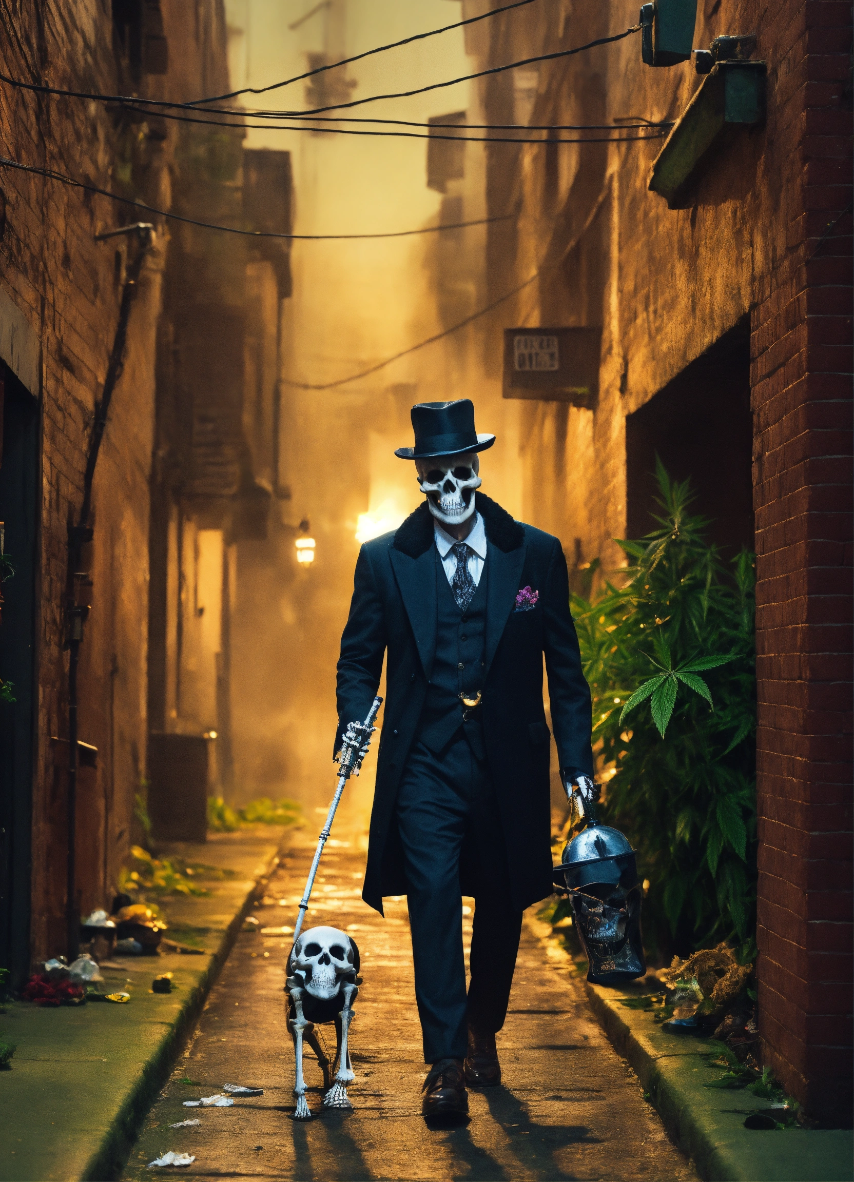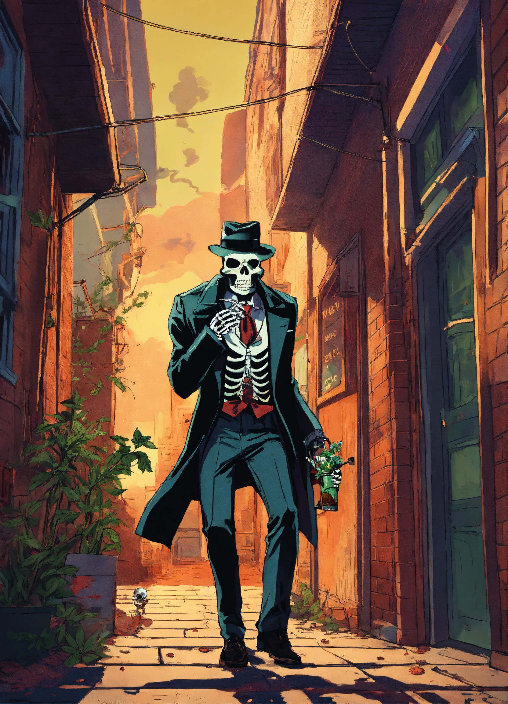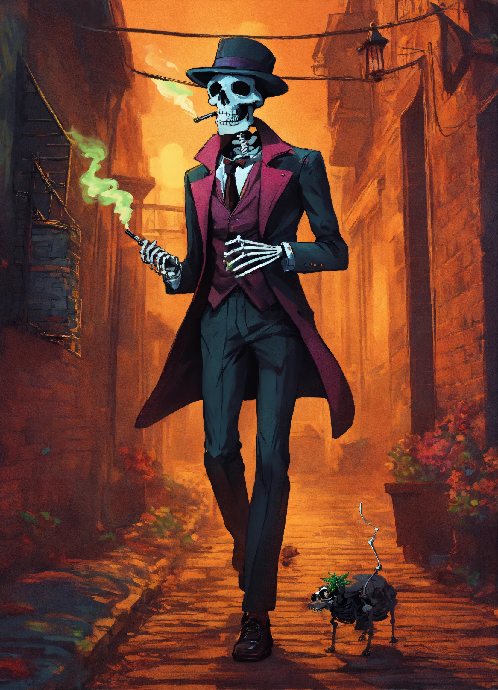 A skeleton walking down an alley dressed like a mobster smoking weed