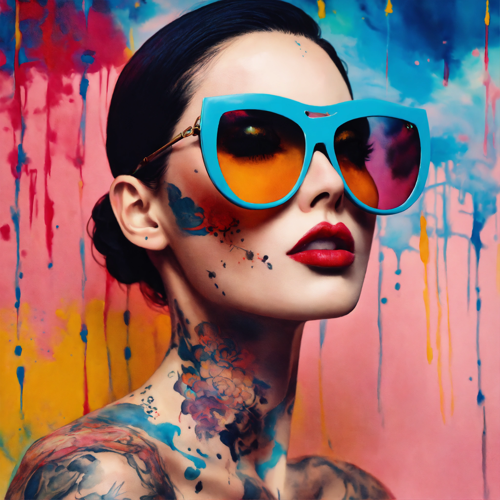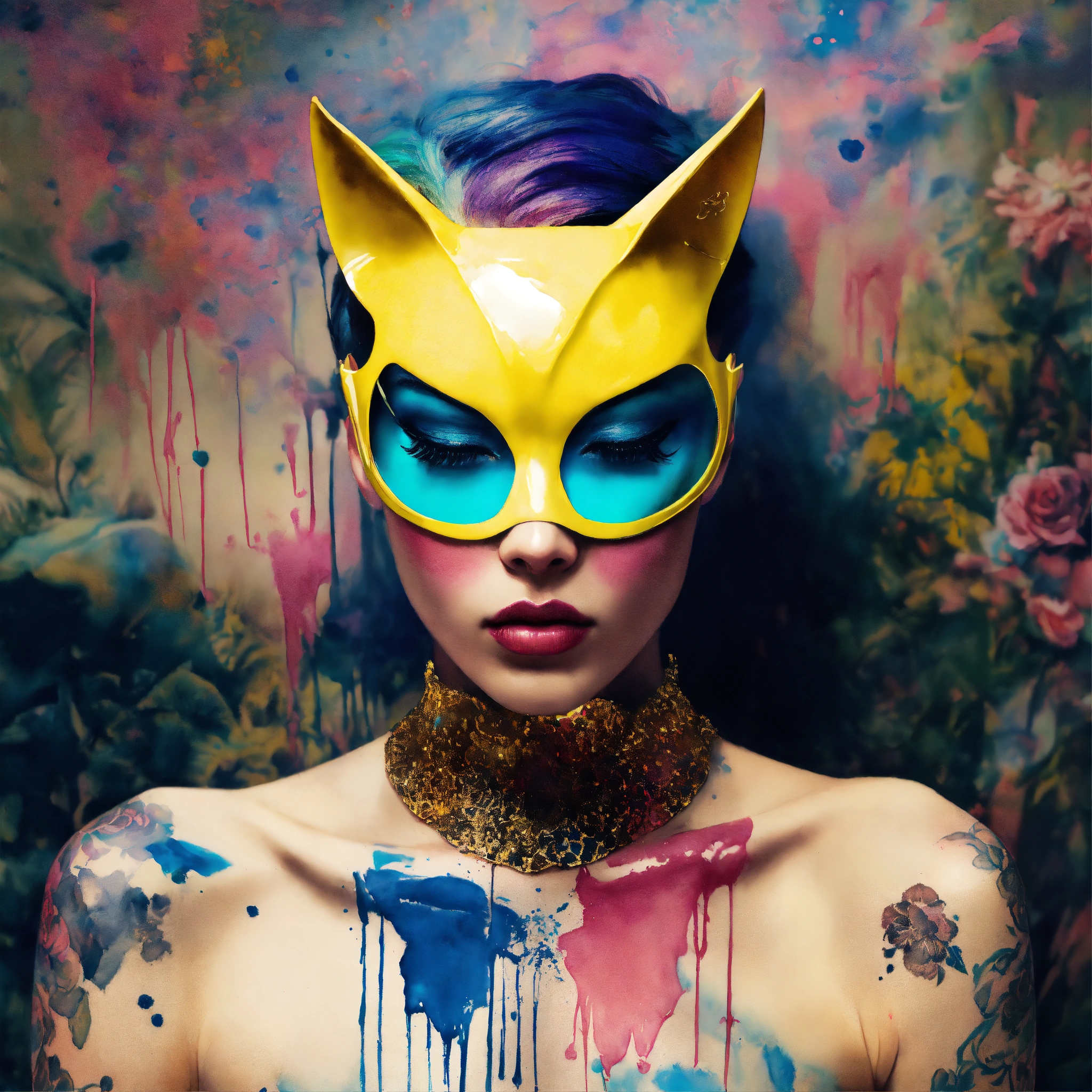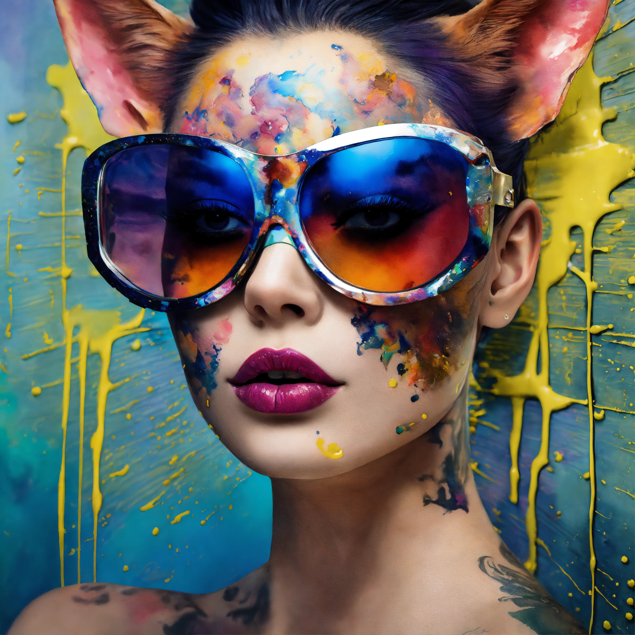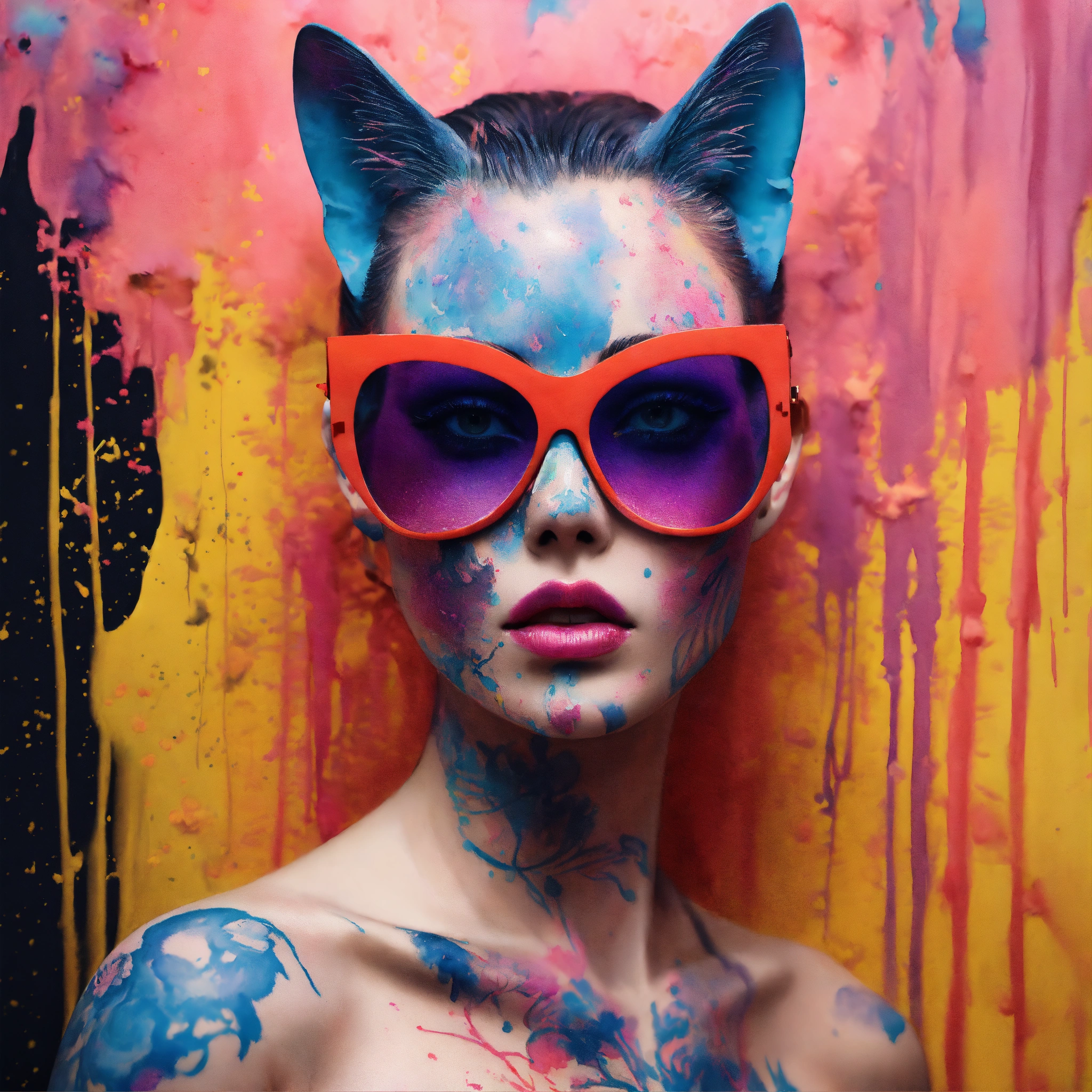 Pastel with pops of bold color watercolor brush strokes shot photography, a tattooed gorgeous woman's face in an euro american cat woman mask with sunglasses, emerges from black ink horizontal splatters, an attractive plexiglass body, 80 degree view, art by sergio lopez, natalie shau, james jean and salvador dali