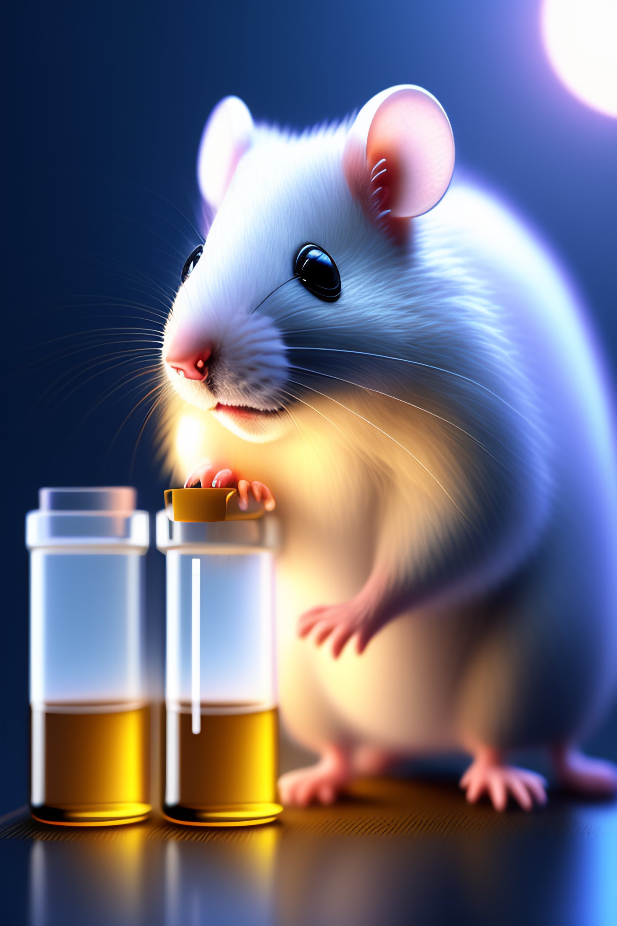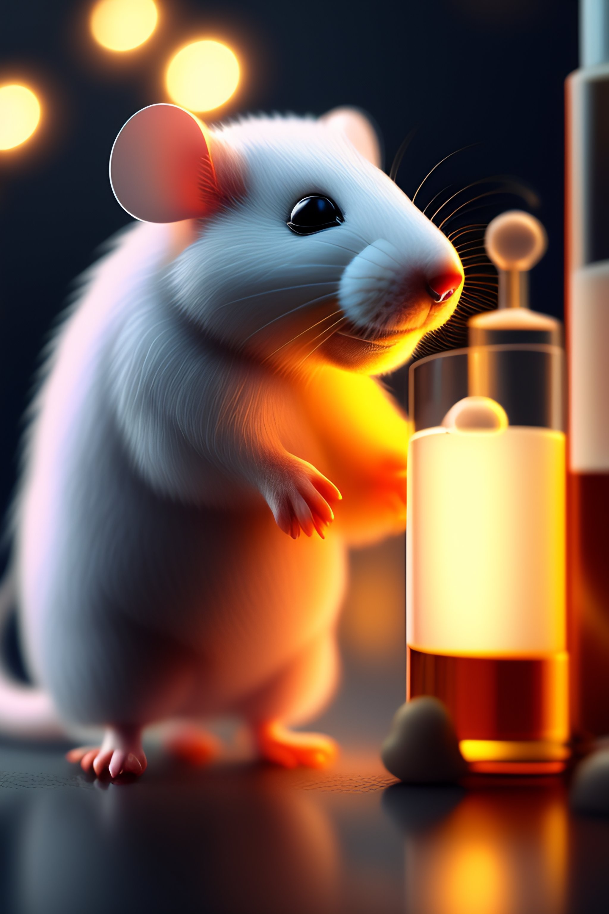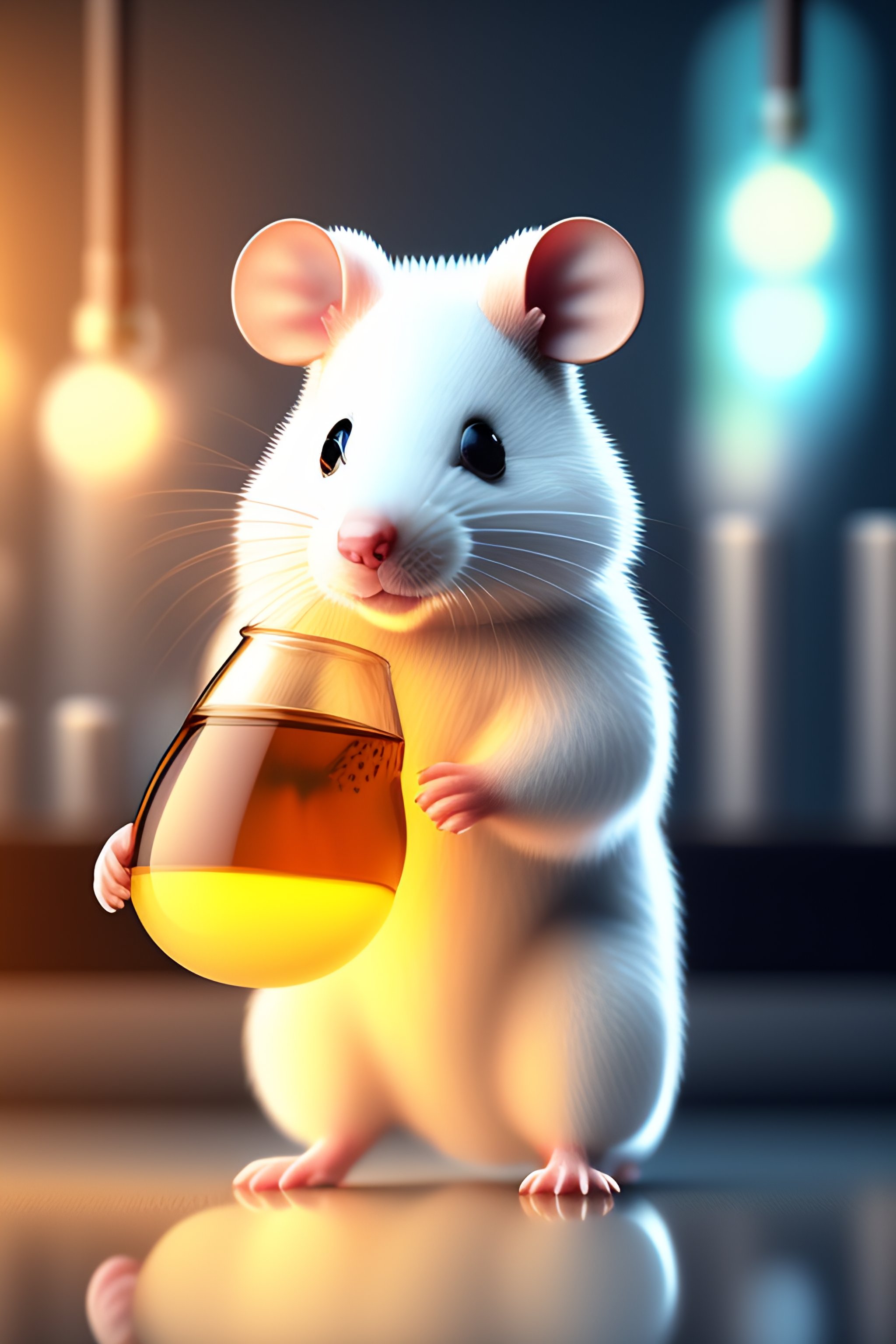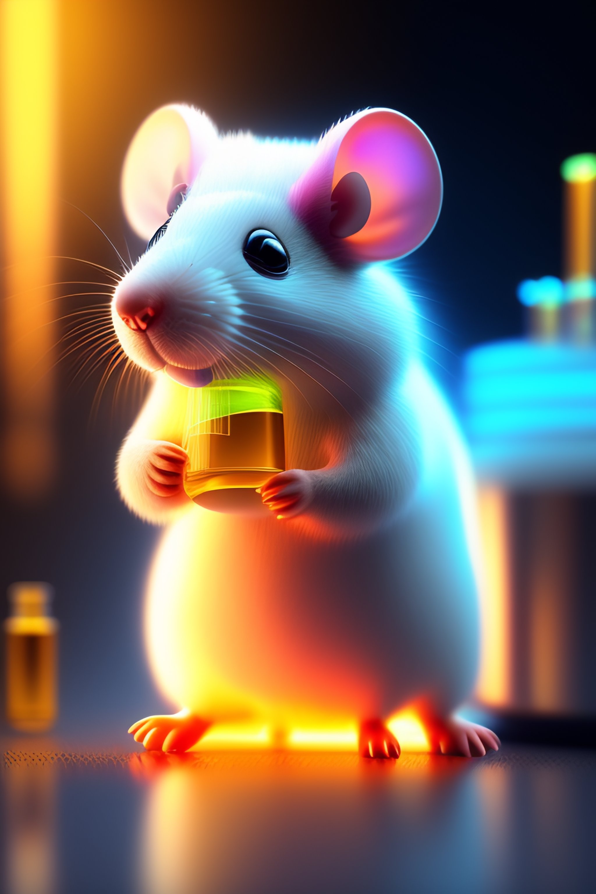 A 3d render of a cute fuzzy pet rat dressed in a white lab coat mixing test tubes of chemicals in a chemistry lab, bokeh, canon 50mm, cinematic lighting, volumetric light, octane, octane render, redshift render