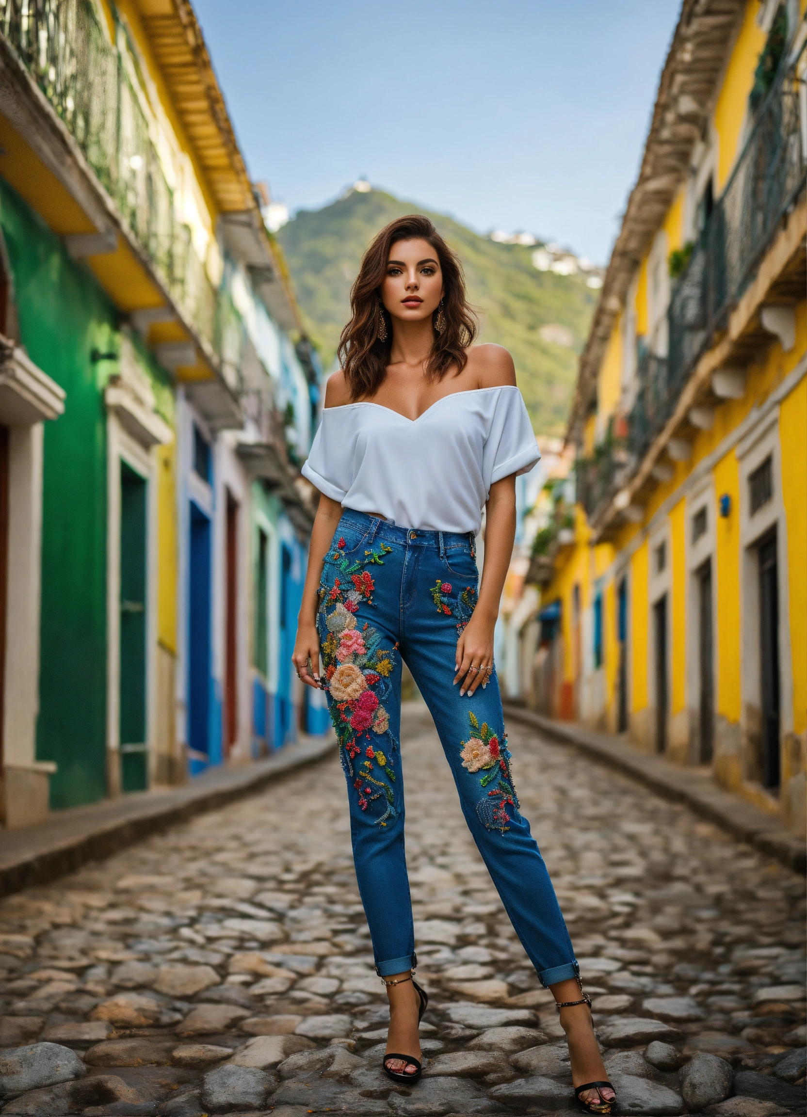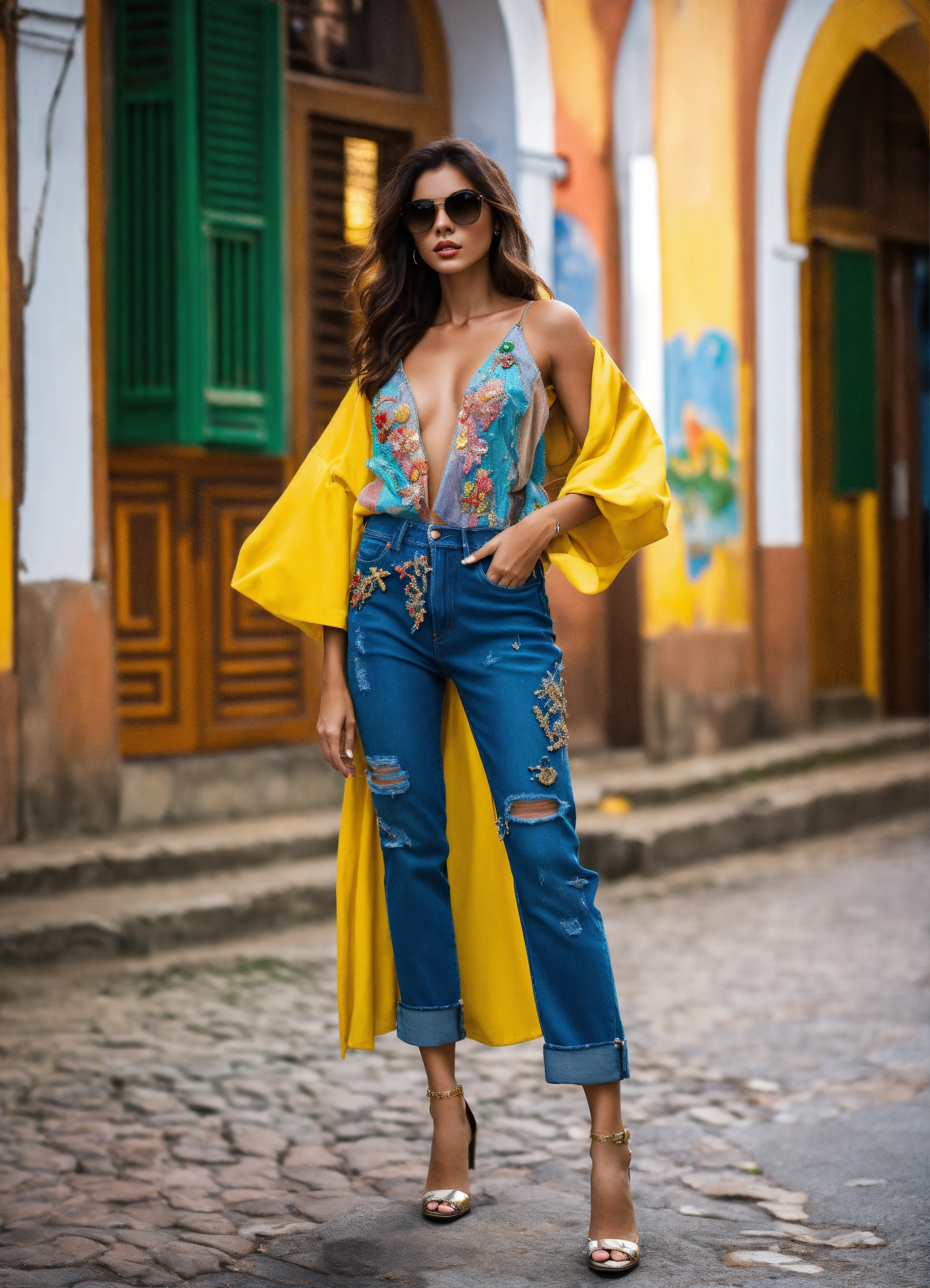 Ultra realistic full body photo of petite italian female model modeling upscale very artistic dolman sleeve travel inspired embellished jeans outfit with cool unusual elements in rio de janeiro