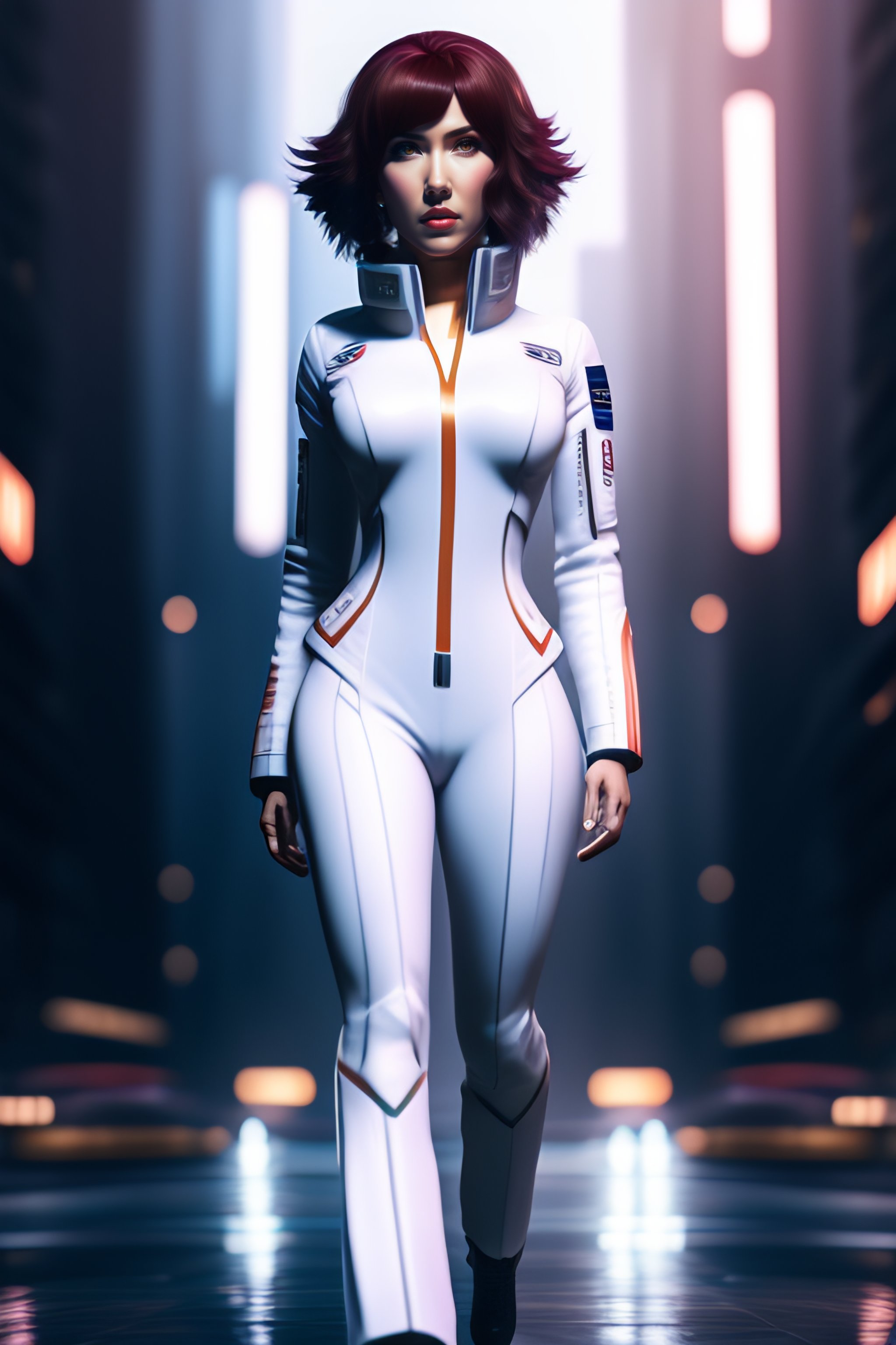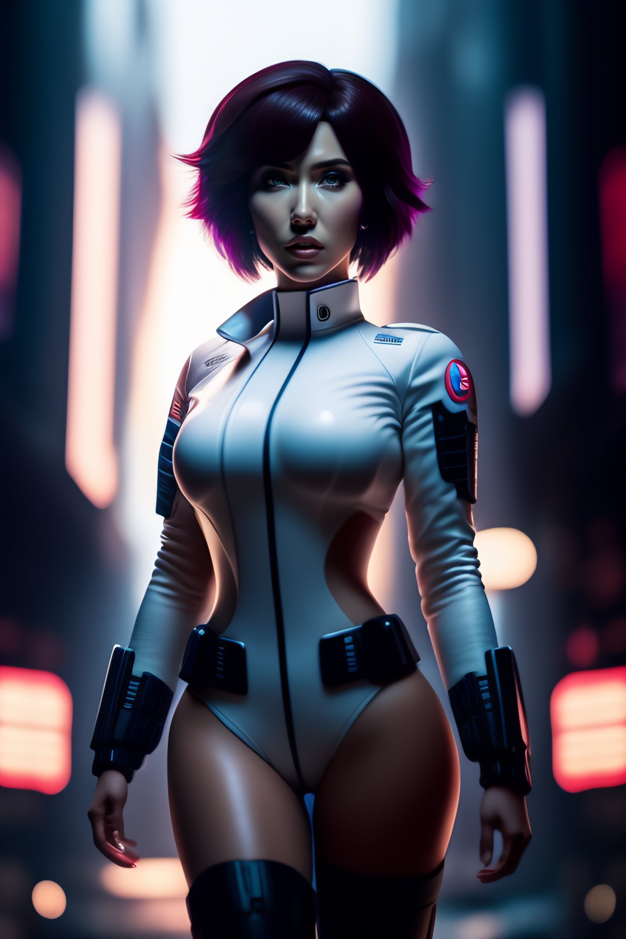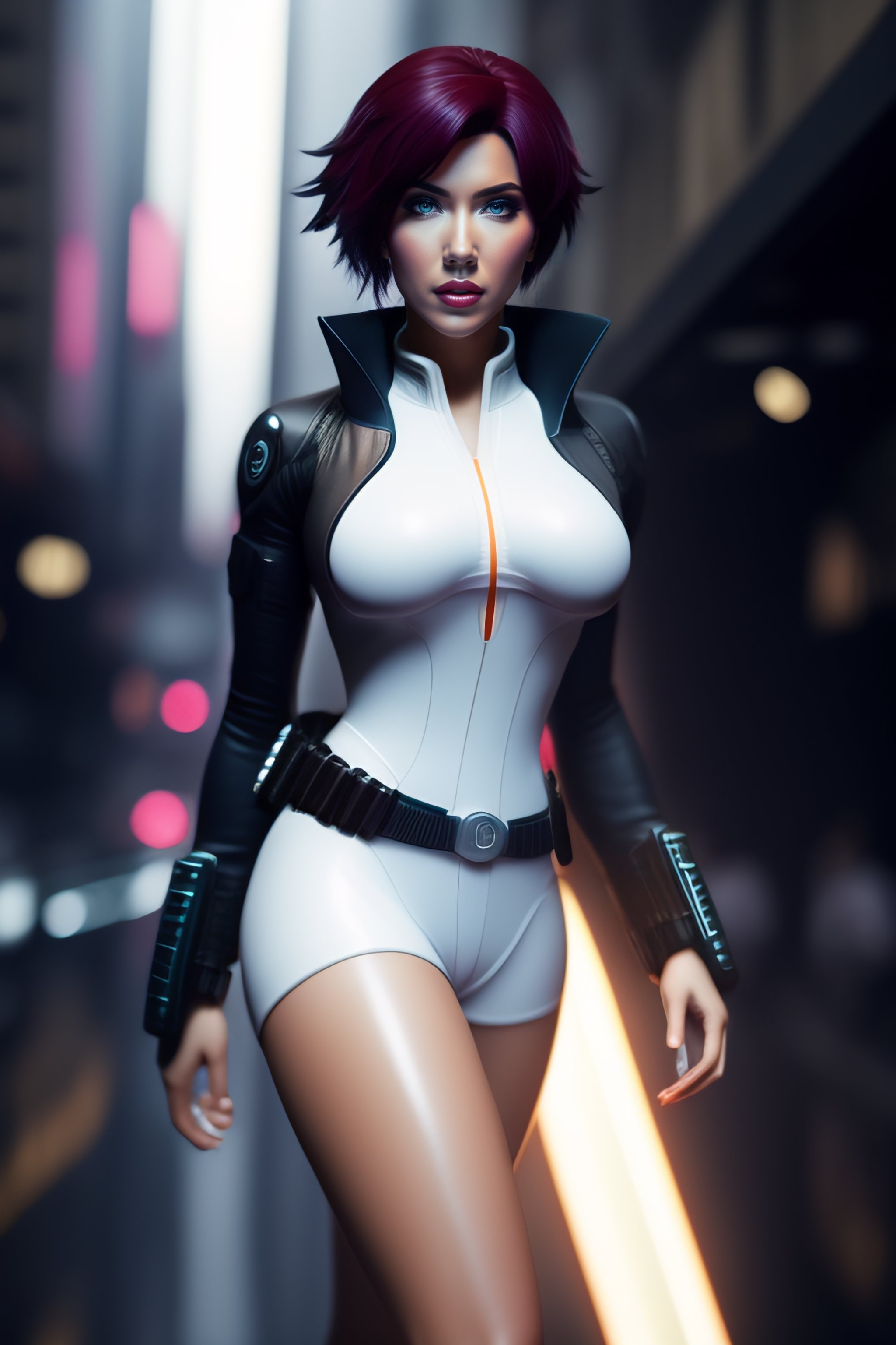 Full body shot, scarlett johansson as motoko kusanagi from ghost in the shell, white outfit, black hair, dynamic action pose, extremely detailed eyes, photography, dslr, exposure, 8k, super-resolution, volumetric lighting