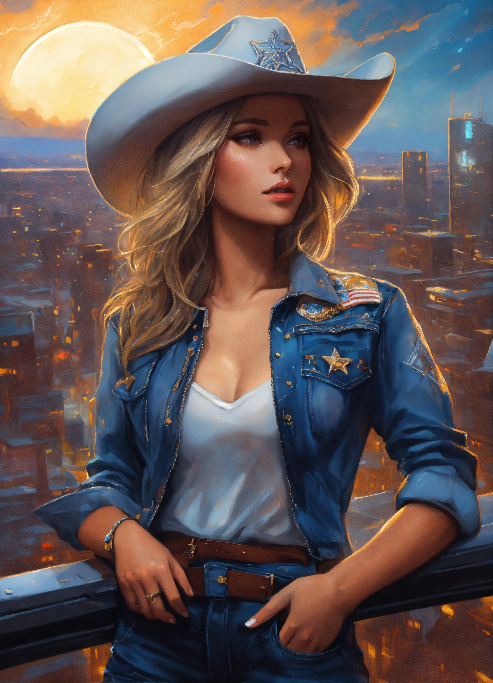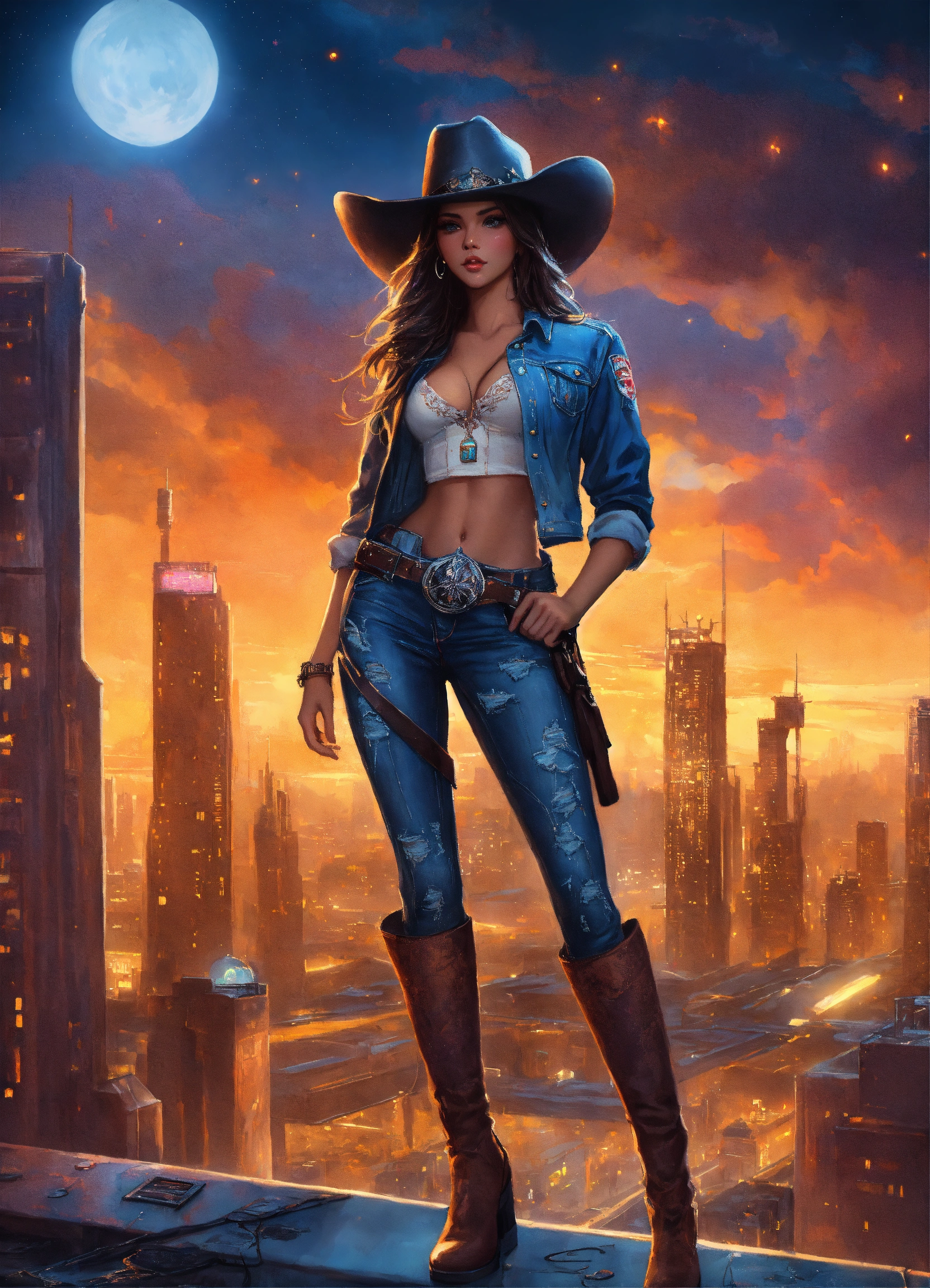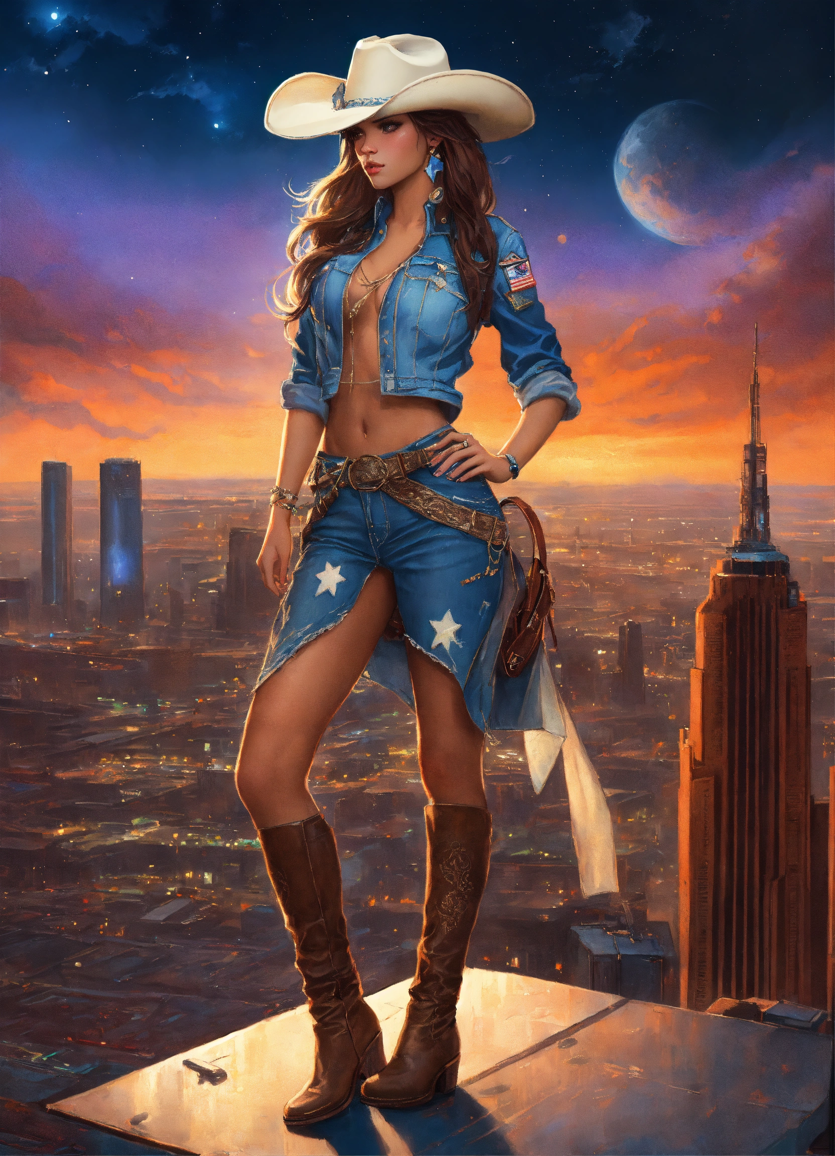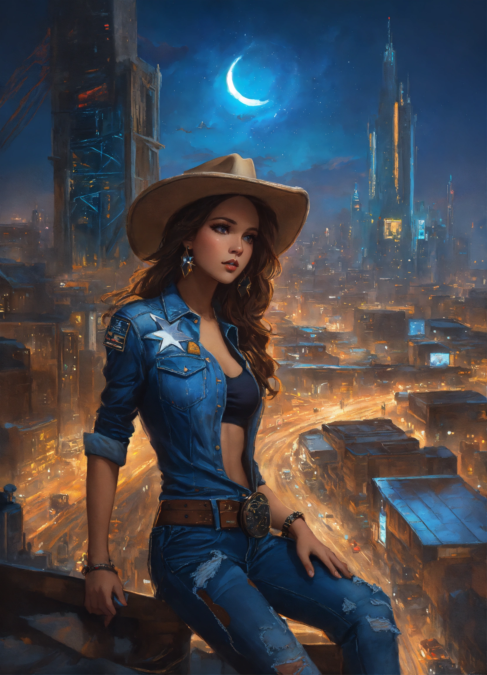 A southern beauty queen wearing a tattered denim cowgirl outfit and a cowboy hat. the scene is set in a futuristic cyberpunk cityscape, with the star-studded night sky behind the metropolis. the art style is oil on canvas. highly detailed and intricate, this piece is trending on artstation, reference artists for inspiration include artgerm, greg rutkowski, jiří barbacha