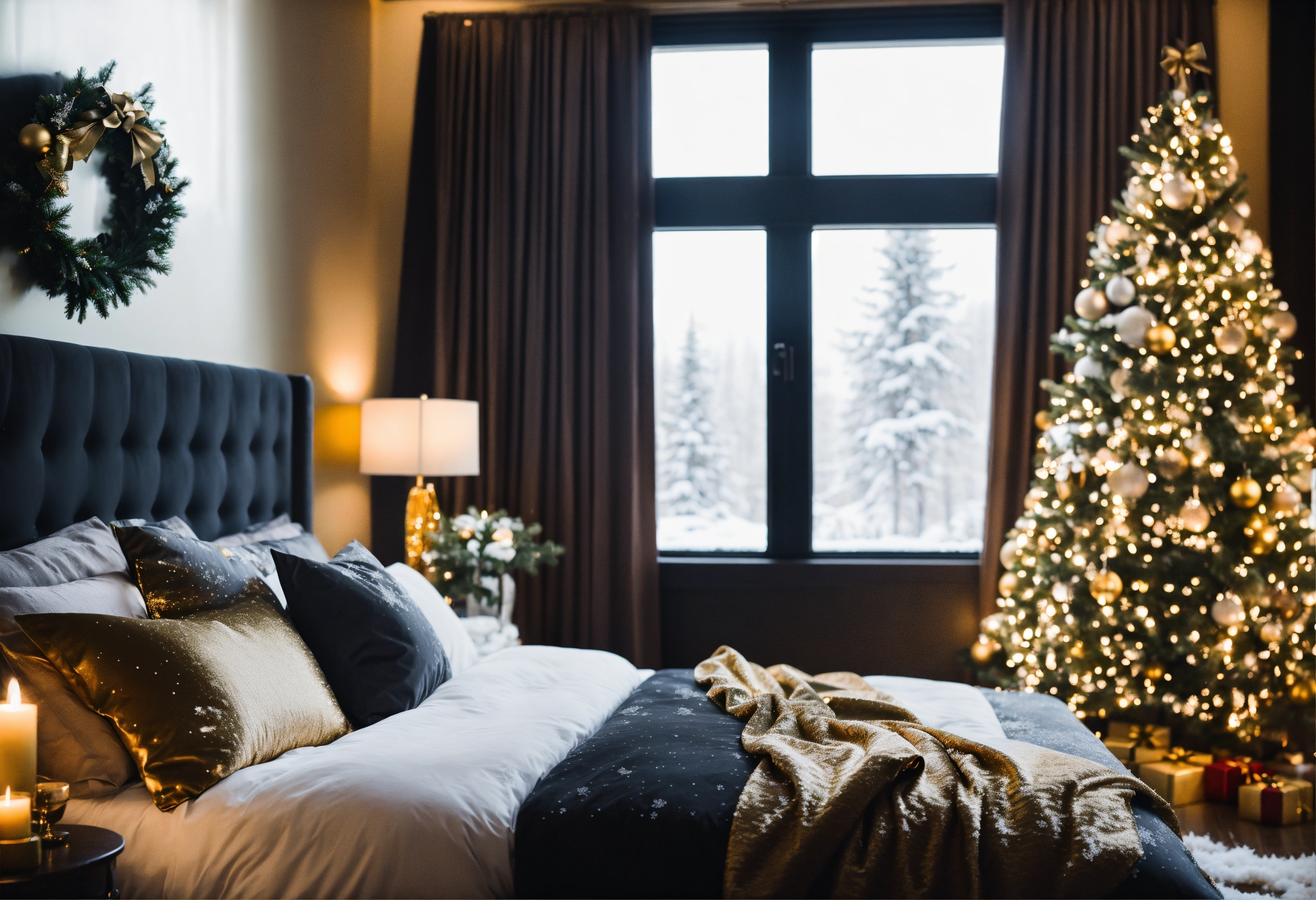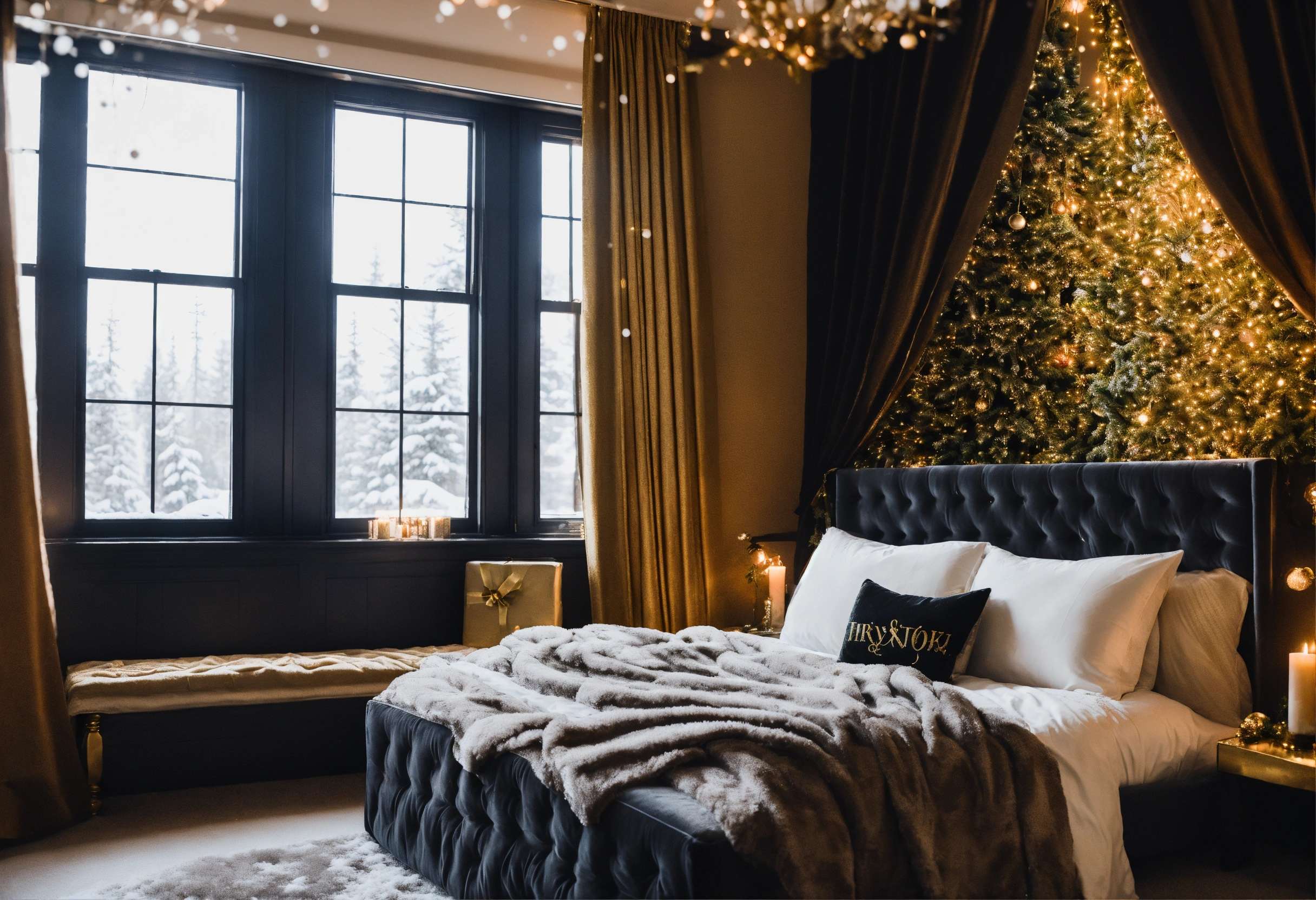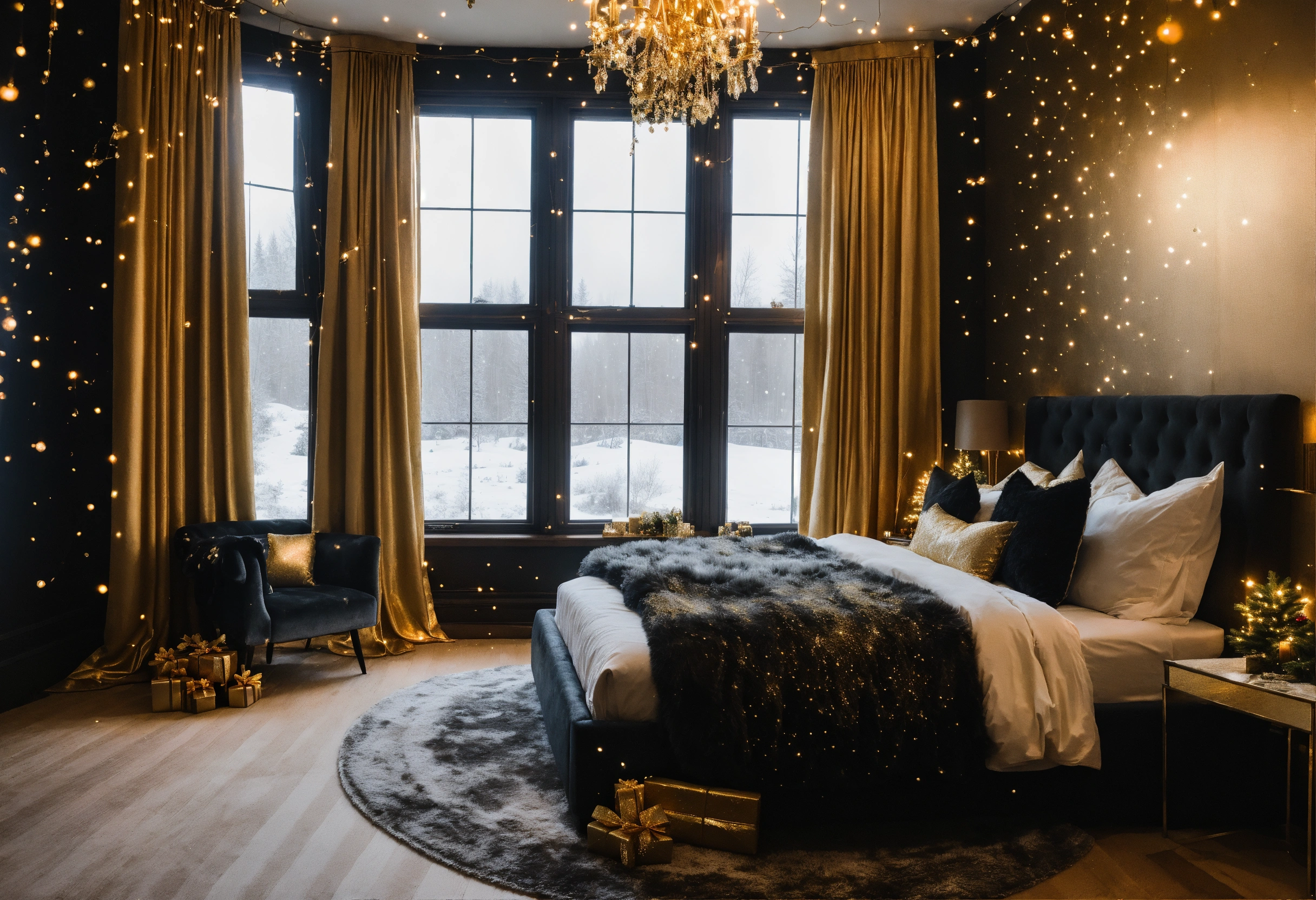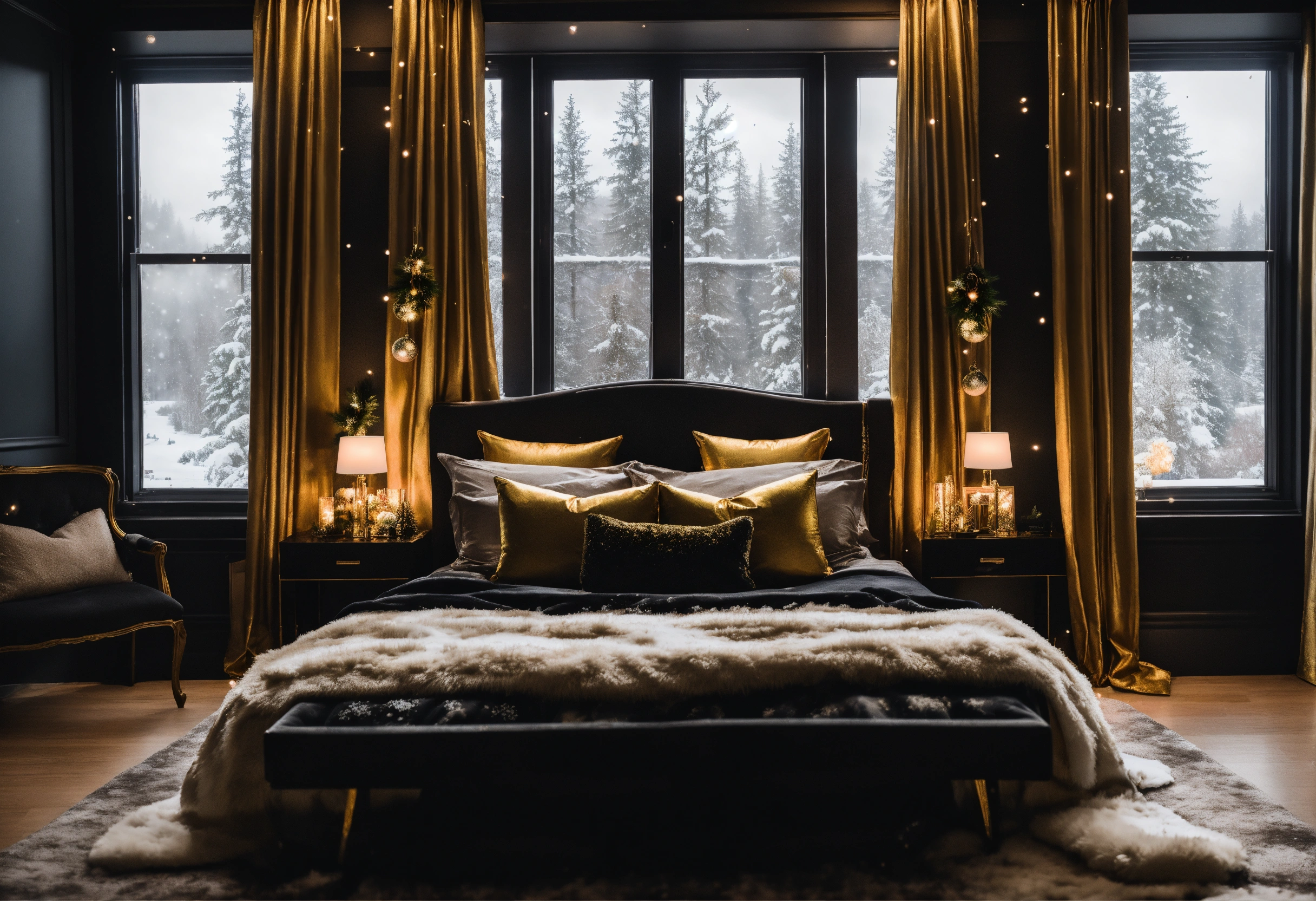 Beautiful christmas black and gold wedding bedroom facing facing forward, bed facing forward camera, window in the back with snow falling outside, close view, full image