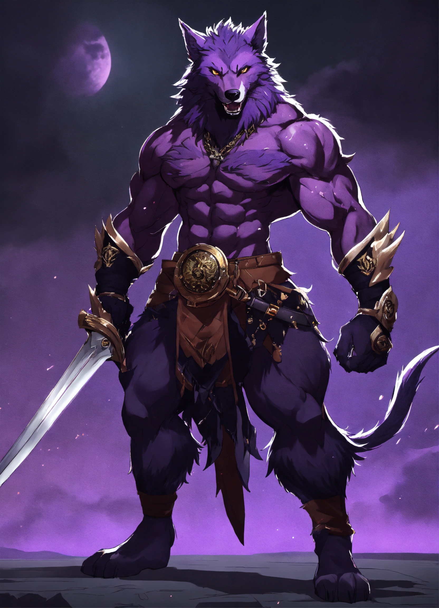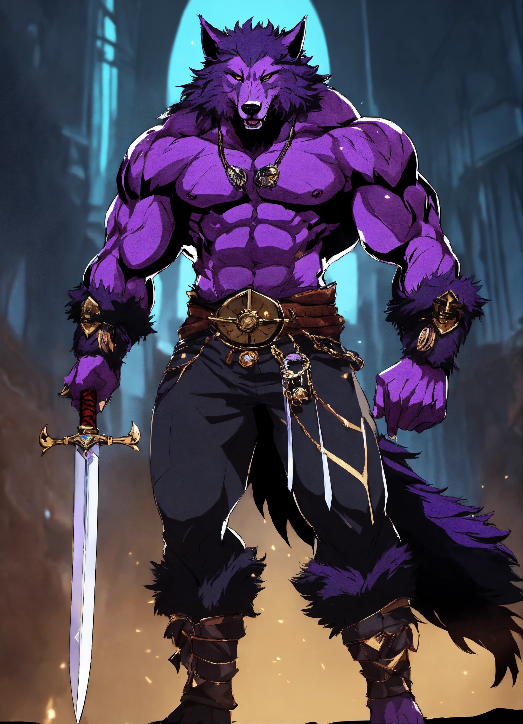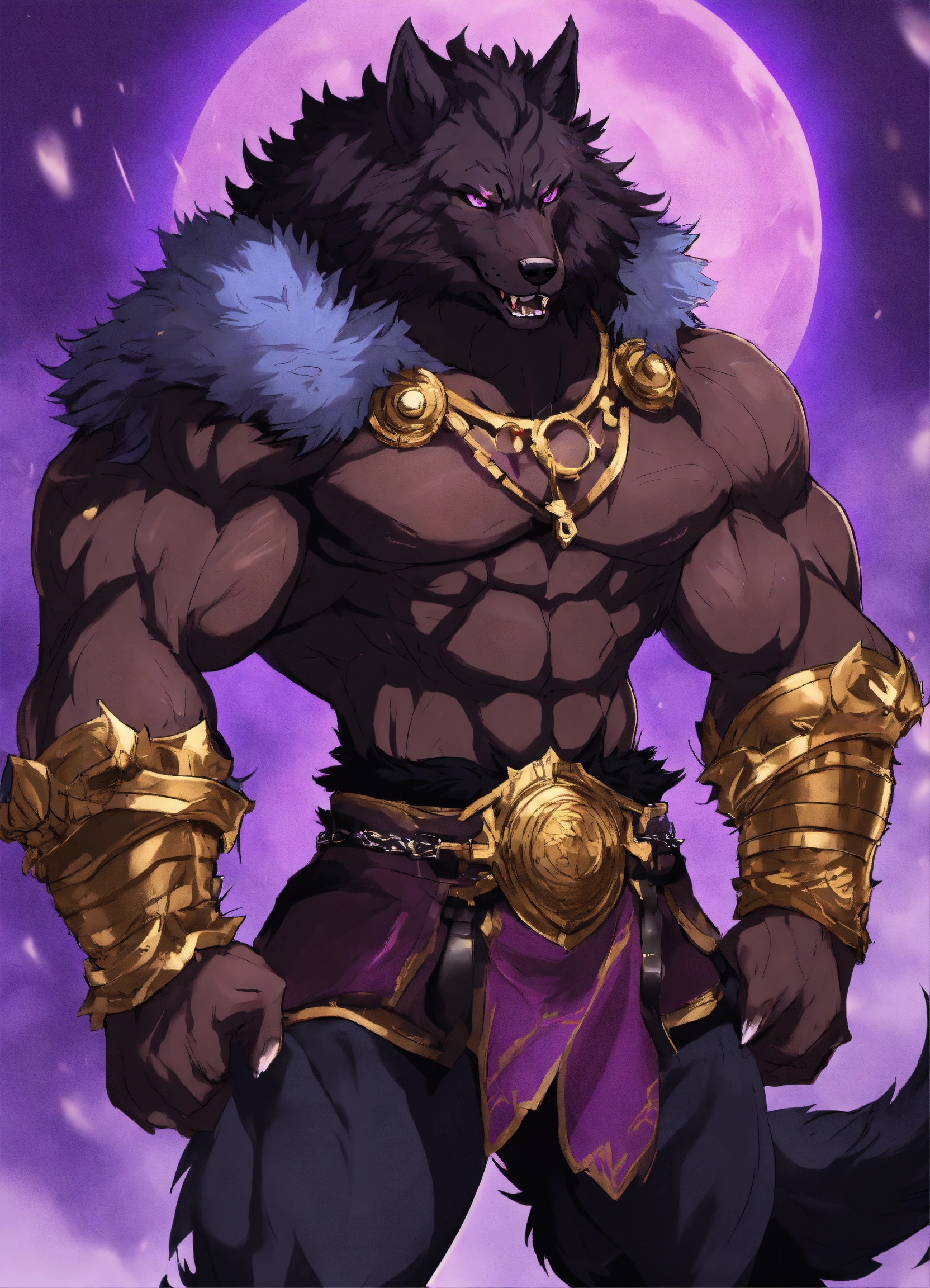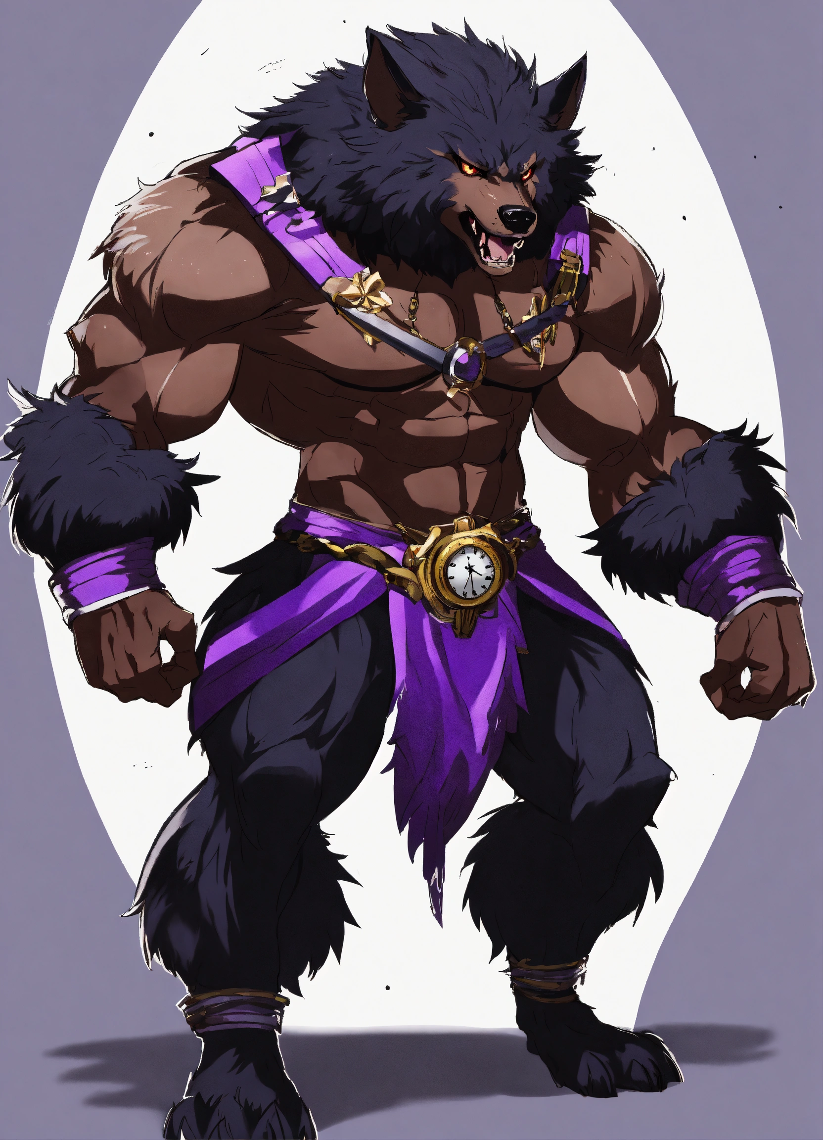 African werewolf anime character, muscular physique, which is styled in a wild black fur and untamed manner, he wears a black and purple clock, anime style, male, werewolf form, werewolf transformation fur in heavy armor with sword in each hand, dual swords