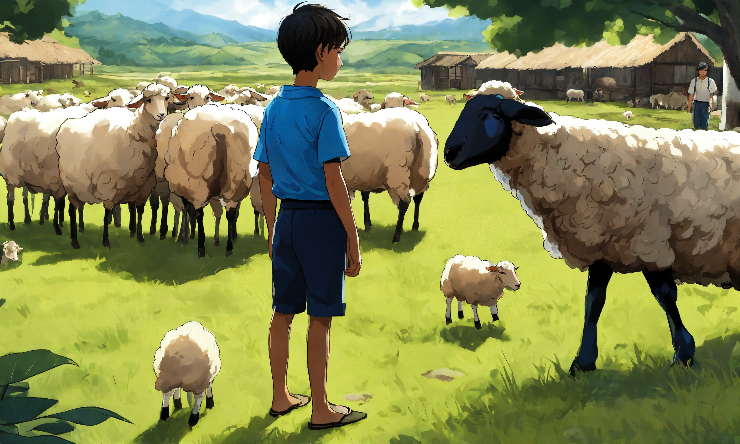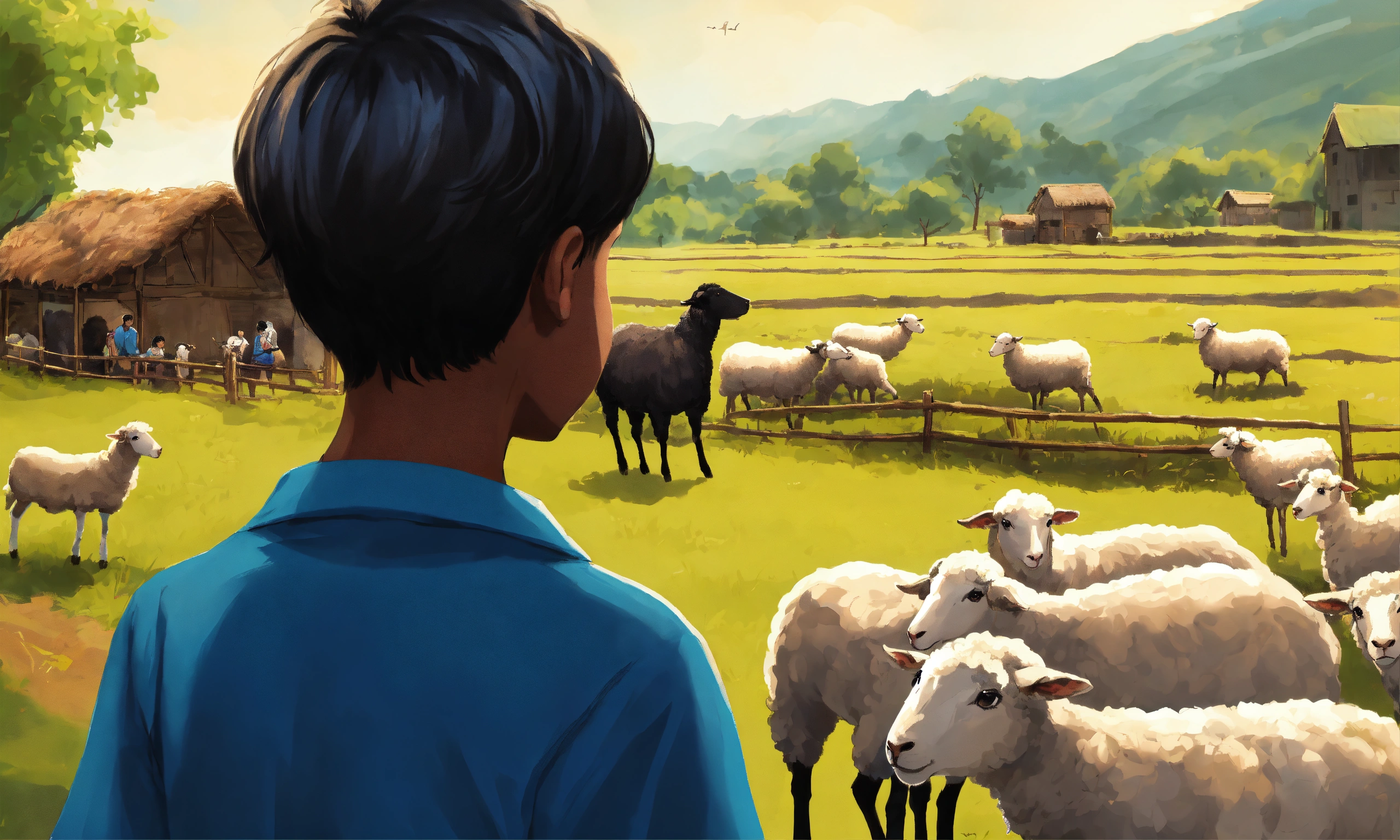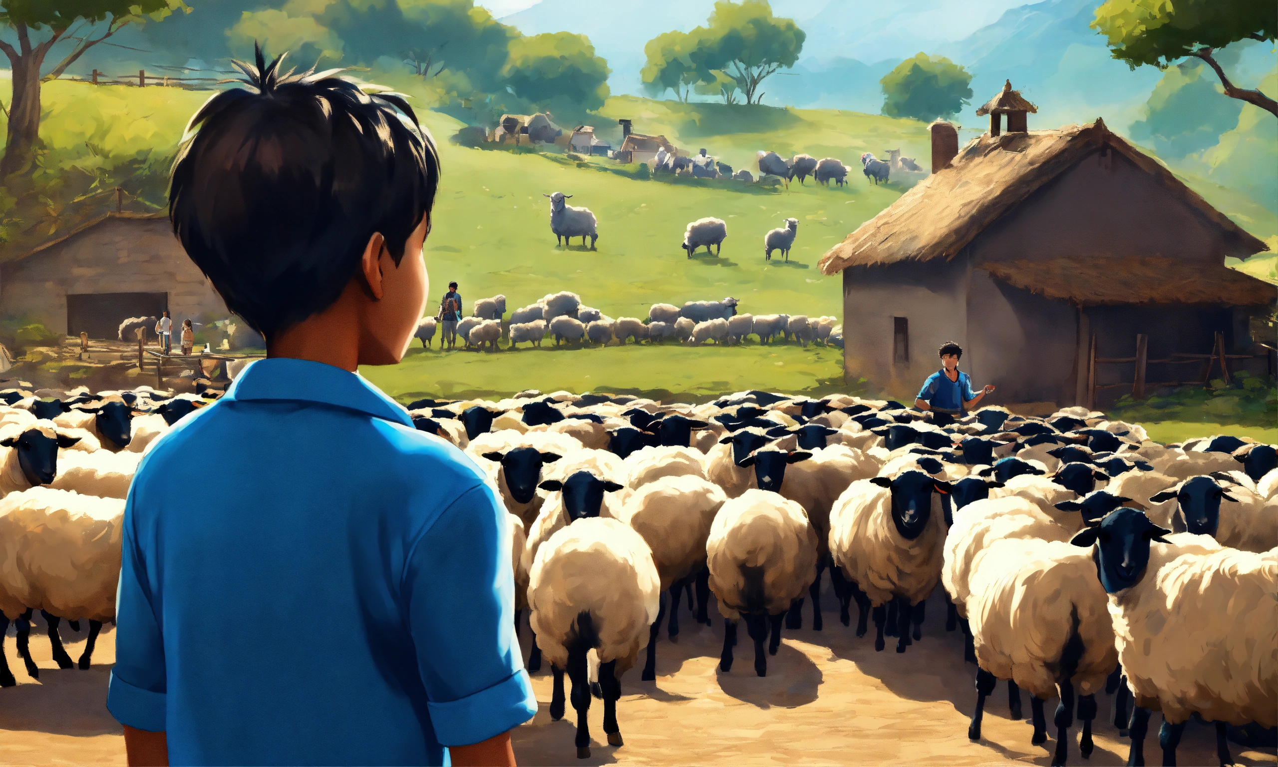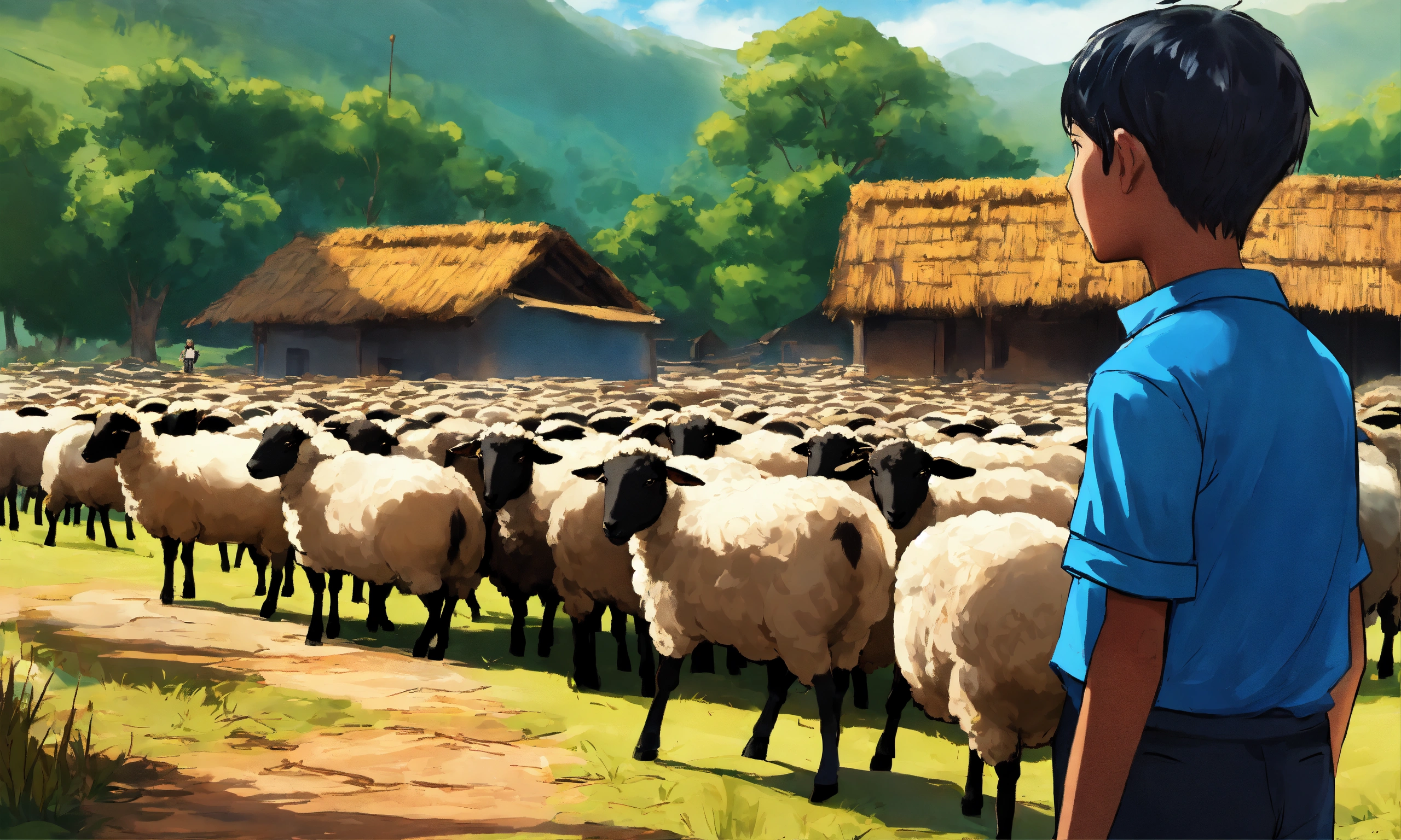 Very high detailed 2d illustration, closeup of a boy in blue shirt black half pant, talking to villagers while sheep's in background
