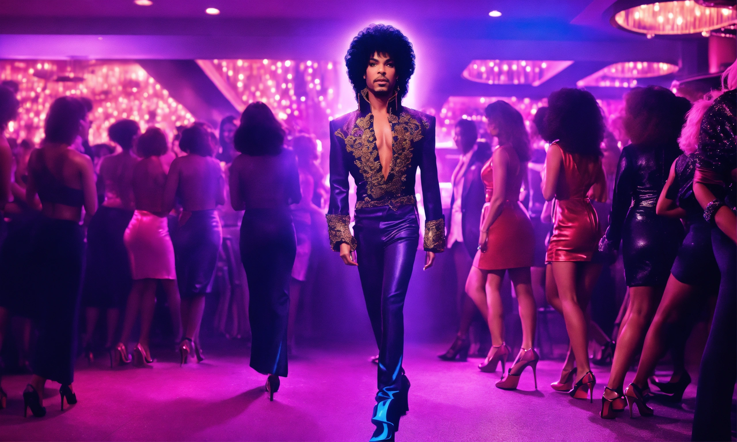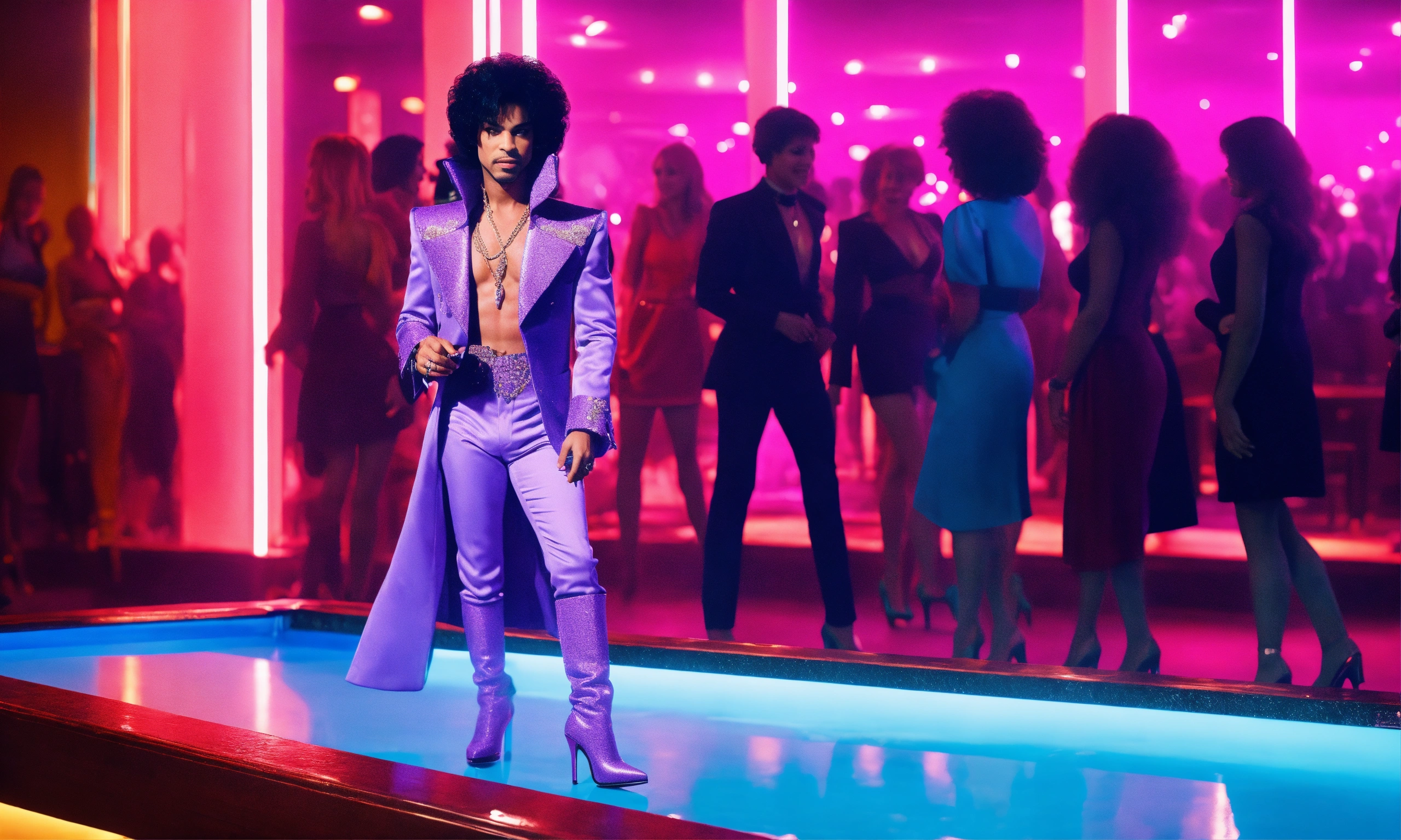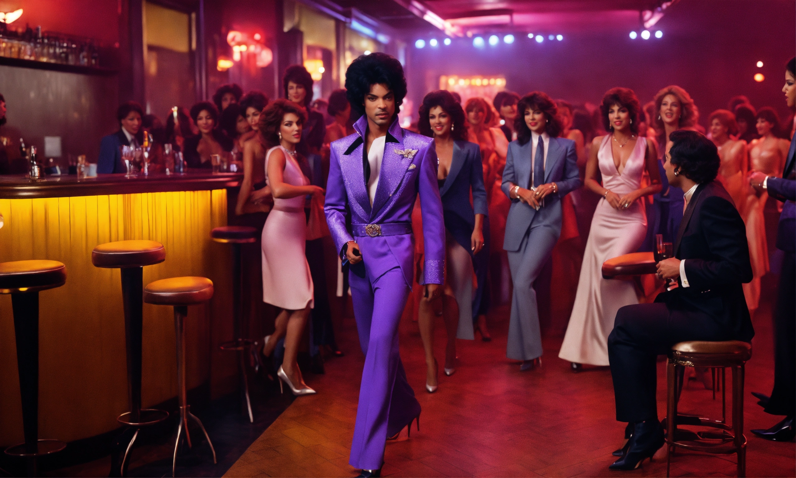 3d image of prince walking into a bar in purple high heels 👠in the 1980s surrounded by women who adore him 8k hyper realistic
