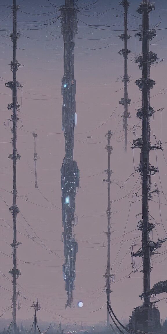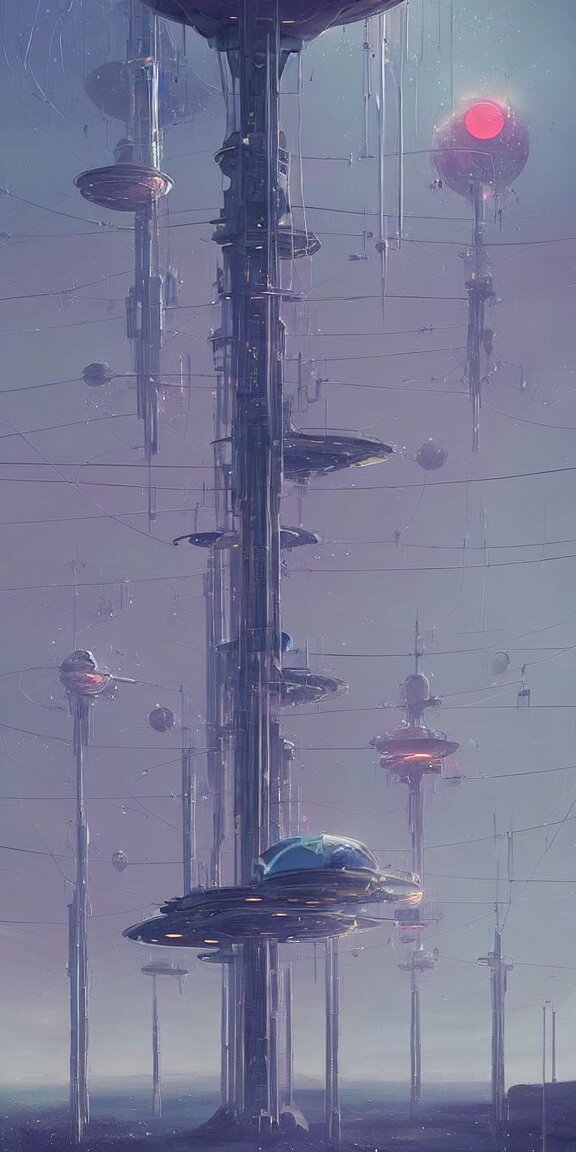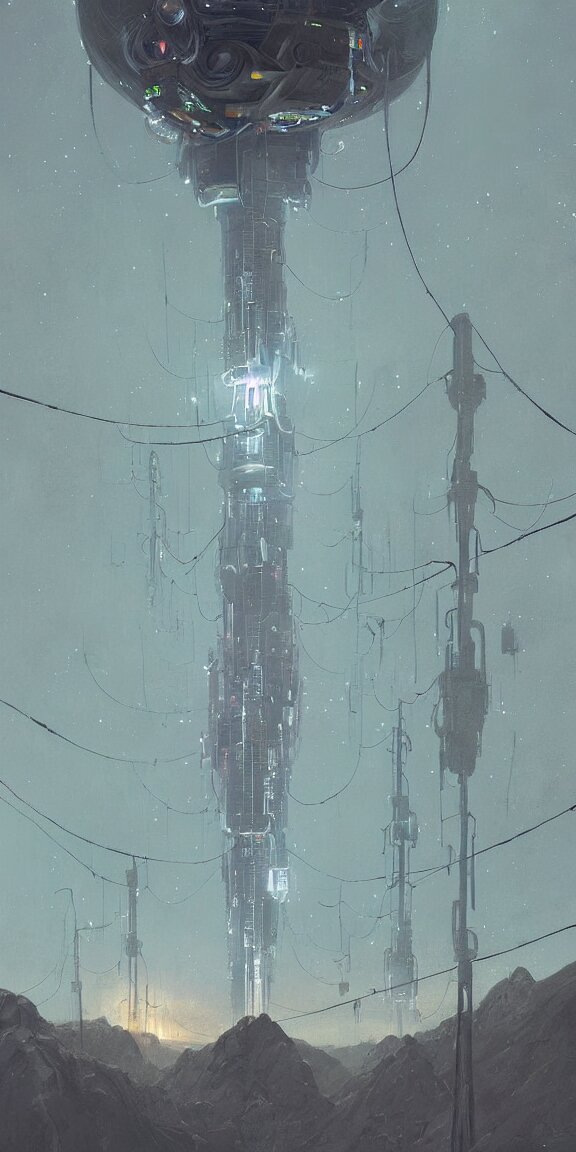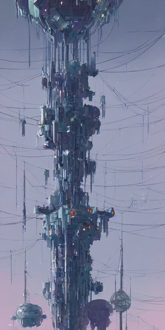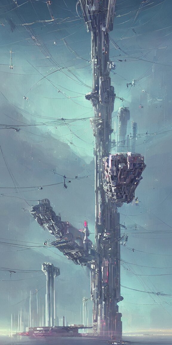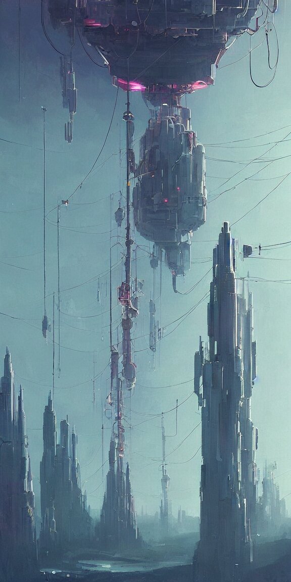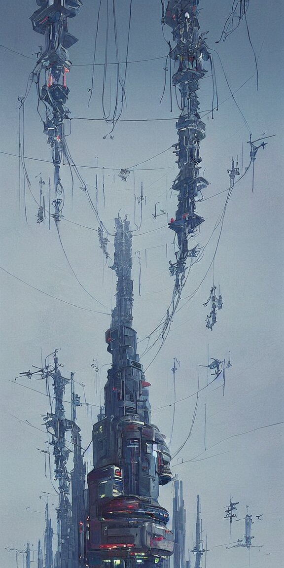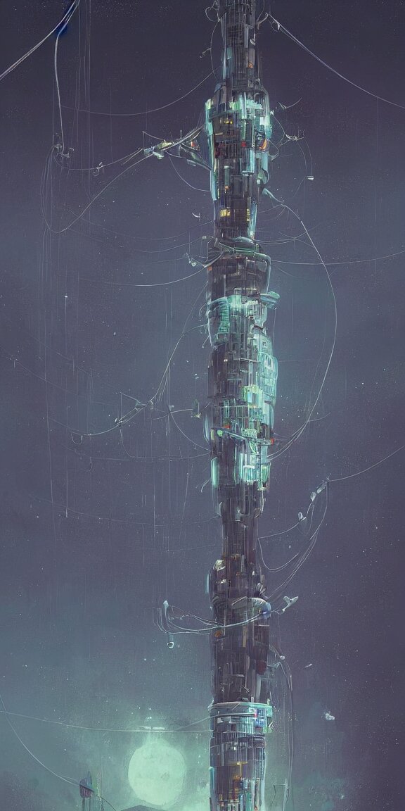 Tall space elevator with long tendrils, lots of hanging cables and antennas, sci - fi concept art, by john harris, by simon stalenhag, stunning, award winning
