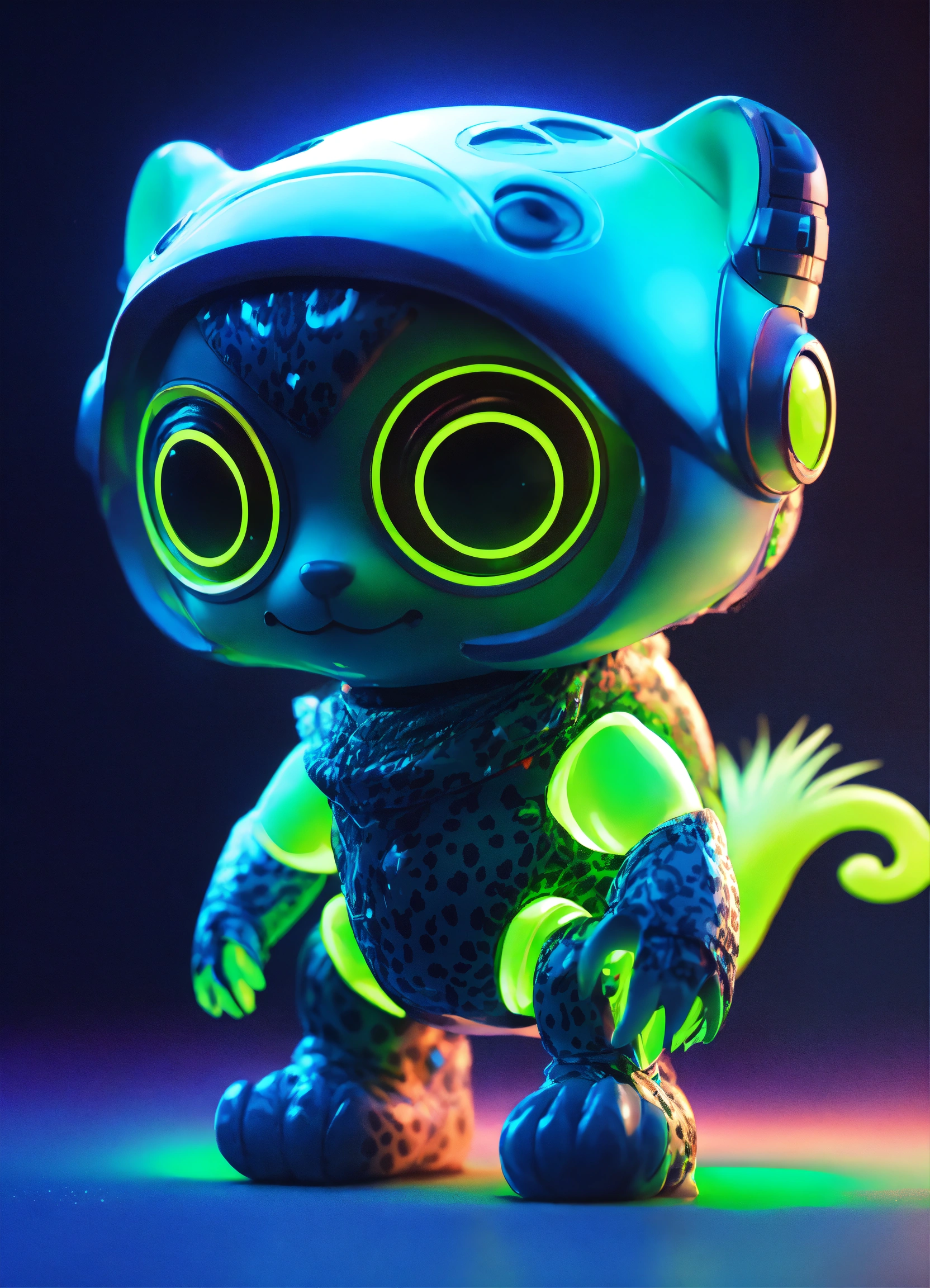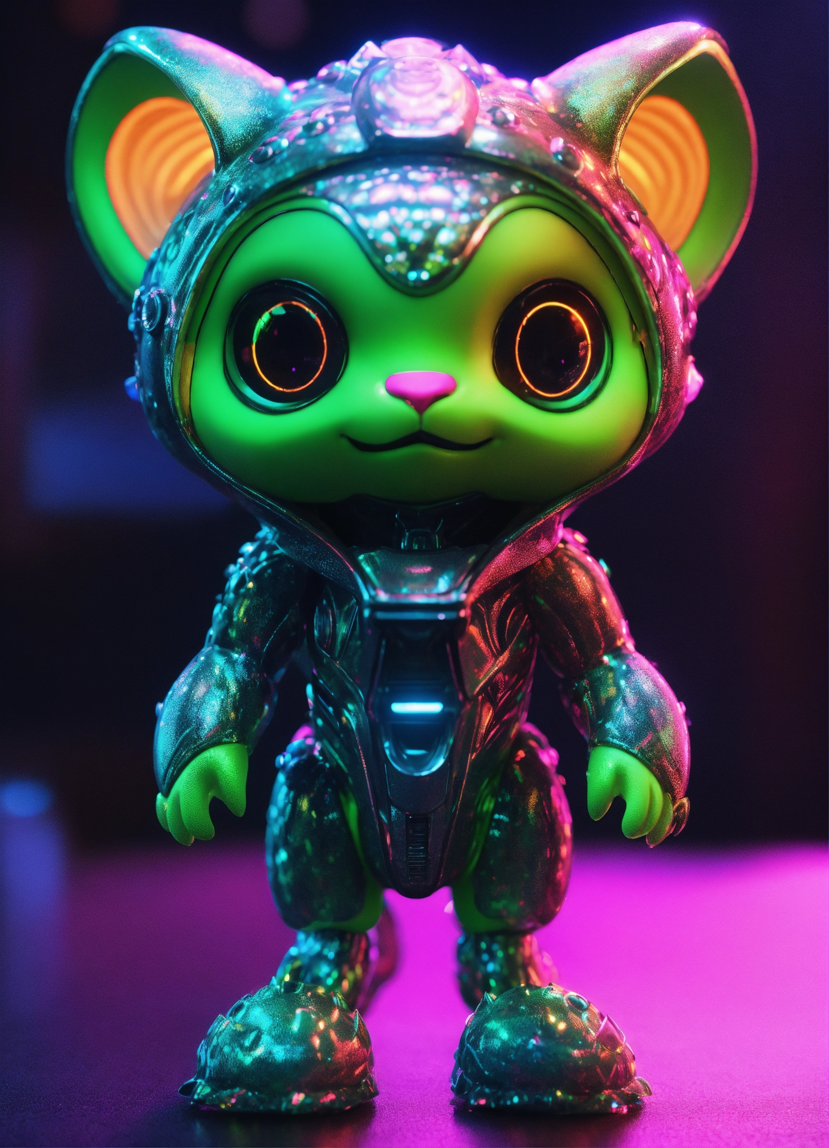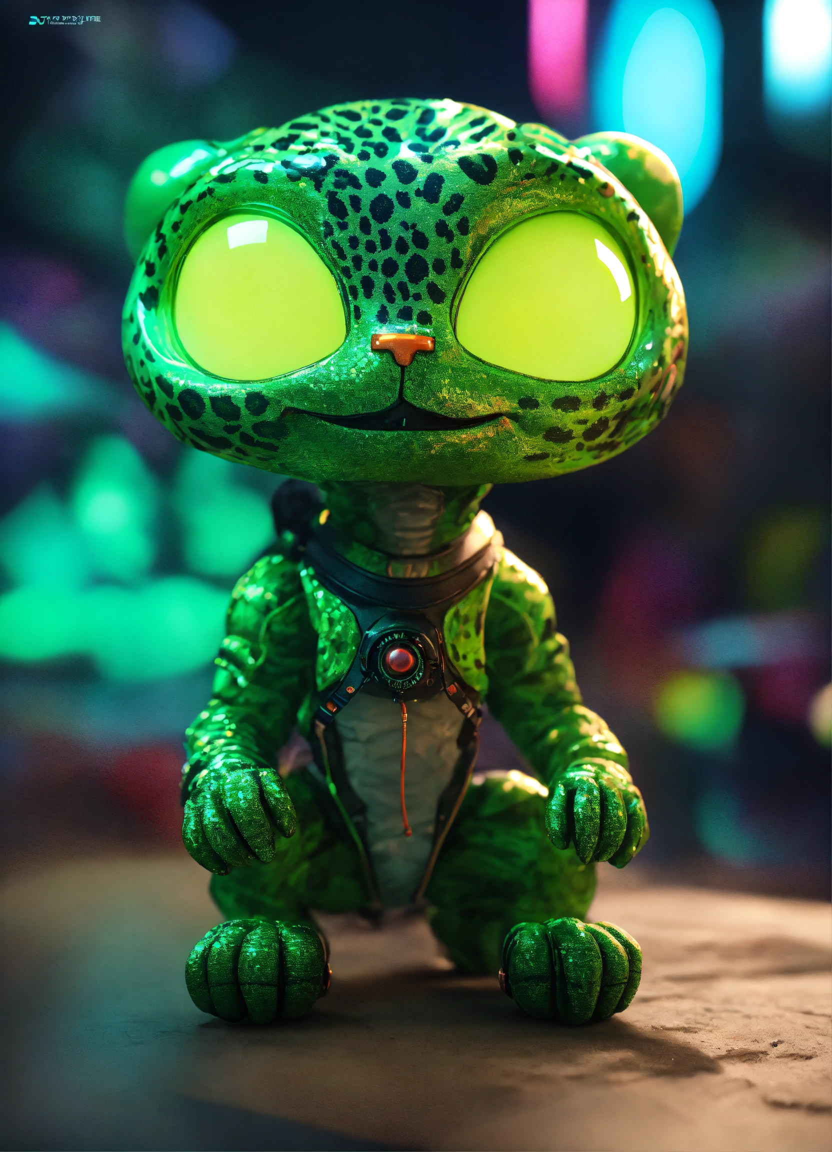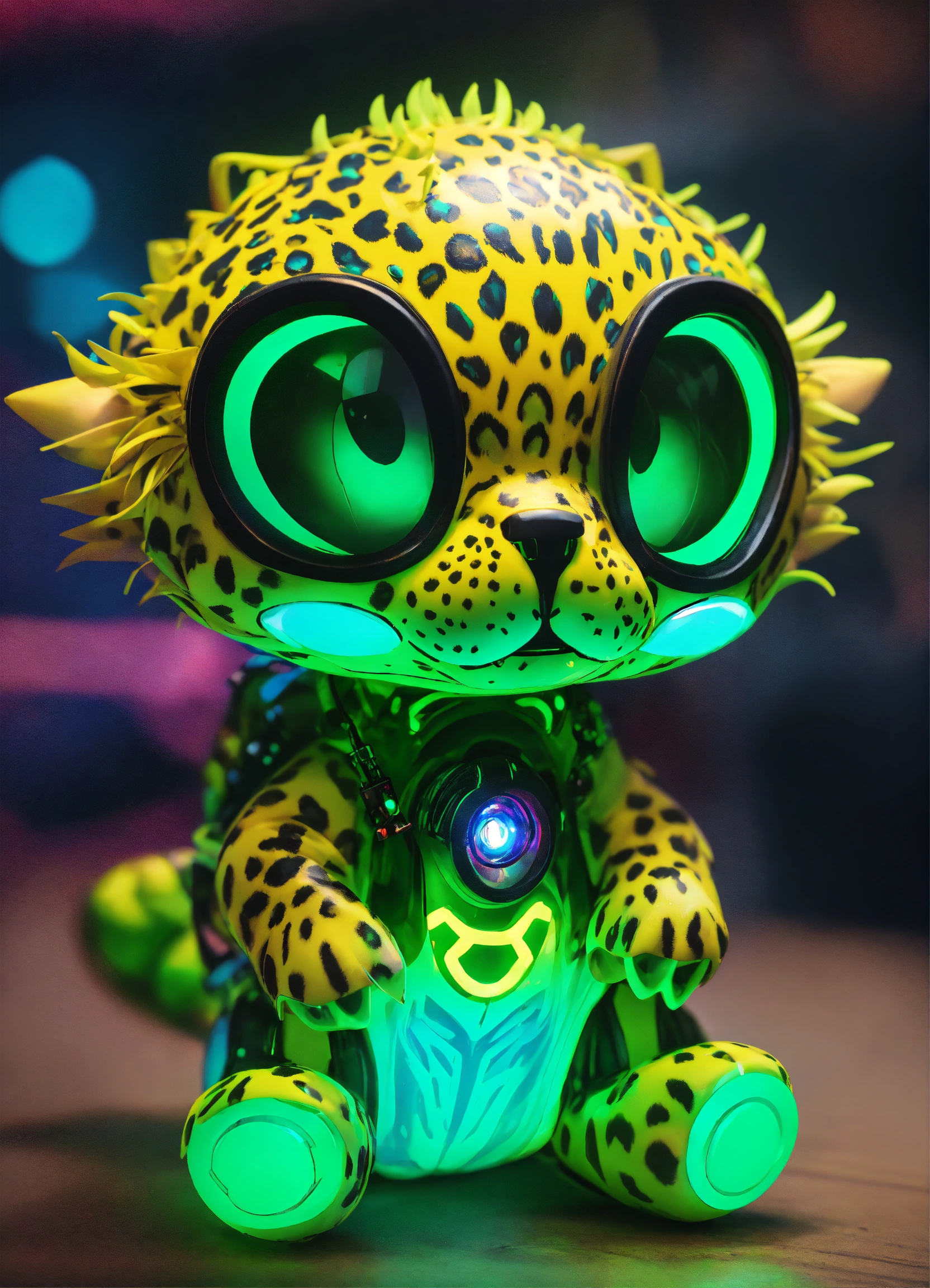 Gelly cute adorable alien monster, full-body, neon glow colors, highly intricate details, 3d, cgi, realistic light, trending on cgsociety, glowing eyes, facing camera, neon details, ultra realistic details, portrait, sci fi atmosphere, global illumination, shadows, octane render, 8 k, ultra sharp, cat attributes, smooth skin, friendly, luxury toy, green, leopard print