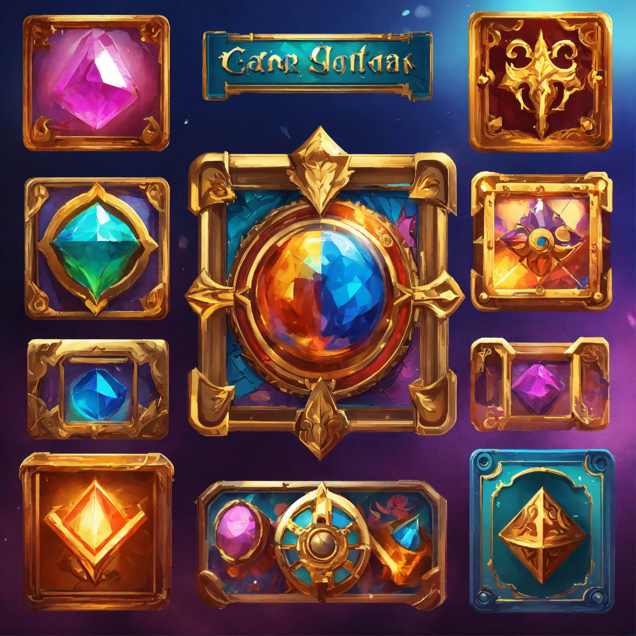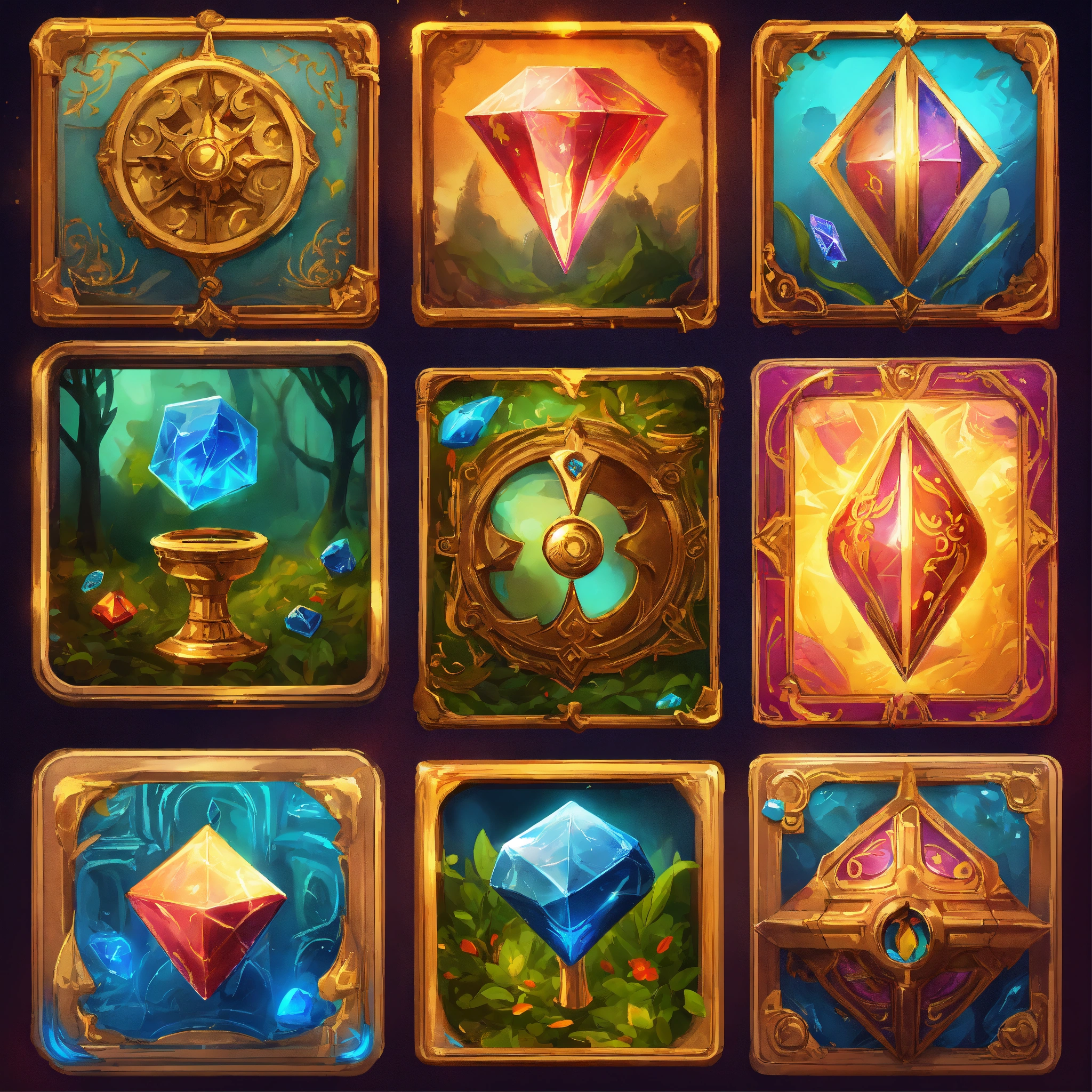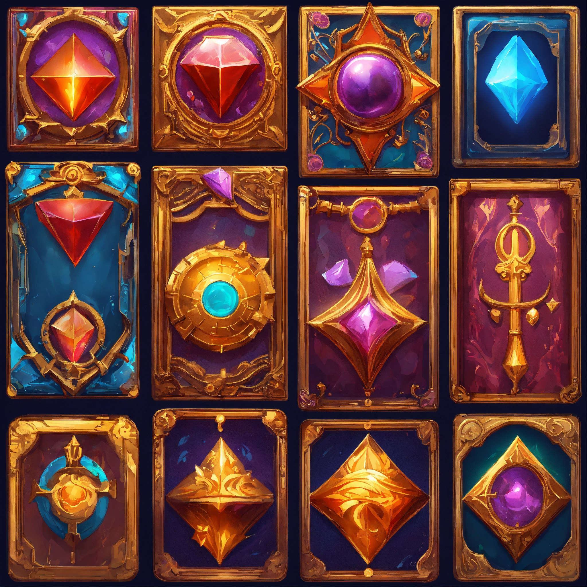 Fantasy theme, square frame slot game cards symbols, realistic illustration style, sharp focus, bright color, digital paint design, trending on artstation, high details, simple lines, art by artgem