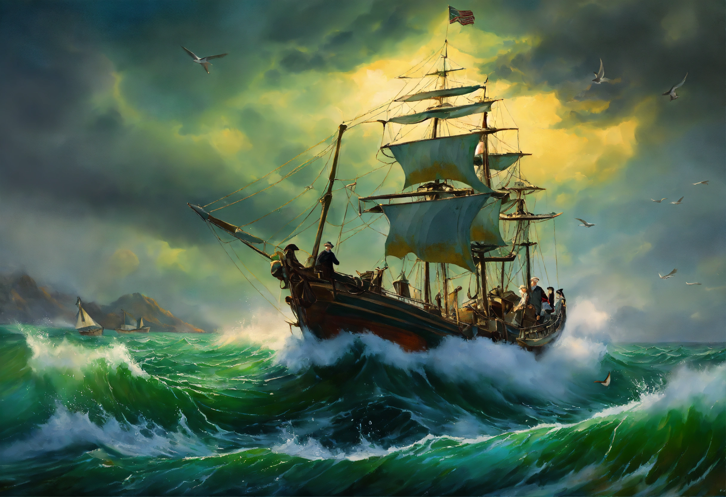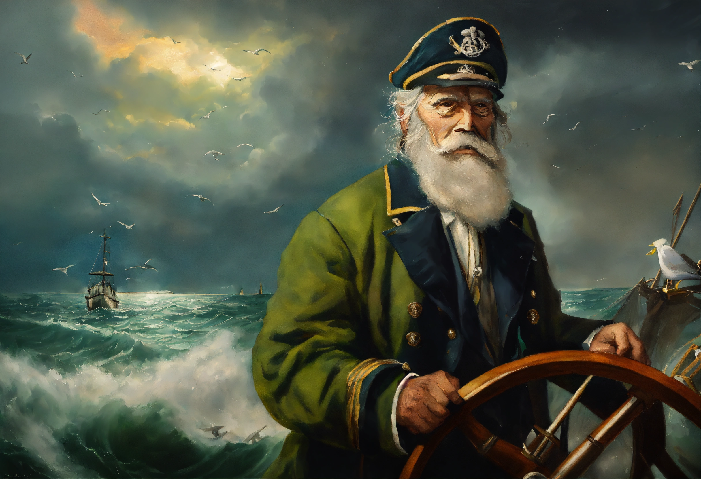 A detailed oil painting of an ((((old sea captain, steering his ship)))) through a storm. saltwater is splashing against his weathered face, determination in his eyes. twirling malevolent clouds are seen above and stern waves threaten to submerge the ship while seagulls dive and twirl through the chaotic landscape. thunder and lights embark in the distance, illuminating the scene with an eerie green glow.