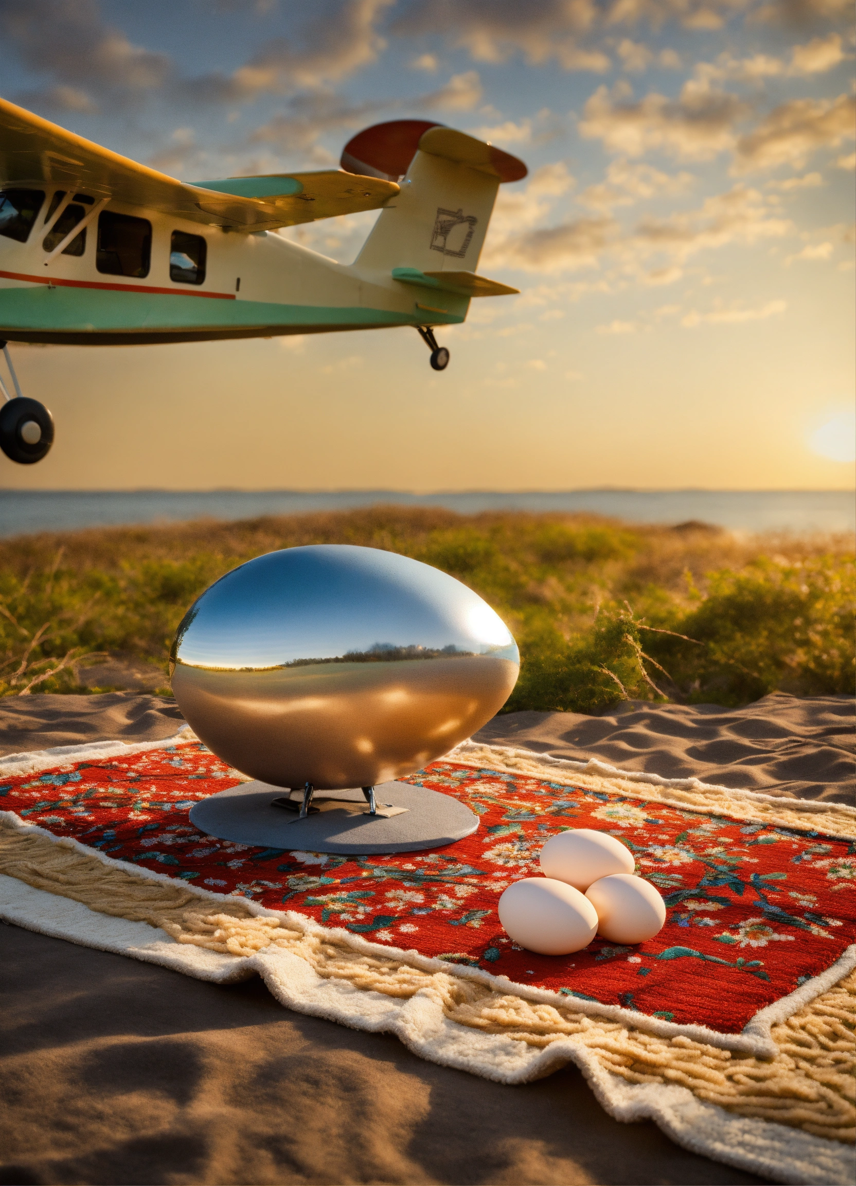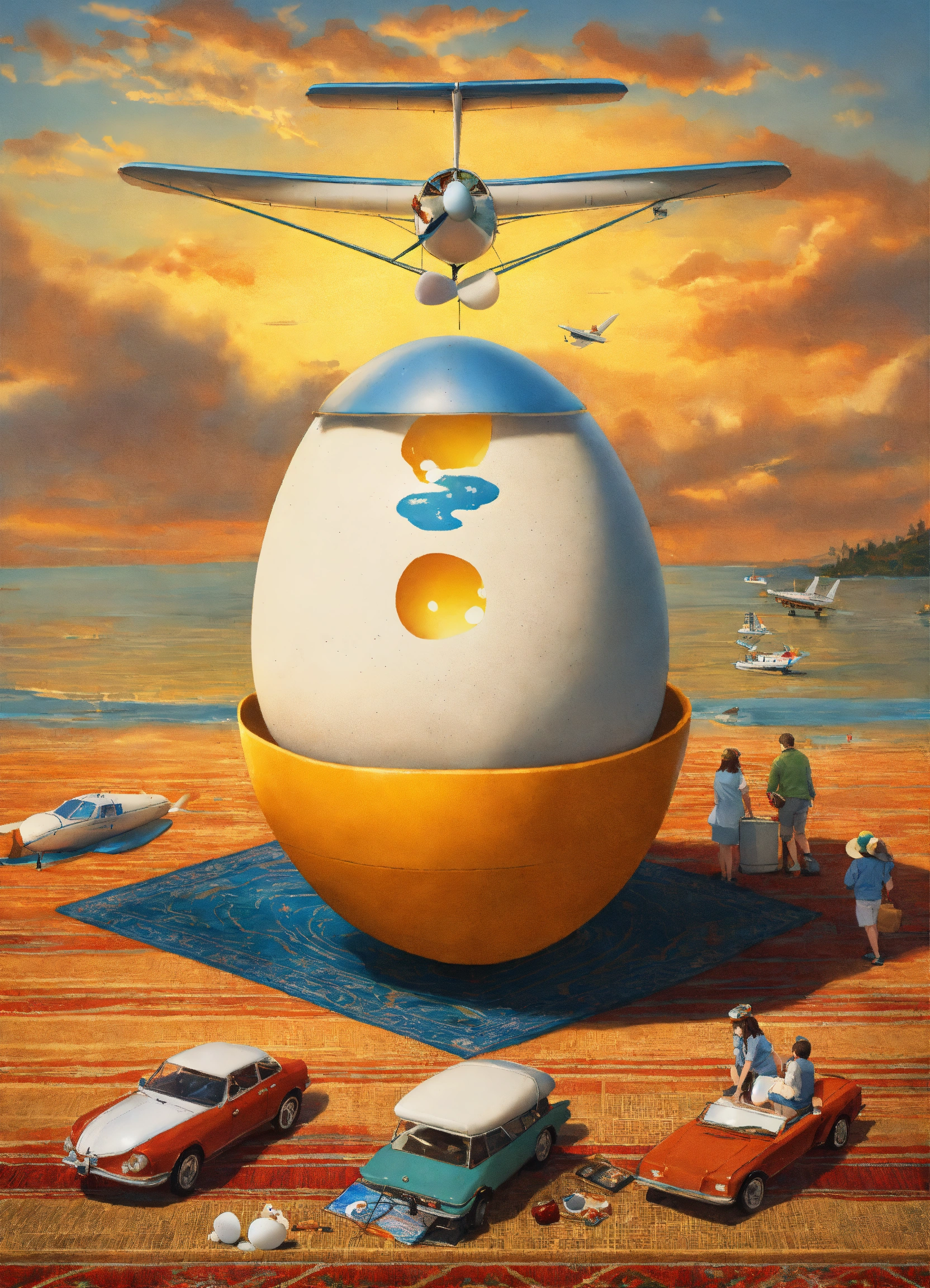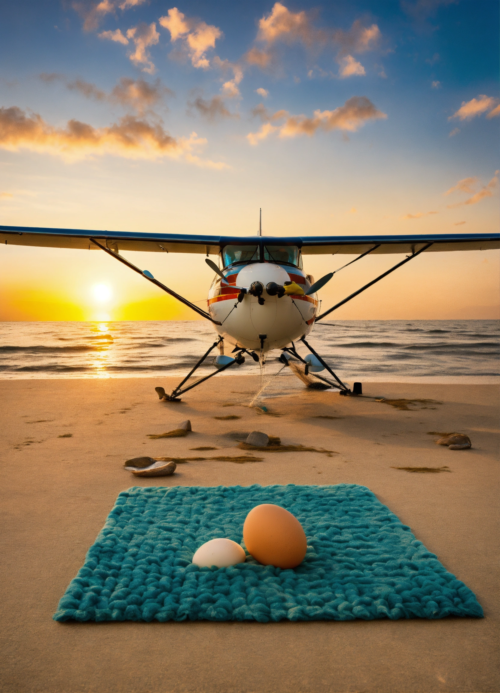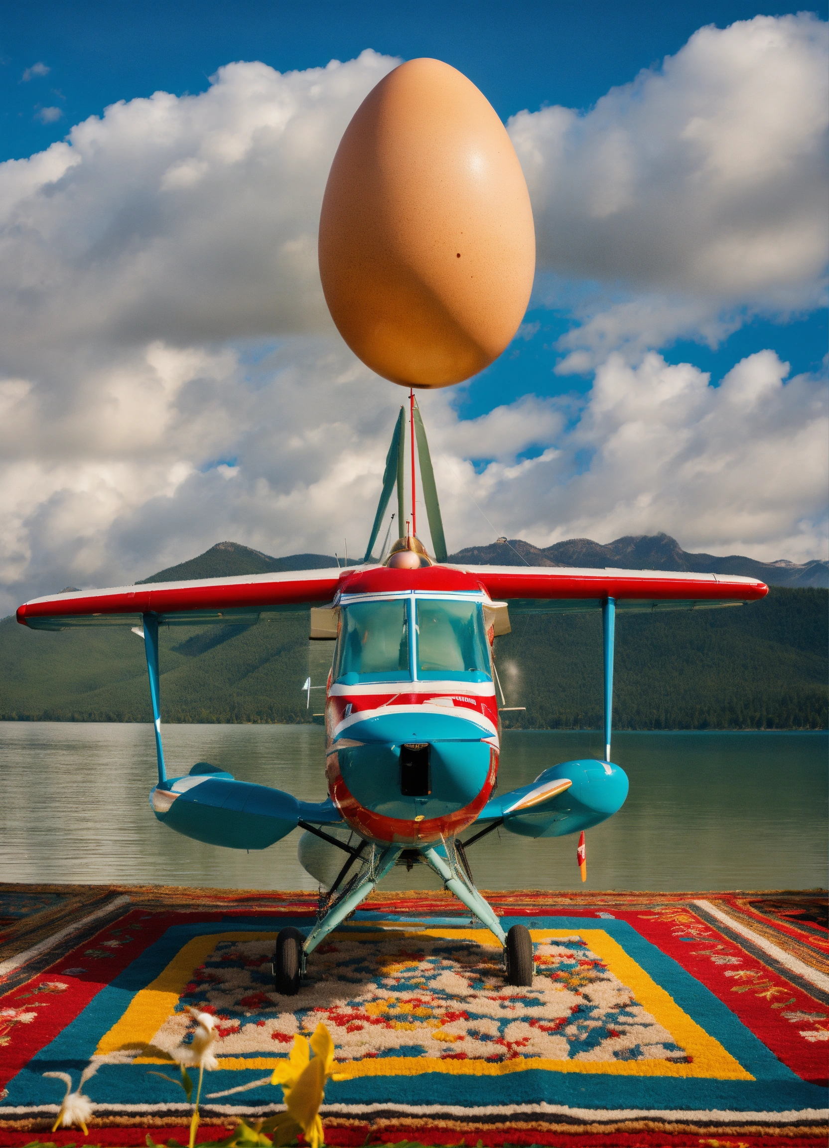 Egg hatching a seaplane on top of a rug