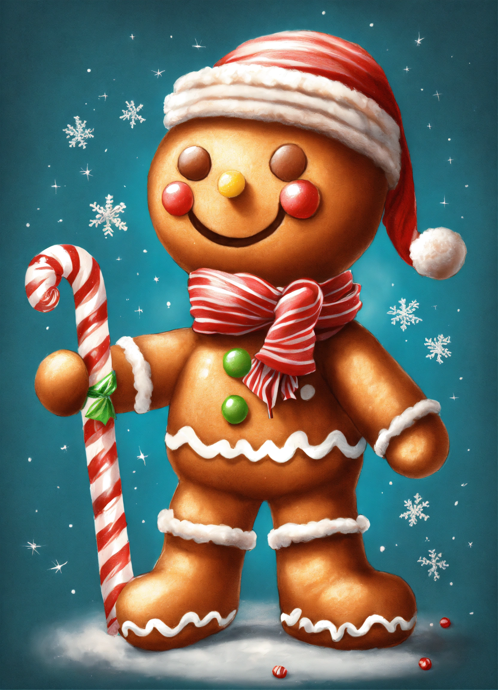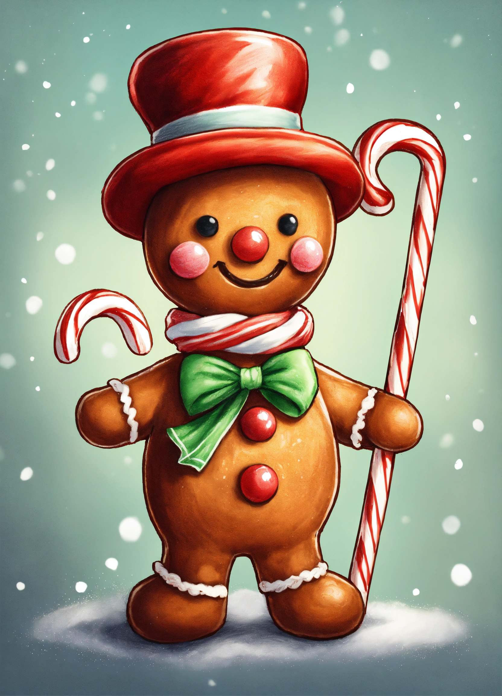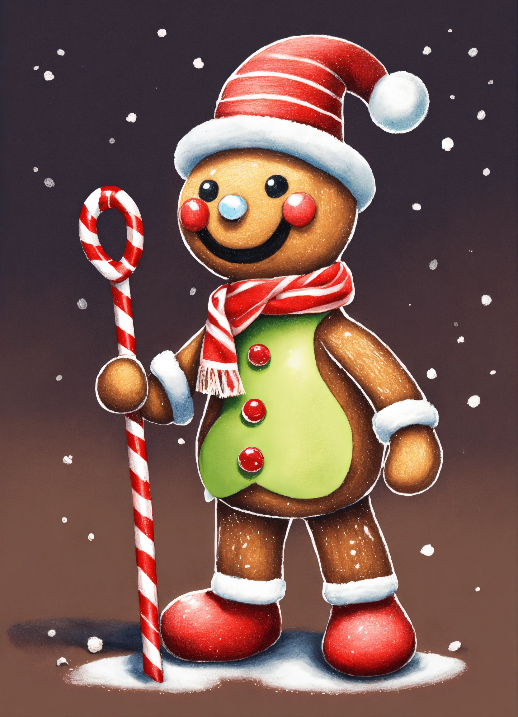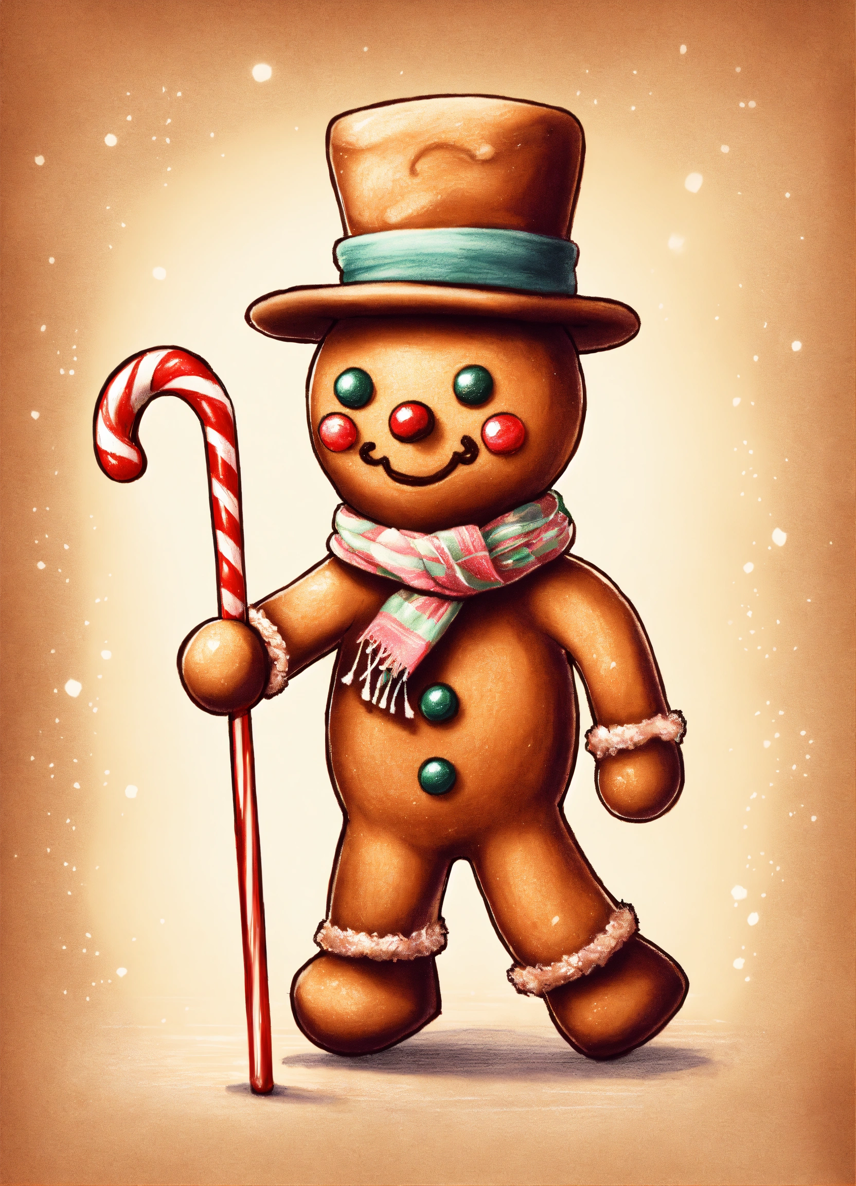 Illustration pencil drawing of a super cute gingerbread man wearing a hat and scarf and using a candy cane as a walking stick