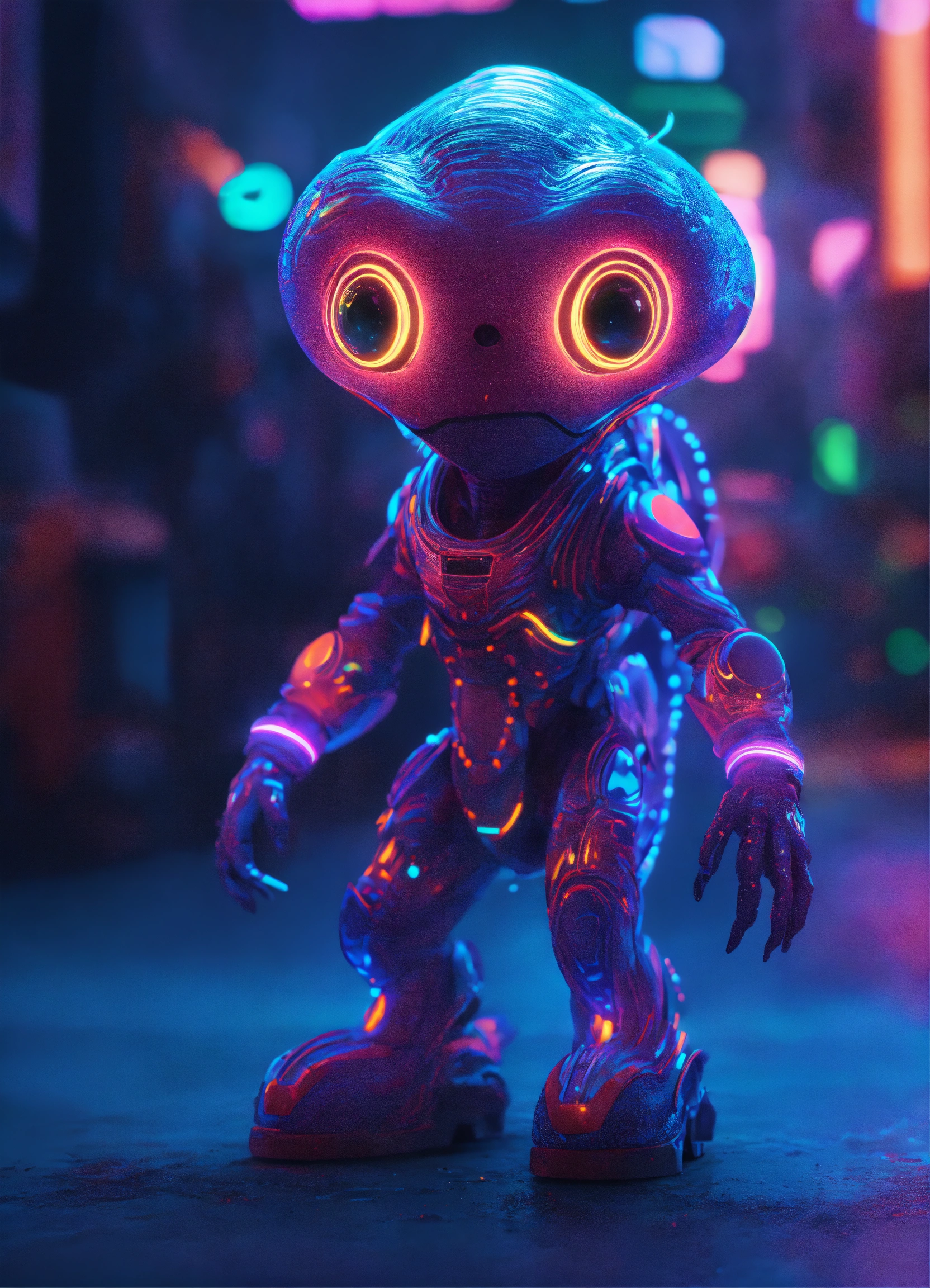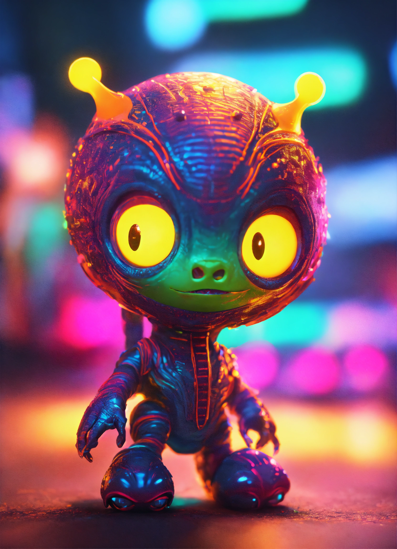 Gelly cute alien monster, full-body, neon glow colors, highly intricate details, 3d, cgi, realistic light, trending on cgsociety, glowing eyes, facing camera, neon details, ultra realistic details, portrait, sci fi atmosphere, global illumination, shadows, octane render, 8 k, ultra sharp