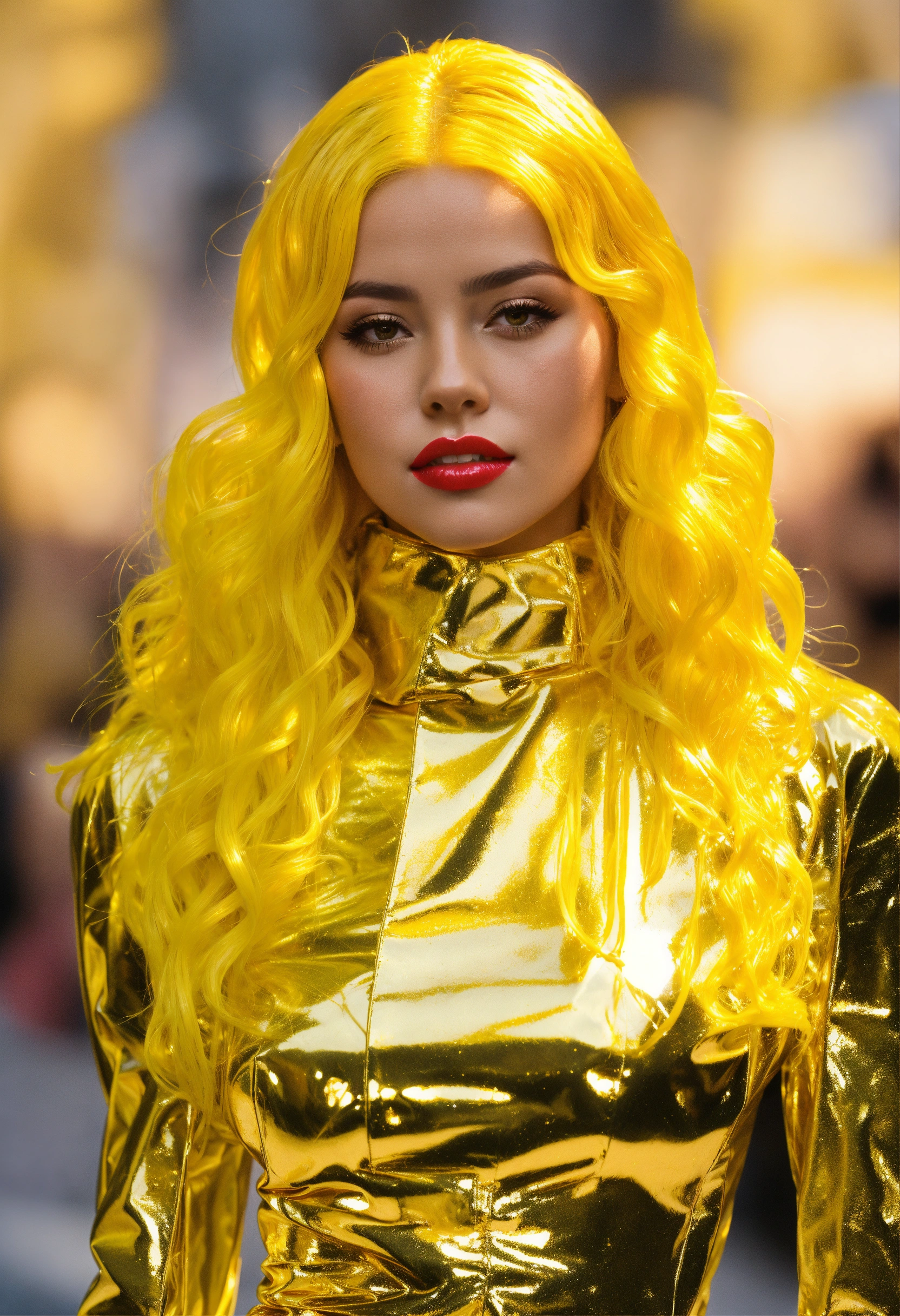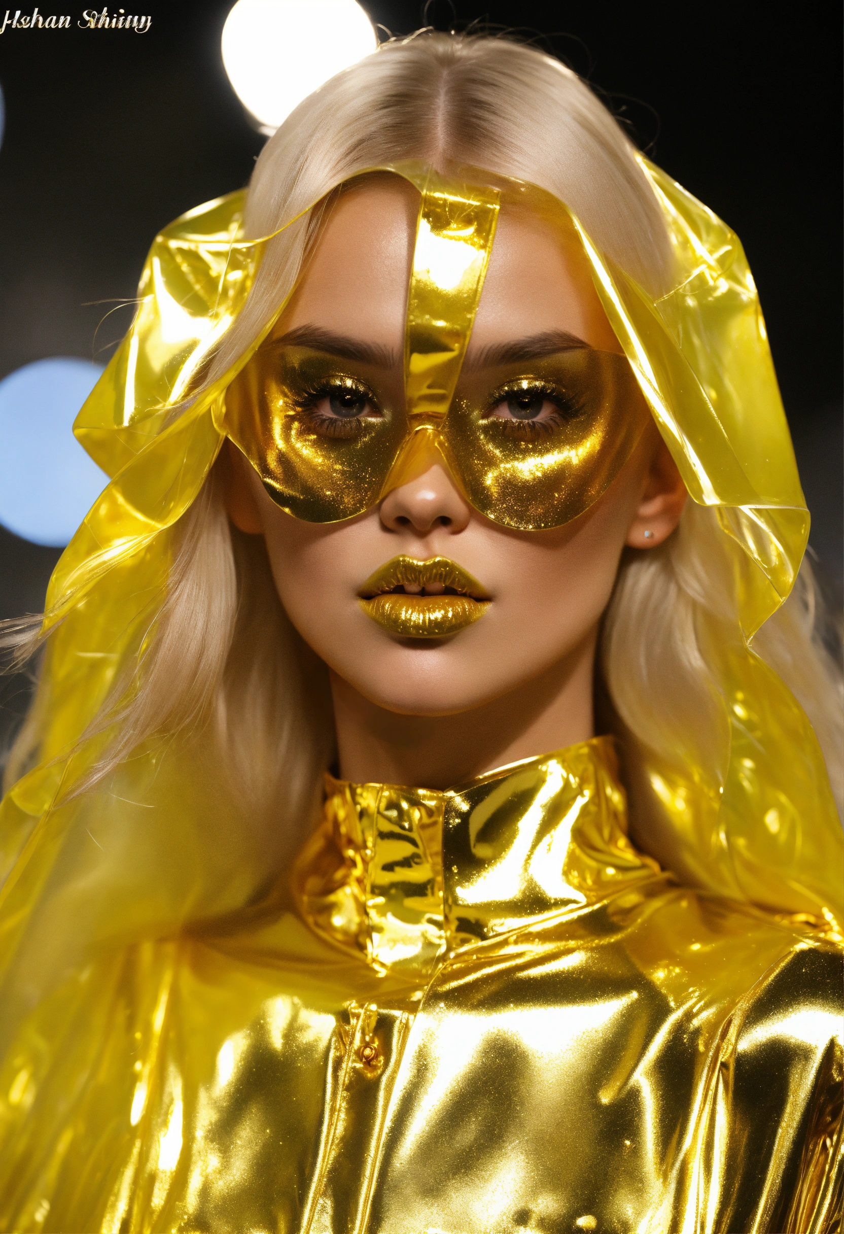 Clear bright shiny clear plastic outfit, bright shiny plastic hair, bright shiny plastic gold lips, bright shiny plastic gold hair, bright shiny plastic gold lips, bright shiny plastic face, bright shiny plastic gold lips, bright shiny plastic face