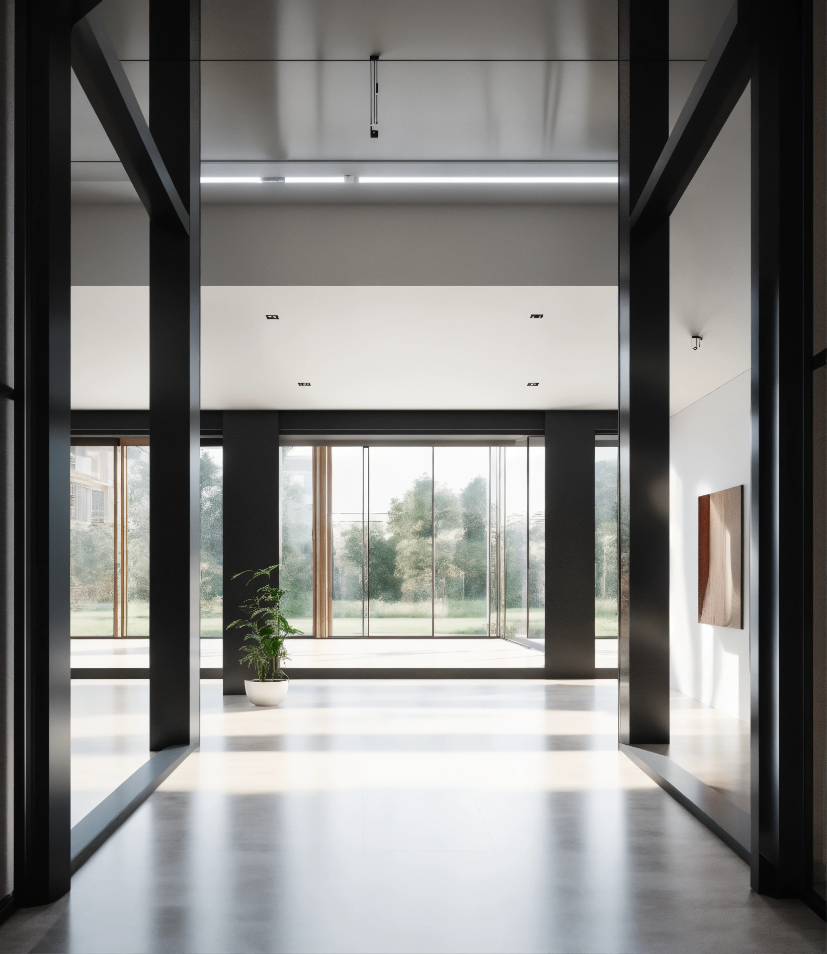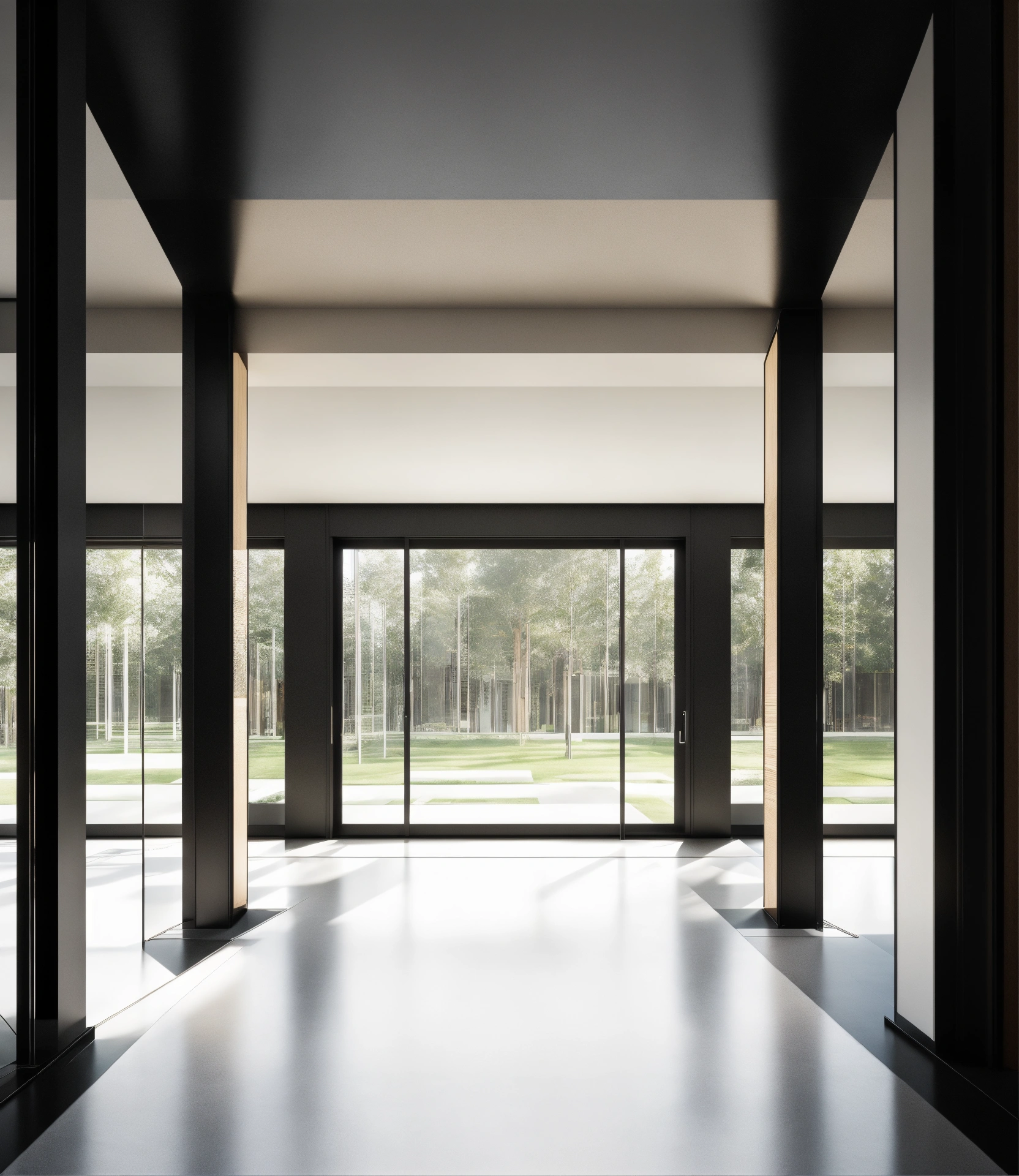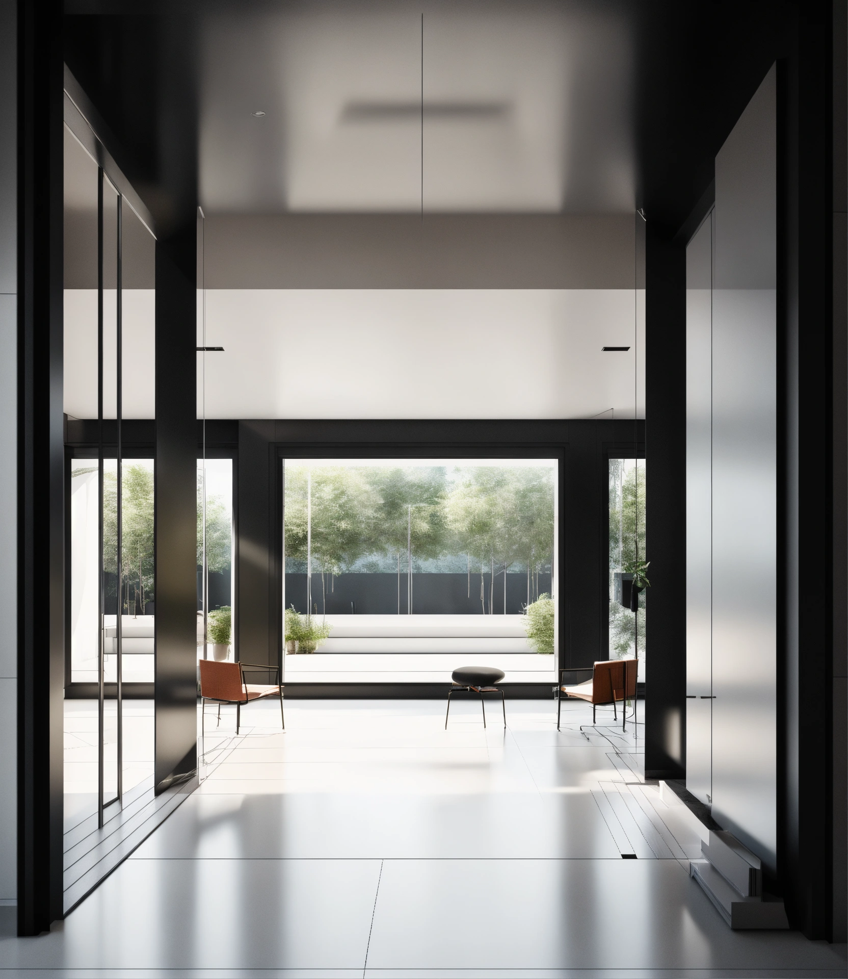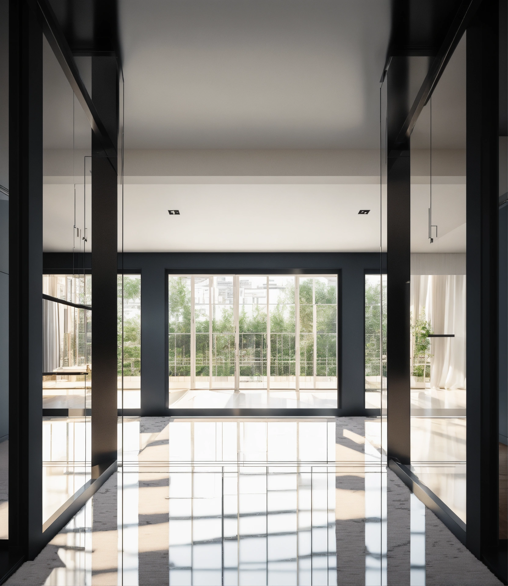 Generate a highly realistic image of a completely empty interior of modern architecture, in an elegant style, showcasing a minimalist design, only carpet. there should only be a bookshelf, only one plant. a big room with a perspective view from three-quarters, not frontal view