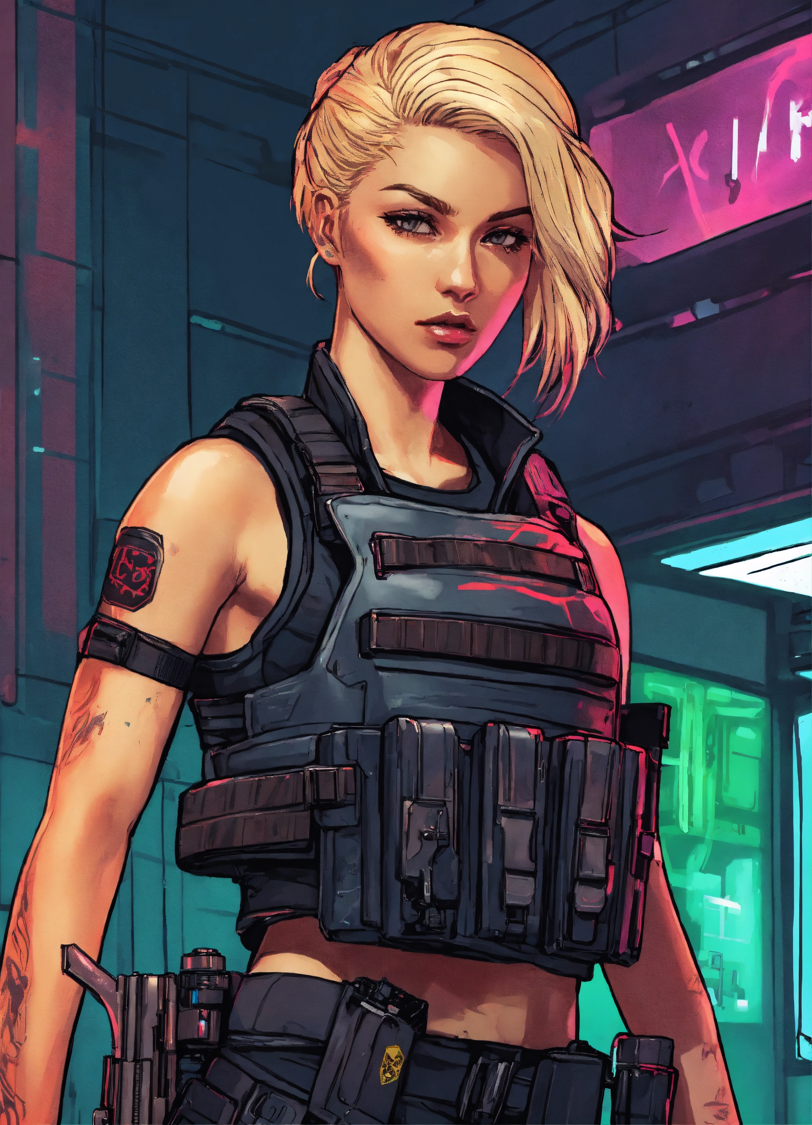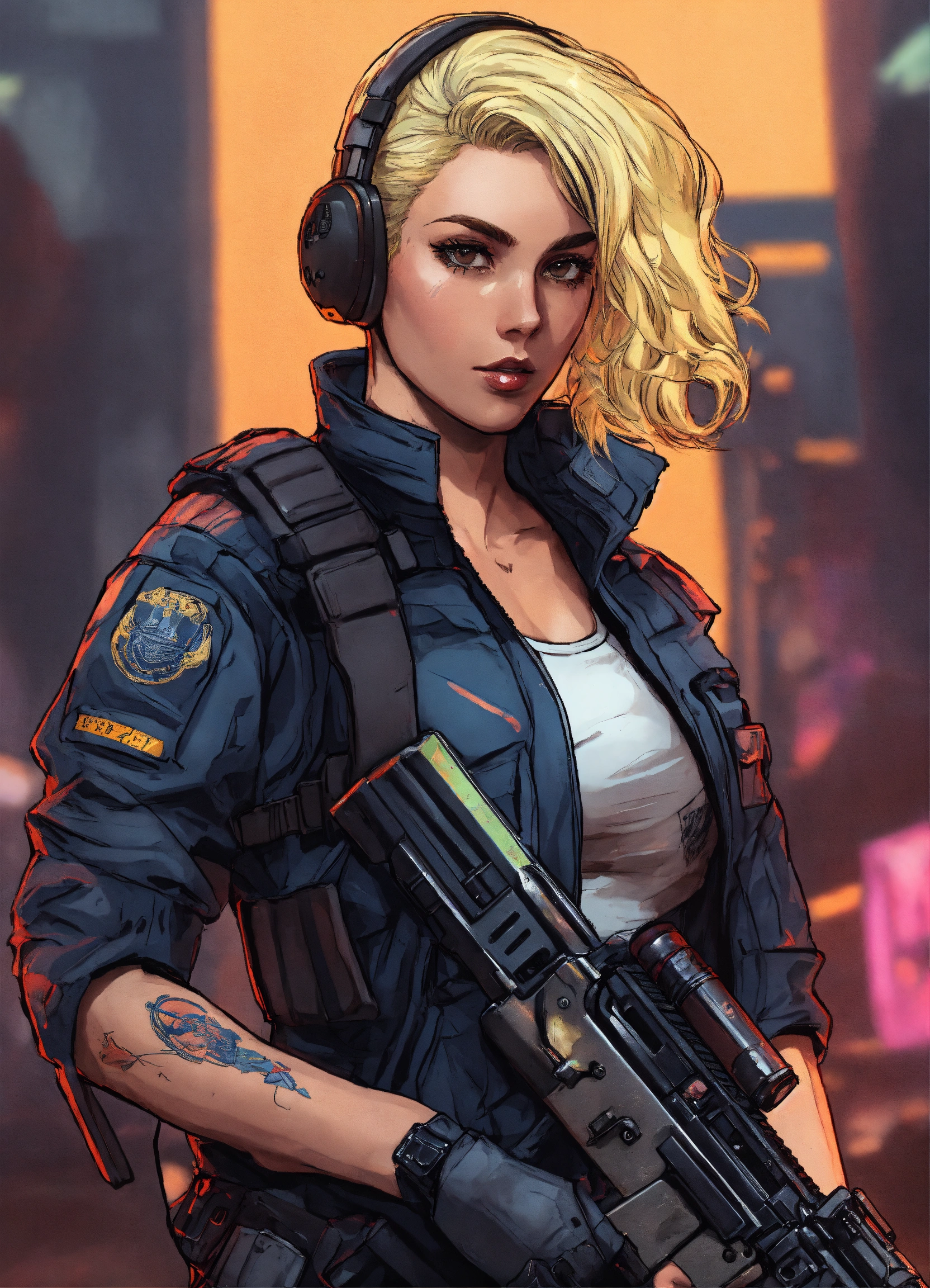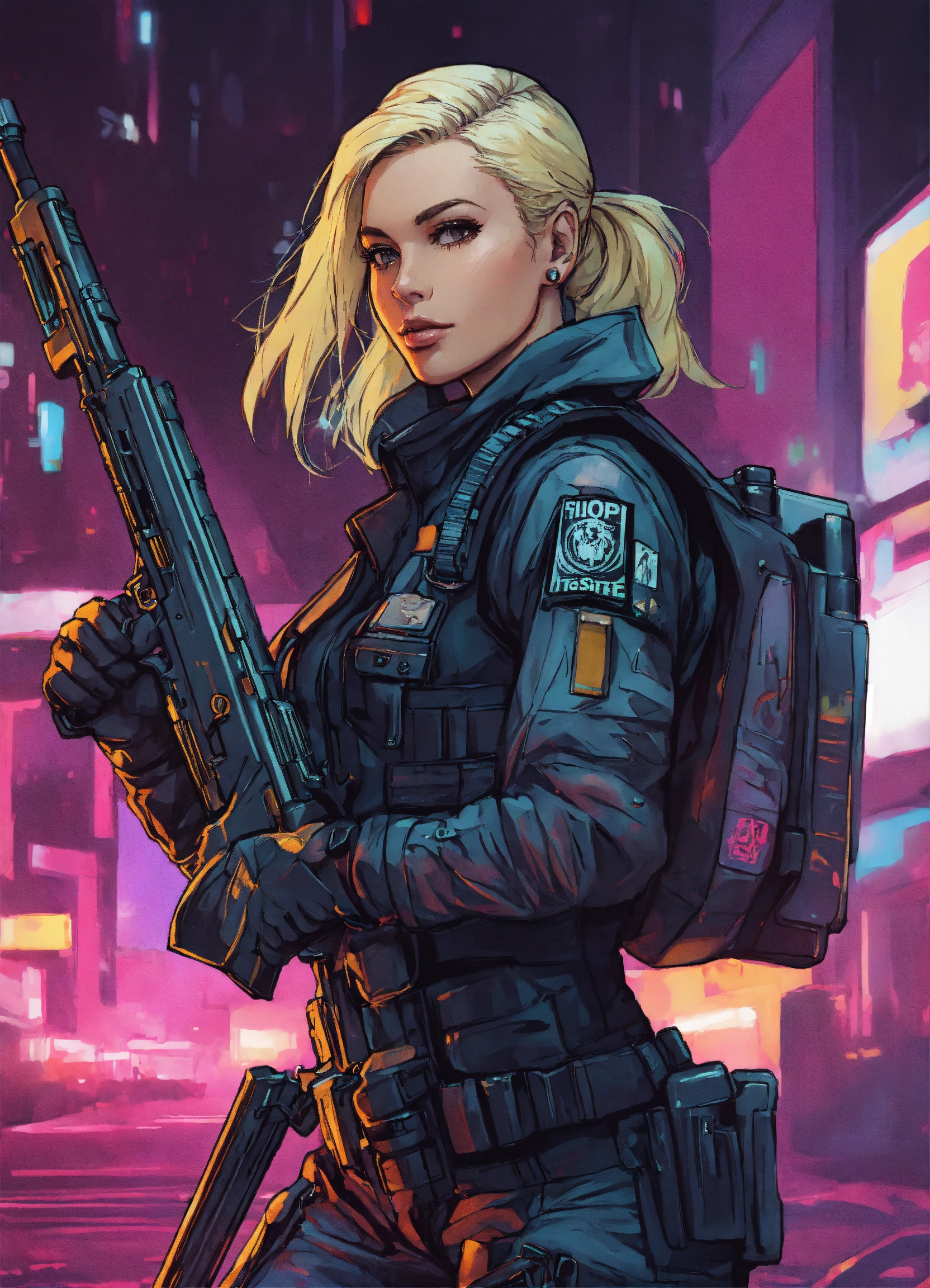 Cyberpunk blonde swat cop with tight flack vest holding a pump action shotgun hand-drawn style
